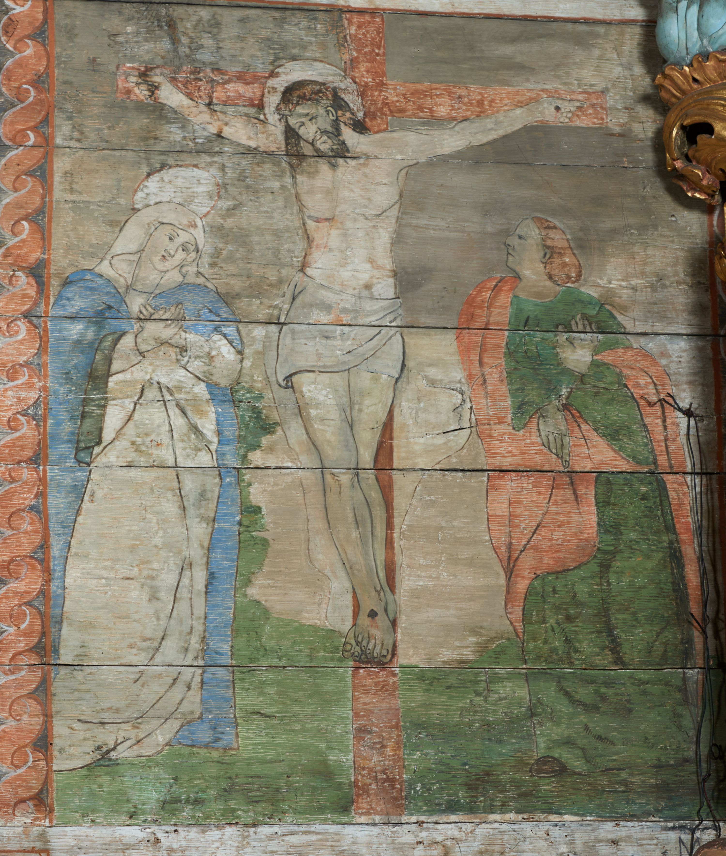 Polichromię wypełniają przedstawienia Męki Pańskiej: Zdjęcie z krzyża, Opłakiwanie Chrystusa, Złożenie do Grobu oraz postacie Apostołów namalowane na zaskrzynieniach. Kilka scen zasłania ołtarz Ukrzyżowania. Na południowej ścianie nawy zachowało się tylko gigantyczne przedstawienie św. Krzysztofa na wysokość całej nawy. Ponadto w nawie znajdują się sceny, częściowo przesłonięte przez prospekt organowy i ołtarze: Wyszydzanie Chrystusa, Chrystus bity pięścią po głowie przez oprawcę, Dźwigane krzyża, Zesłanie Ducha Świętego, Przybicie do krzyża, Chrzest w Jordanie, Ostatnia Wieczerza, Modlitwa w Ogrójcu, Pojmanie.