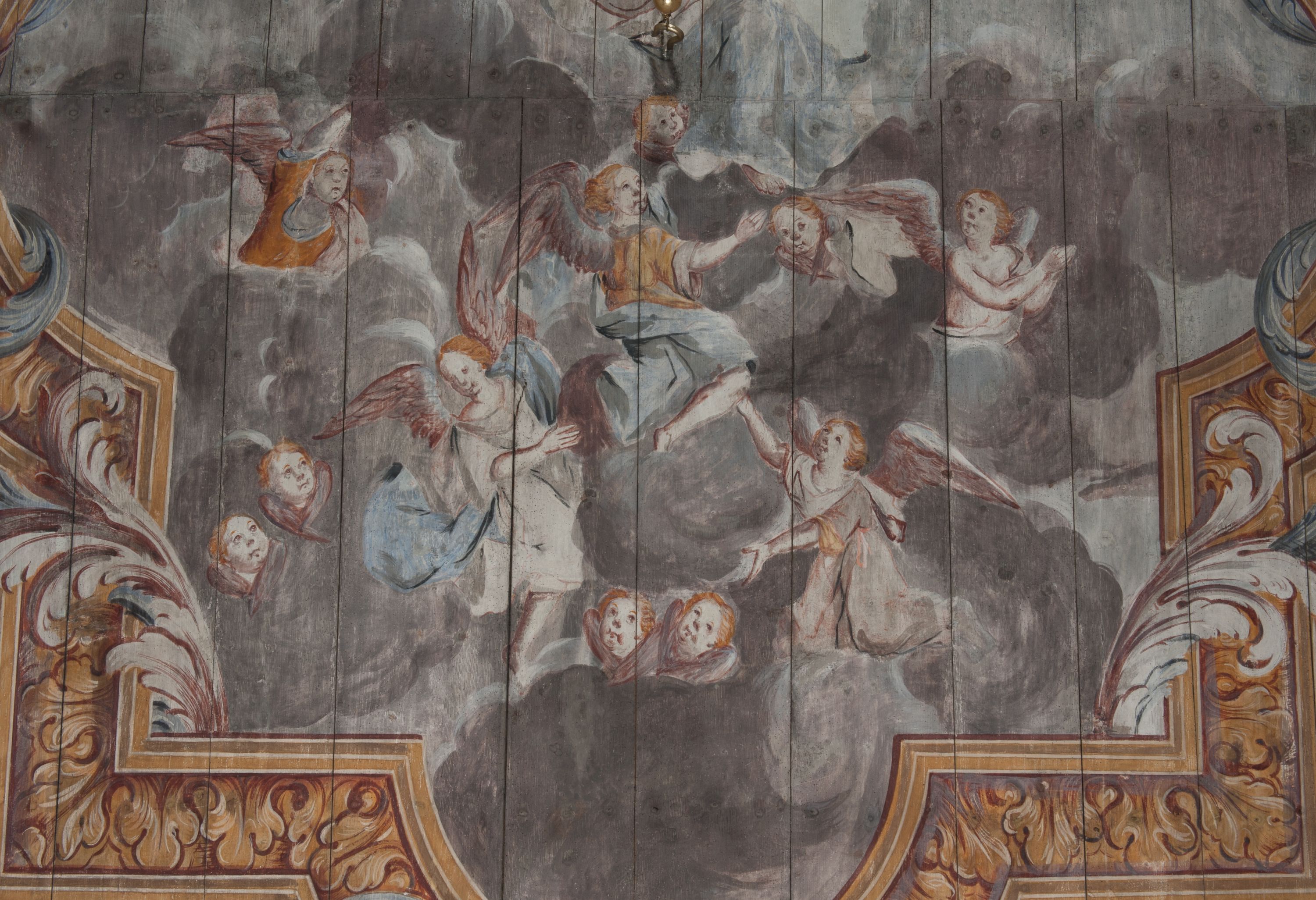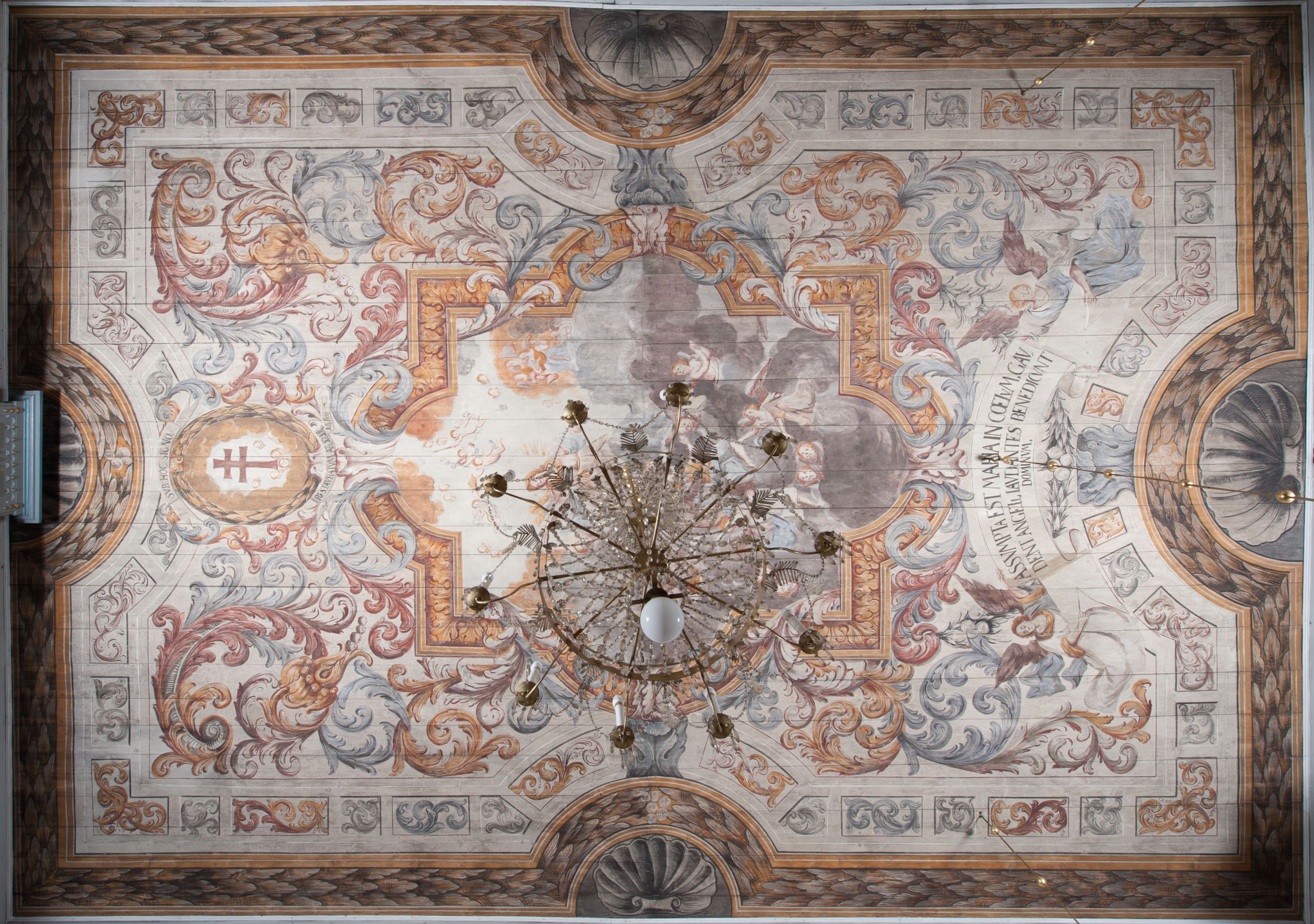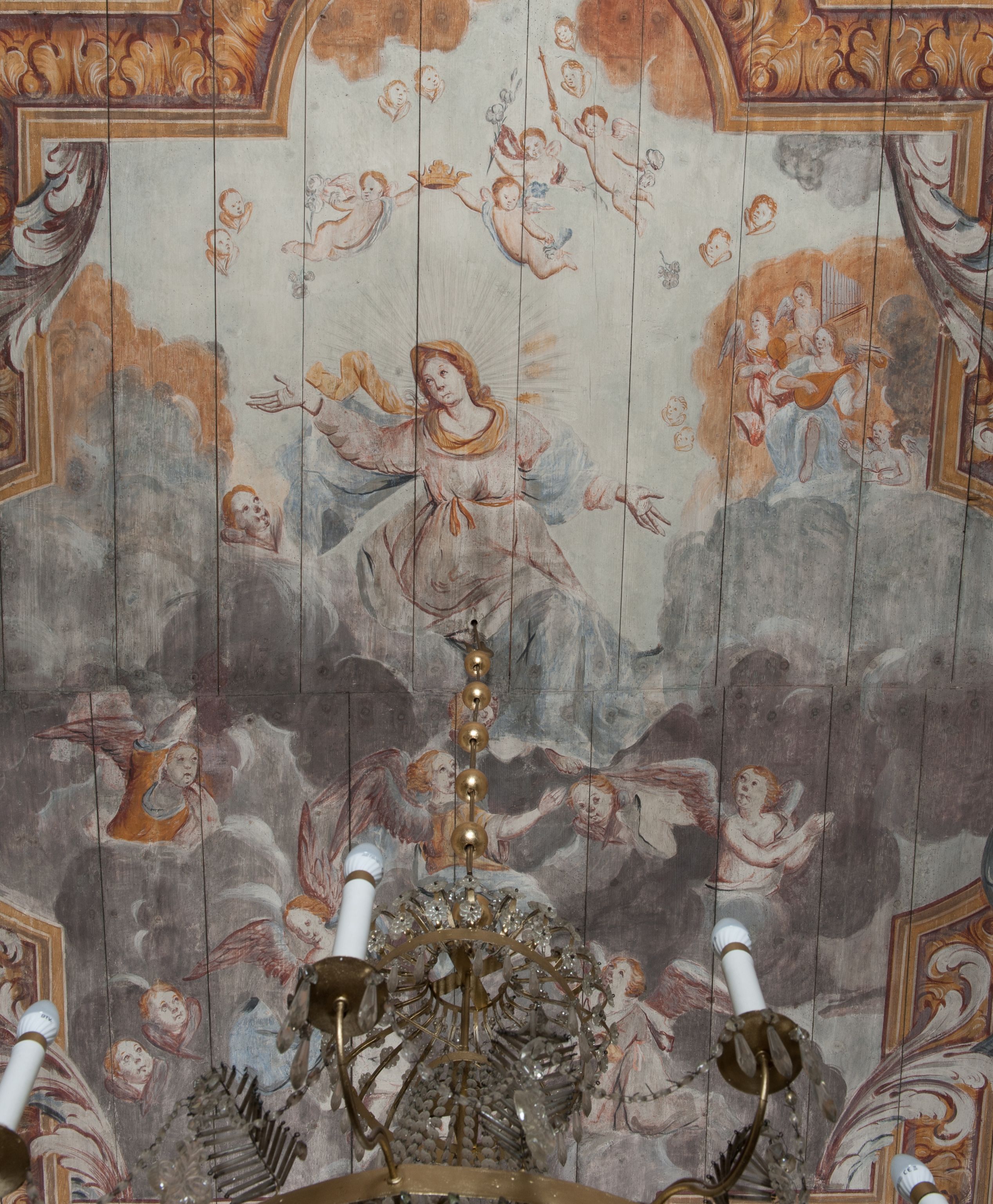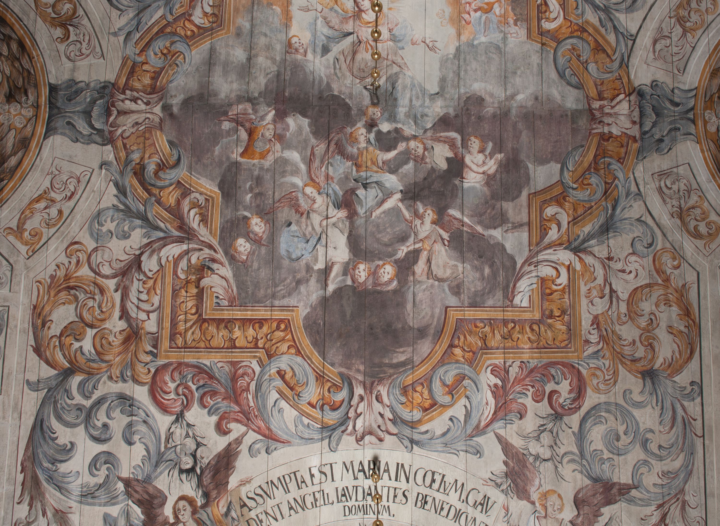 Strop nawy pokrywa polichromia przedstawiająca scenę Wniebowzięcia Matki Boskiej. Kompozycja jest bogato dekorowana splotami akantu i karbowaną wstęgą. Niespokojne wici roślinne owijają ramę obrazu sprawiając wrażenie iluzjonistycznego przedstawienia.