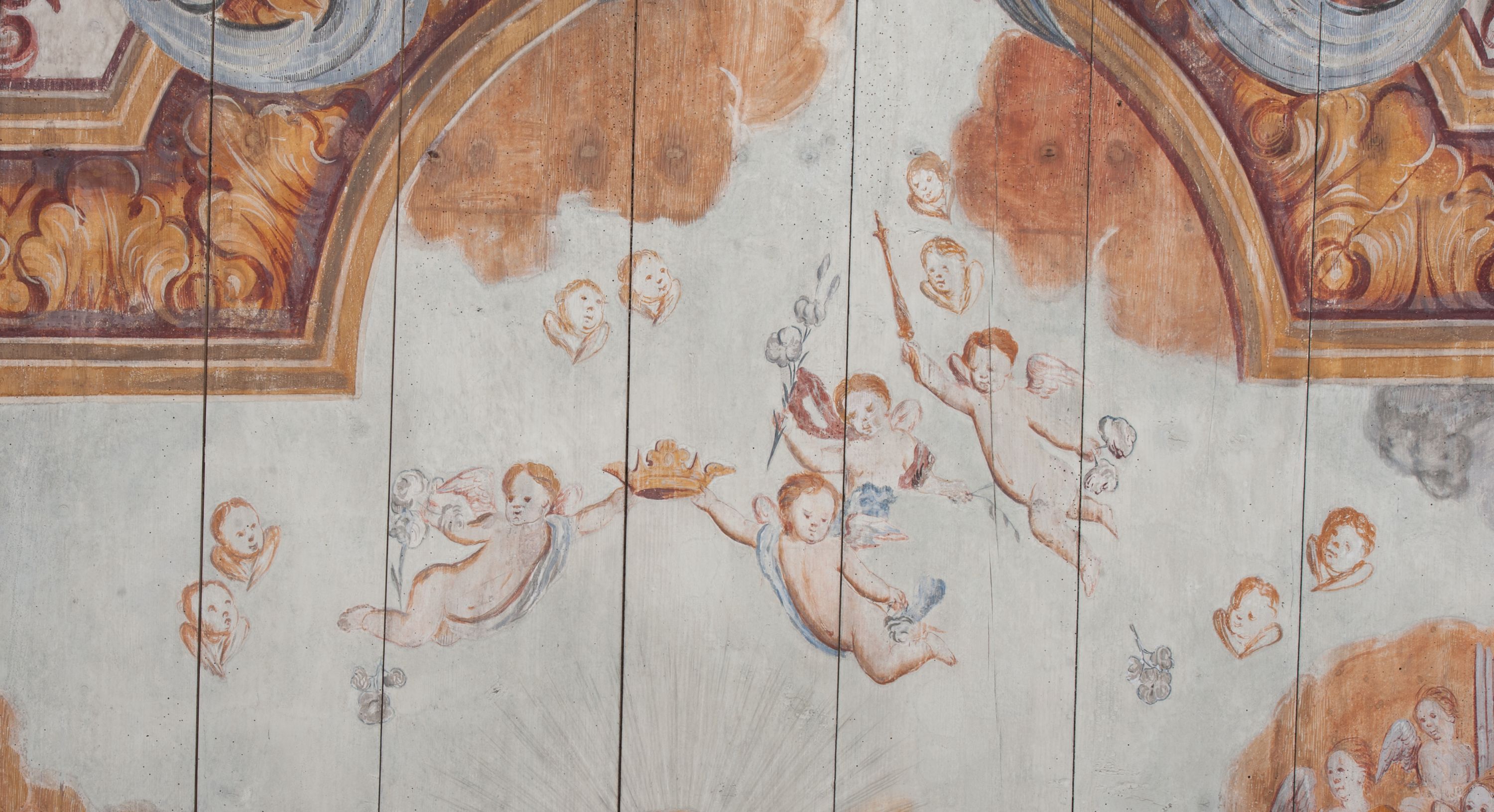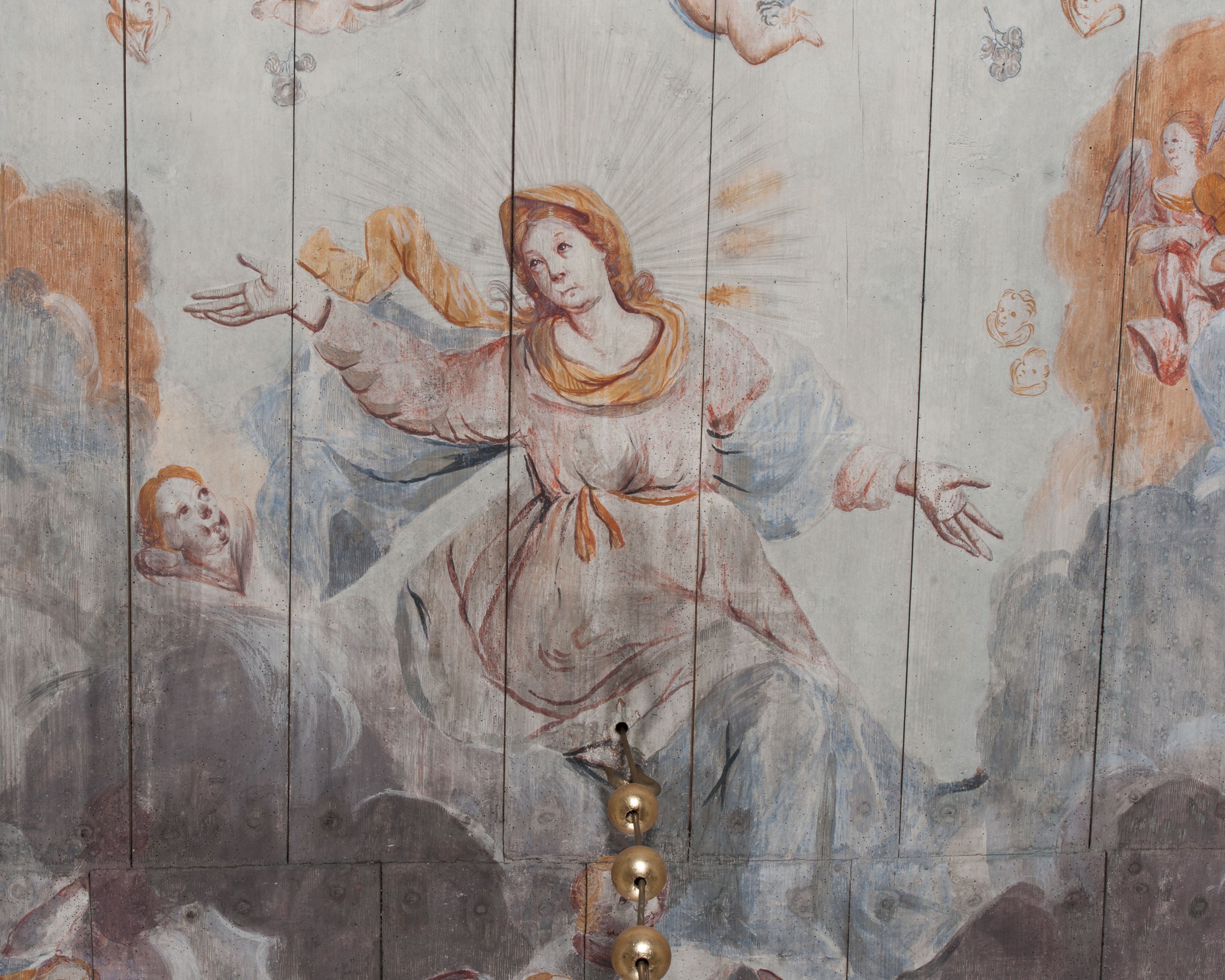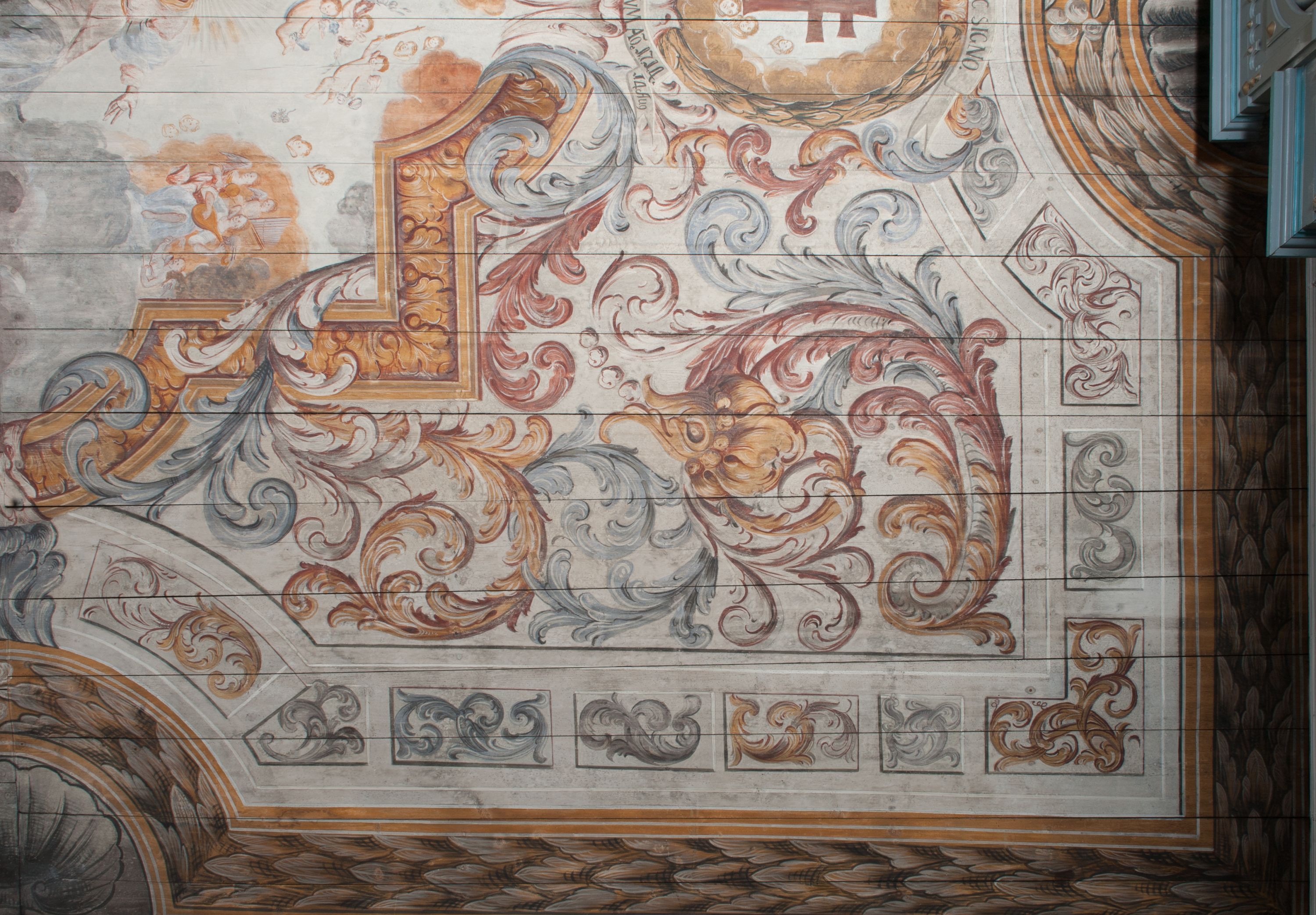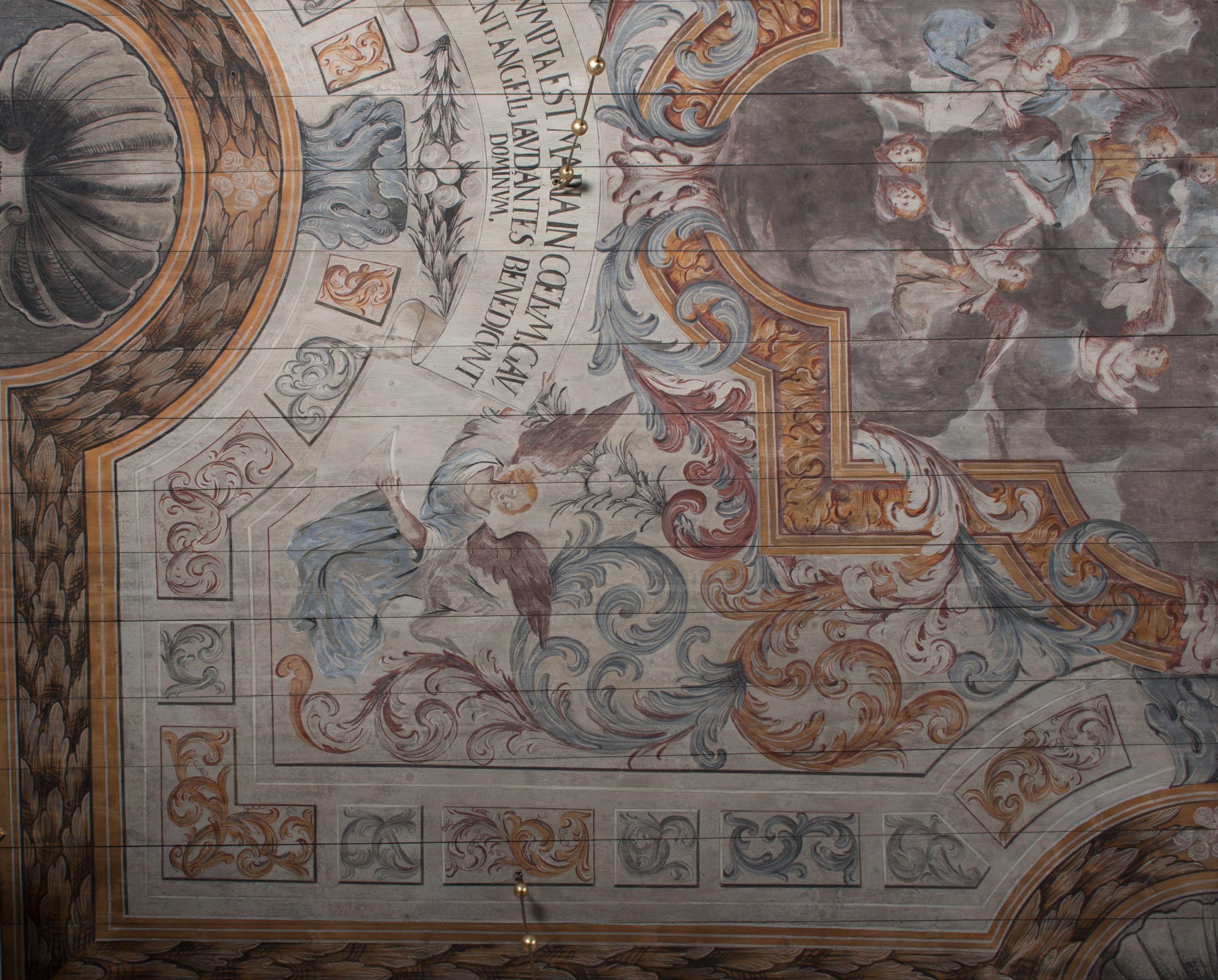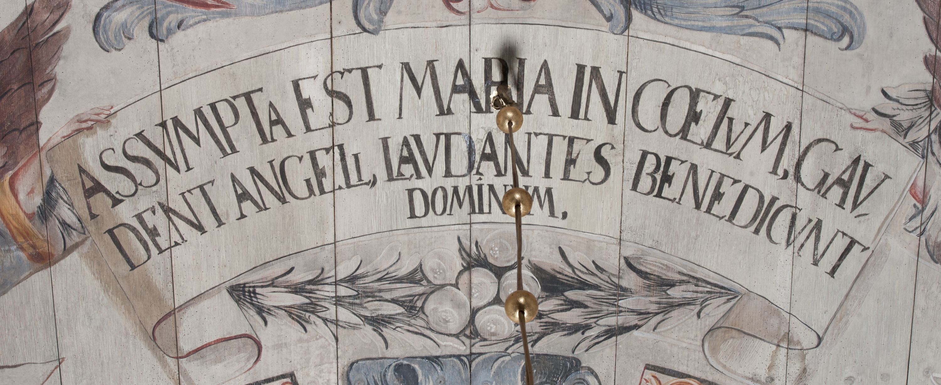 Strop nawy pokrywa polichromia przedstawiająca scenę Wniebowzięcia Matki Boskiej. Kompozycja jest bogato dekorowana splotami akantu i karbowaną wstęgą. Niespokojne wici roślinne owijają ramę obrazu sprawiając wrażenie iluzjonistycznego przedstawienia.