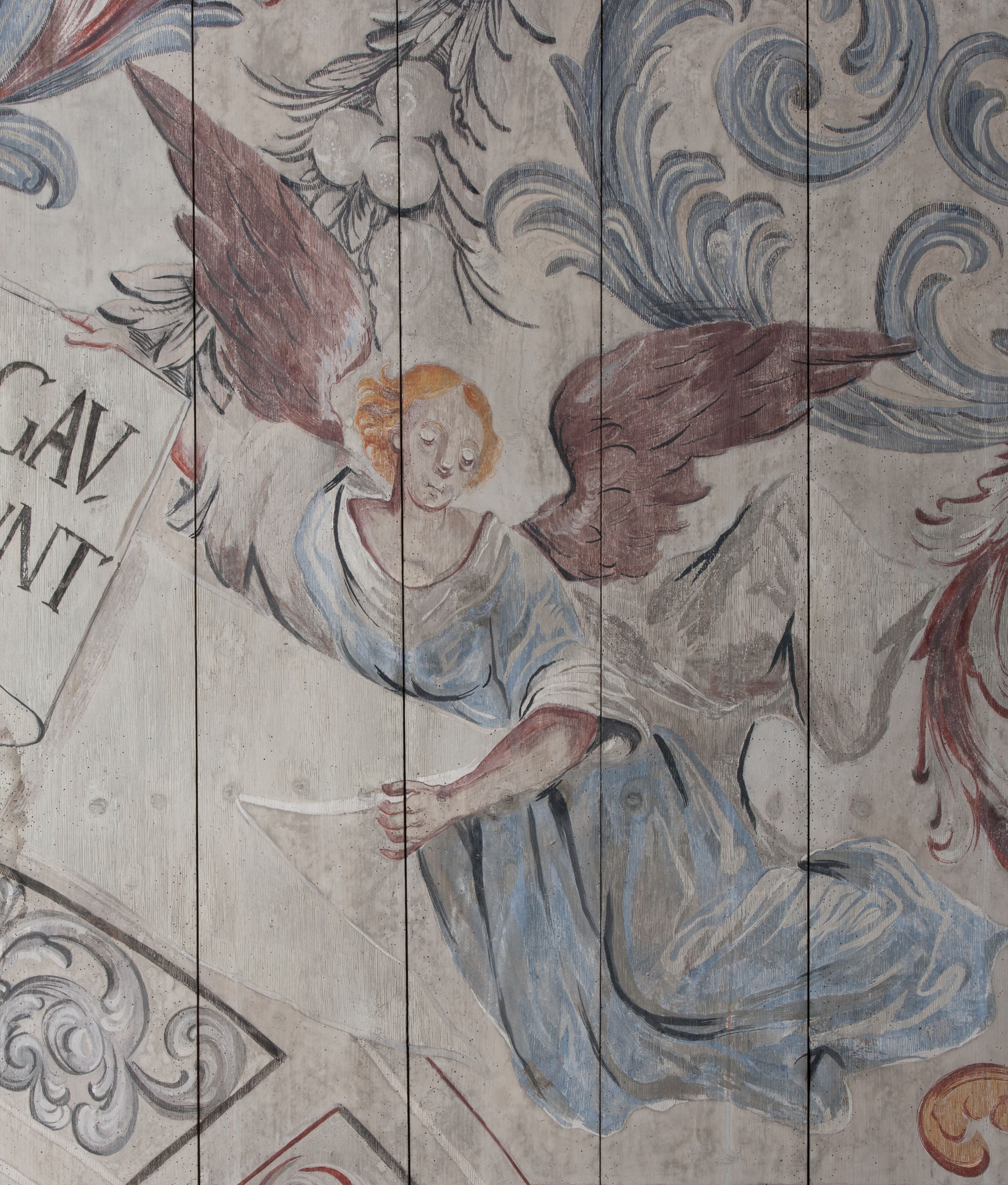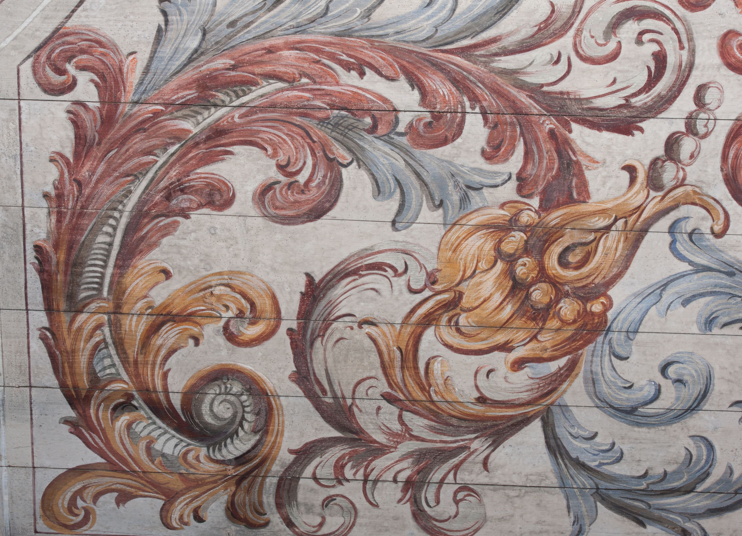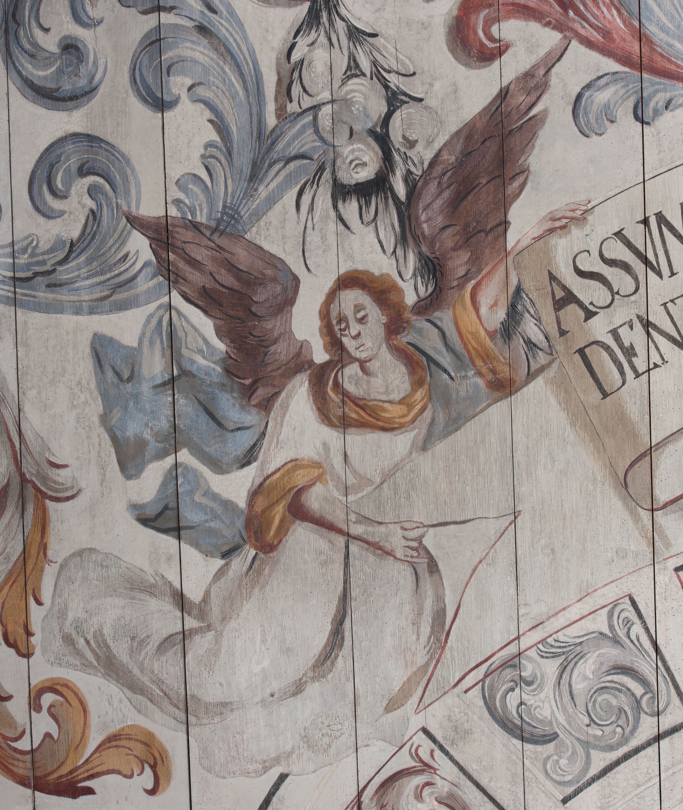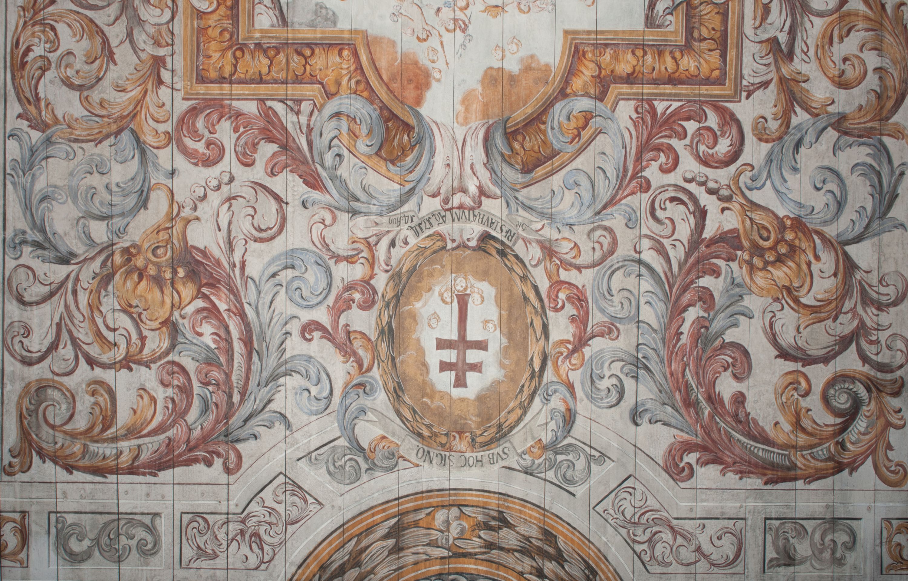 Strop nawy pokrywa polichromia przedstawiająca scenę Wniebowzięcia Matki Boskiej. Kompozycja jest bogato dekorowana splotami akantu i karbowaną wstęgą. Niespokojne wici roślinne owijają ramę obrazu sprawiając wrażenie iluzjonistycznego przedstawienia.