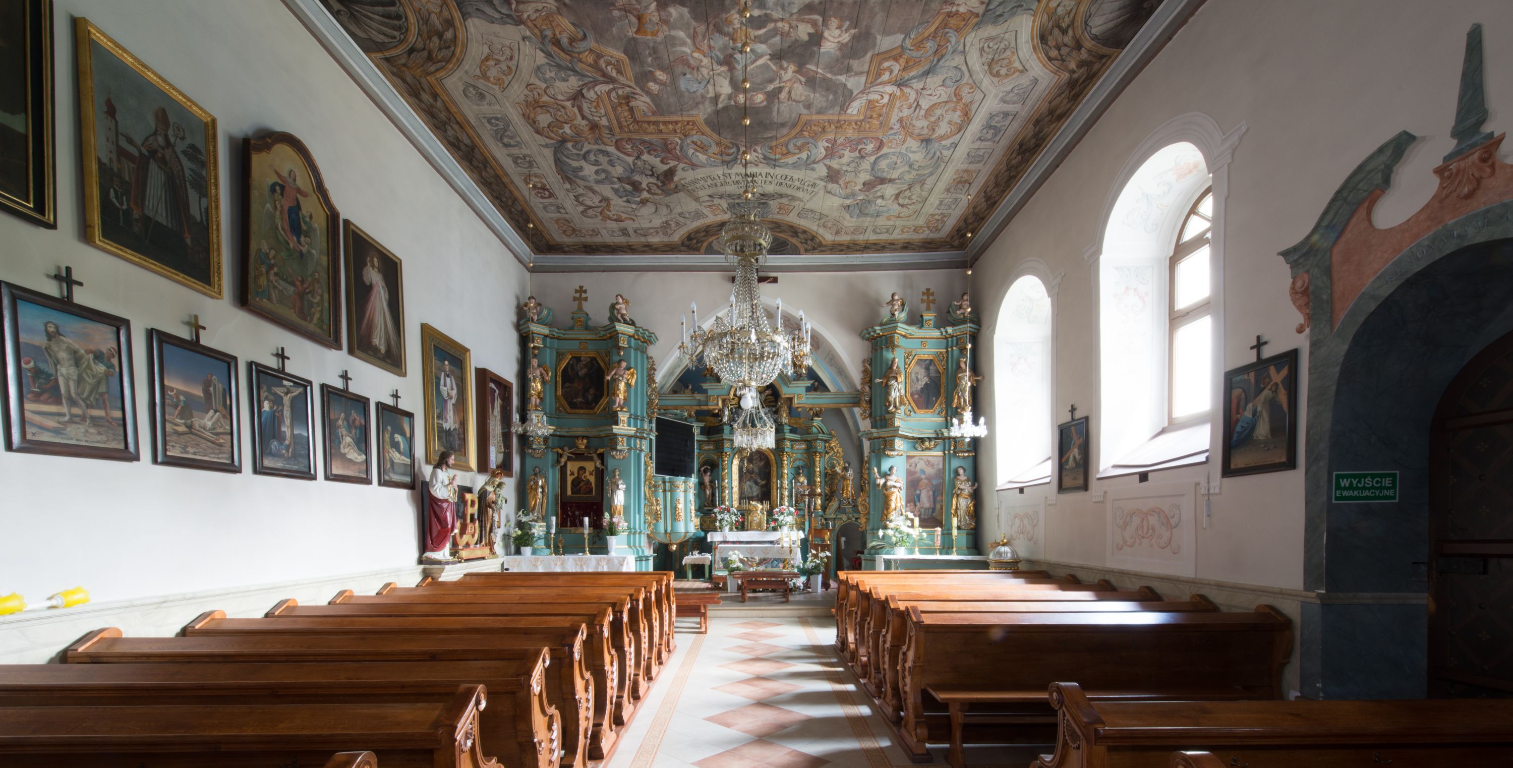 Polichromia umieszczona na stropie nawy głównej. W polu środkowym scena Wniebowzięcia Najświętszej Marii Panny umieszczona w kwadratowej ramie o bokach zamkniętych łukami nadwieszonymi. Rama profilowana, zdobiona rzędem pojedynczych liści. Matka Boska unosząca się na obłokach z szeroko rozłożonymi na boki rękami, prawą wzniesioną do góry. Twarz owalna z długim nosem, silnie zaciśniętymi ustami i dużymi oczami, skierowanymi ku górze. Włosy jasne, kręcone, schowane pod żółtym welonem, którego jeden koniec rozwiany jest wzdłuż prawej ręki. Matka Boska ubrana jest w szeroką, różową suknię, przewiązaną w talii pomarańczową tasiemką oraz błękitny płaszcz, założony za lewe ramię i rozwiany z tyłu. Nad głową Matki Boskiej aniołki unoszą insygnia królewskie: koronę, berło, a także gałązkę białej lilii. Poniżej grupy aniołów podtrzymujące obłoki. Dokoła ramy bujne sploty różnokolorowego akantu przeplecionego karbowaną wstęgą, owijające również ramę ze sceną Wniebowzięcia. W dolnej części ukazane są ponadto dwa anioły podtrzymujące białą wstęgę z napisem: „ASSVMPTA EST MARIA IN COELVM, GAV, / DENT ANGELI, LAVDANTES BENEDICVNT / DOMINVM.” Z kolei z drugiej strony stropu umieszczony jest owalny medalion, obwiedziony liśćmi wawrzynu, w polu którego umieszczone jest czerwone godło zakonu Bożogrobowców oraz małe uskrzydlone główki aniołków. Powyżej na białej wstędze umieszczony jest napis: „SVB HOC SIGNO.”, a poniżej: „RESTAVRATVM A(NN)O (DOMINI) 1714 / Die 14 Aug(st)”. Całość stropu obwiedziona jest dookoła pasem przeważnie prostokątnych kasetonów, wypełnionych różnokolorowymi liśćmi akantu, a także od zewnątrz szerokim pasem dekoracyjnym z brązowych liści wawrzynu. Pasy na bokach wyłamane półkolistymi wypustkami, w których umieszczone są duże muszle palmetowe. Kolorystyka stonowana, jasna z przewagą błękitu i czerwieni.