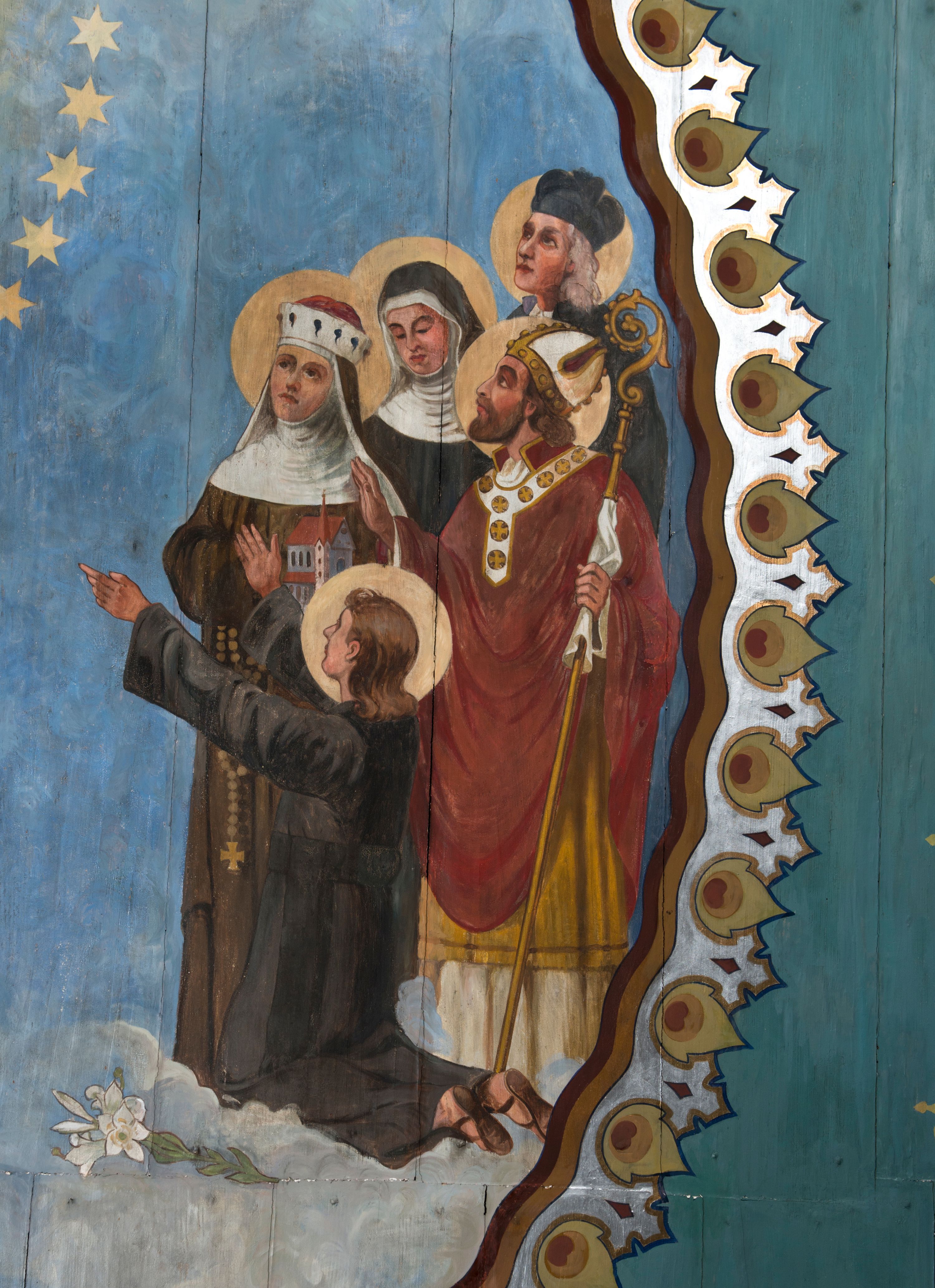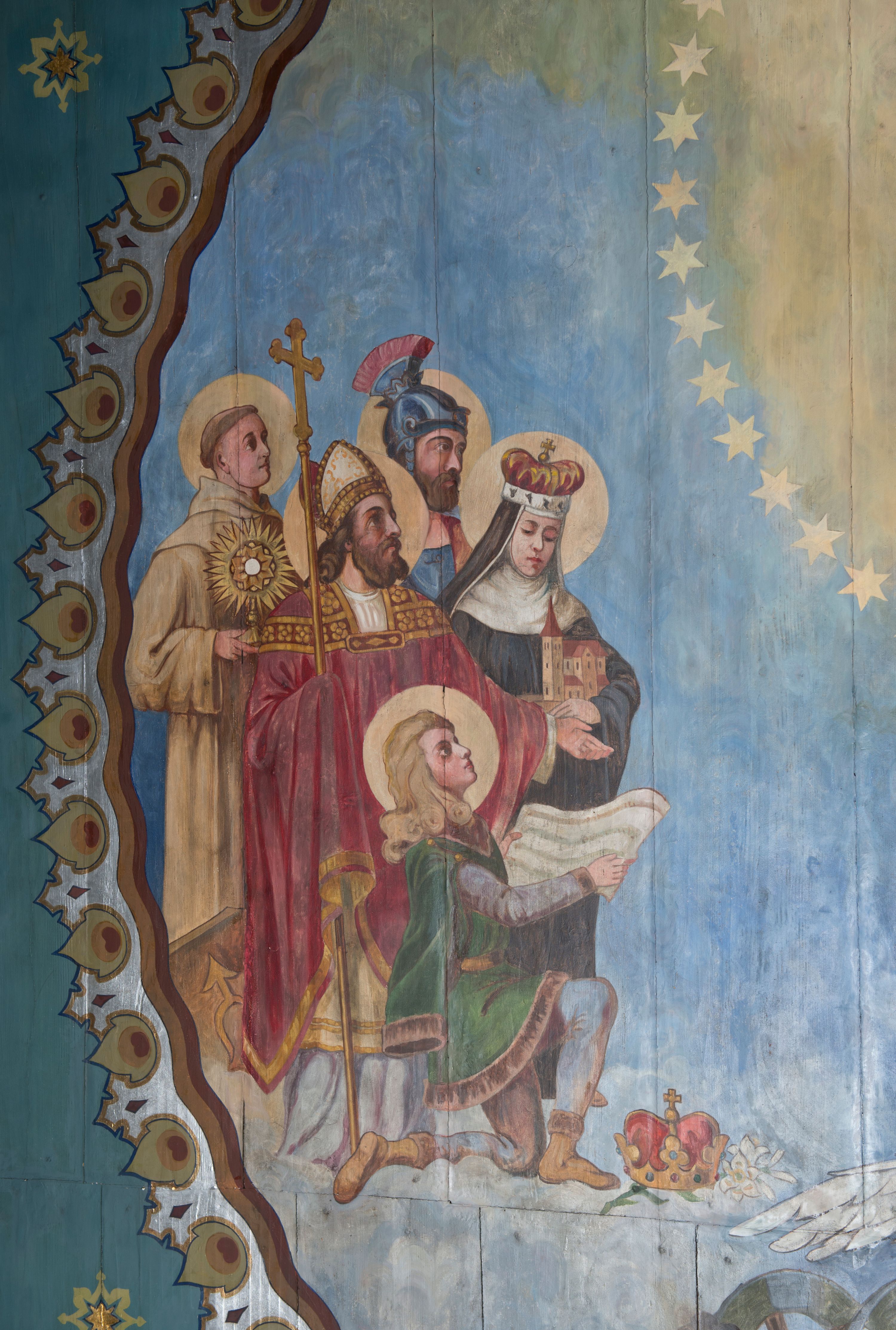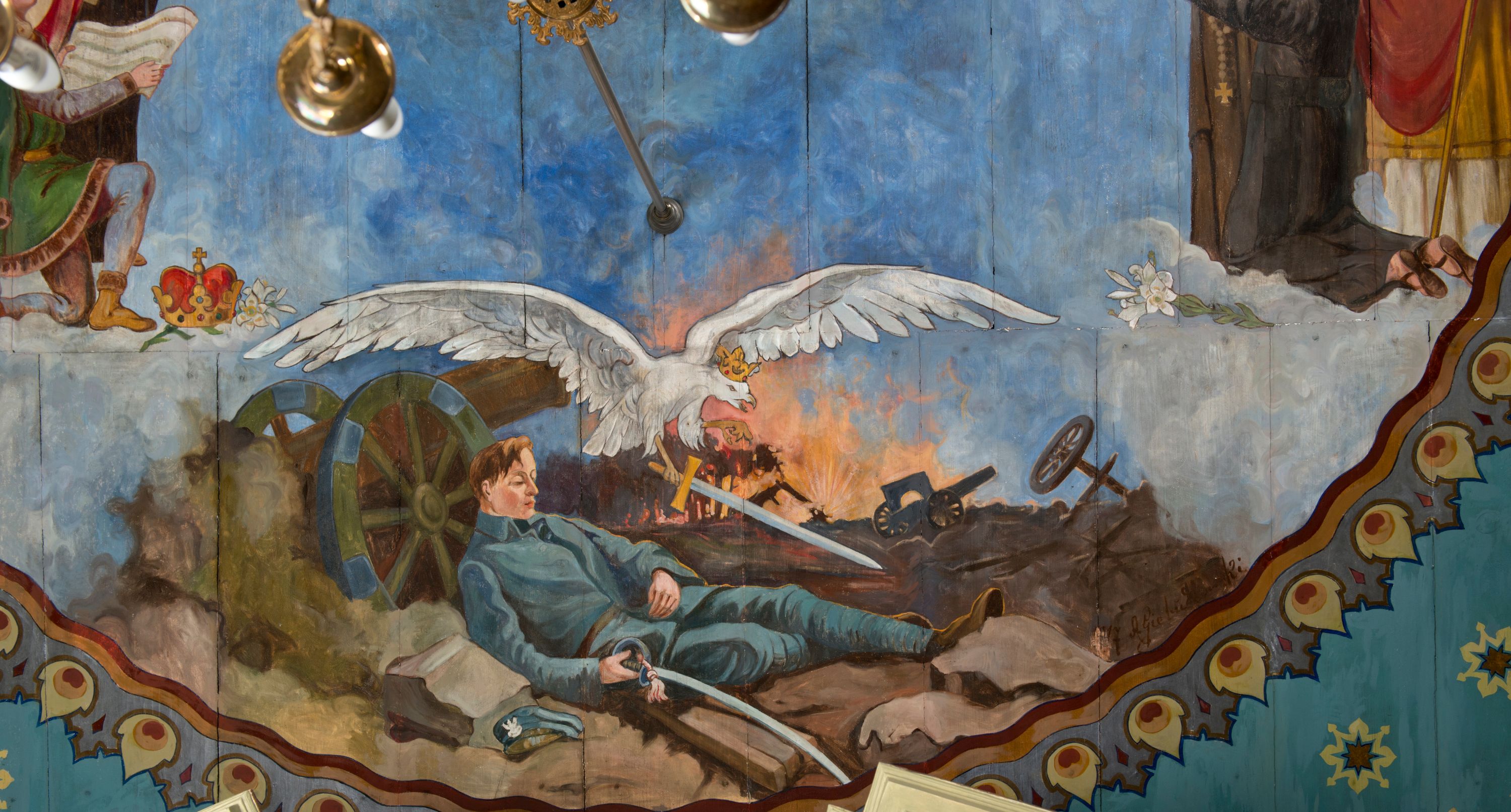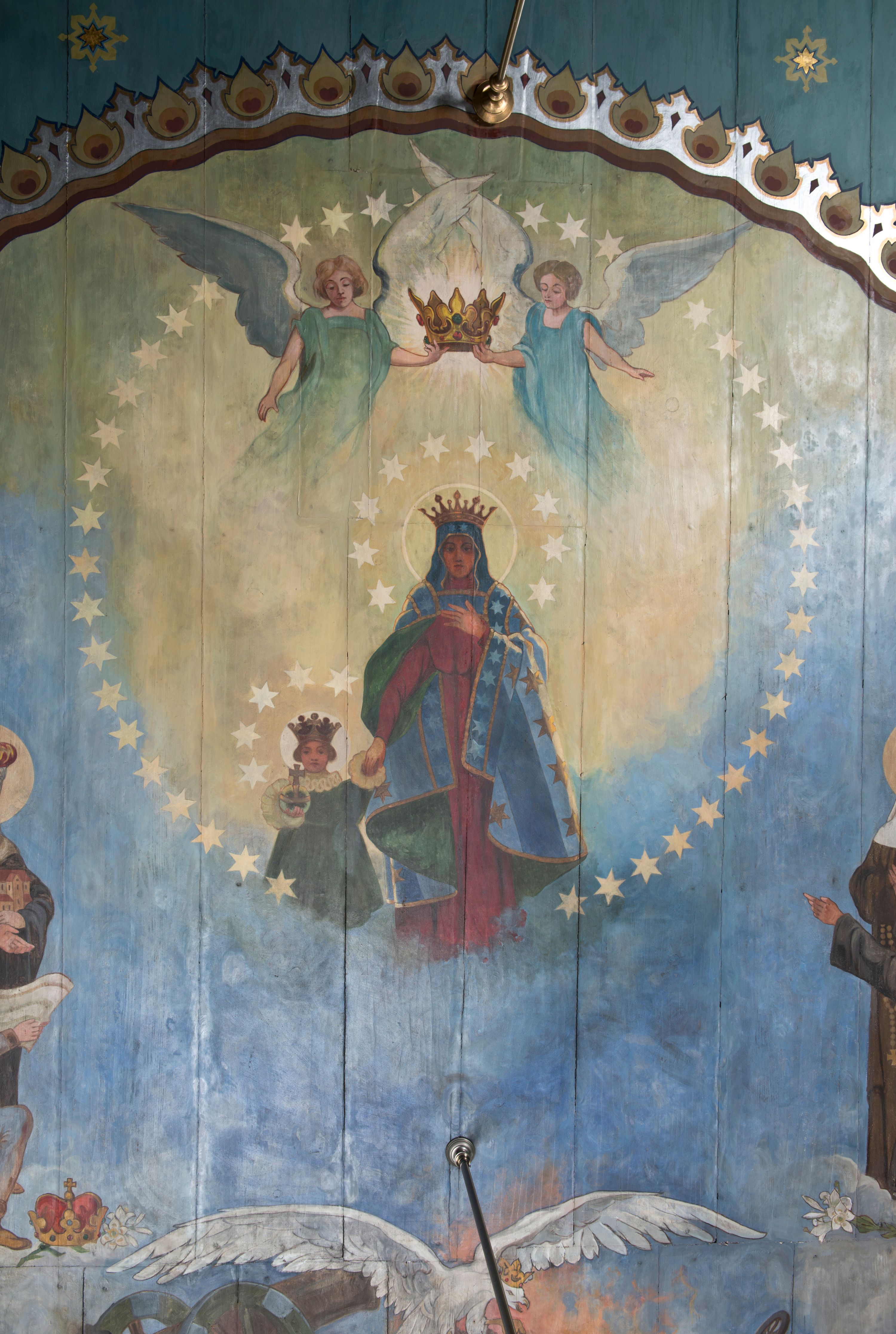 Zaskrzynienia są wypełnione pasem powtarzającej się dekoracji geometrycznej, poprzedzielanej niewielkimi, smukłymi podziałami pionowymi imitującymi tralki, wypełnione kolorem bordowym i złotymi gwiazdkami. Tło stropu malowane jest na kolor jasnoniebieski z licznymi, symetrycznie ustawionymi gwiazdkami oraz przestylizowanymi gwiazdami w czterech narożach. Pośrodku stopu, okrągłe pole oddzielone zostało obramieniem utworzonym ze stylizowanych łez. Wewnątrz, centralne miejsce zajmuje scena koronacji Matki Boskiej przez dwóch aniołów, która trzyma za rękę małego Jezusa. Po obu stronach przedstawienia znalazły się postacie świętych związanych z historią Polski. Po lewej stronie stoją kolejno: św. Jacek, św. Florian, św. Wojciech, św. Jadwiga Śląska oraz klęczący św. Kazimierz. Po lewej stoją kolejno: bł. Kinga, bł. Bronisława, św. Stanisław, św. Jan Kanty i klęczy św. Stanisław Kostka. Poniżej sceny koronacji jest przedstawienie leżącego żołnierza w błękitnym mundurze legionowym, wspartego na kole armaty. Z prawej ręki wypada mu szabla, obok zaś leży rogatywka. W tle widać pożogę wojenną z poprzewracanymi wozami i armatami. Nad żołnierzem unosi się biały orzeł w koronie, który w szponach trzyma miecz.