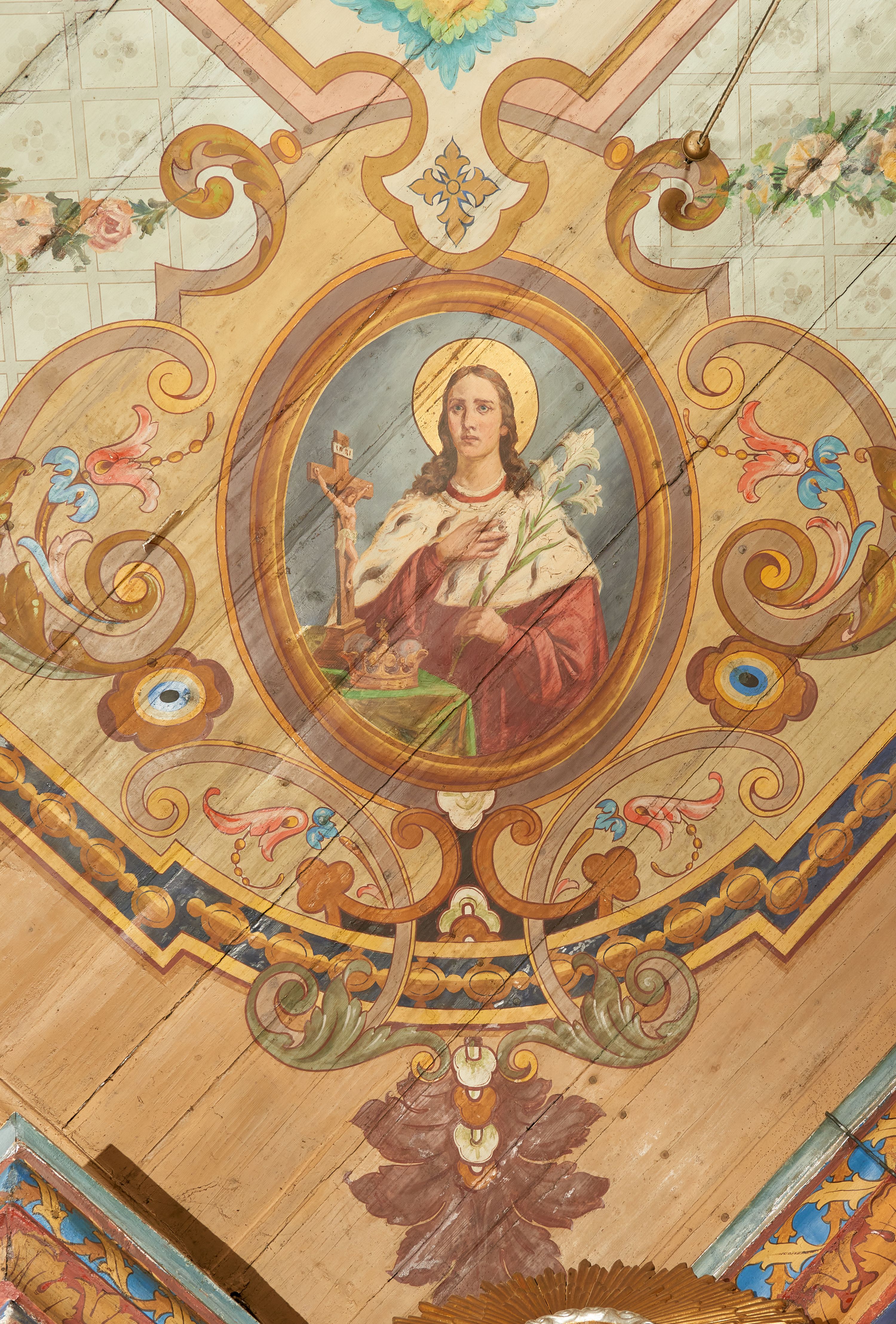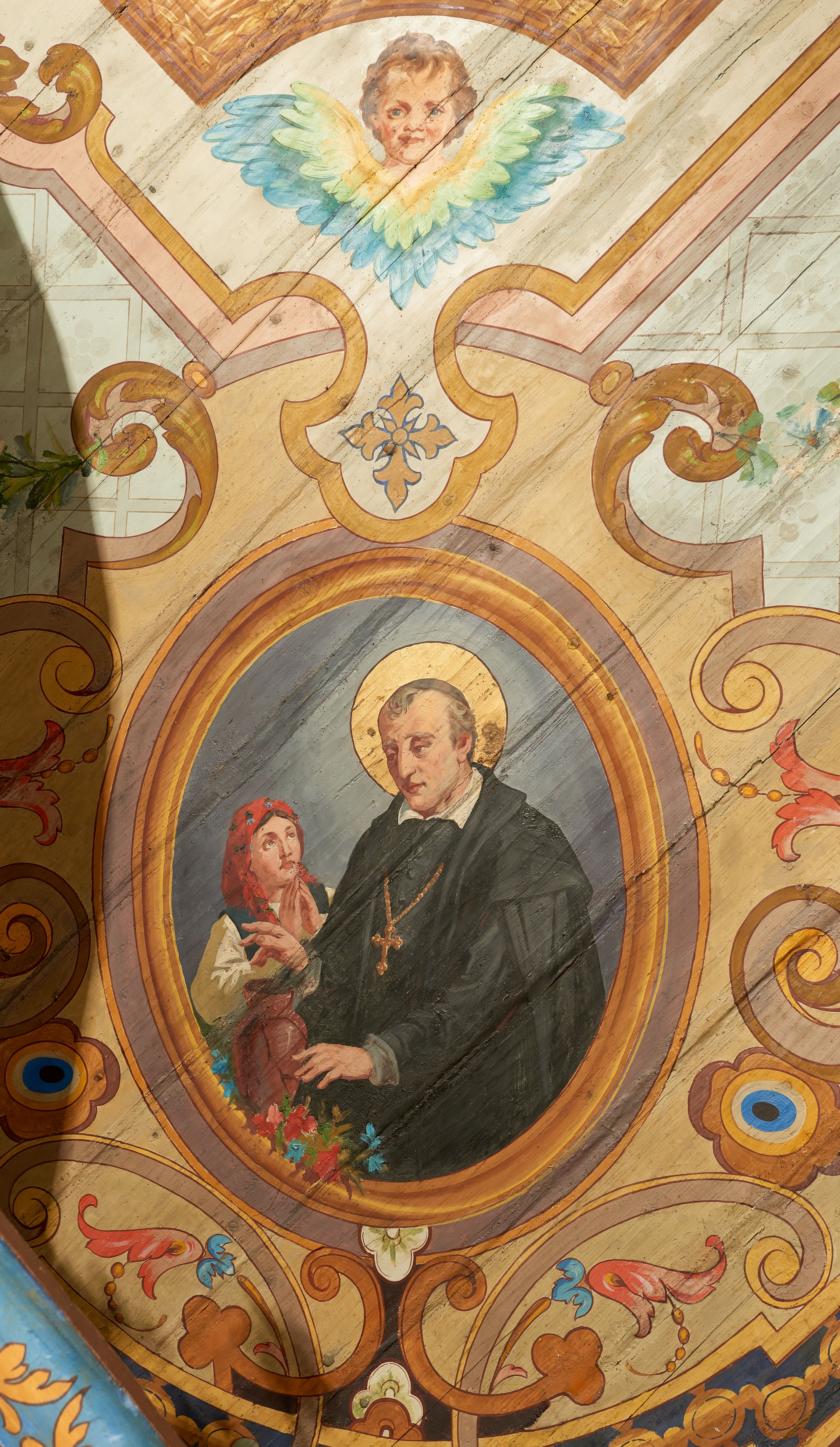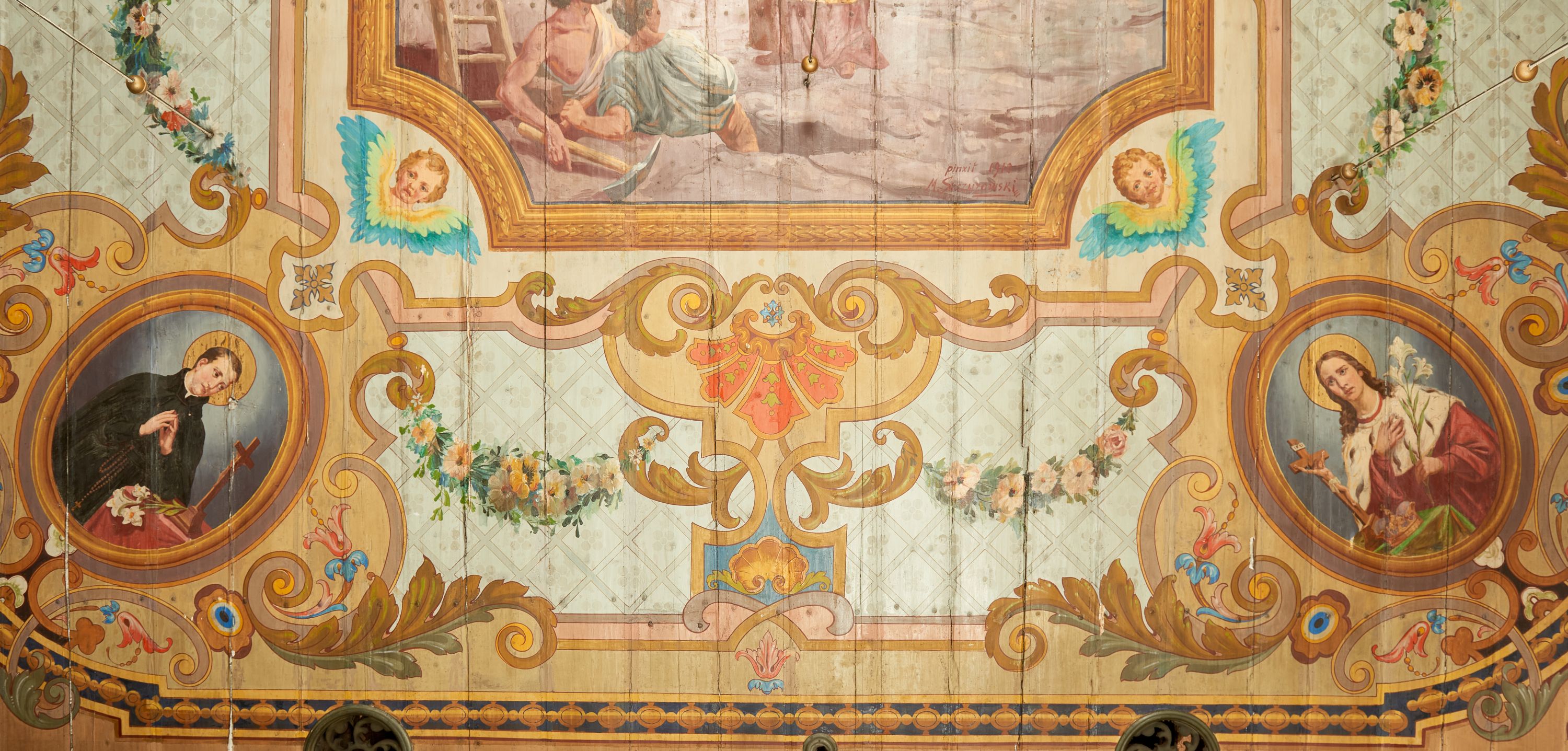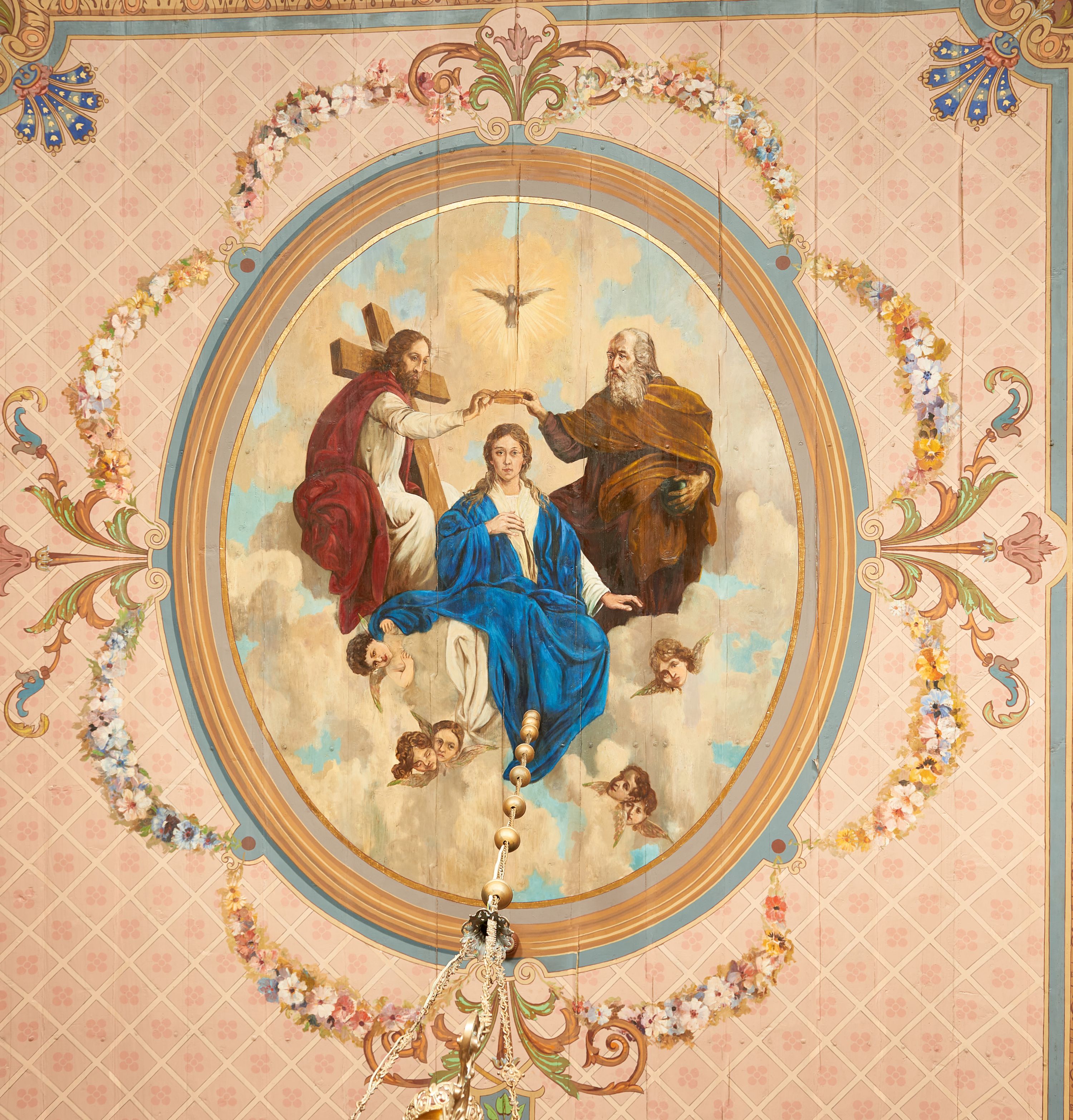 Na stropach prezbiterium i nawy namalowano plafony w fantazyjnie dekorowanych ramach. W prezbiterium ukazana jest scena Koronacji Marii, która wzorowana jest na obrazie „Koronacja Matki Bożej” Diego Velázqueza z 1641 roku. Malarz powtórzył za pierwowzorem kompozycję hiszpańskiego dzieła, jakkolwiek zastosował zupełnie odmienną kolorystykę i styl malowania. Autor tego dzieła niewątpliwie wzorował się na reprodukcji.
