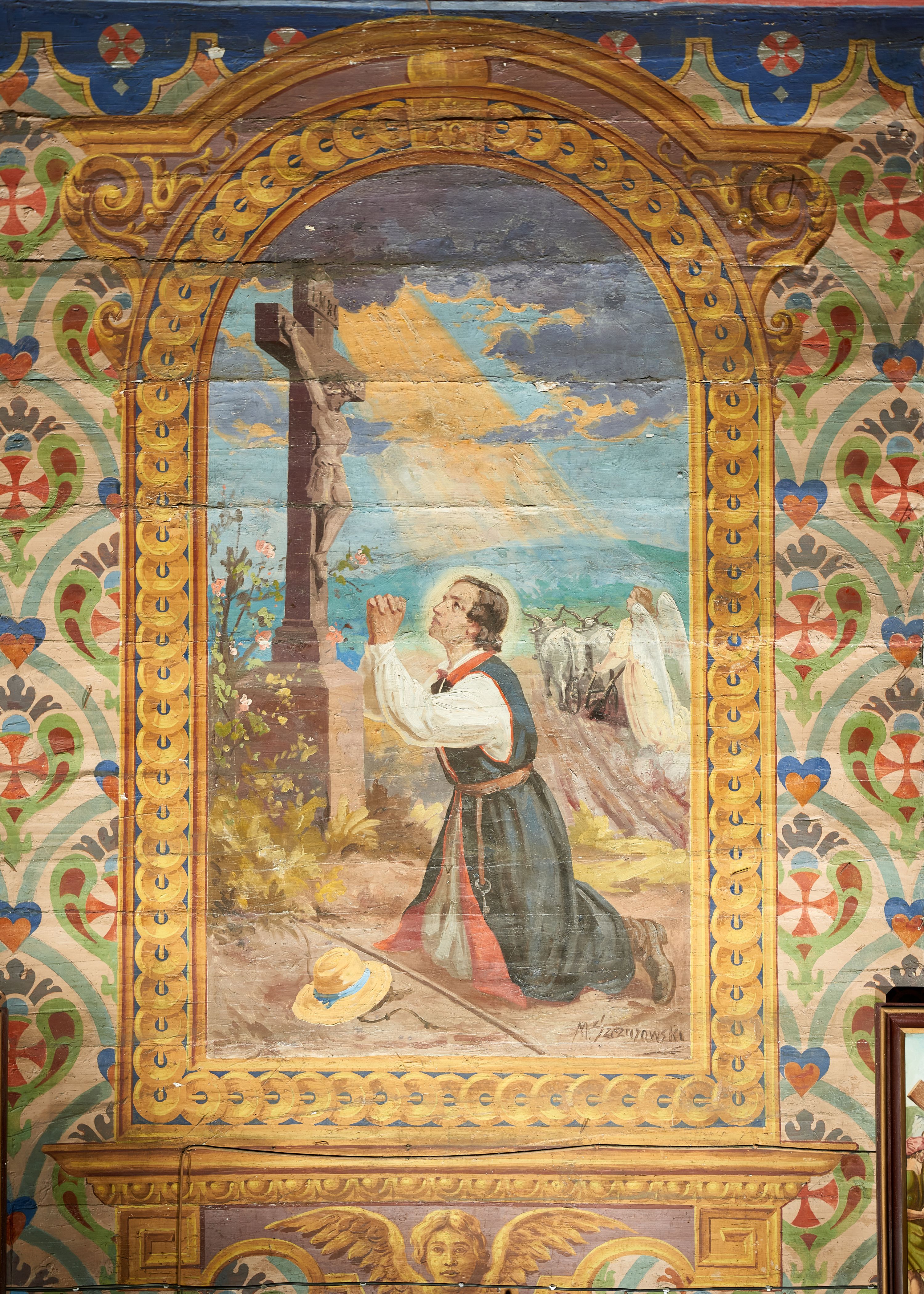 Na ścianie południowej scena z przedstawieniem św. Izydora Oracza modlącego się przed kapliczką. W dolnej części obrazu święty w pozycji klęczącej, zwrócony profilem w prawo, z uniesionymi rękami o splecionych dłoniach w geście modlitwy, z uniesioną głową. Twarz ma szczupłą, o oczach skierowanych w górę, małym nosie i pełnych ustach, okoloną krótkimi, brązowymi włosami. Ubrany jest w białą koszulę, niebieski kaftan z czerwoną podszewką, przepasany w talii, z zawieszonym kluczem, na stopach ma buty. Przed nim, na ziemi leżą słomkowy kapelusz i bat. Przed świętym kapliczka w formie kamiennego krucyfiksu na cokole, pośród krzaków z kwiatami. Święty ukazany na tle pejzażu, z widocznym w oddali polem, na którym dwa woły ciągną pług, prowadzony przez anioła. Powyżej błękitne niebo zasnute ciemnymi chmurami, spod których wydobywa się strumień światła. W prawym dolnym rogu sygnatura „M. Szczurowski”.