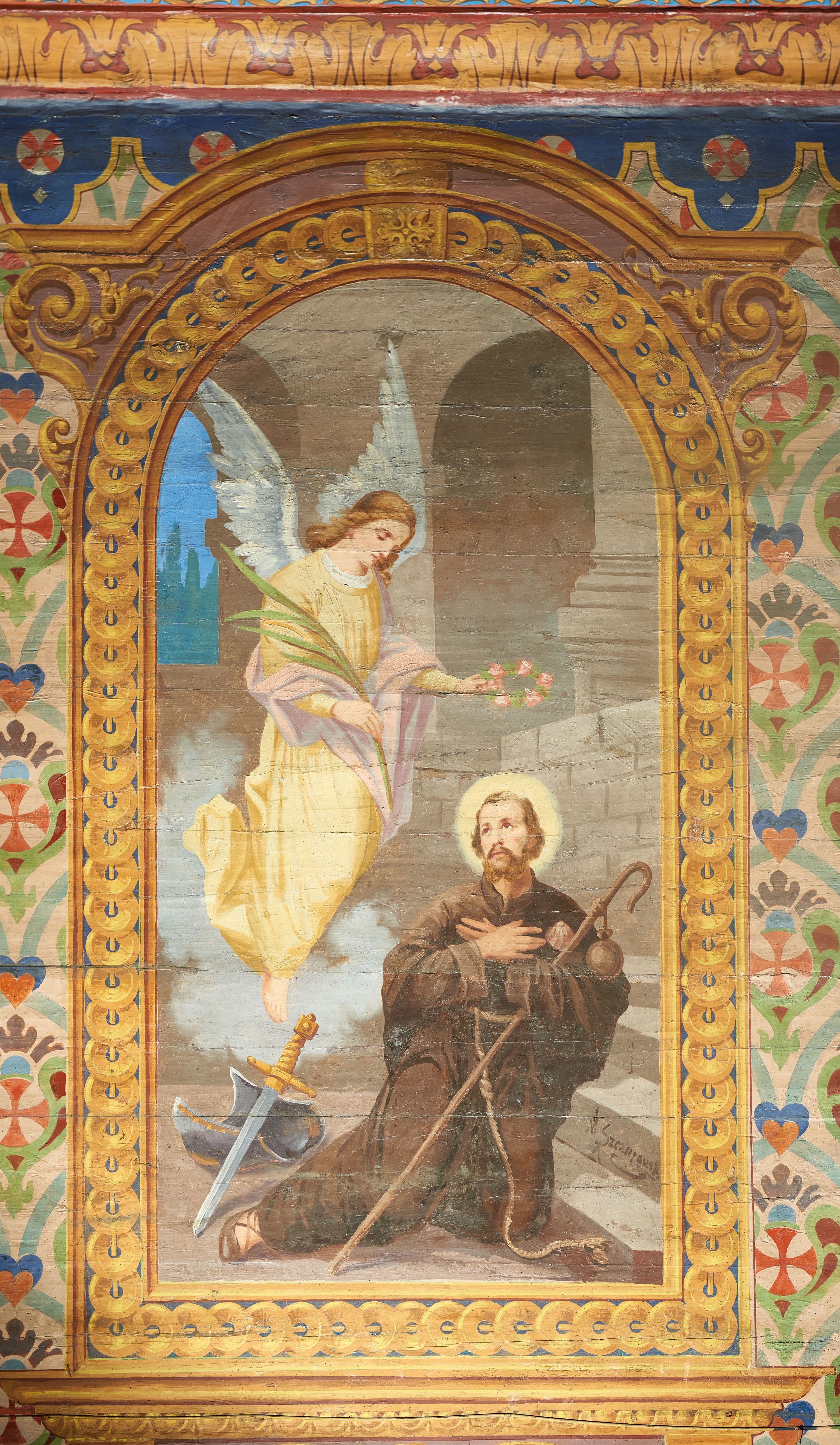 Na ścianie północnej scena z przedstawieniem św. Jakuba Większego z aniołem. W dolnej części obrazu święty w pozycji półleżącej, oparty o schody, ukazany frontalnie, z uniesioną głową, skierowaną w lewo i skrzyżowanymi na piersi rekami. Twarz ma owalną, o dużych oczach skierowanych w górę, prostym nosie i rozchylonych ustach, okoloną, krótkimi, jasnobrązowymi włosami i brodą. Wokół jego głowy nimb. Ubrany jest w ciemnobrązową tunikę, przepasaną sznurem, na lewym ramieniu ma muszlę, lewą ręką przytrzymuje laskę z bukłakiem. Na stopach ma sandały. Nad świętym unosi się anioł, zwrócony w trzech czwartych w lewo, w wykroku, z pochyloną głową, w prawej ręce trzyma liść palmy, w lewej, nad głową świętego - wieniec z róż. Anioł o młodzieńczej twarzy, z dużymi oczami zwróconymi w dół, dużym nosem i małymi ustami, okolonej jasnymi włosami sięgającymi ramion. Ubrany jest w żółtą tunikę oraz jasnofioletowy płaszcz. Ma białe i rozłożone skrzydła. Ukazany jest w otoczeniu obłoków. Poniżej, obok świętego na ziemi leży puklerz i miecz. Postacie ukazane we wnętrzu, z widoczną murowaną ścianą z oknami, fragmentem kolumny i schodami. W prawym dolnym sygnatura „M. Szczurowsk[i]”.