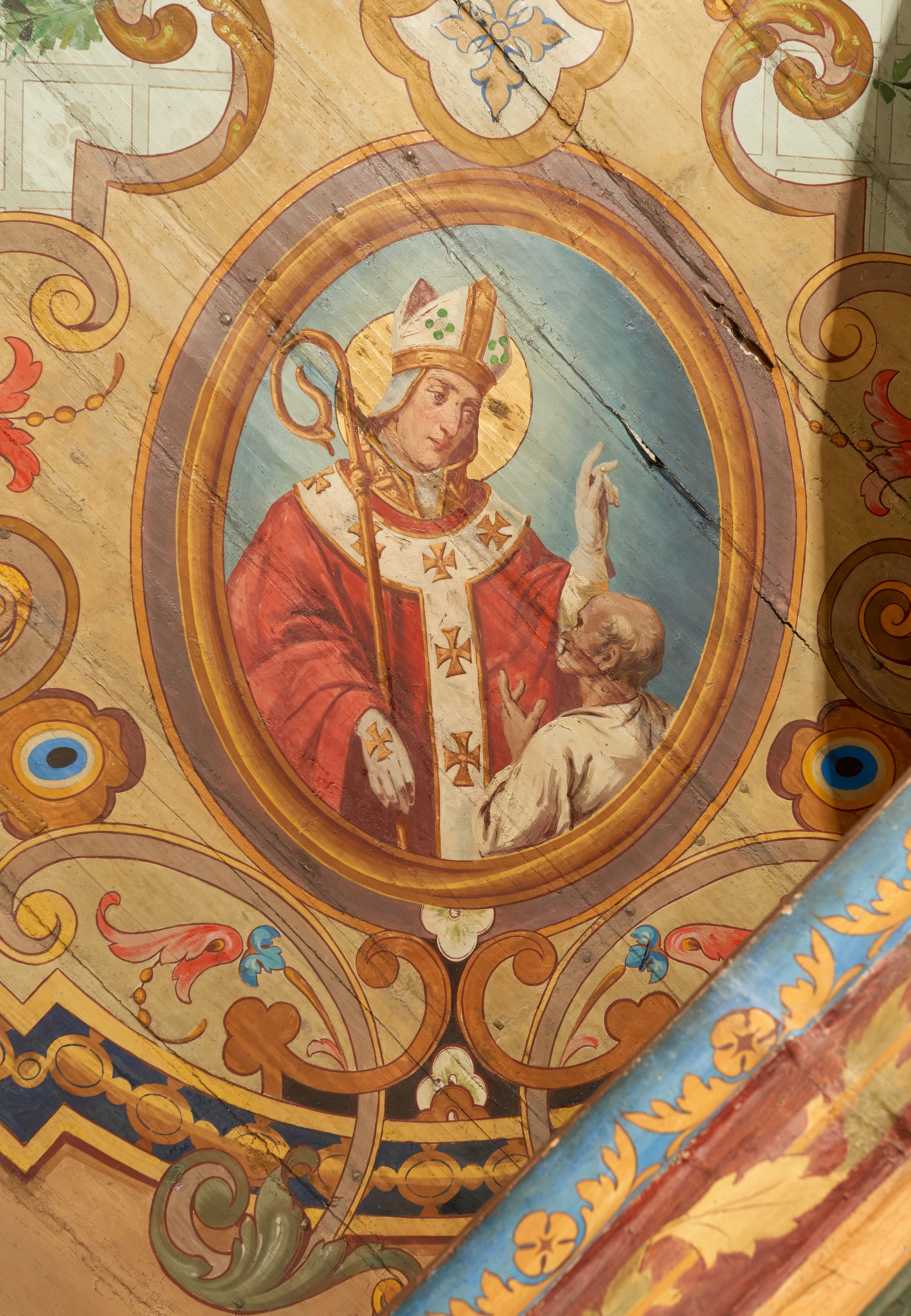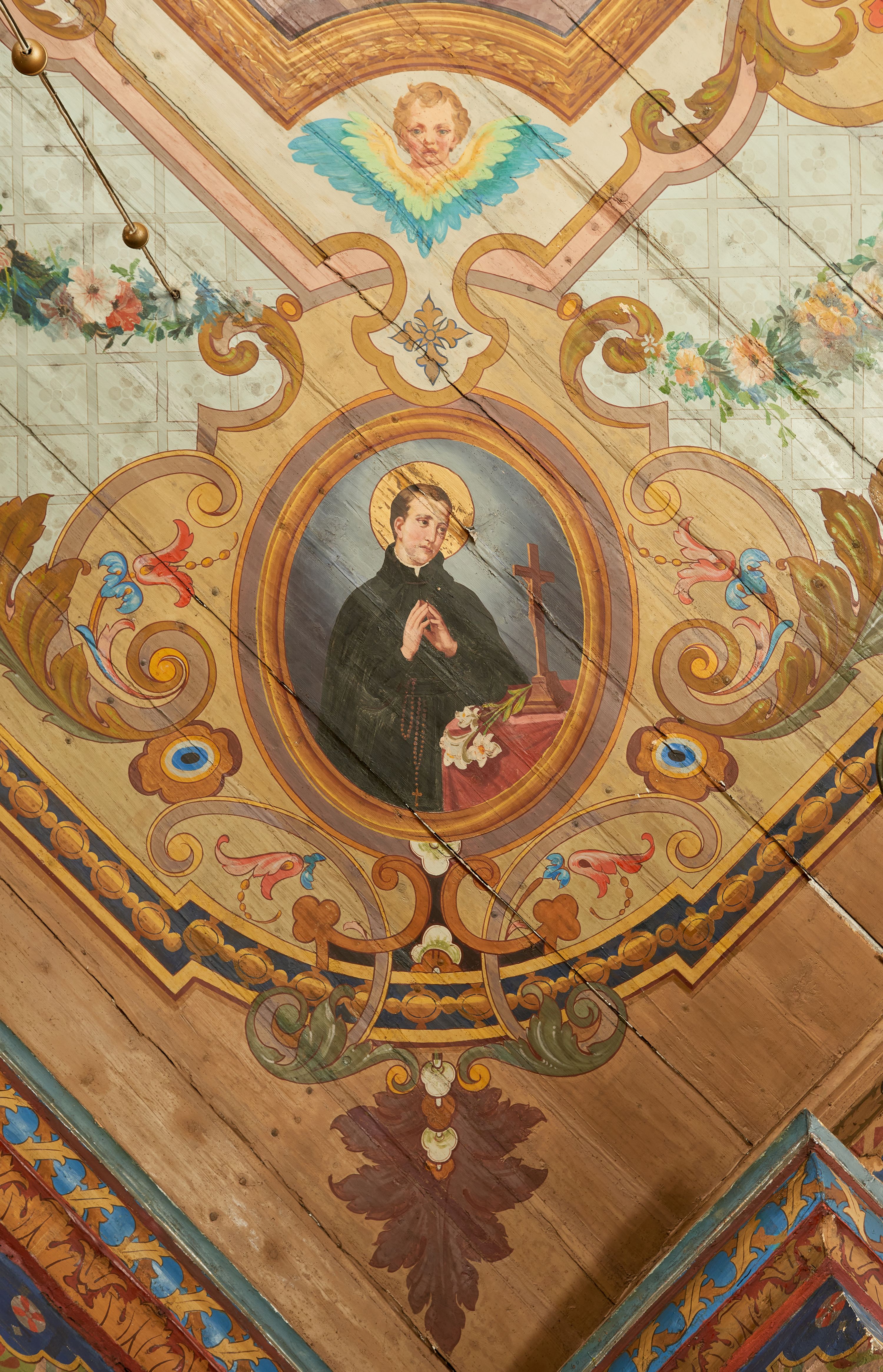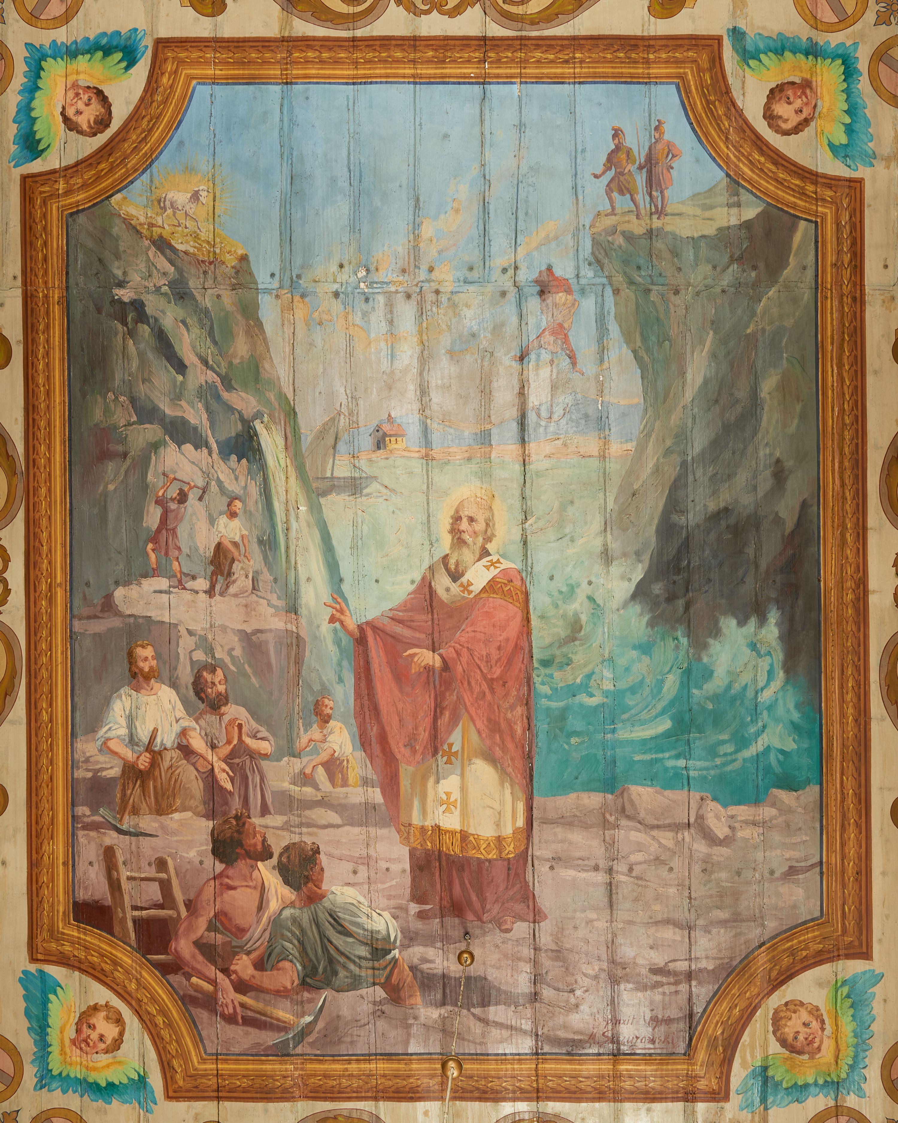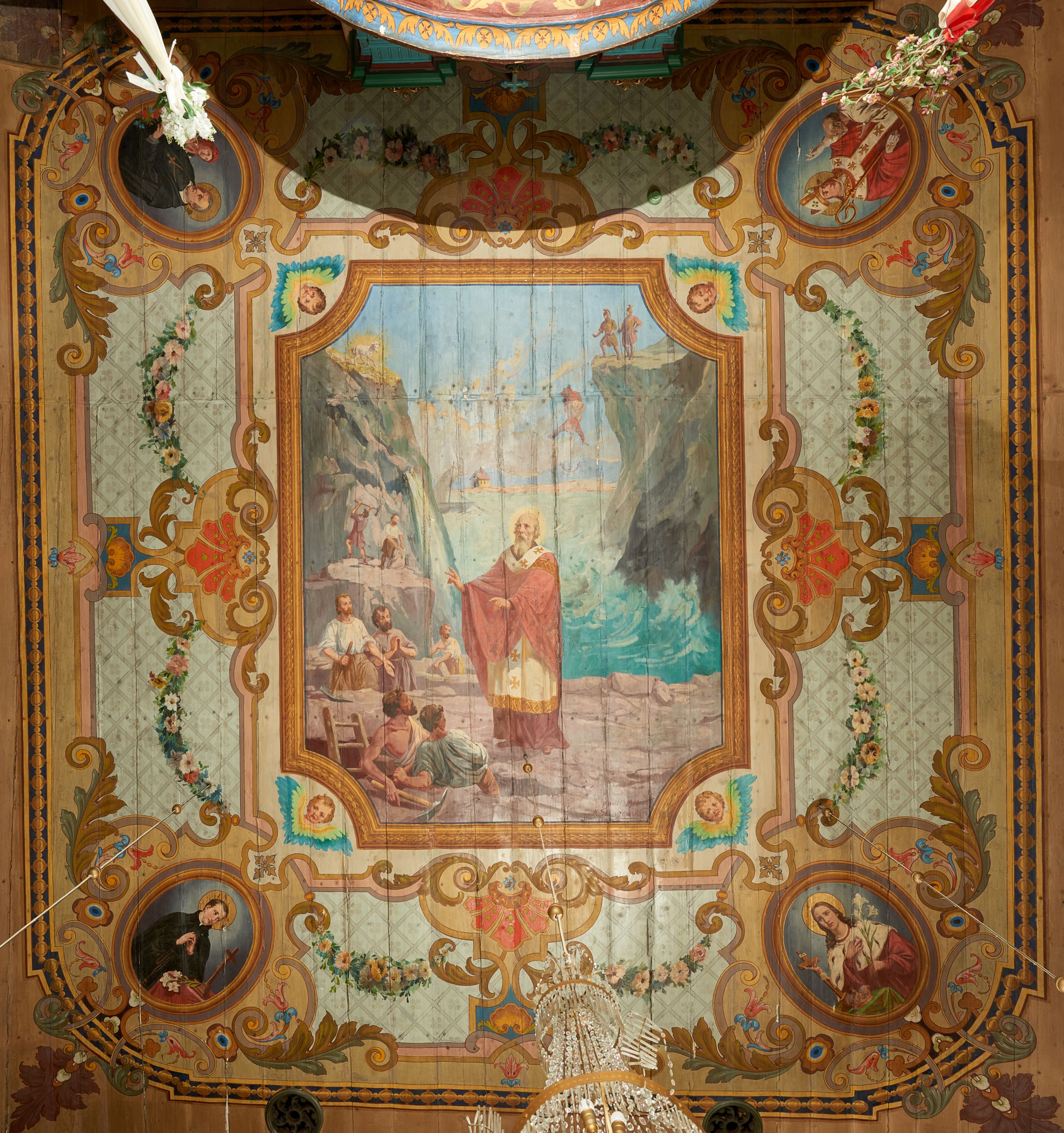 Na stropie nawy malowana płycina w formie stojącego prostokąta o zaokrąglonych narożach, ujęta niebieską ramą o geometrycznym wzorze, w miejscu naroży stylizowane roślinne palmety. W narożach płyciny cztery owalne medaliony z popiersiami św. Stanisława Kostki, św. Kazimierza Jagiellończyka, św. Stanisława z Piotrowinem i św. Jana Kantego. Medaliony ujęte są wolutowymi kartuszami, dekorowanymi stylizowanym ornamentem roślinnym. W polu centralnym malowanej płyciny scena ze św. Klemensem w formie stojącego prostokąta o wklęsłych narożach, ujęta malowaną ramą, w narożach uskrzydlone główki anielskie. Scena otoczona drugą ramą o fantazyjnym zarysie, dekorowaną na bokach fantazyjnymi szczytami z ornamentem roślinnym, które połączone są kwiecistymi girlandami z narożnymi kartuszami. Scena ze św. Klemensem przedstawia go w kamieniołomie, błogosławiącego robotników z kilofami. Święty ukazany jest jako starzec, z siwą brodą i włosami oraz łysiną na głowie. Ubrany jest w jasnofioletową sutannę, białą rokietę z dekoracyjnym obszyciem oraz jasnoczerwony, szeroki ornat, na piersi ma paliusz. W tle pomiędzy dwoma wzniesieniami skalnymi widoczne morze, z płynącym statkiem, w oddali zaś brzeg z domem. Na skarpie w lewej części obrazu ukazany baranek w glorii promienistej, na przeciwległej dwaj żołnierze, którzy zrzucili świętego z kotwicą zawieszoną u szyi do morza. Przy dolnej krawędzi obrazu sygnatura „pinxit 1910 / M. Szczurowski”.