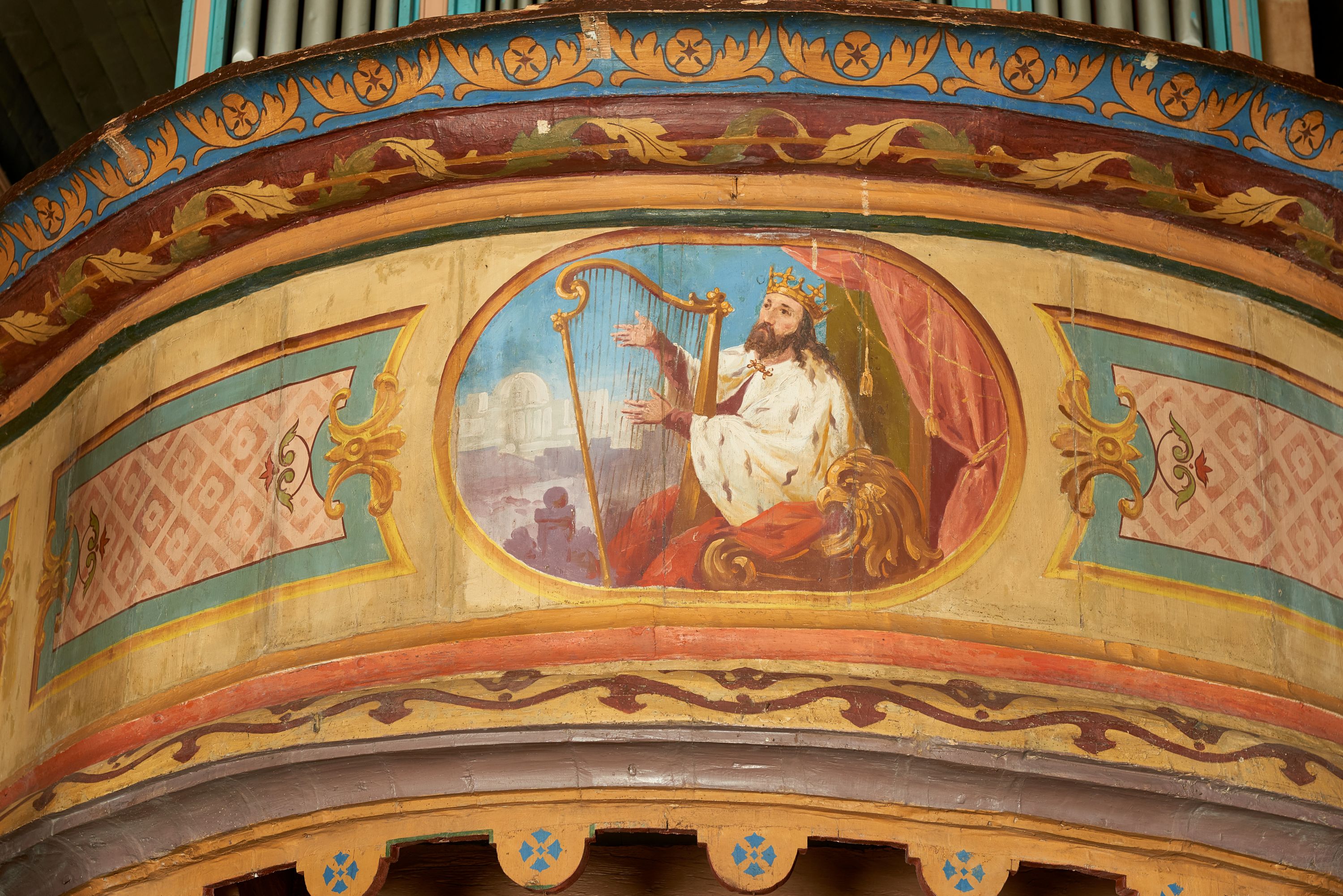 W zachodniej części nawy beżowa balustrada chóru muzycznego, na której namalowane są prostokątne płyciny, o krótszych bokach dekorowanych motywem roślinnym. Ich pola wypełnia niebieska opaska oraz różowa kratka ze zdobieniem roślinnym. Płycina środkowa w formie owalu z przedstawieniem Dawida, siedzącego na tronie i grającego na harfie. Postać ukazana do połowy, zwrócona w trzech czwartych w prawo, dwiema wyciągniętymi rękami dotyka strun harfy. Dawid o pociągłej twarzy, ze schematycznie oddanymi rysami, okolony brązowymi włosami i brodą. Na głowie ma koronę otwartą. Ubrany jest w czerwoną suknię, na ramiona ma narzuconą gronostajową pelerynę. Nad nim zawieszony czerwony baldachim, z zieloną podszewką. W oddali widoczny zarys zabudowań miejskich. Profile cokołu i gzymsu balustrady malowane w kolorowe pasy, z dekoracją roślinną.