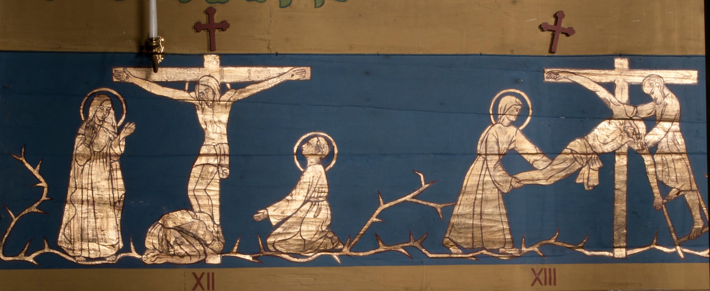Na ścianach i sklepieniu kościoła w Górce Kościelnickiej przedstawiono bogaty program ikonograficzny. Powyżej stacji drogi krzyżowej umieszczono szereg najważniejszych (w tym wielu polskich) świętych opatrzonych stosownymi cytatami z Pisma Świętego. Na stropie wokół ukrzyżowanego Chrystusa zgromadzono kolejnych, w prezbiterium natomiast ukoronowanej Marii przyglądają się apostołowie. Całość zbliża się do konwencji sztuki ludowej: formy są uproszczone, kolorystyka jasna, postacie przedziela bujna wić z rozetami i kiśćmi winogron.