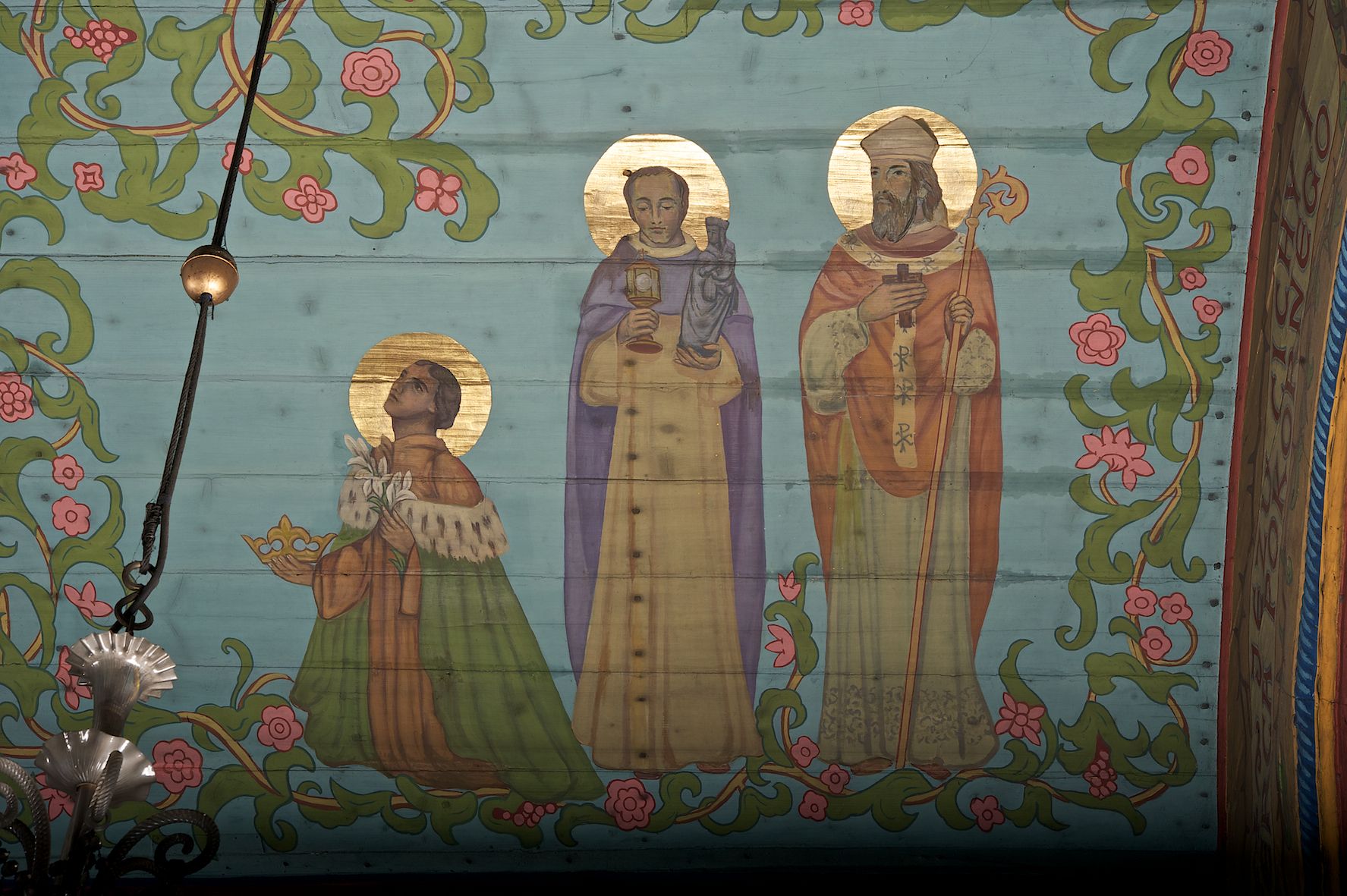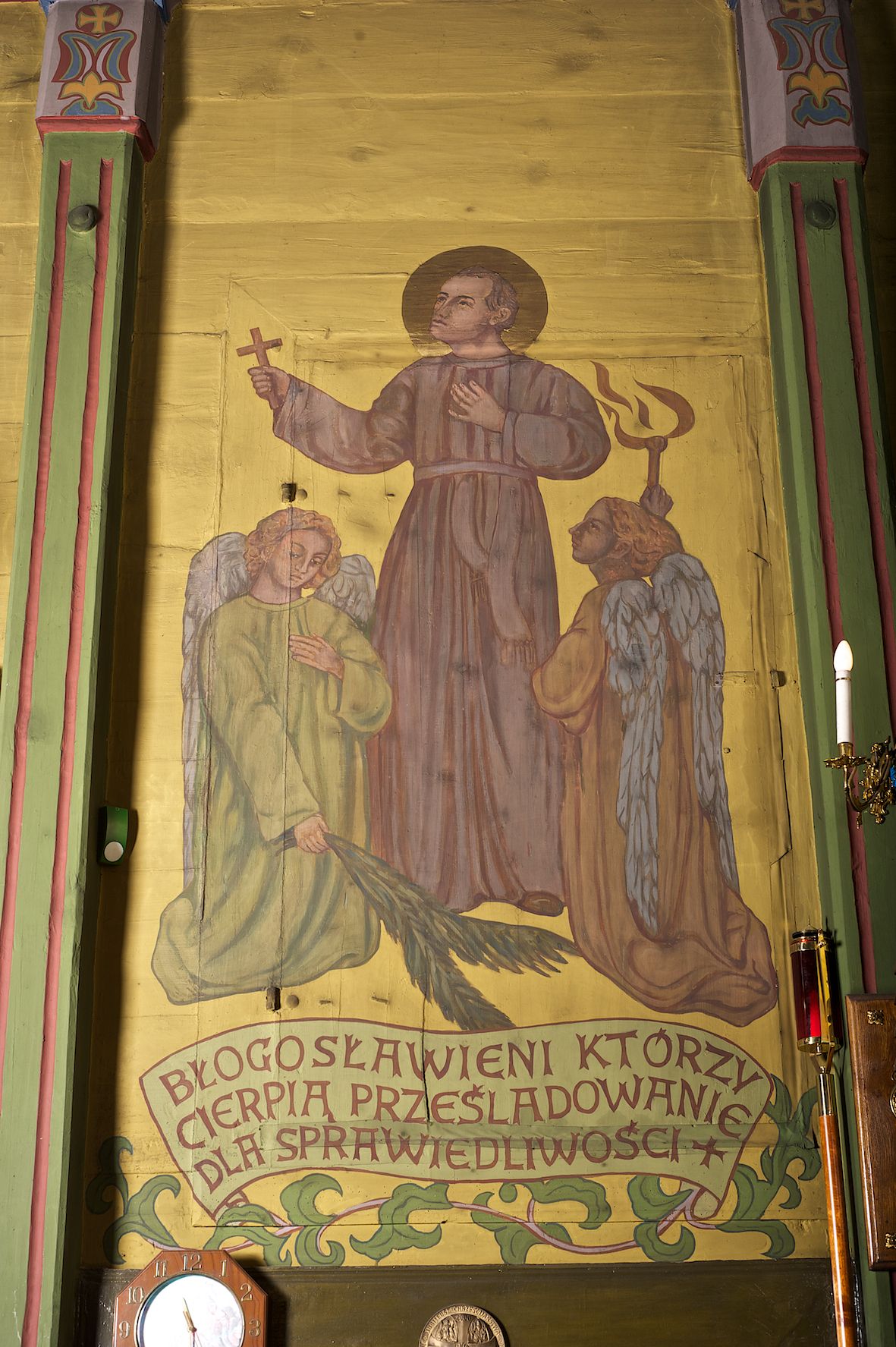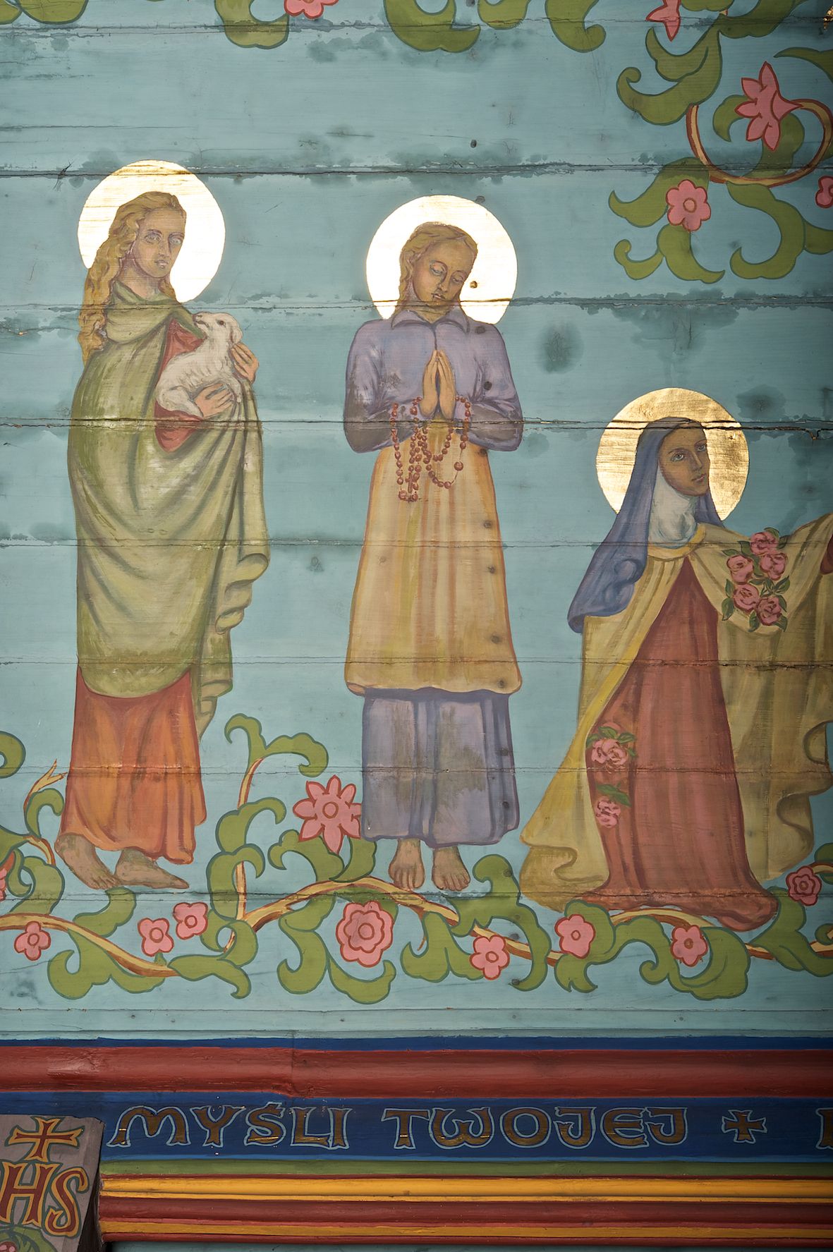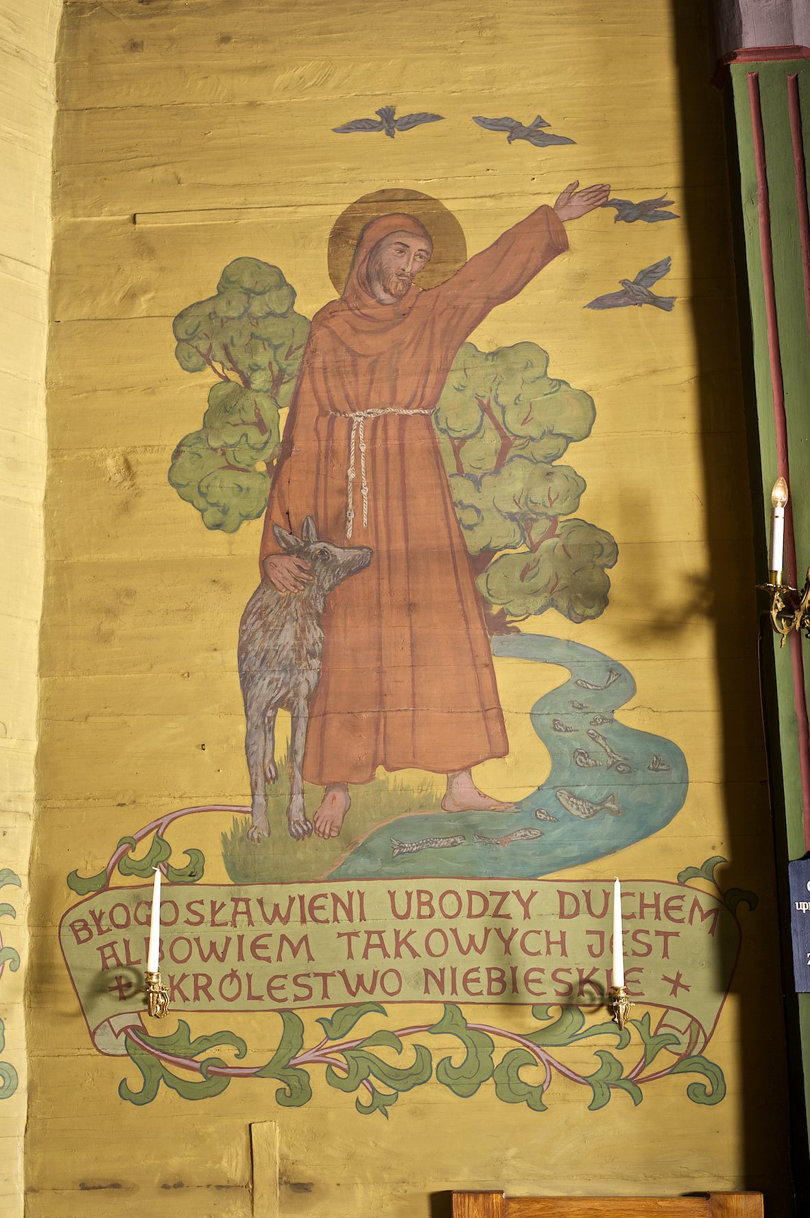 Ściany kościoła dekorują przedstawienia świętych: św. Stanisław w stroju pontyfikalnym z pastorałem, wskrzeszający Piotrowina. Poniżej na banderoli napis „BŁOGOSŁAWIENI KTÓRZY ŁAKNĄ / I PRAGNĄ SPRAWIEDLIWOŚCI”; św. Jadwiga w koronie i płaszczu podszytym gronostajem, trzymająca skrzyneczkę z klejnotami oraz krzyż z herbami Polski i Litwy. Na banderoli napis „BŁOGOSŁAWIENI / POKÓJ CZYNIĄCY”; św. Jan Kanty błogosławiący dziewczynę z dzbanem podpisany „BŁOGOSŁAWIENI / MIŁOSIERNI”; św. w habicie, z krzyżem w ręce i w asyście dwóch aniołów - jednego z palmą męczeństwa, drugiego z płonącą pochodnią, pod nimi napis „BŁOGOSŁAWIENI KTÓRZY / CIERPIĄ PRZEŚLADOWANIA DLA SPRAWIEDLIWOŚCI”; Chrystus z sercem gorejącym. Po jego prawej stronie klęczący mężczyzna, po lewej dwie owieczki nad strumieniem. Scena podpisana: „KTÓRZY PRACUJECIE I / OBCIĄŻENI JESTEŚCIE / A JA WAS OCHŁODZĘ”; archanioł Gabriel z lilią powyżej napisu „ZDROWAŚ MARIO”; archanioł Michał z trybularzem, ponad napisem „KTÓŻ JAK BÓG!”; św. Franciszek na tle przyrody. Jest ubrany w habit franciszkański, na głowie ma kaptur. Przy prawej nodze świętego wilk, w jeziorze ryby, na niebie ptaki. Na banderoli napis „BŁOGOSŁAWIENI UBODZY DUCHEM / ALBOWIEM TAKOWYCH JEST / KRÓLESTWO NIEBIESKIE”; św. Izydor Oracz ukazany w towarzystwie anioła orającego na polu na tle dzwonnicy. Poniżej napis „BŁOGOSŁAWIENI CISI / ALBOWIEM ONI / POSIĄDĄ ZIEMIĘ”. Poniżej postaci świętych fryz z przedstawieniem 14 stacji drogi krzyżowej na błękitnym tle. Na stropie nawy i prezbiterium, na błękitnym tle, wśród kwiatowego ornamentu na środku ukazany Chrystus Ukrzyżowany ponad kielichem, gołębica Ducha Świętego i koronowana Maria. Po ich obu stronach stoją święci mężowie i niewiasty z atrybutami. W nawie w kolejności do środka: św. Wojciech (?), św. Jacek z figurą Matki Boskiej i monstrancją, klęczący św. Kazimierz w stroju książęcym z lilią, św. Agnieszka z barankiem i św. Karolina Kózkówna z różańcem, klęcząca św. Rozalia z różami, św. Klara z cyborium, św. Weronika z chustą z wizerunkiem Chrystusa, klęcząca św. Cecylia z lirą, św. Józef z lilią, św. Paweł z mieczem, klęczący św. Jan Chrzciciel z krzyżem. W prezbiterium przedstawiono 12 apostołów, niektórzy z atrybutmi, które ich jednoznacznie identyfilują, np. św. Andrzej z krzyżem w kształcie litery X, inni z księgami lub zwojami.