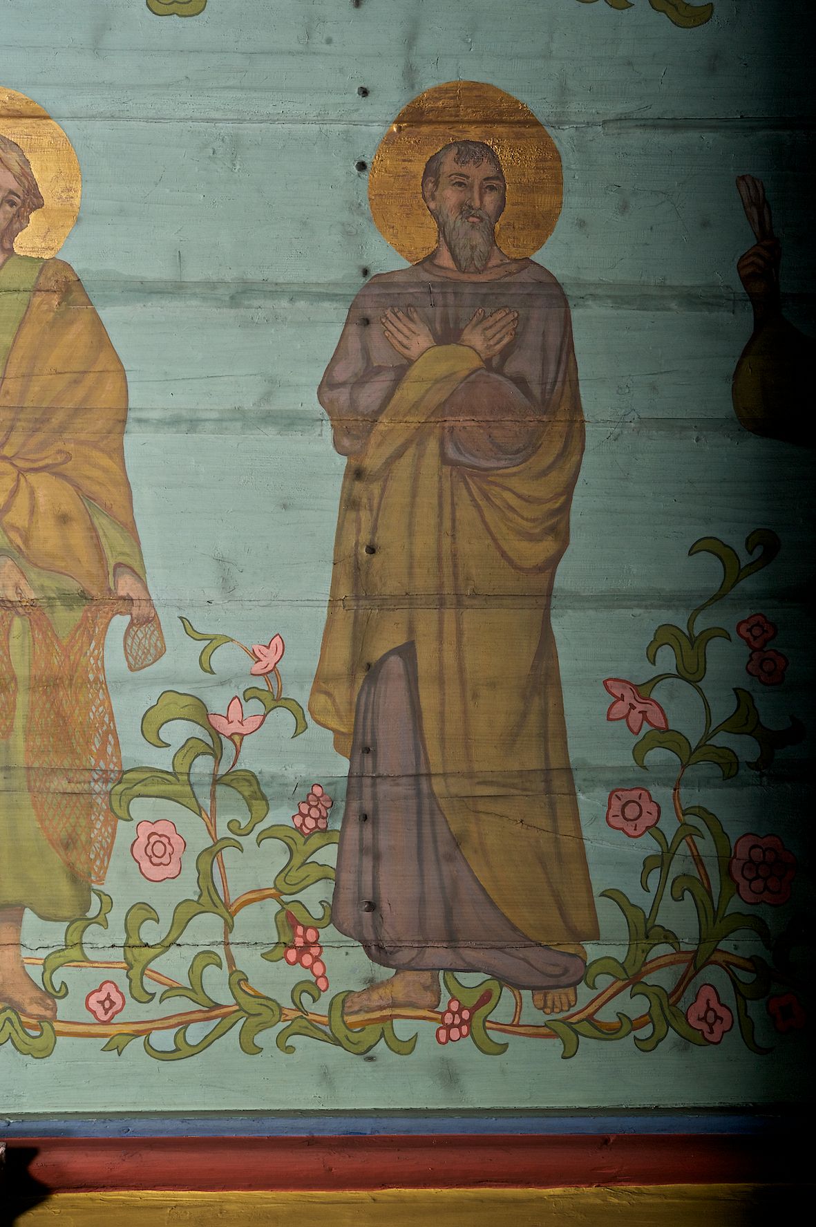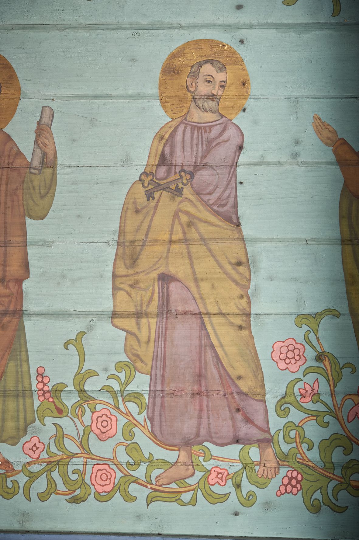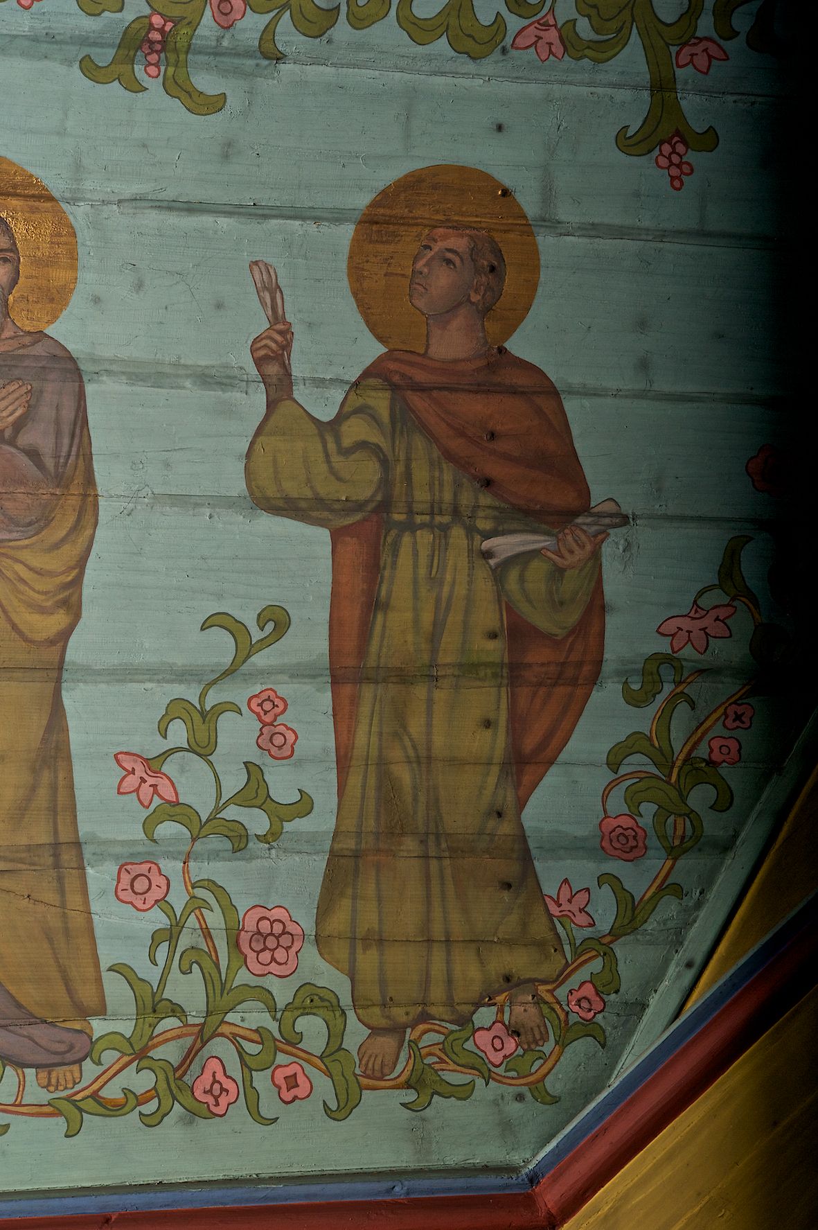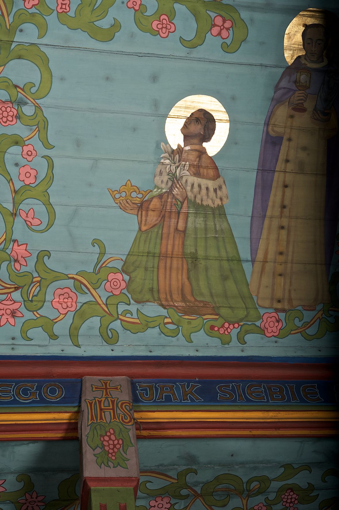 Ściany kościoła dekorują przedstawienia świętych: św. Stanisław w stroju pontyfikalnym z pastorałem, wskrzeszający Piotrowina. Poniżej na banderoli napis „BŁOGOSŁAWIENI KTÓRZY ŁAKNĄ / I PRAGNĄ SPRAWIEDLIWOŚCI”; św. Jadwiga w koronie i płaszczu podszytym gronostajem, trzymająca skrzyneczkę z klejnotami oraz krzyż z herbami Polski i Litwy. Na banderoli napis „BŁOGOSŁAWIENI / POKÓJ CZYNIĄCY”; św. Jan Kanty błogosławiący dziewczynę z dzbanem podpisany „BŁOGOSŁAWIENI / MIŁOSIERNI”; św. w habicie, z krzyżem w ręce i w asyście dwóch aniołów - jednego z palmą męczeństwa, drugiego z płonącą pochodnią, pod nimi napis „BŁOGOSŁAWIENI KTÓRZY / CIERPIĄ PRZEŚLADOWANIA DLA SPRAWIEDLIWOŚCI”; Chrystus z sercem gorejącym. Po jego prawej stronie klęczący mężczyzna, po lewej dwie owieczki nad strumieniem. Scena podpisana: „KTÓRZY PRACUJECIE I / OBCIĄŻENI JESTEŚCIE / A JA WAS OCHŁODZĘ”; archanioł Gabriel z lilią powyżej napisu „ZDROWAŚ MARIO”; archanioł Michał z trybularzem, ponad napisem „KTÓŻ JAK BÓG!”; św. Franciszek na tle przyrody. Jest ubrany w habit franciszkański, na głowie ma kaptur. Przy prawej nodze świętego wilk, w jeziorze ryby, na niebie ptaki. Na banderoli napis „BŁOGOSŁAWIENI UBODZY DUCHEM / ALBOWIEM TAKOWYCH JEST / KRÓLESTWO NIEBIESKIE”; św. Izydor Oracz ukazany w towarzystwie anioła orającego na polu na tle dzwonnicy. Poniżej napis „BŁOGOSŁAWIENI CISI / ALBOWIEM ONI / POSIĄDĄ ZIEMIĘ”. Poniżej postaci świętych fryz z przedstawieniem 14 stacji drogi krzyżowej na błękitnym tle. Na stropie nawy i prezbiterium, na błękitnym tle, wśród kwiatowego ornamentu na środku ukazany Chrystus Ukrzyżowany ponad kielichem, gołębica Ducha Świętego i koronowana Maria. Po ich obu stronach stoją święci mężowie i niewiasty z atrybutami. W nawie w kolejności do środka: św. Wojciech (?), św. Jacek z figurą Matki Boskiej i monstrancją, klęczący św. Kazimierz w stroju książęcym z lilią, św. Agnieszka z barankiem i św. Karolina Kózkówna z różańcem, klęcząca św. Rozalia z różami, św. Klara z cyborium, św. Weronika z chustą z wizerunkiem Chrystusa, klęcząca św. Cecylia z lirą, św. Józef z lilią, św. Paweł z mieczem, klęczący św. Jan Chrzciciel z krzyżem. W prezbiterium przedstawiono 12 apostołów, niektórzy z atrybutmi, które ich jednoznacznie identyfilują, np. św. Andrzej z krzyżem w kształcie litery X, inni z księgami lub zwojami.