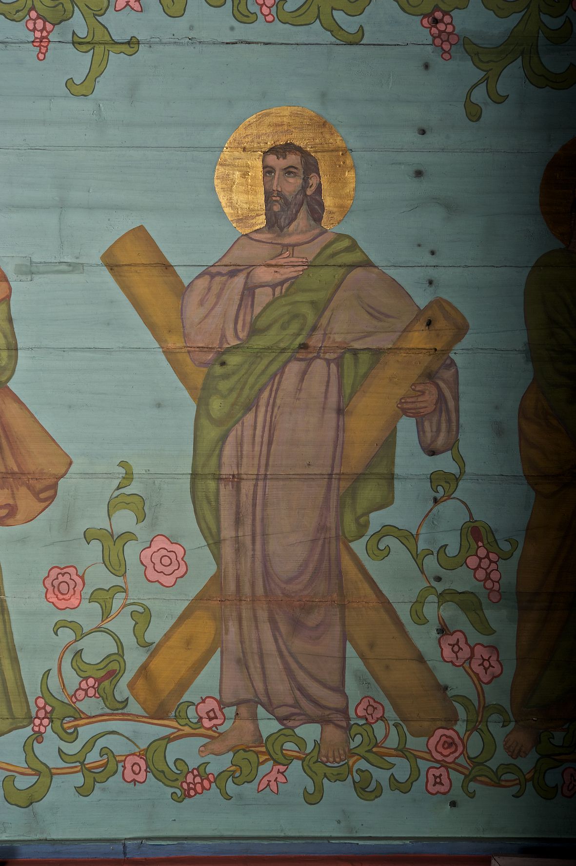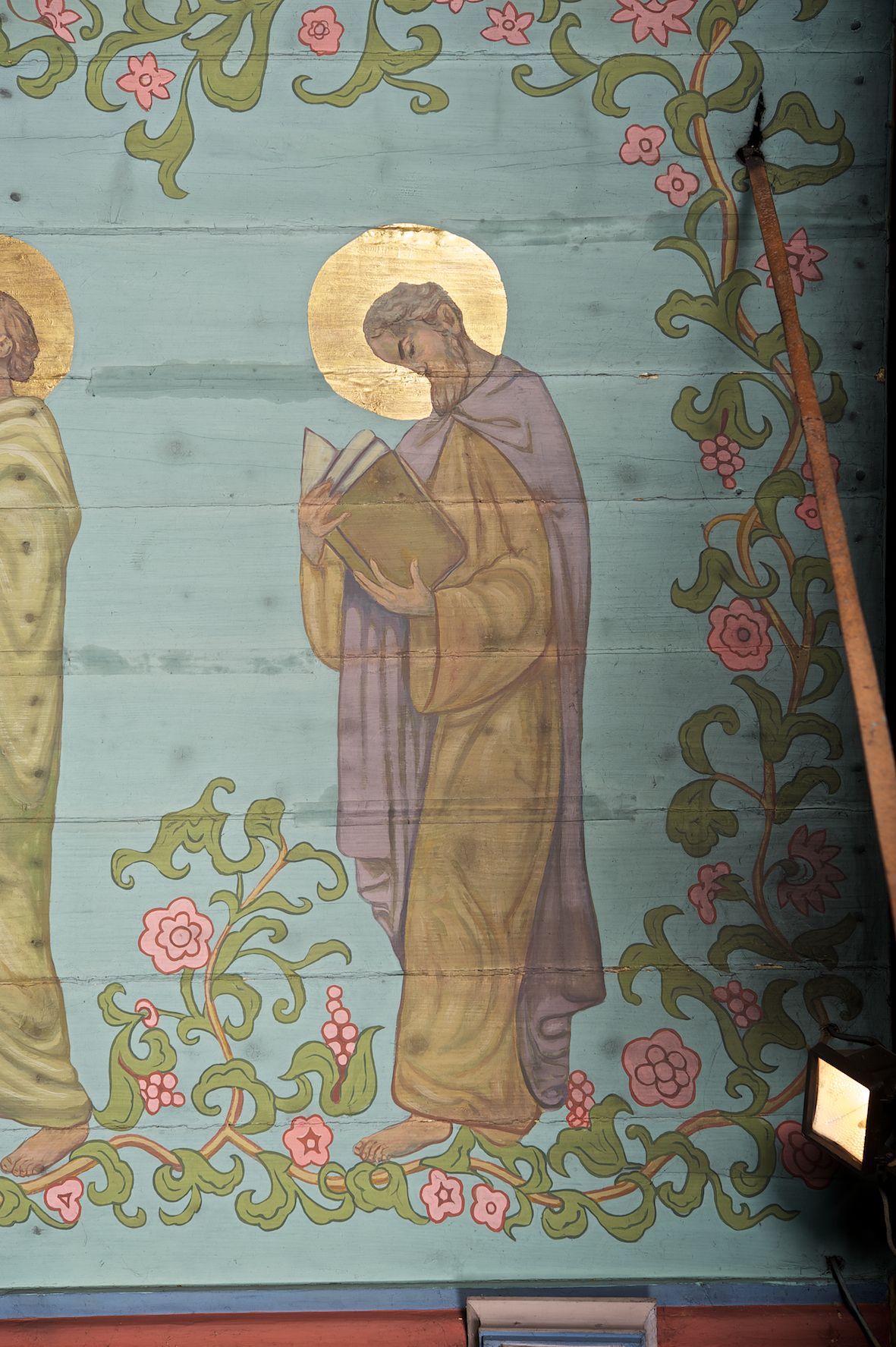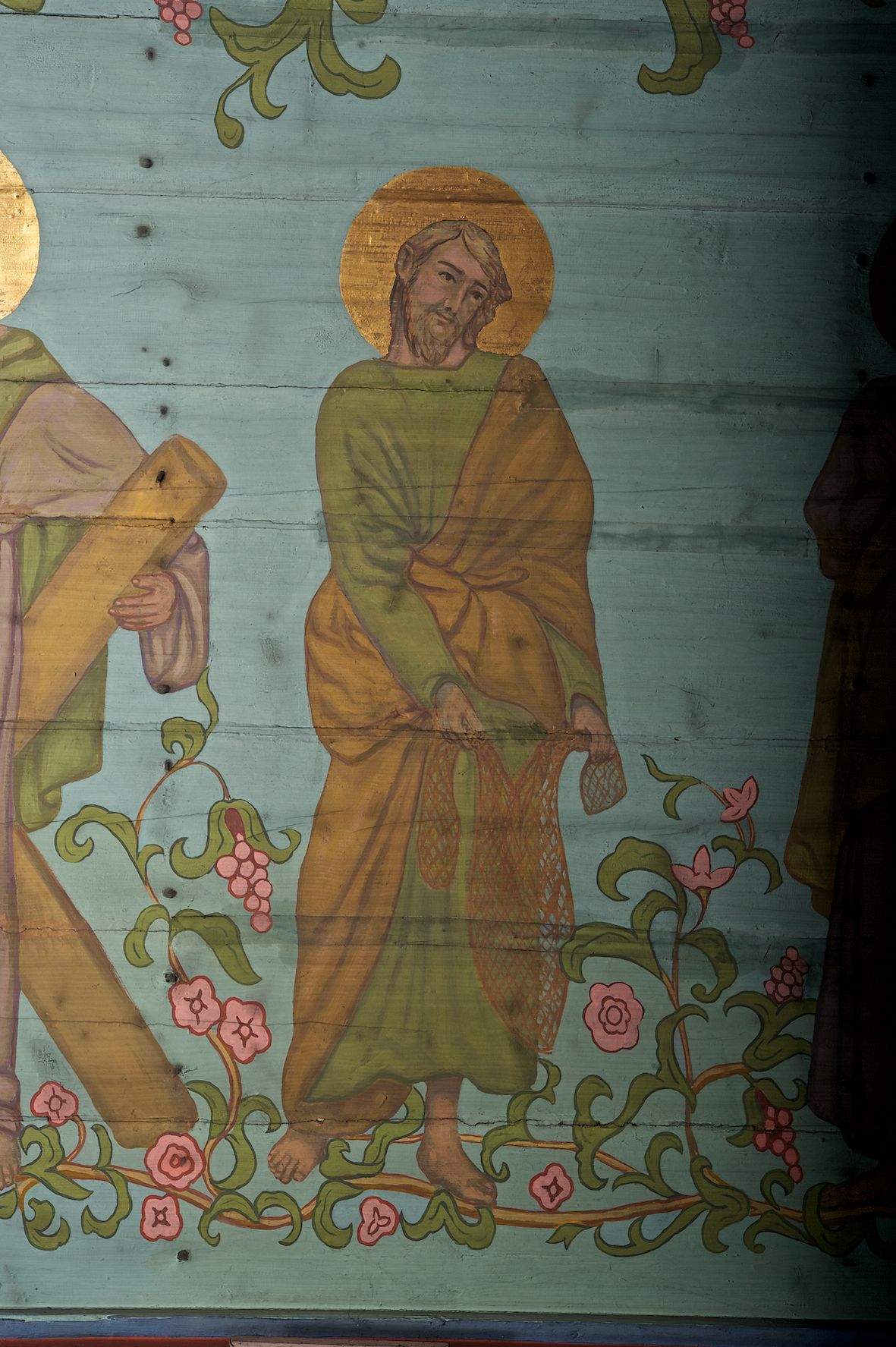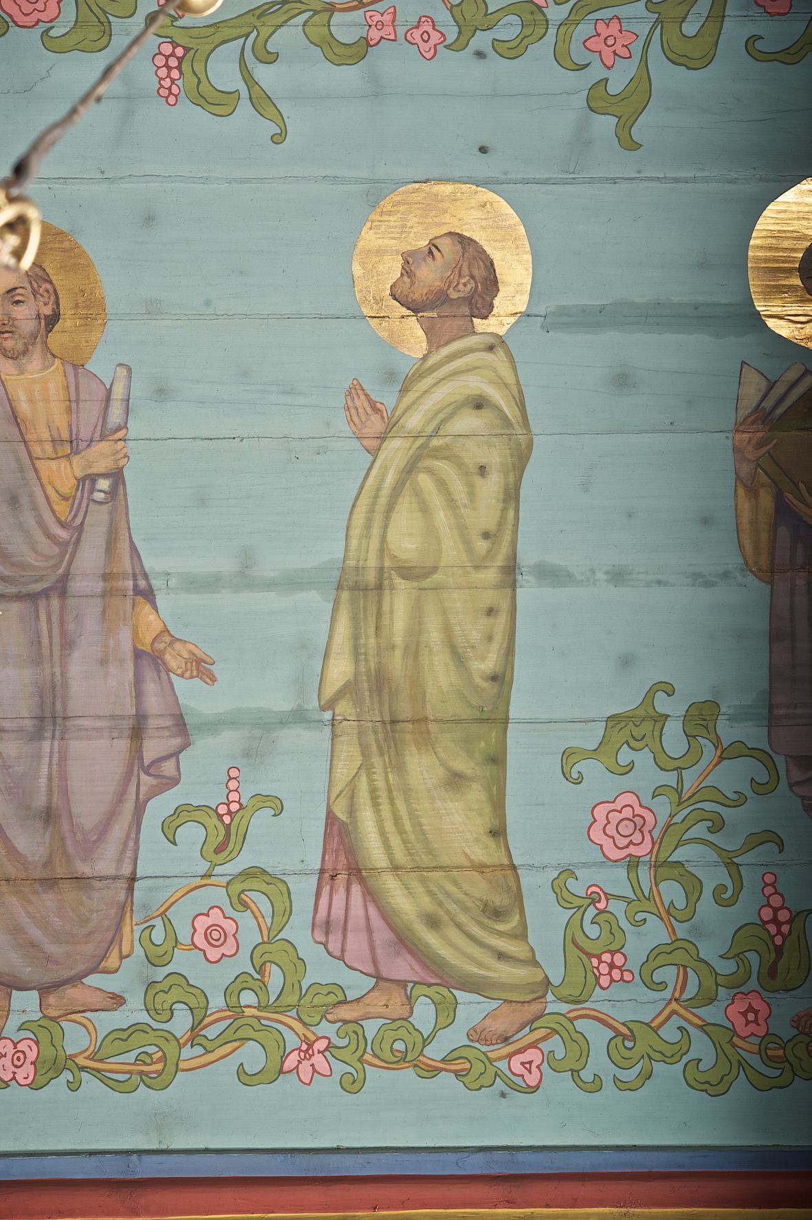 Ściany kościoła dekorują przedstawienia świętych: św. Stanisław w stroju pontyfikalnym z pastorałem, wskrzeszający Piotrowina. Poniżej na banderoli napis „BŁOGOSŁAWIENI KTÓRZY ŁAKNĄ / I PRAGNĄ SPRAWIEDLIWOŚCI”; św. Jadwiga w koronie i płaszczu podszytym gronostajem, trzymająca skrzyneczkę z klejnotami oraz krzyż z herbami Polski i Litwy. Na banderoli napis „BŁOGOSŁAWIENI / POKÓJ CZYNIĄCY”; św. Jan Kanty błogosławiący dziewczynę z dzbanem podpisany „BŁOGOSŁAWIENI / MIŁOSIERNI”; św. w habicie, z krzyżem w ręce i w asyście dwóch aniołów - jednego z palmą męczeństwa, drugiego z płonącą pochodnią, pod nimi napis „BŁOGOSŁAWIENI KTÓRZY / CIERPIĄ PRZEŚLADOWANIA DLA SPRAWIEDLIWOŚCI”; Chrystus z sercem gorejącym. Po jego prawej stronie klęczący mężczyzna, po lewej dwie owieczki nad strumieniem. Scena podpisana: „KTÓRZY PRACUJECIE I / OBCIĄŻENI JESTEŚCIE / A JA WAS OCHŁODZĘ”; archanioł Gabriel z lilią powyżej napisu „ZDROWAŚ MARIO”; archanioł Michał z trybularzem, ponad napisem „KTÓŻ JAK BÓG!”; św. Franciszek na tle przyrody. Jest ubrany w habit franciszkański, na głowie ma kaptur. Przy prawej nodze świętego wilk, w jeziorze ryby, na niebie ptaki. Na banderoli napis „BŁOGOSŁAWIENI UBODZY DUCHEM / ALBOWIEM TAKOWYCH JEST / KRÓLESTWO NIEBIESKIE”; św. Izydor Oracz ukazany w towarzystwie anioła orającego na polu na tle dzwonnicy. Poniżej napis „BŁOGOSŁAWIENI CISI / ALBOWIEM ONI / POSIĄDĄ ZIEMIĘ”. Poniżej postaci świętych fryz z przedstawieniem 14 stacji drogi krzyżowej na błękitnym tle. Na stropie nawy i prezbiterium, na błękitnym tle, wśród kwiatowego ornamentu na środku ukazany Chrystus Ukrzyżowany ponad kielichem, gołębica Ducha Świętego i koronowana Maria. Po ich obu stronach stoją święci mężowie i niewiasty z atrybutami. W nawie w kolejności do środka: św. Wojciech (?), św. Jacek z figurą Matki Boskiej i monstrancją, klęczący św. Kazimierz w stroju książęcym z lilią, św. Agnieszka z barankiem i św. Karolina Kózkówna z różańcem, klęcząca św. Rozalia z różami, św. Klara z cyborium, św. Weronika z chustą z wizerunkiem Chrystusa, klęcząca św. Cecylia z lirą, św. Józef z lilią, św. Paweł z mieczem, klęczący św. Jan Chrzciciel z krzyżem. W prezbiterium przedstawiono 12 apostołów, niektórzy z atrybutmi, które ich jednoznacznie identyfilują, np. św. Andrzej z krzyżem w kształcie litery X, inni z księgami lub zwojami.