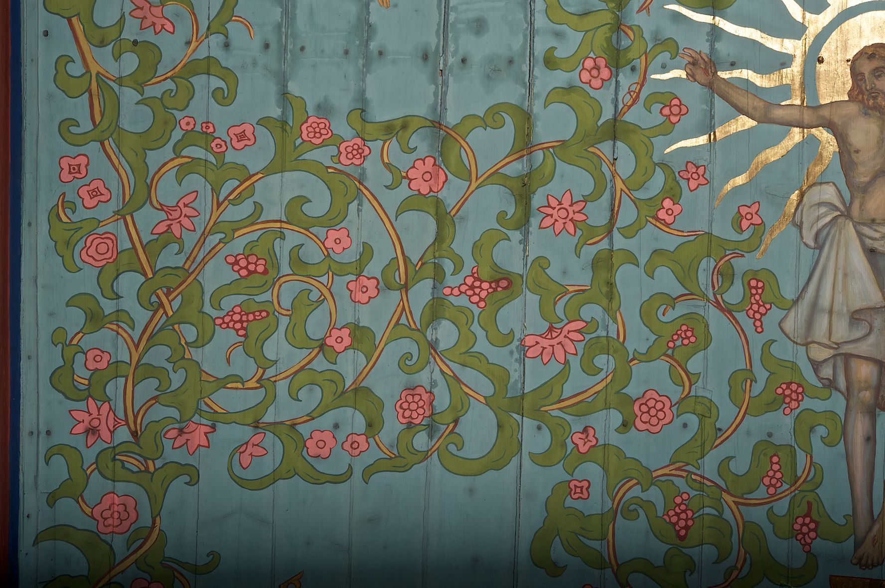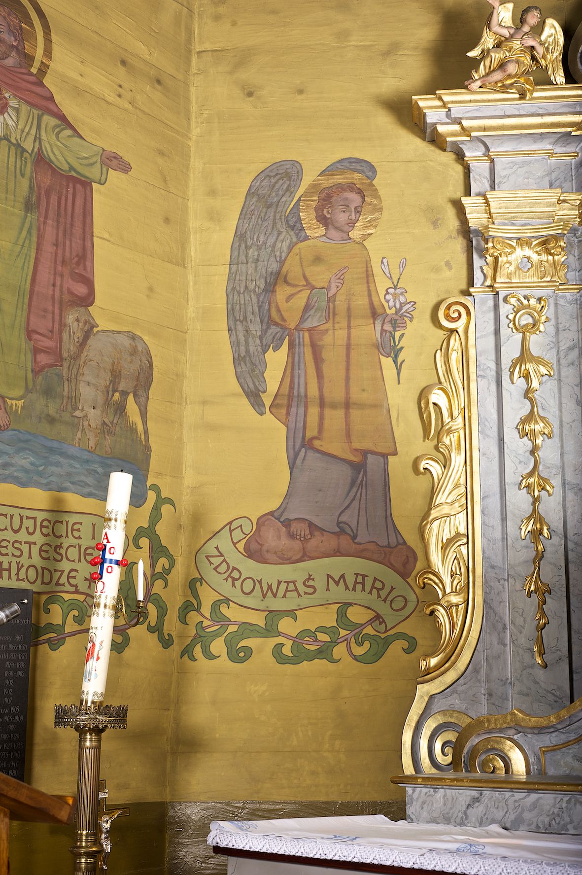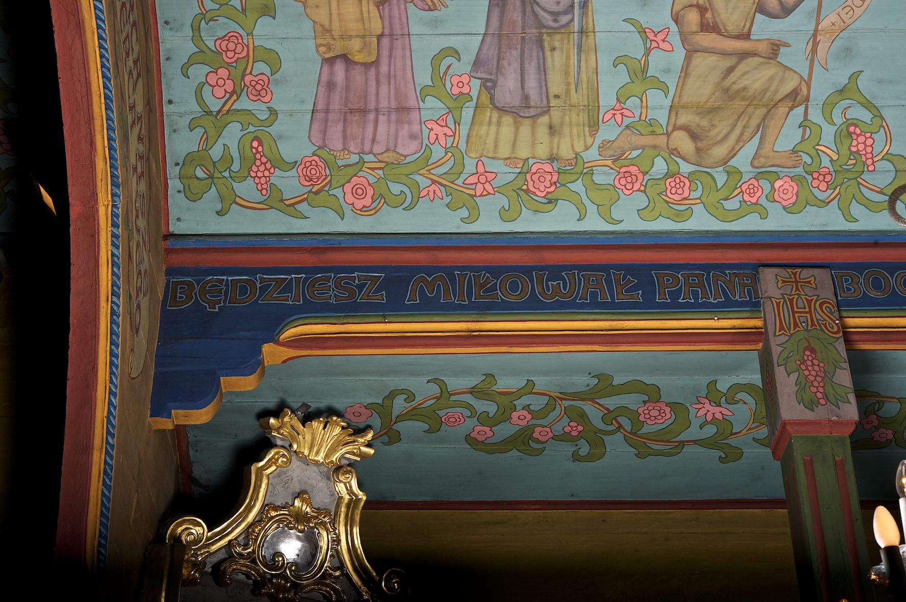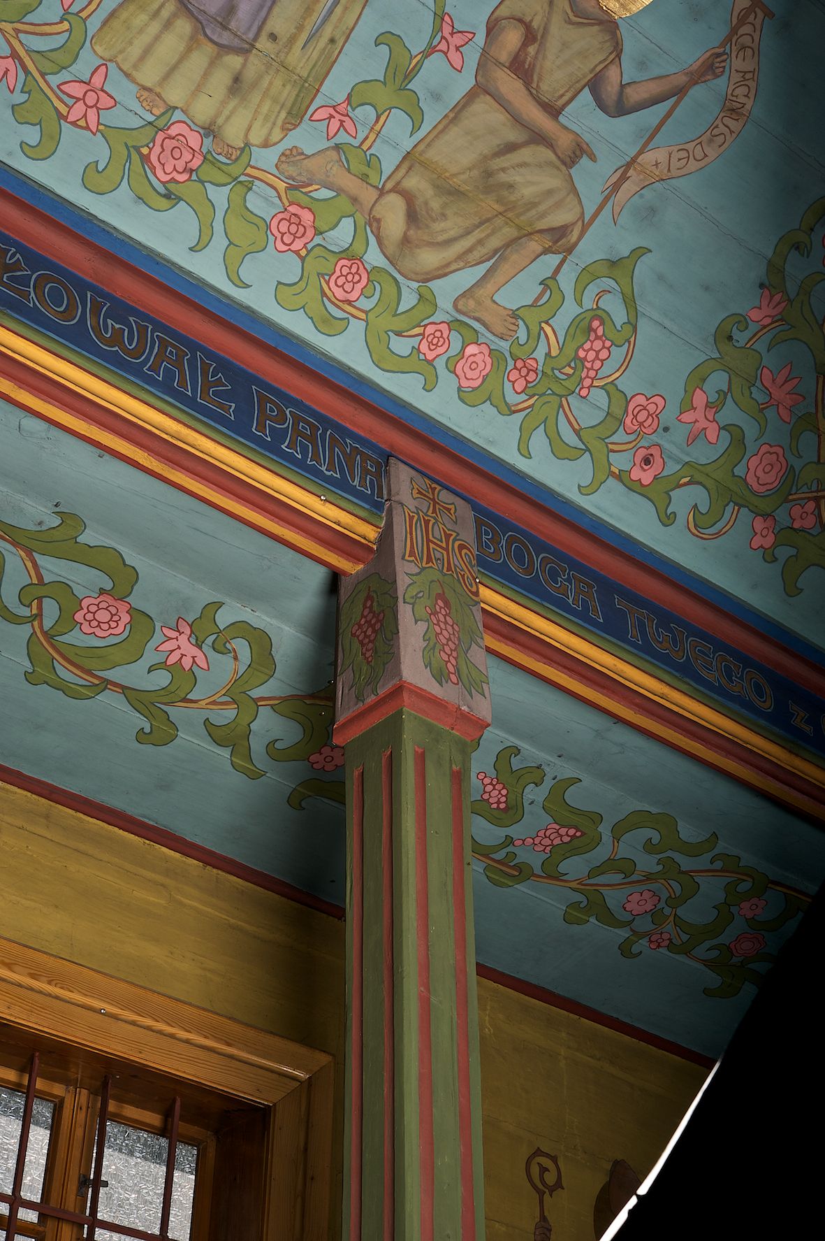 Polichromia ścian i stropów kościoła została namalowana w 1953 roku przez artystkę, absolwentkę krakowskiej Akademii Sztuk Pięknych, Jadwigę Rymarównę. Skomponowano program ikonograficzny złożony z cytatów z Pisma Świętego i świętych postaci zgromadzonych wokół ukrzyżowanego Jezusa, Marii i gołębicy Ducha Świętego. Postacie otacza ich bujna wić roślinna z rozetami i kiśćmi winogron.