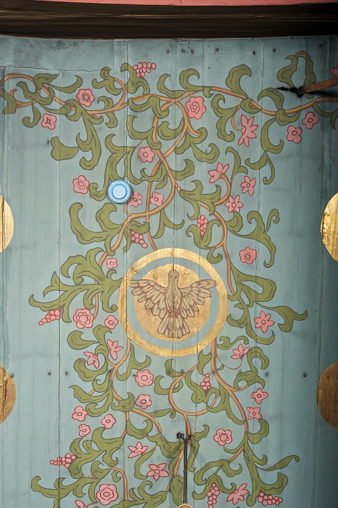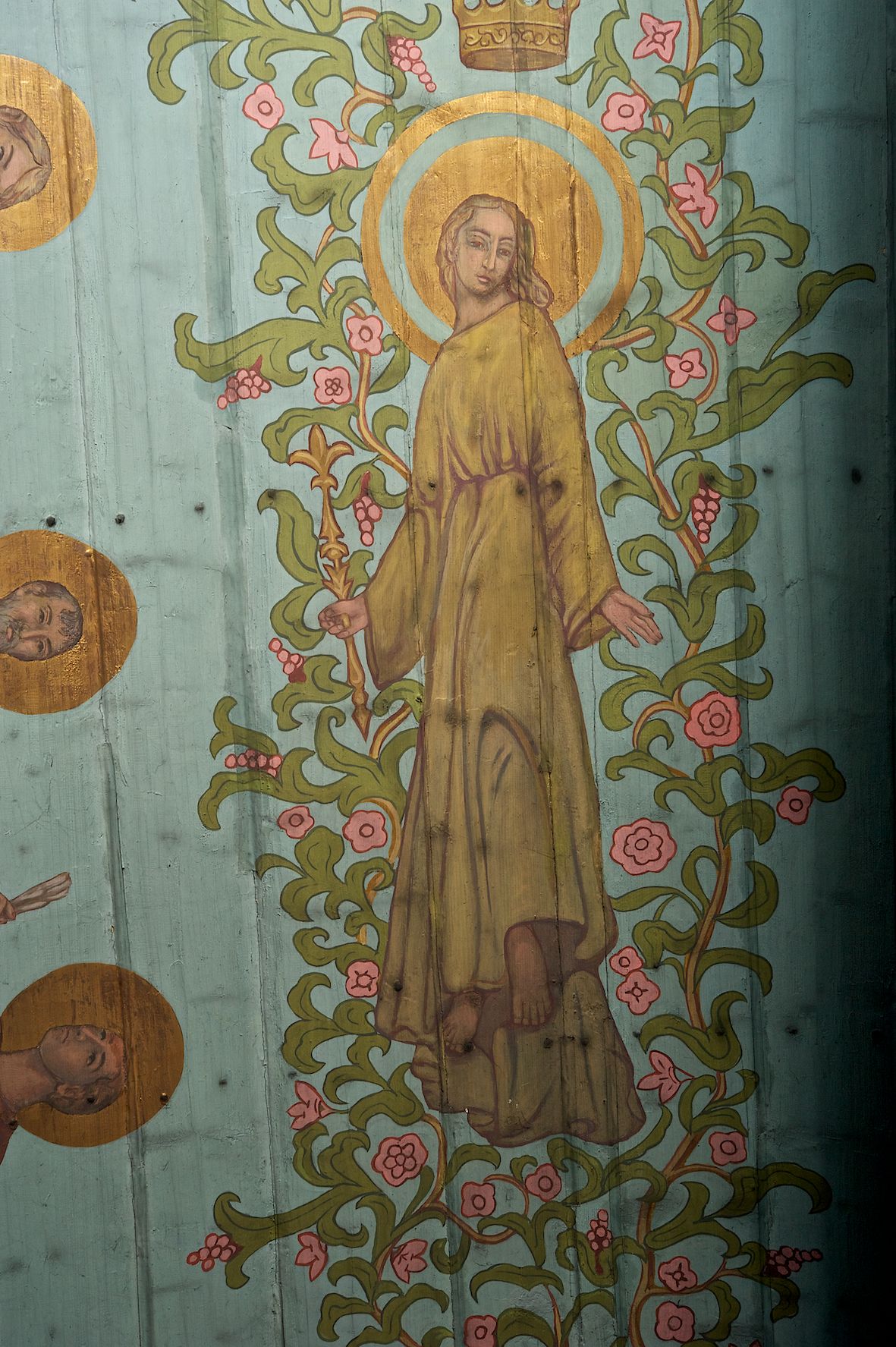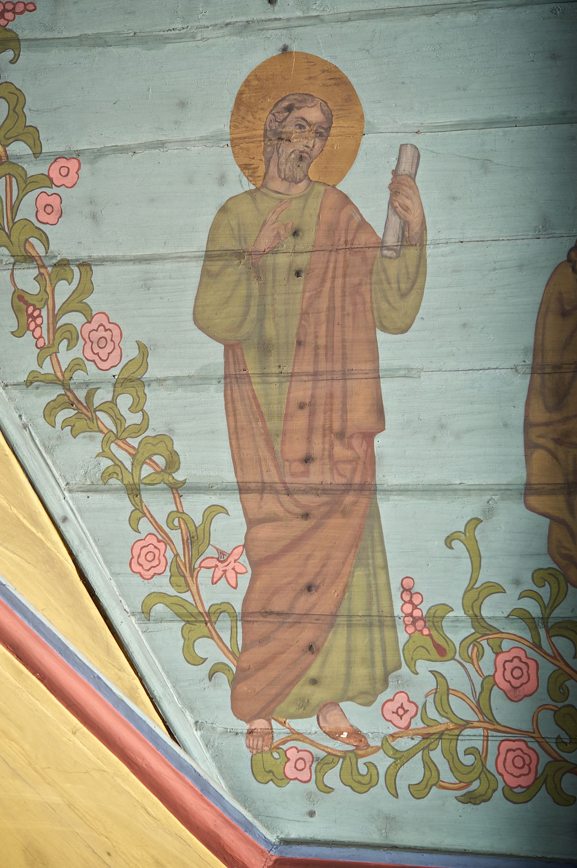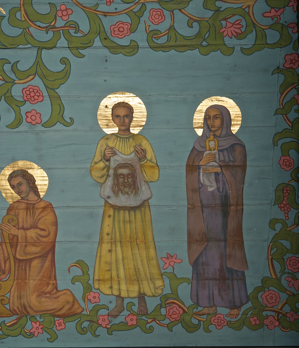 Polichromia ścian i stropów kościoła została namalowana w 1953 roku przez artystkę, absolwentkę krakowskiej Akademii Sztuk Pięknych, Jadwigę Rymarównę. Skomponowano program ikonograficzny złożony z cytatów z Pisma Świętego i świętych postaci zgromadzonych wokół ukrzyżowanego Jezusa, Marii i gołębicy Ducha Świętego. Postacie otacza ich bujna wić roślinna z rozetami i kiśćmi winogron.