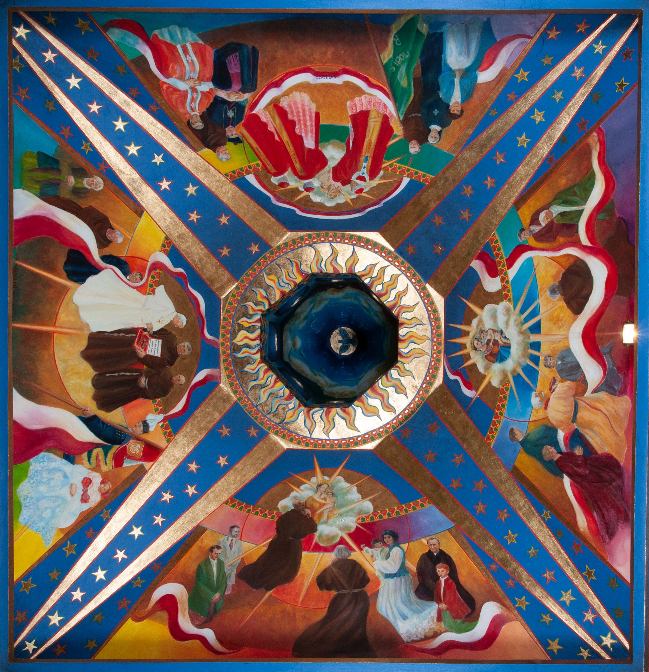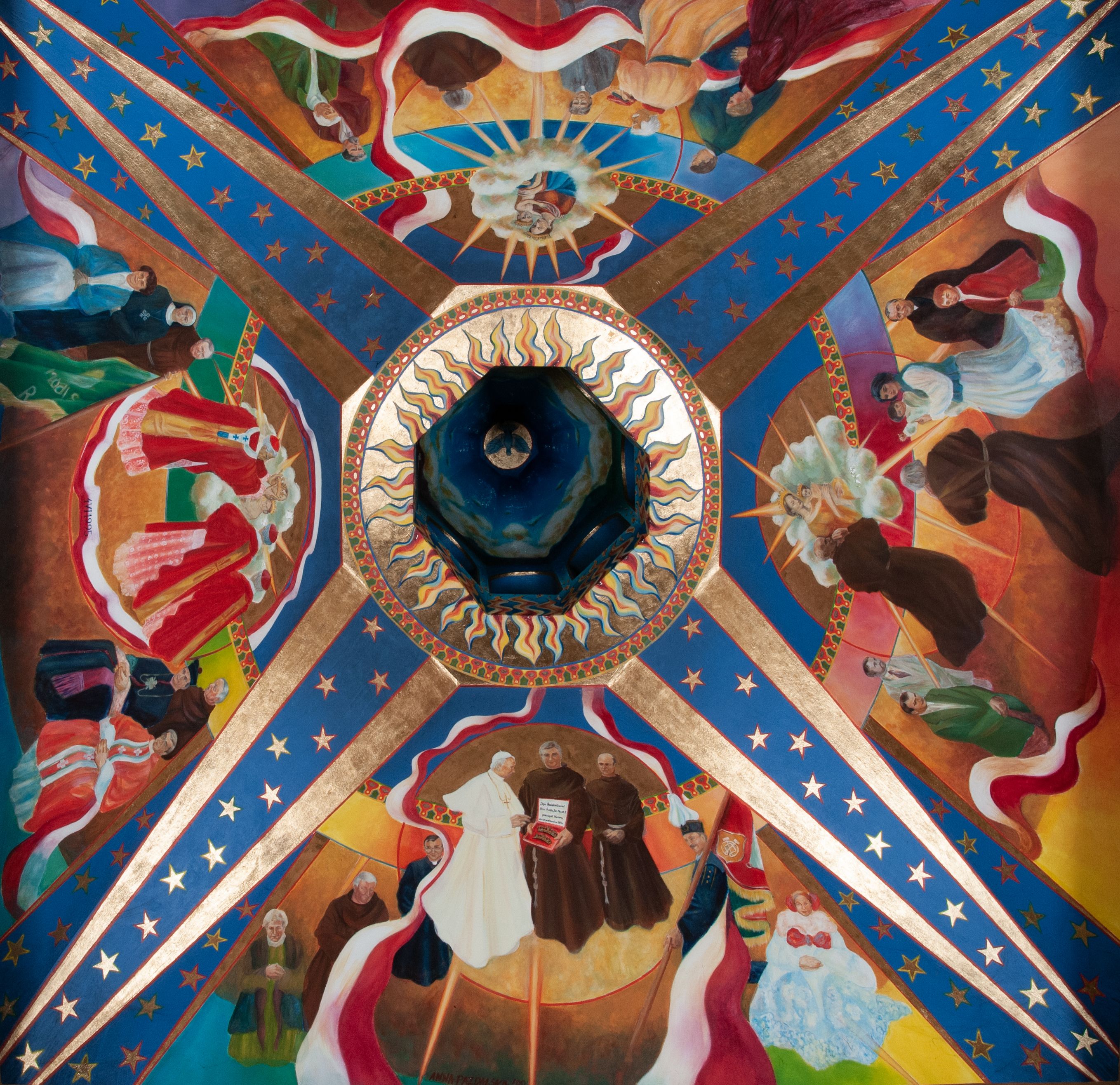 Latarnia przepruta ośmioma oknami w kształcie stojących prostokątów zamkniętych półkoliście. W zwieńczeniu gołębica na tle obłoków w złotej glorii. Sklepienie podzielone na cztery pola wyodrębnione za pomocą niebiesko-złotych promieni odchodzących od centralnej glorii. Na niebieskim tle złocone gwiazdy. W polach wielopostaciowe sceny na złotym tle. Od wschodu: ofiarowanie dwóch koron Janowi Pawłowi II przez przeora klasztoru oraz towarzyszącego mu zakonnika. W dolnej części kompozycji ukazani górnicy, zakonnicy, duchowni oraz osoby świeckie w strojach regionalnych. Od północy: koronacja obrazu przez kardynała Franciszka Macharskiego oraz towarzyszących mu kapłanów. U dołu napis: „4. VI. 1995”. W dolnej części kompozycji dwie symetrycznie rozmieszczone grupy trzech postaci. Z lewej zakonnika franciszkańskiego, siostry zakonnej w czarnym habicie oraz siedzącej kobiety. Z prawej stojącego zakonnika franciszkańskiego oraz siedzących księdza w stroju prałata oraz kapłana w stroju celebransa. Od zachodu: scena adoracji obrazu Matki Boskiej Łaskawej. W górnej części kompozycji wizerunek Matki Boskiej Łaskawej w otoczeniu obłoków oraz glorii promienistej. W dolnej części kompozycji znajdują się klęczące postaci zakonników franciszkańskich, kapłanów oraz osób świeckich w strojach regionalnych i zwykłych. Od południa: scena adoracji obrazu Matki Boskiej Łaskawej przez zakonników franciszkańskich oraz osoby świeckie. Kompozycja sceny analogiczna jak na scenie od zachodu. Kolorystyka przedstawień silna, kontrastowa, utrzymana w barwach: czerwonej, pomarańczowej, złotej, żółtej, niebieskiej i brązowej.