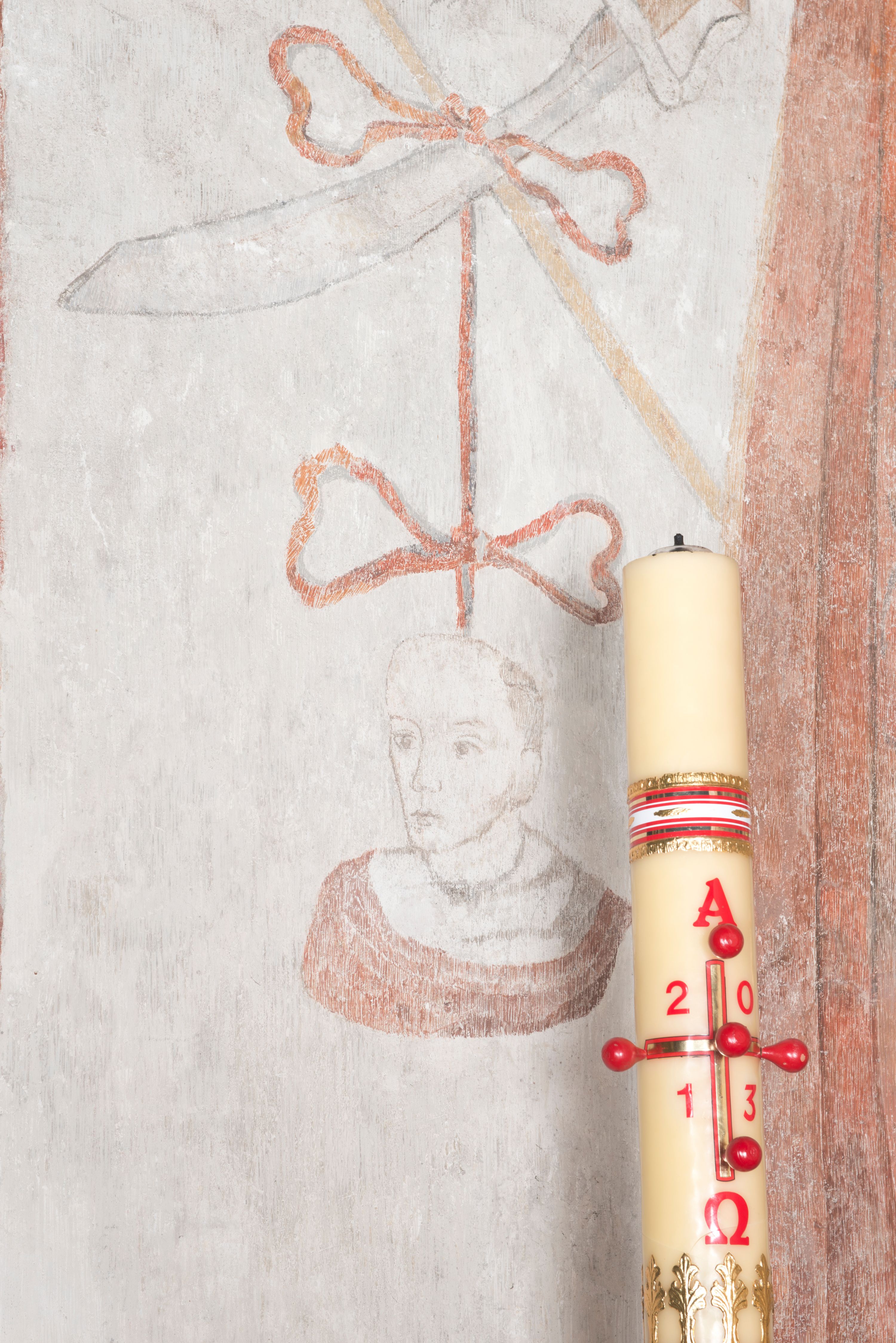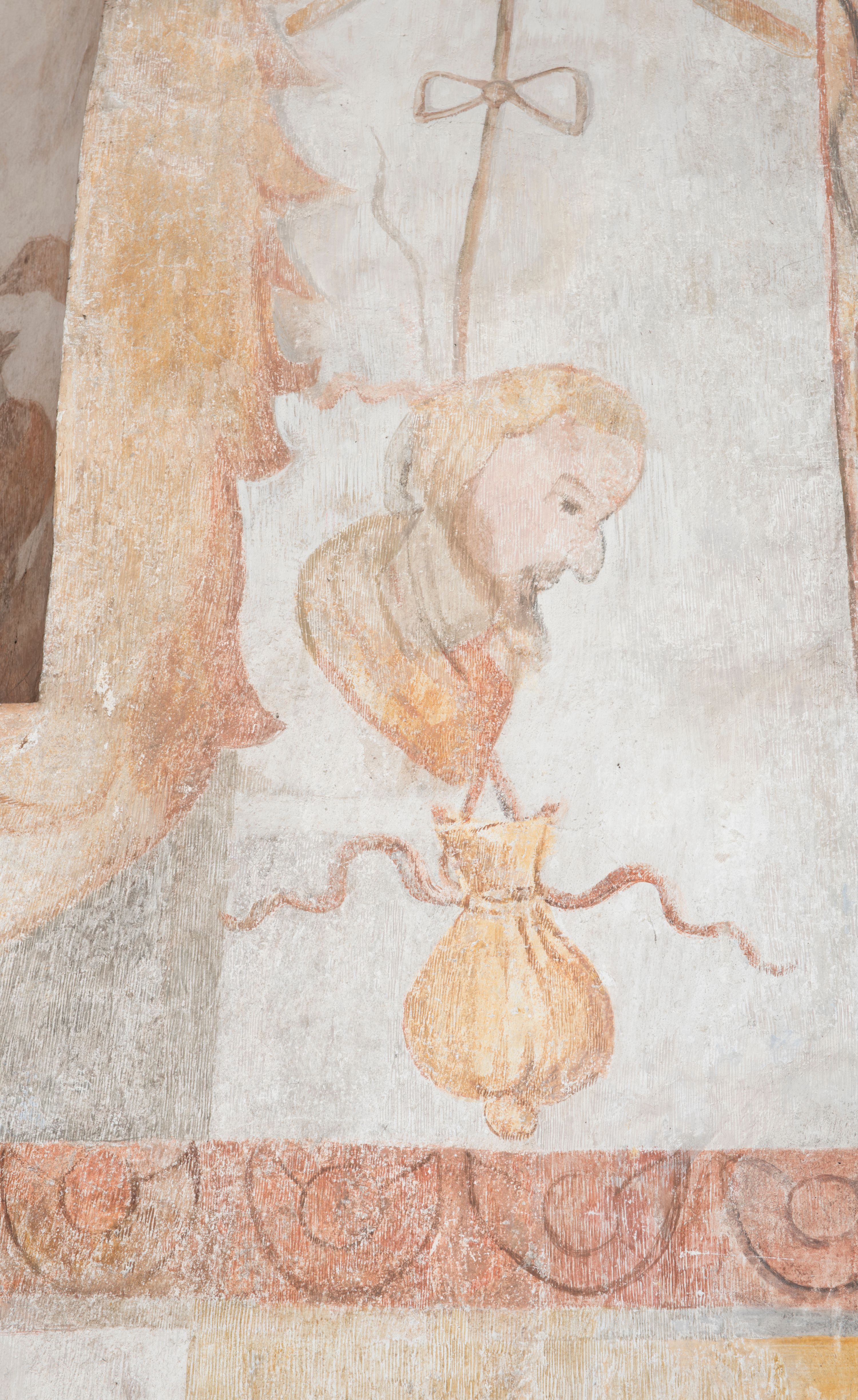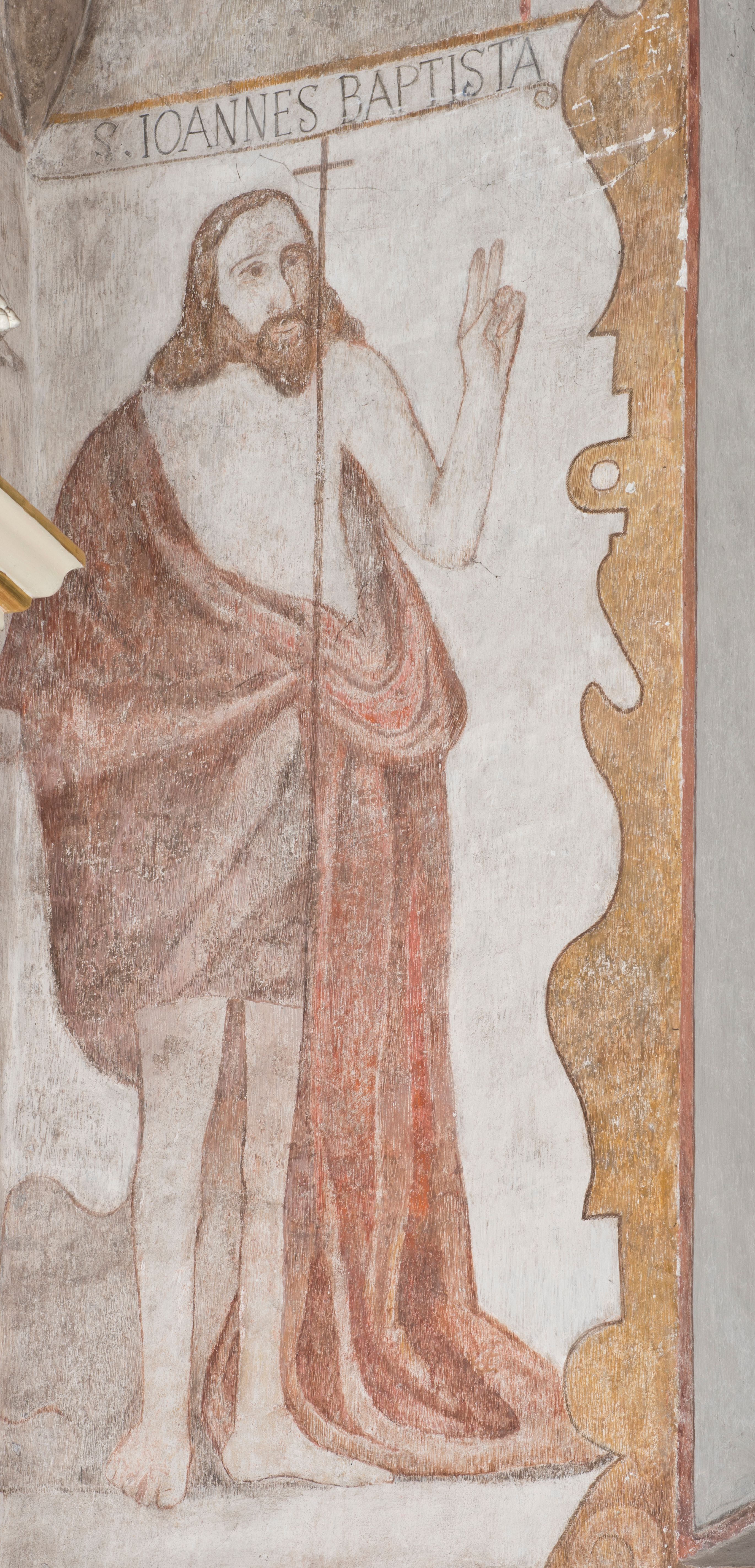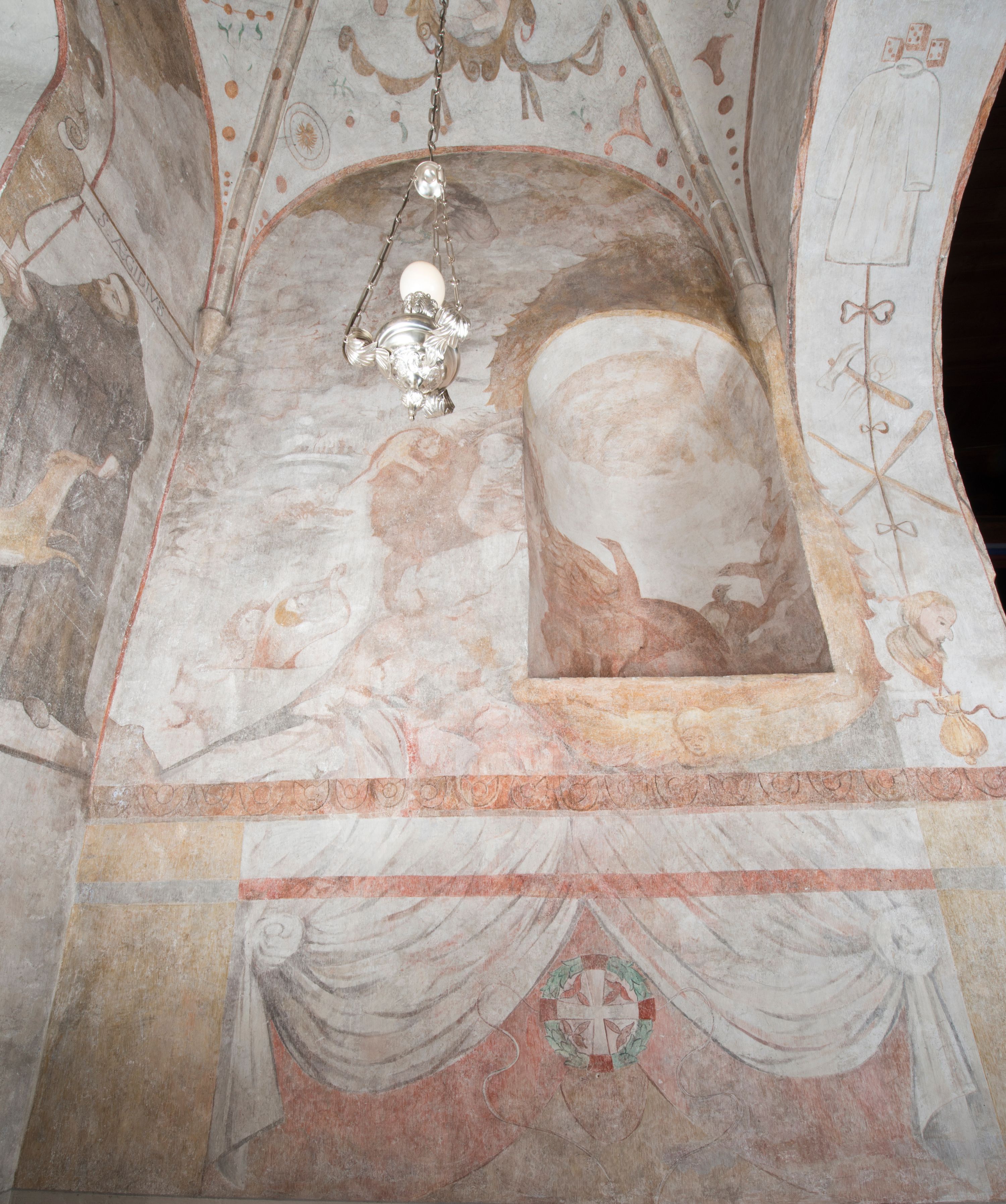 Ściana południowa kaplicy podzielona jest na trzy strefy. W pierwszej od dołu w ramie w kształcie leżącego prostokąta umieszony jest zacheuszek na czerwonym tle flankowany białą, podwieszoną kotarą. W strefie drugiej po lewej stronie ukazany jest św. Jan Chrzciciel ubrany w czerwony płaszcz, u góry opisany: „S(ANCTUS) IOANNES BAPTISTA”, natomiast po prawej św. Idzi z łanią i strzałą w prawej dłoni. Nad nim umieszczony jest napis „S(ANCTUS) AEGIDVS”. Portal okienny ozdabia ornament kartuszowo-zawijany z elementami okuć. W trzeciej strefie widoczne są obłoki, a pozostała część sceny jest niewidoczna.