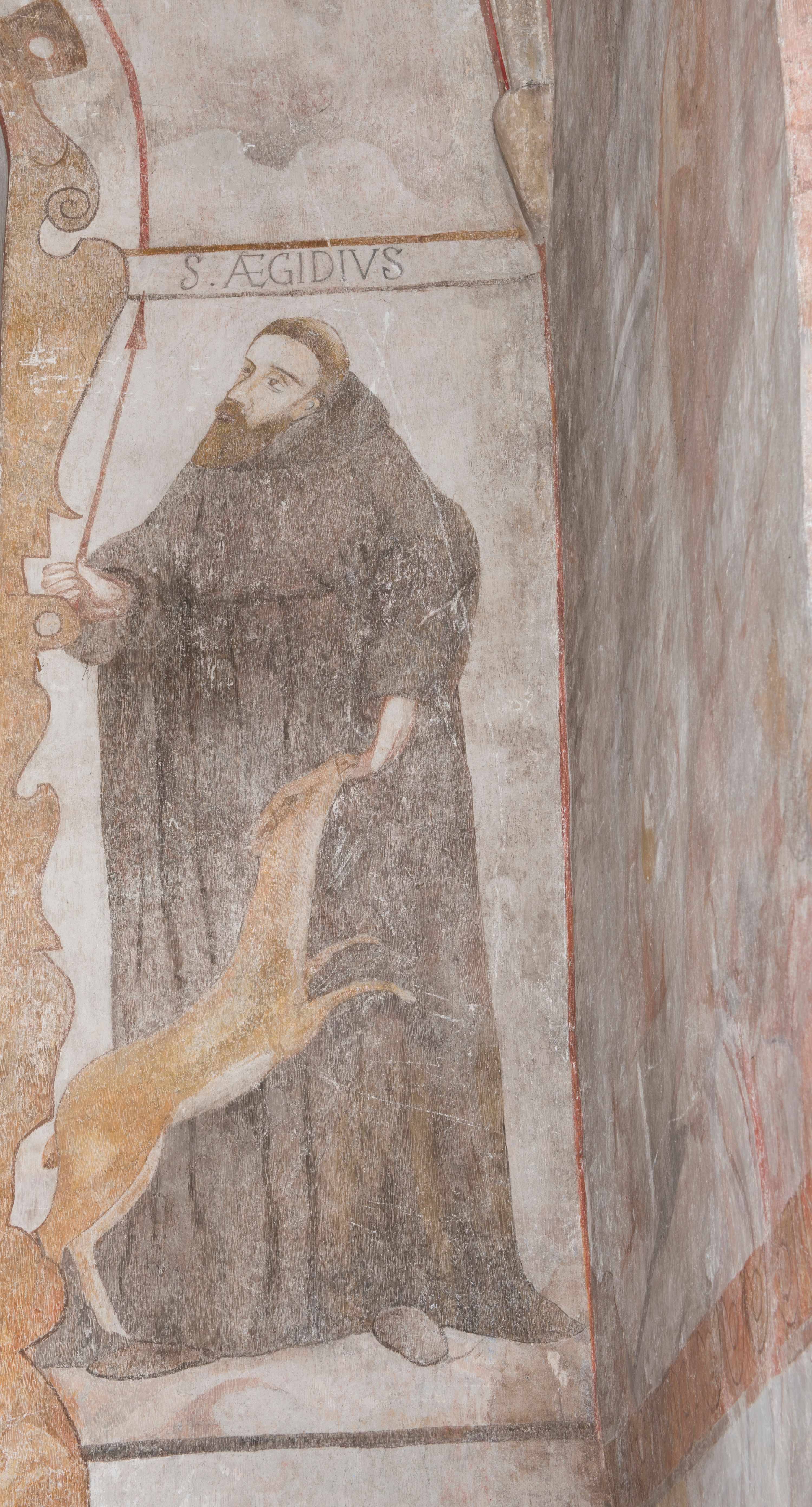 Część badaczy kościoła św. Idziego w Gibułtowie uważa, iż freski w kaplicy św. Anny zostały wykonane wcześniej niż pozostała część polichromii w kościele. Warto jednak zwrócić uwagę na postacie św. Idziego z kaplicy oraz św. Franciszka z nawy, które zostały namalowane w podobny sposób ujęcia fizjonomii i draperii szat. Ponadto również inne fragmenty polichromii z nawy i kaplicy są do siebie podobnie, np. anioł z wieńcem w ręku ze sceny ze św. Janem Kantym z nawy oraz anioł z kaplicy (ściana zachodnia). Motywy okuciowe, które pojawiają się w kaplicy można również zauważyć w mniejszych fragmentach w nawie na ścianie północnej. Również malowidła w prezbiterium, choć posiadają gorszy stan zachowania zostały wykonane w tym samym czasie co freski z nawy z podziałem na kwatery w czarnych obramieniach i podobnie oddanym fryzem. Zatem kwestia ostatecznego datowania polichromii w całym kościele w Giebułtowie pozostaje nadal otwarta. Być może część fresków została domalowana w późniejszym czasie. Niemniej, pomijając powyższy problem w kaplicy św. Anny warto zwrócić uwagę na motywy arma Christi, zdobiące łuk arkady. Podobny zespół symboli, zgromadzony na jednej polichromii możemy odnaleźć w krakowskim kościele Matki Boskiej Śnieżnej na Gródku w Krakowie przy klasztorze Dominikanek. Kościół został ufundowany w 1621 roku przez Annę Lubomirską, jako wotum dziękczynne za zwycięstwo w bitwie pod Chocimiem. Podczas prac konserwatorskich prowadzonych w latach 2010-2013 odkryto freski w partii fryzu obiegającego prezbiterium i nawę. Choć zostały wykonane przez inny zespół malarski niż freski w Giebułtowie, obie polichromie pokazują popularność stosowania tego typu symboli w malarstwie XVII wieku. Przyglądając się freskom w kaplicy, warto również zwrócić uwagę na postać św. Idziego, patrona kościoła. Święty Idzi urodził się około 640 roku w Atenach, zmarł między 720 a 725 rokiem. Pochodził z zamożnej rodziny. Po śmierci rodziców rozdał majątek potrzebującym i udał się do Marsylii w towarzystwie swojego przyjaciela Weredoniusza. Zamieszkał nad rzeką Gard, gdzie prowadził życie kontemplacyjne i pomagał okolicznej ludności. Został uznany za cudotwórcę i był otaczany nadmierną czcią, przez co schronił się w pustelni nad rzeką Rodan. Tam spotkał go król Wizygotów Wamba i przystał na propozycję św. Idziego założenia klasztoru ze swojej fundacji. Założone opactwo nazwano „Saint-Gilles” od imienia świętego. Święty Idzi był jednym z najpopularniejszych świętych w średniowieczu, a Saint-Gilles położone na szklaku handlowym i w drodze do Santiago de Compostela – znaczącym miejscem pątniczym. W Polsce kult św. Idziego znany był od drugiej połowy XI wieku, zwłaszcza po narodzinach Bolesława Krzywoustego (1086), które rodzice Władysław Herman i Judyta mieli wymodlić u niego. Jako wotum dziękczynne Władysław Herman ufundował kościół pod wezwaniem św. Idziego w Krakowie. Największa ilość świątyń pod wezwaniem tegoż powstała po 1085 roku i w XII wieku. Również w Giebułtowie kościół nosi wezwanie tego patrona już od XI wieku. W ikonografii św. Idzi jest przedstawiany zwykle, jako opat benedyktyński w średnim wieku z krótkimi włosami i długą brodą. Do jego atrybutów należą łania i strzała, które może zobaczyć również na omawianym dziele.