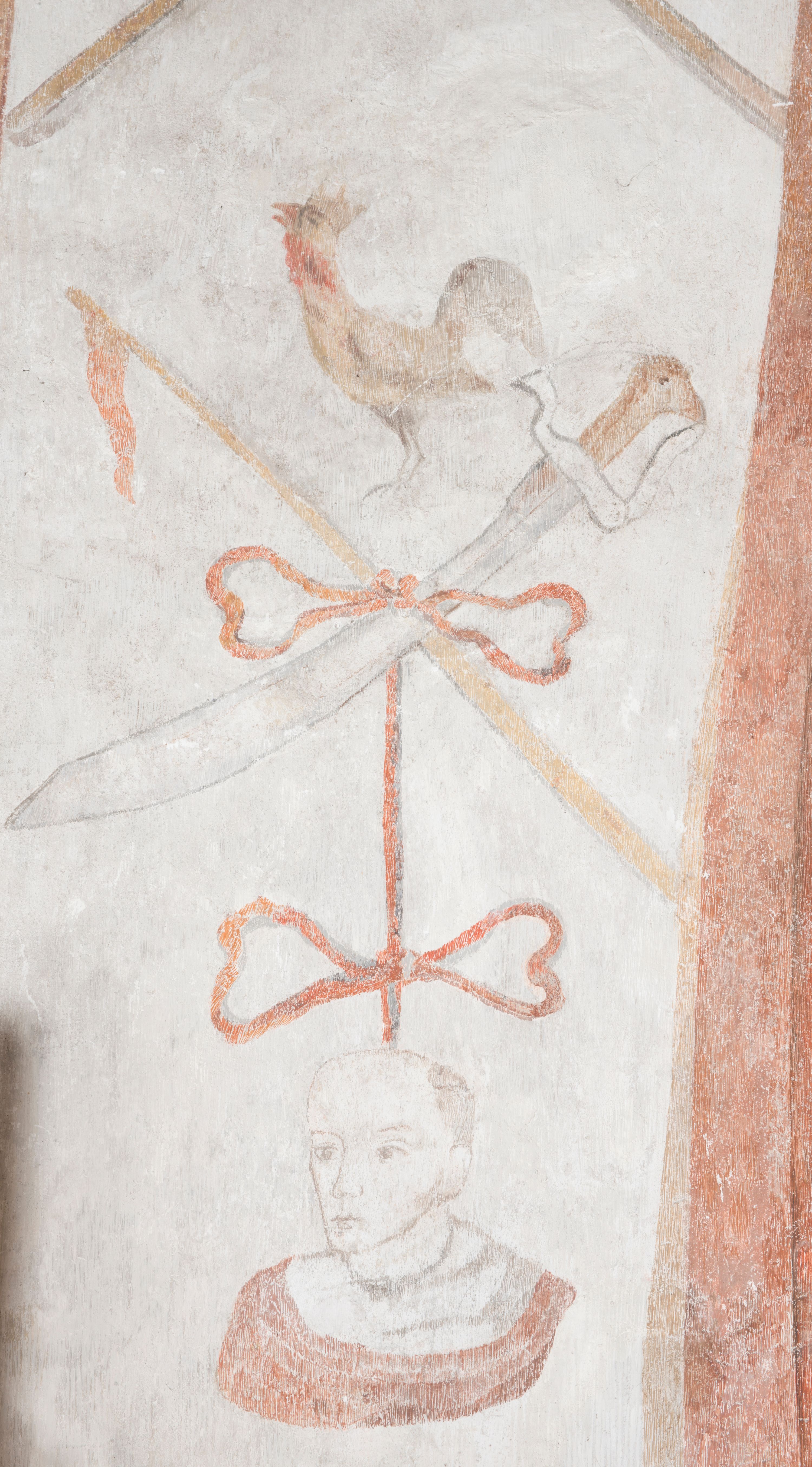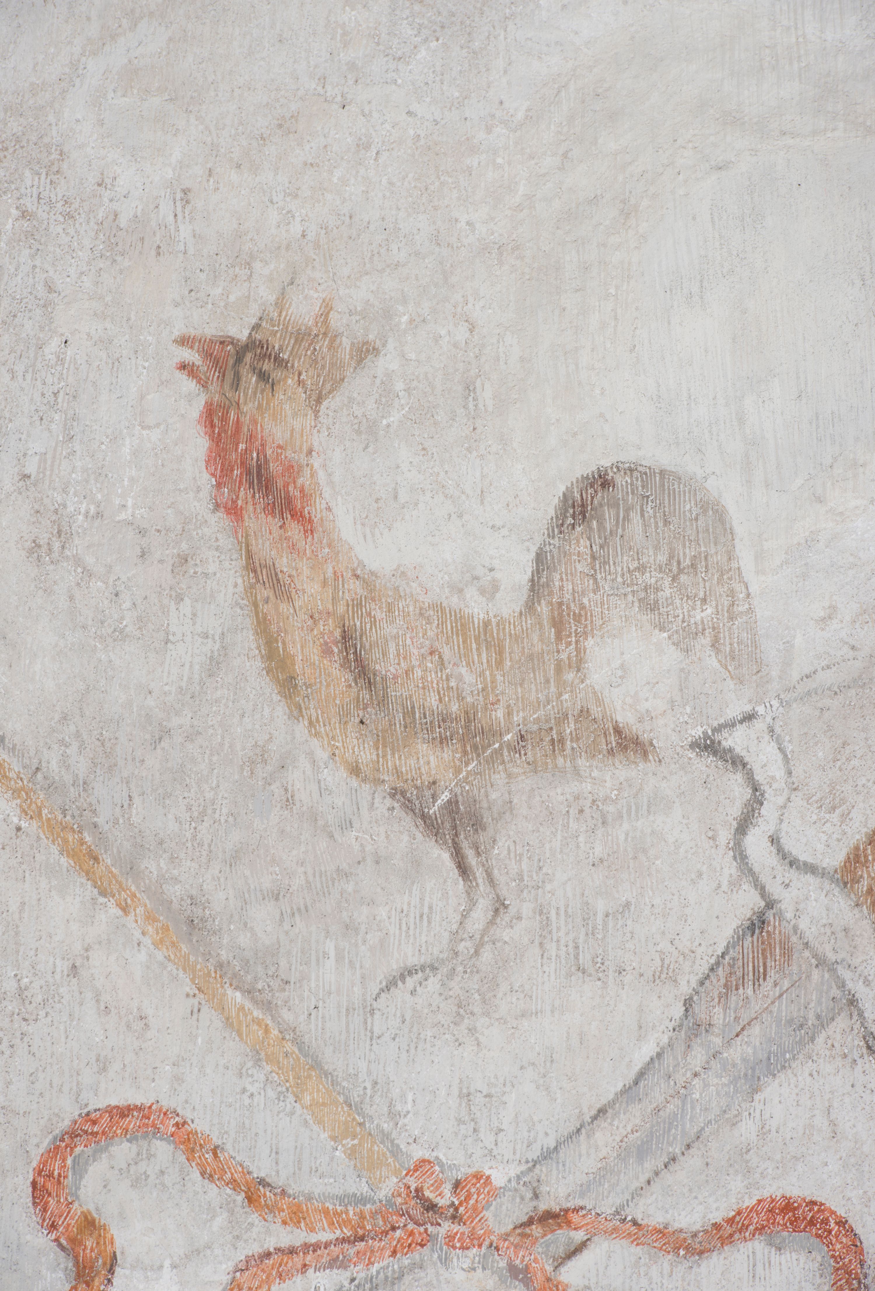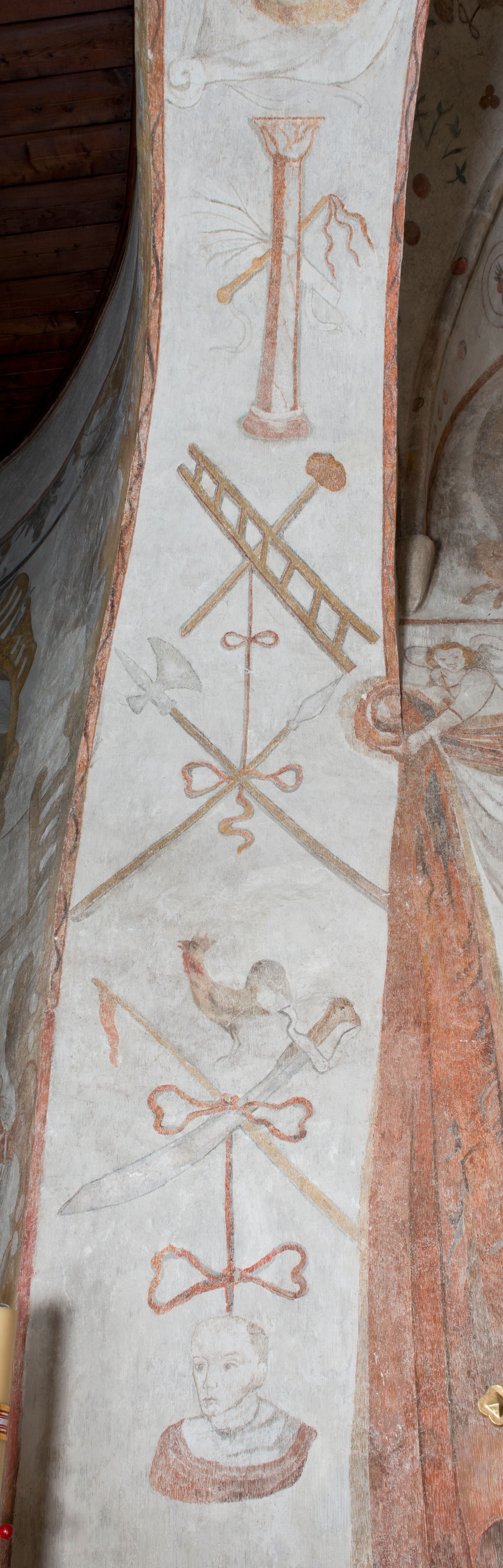 Polichromia ścienna pokrywa całą powierzchnię kaplicy, podczas prac konserwatorskich została odsłonięta powyżej jednej piątej wysokości ściany. Na łuku arkady prowadzącej do kaplicy umieszczono arma Christi. Od dołu, po lewej stronie wejścia: skrzyżowane panoplia (miecz i chorągiew) z podwiązanym na czerwonej wstędze z kokardami popiersiem mężczyzny (św. Pawła?), powyżej piejący kogut. Następnie skrzyżowane topór i włócznia, połączone taką samą wstęgą z kolejnymi arma Christi: skrzyżowanymi drabiną i gąbką z octem na długim drzewcu. Dalej ukazana została kolumna biczowania na tle dwu skrzyżowanych biczy. Powyżej, na środku łuku arkady widnieje chusta św. Weroniki z twarzą Chrystusa. Za nią dzban z misą i ręcznikiem. Kolejne symbole połączone są czerwoną wstęgą z kokardkami. Są to kolejno od góry: suknia i kości do gry, młotek i obcęgi, kije oraz głowa Judasza, u którego szyi zawieszona jest sakiewka z pieniędzmi.