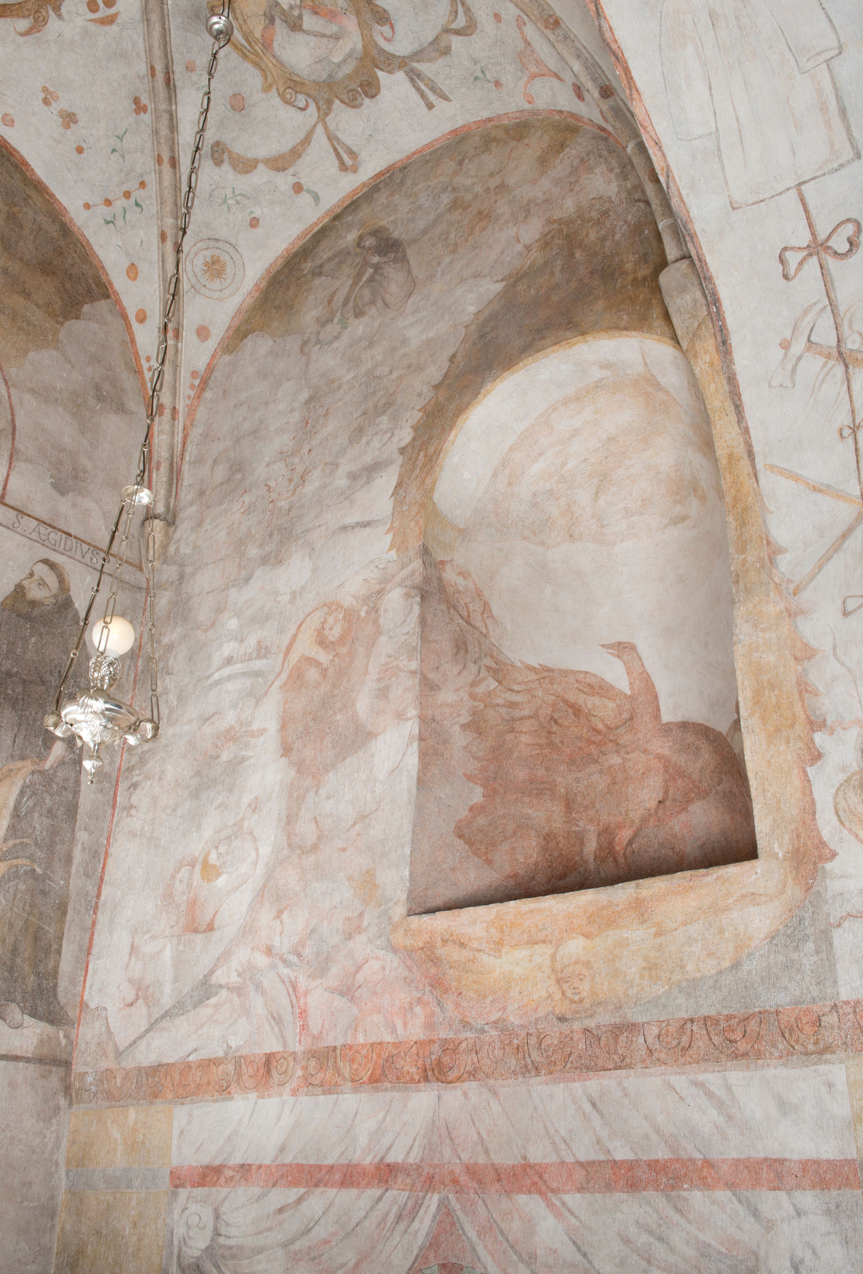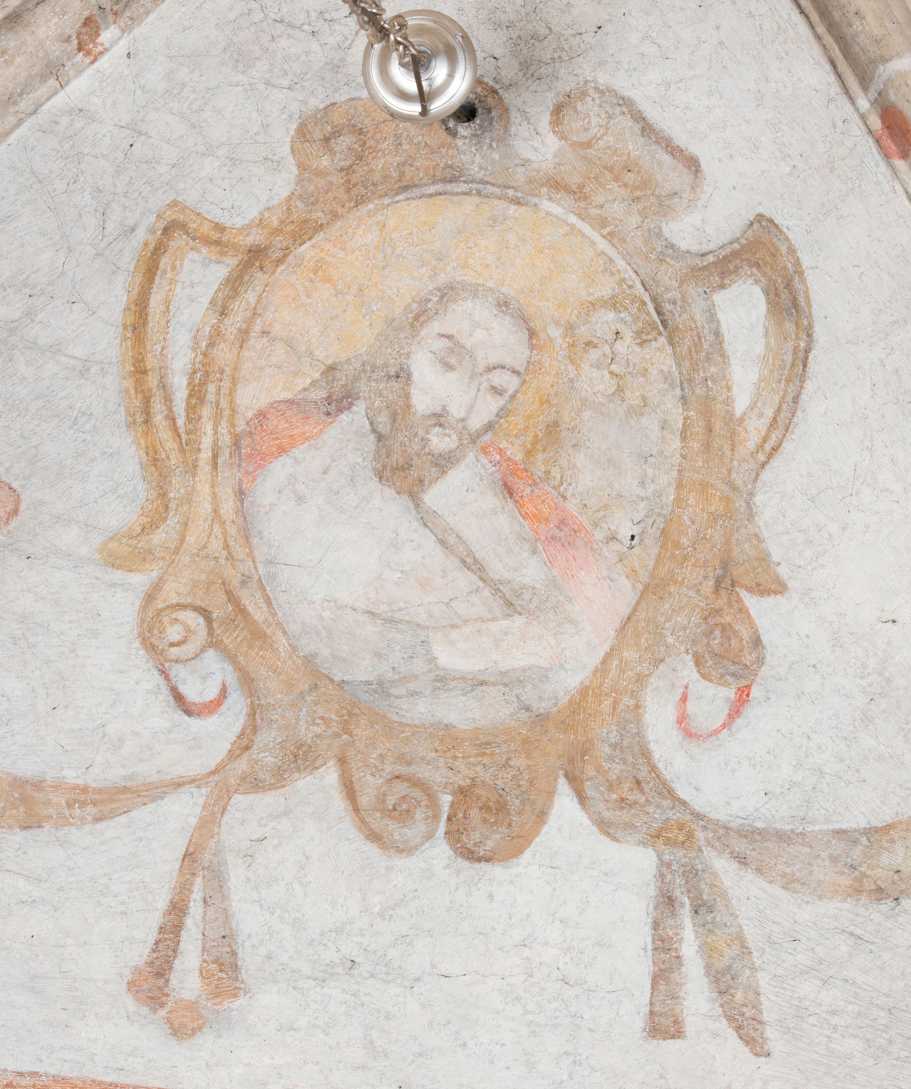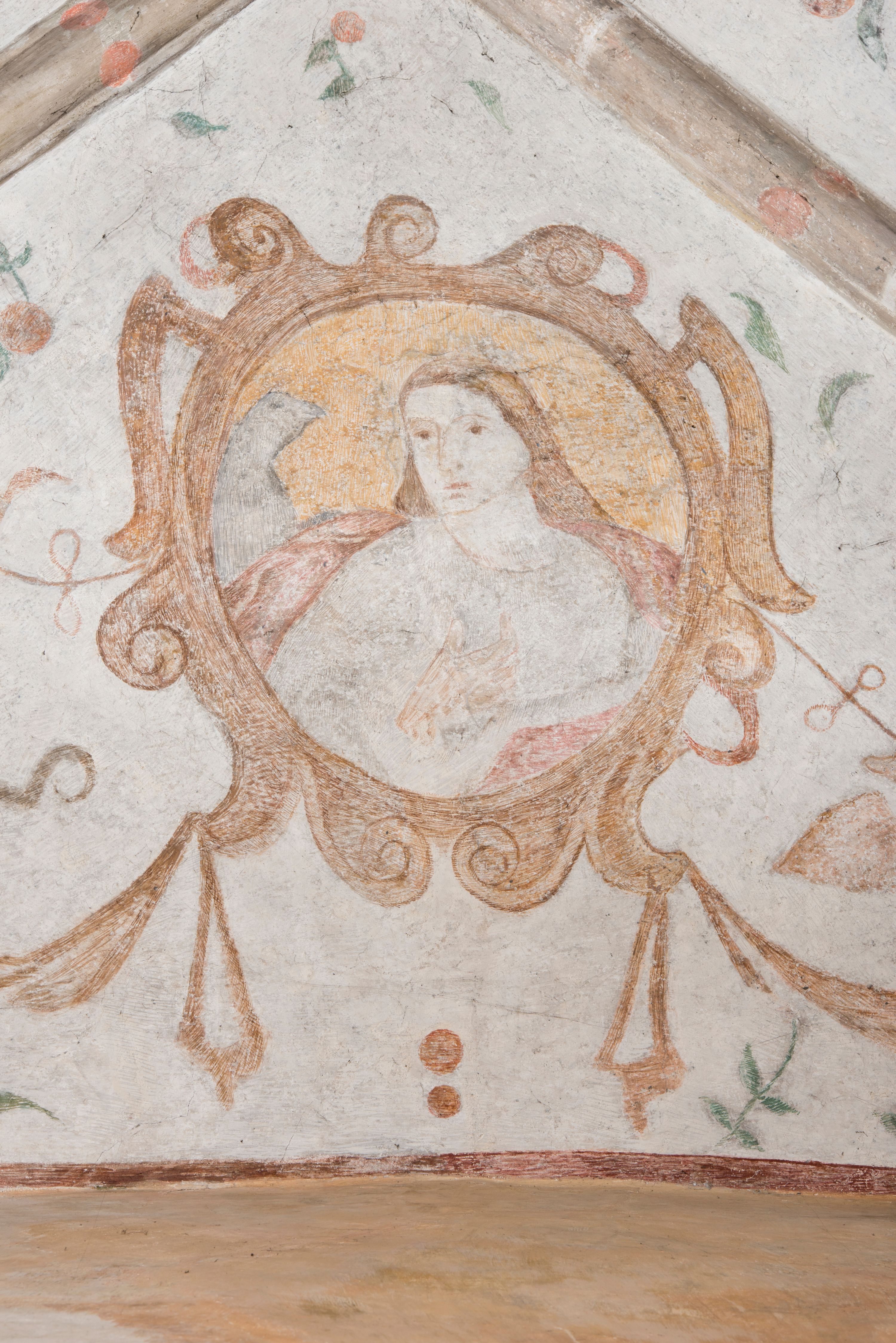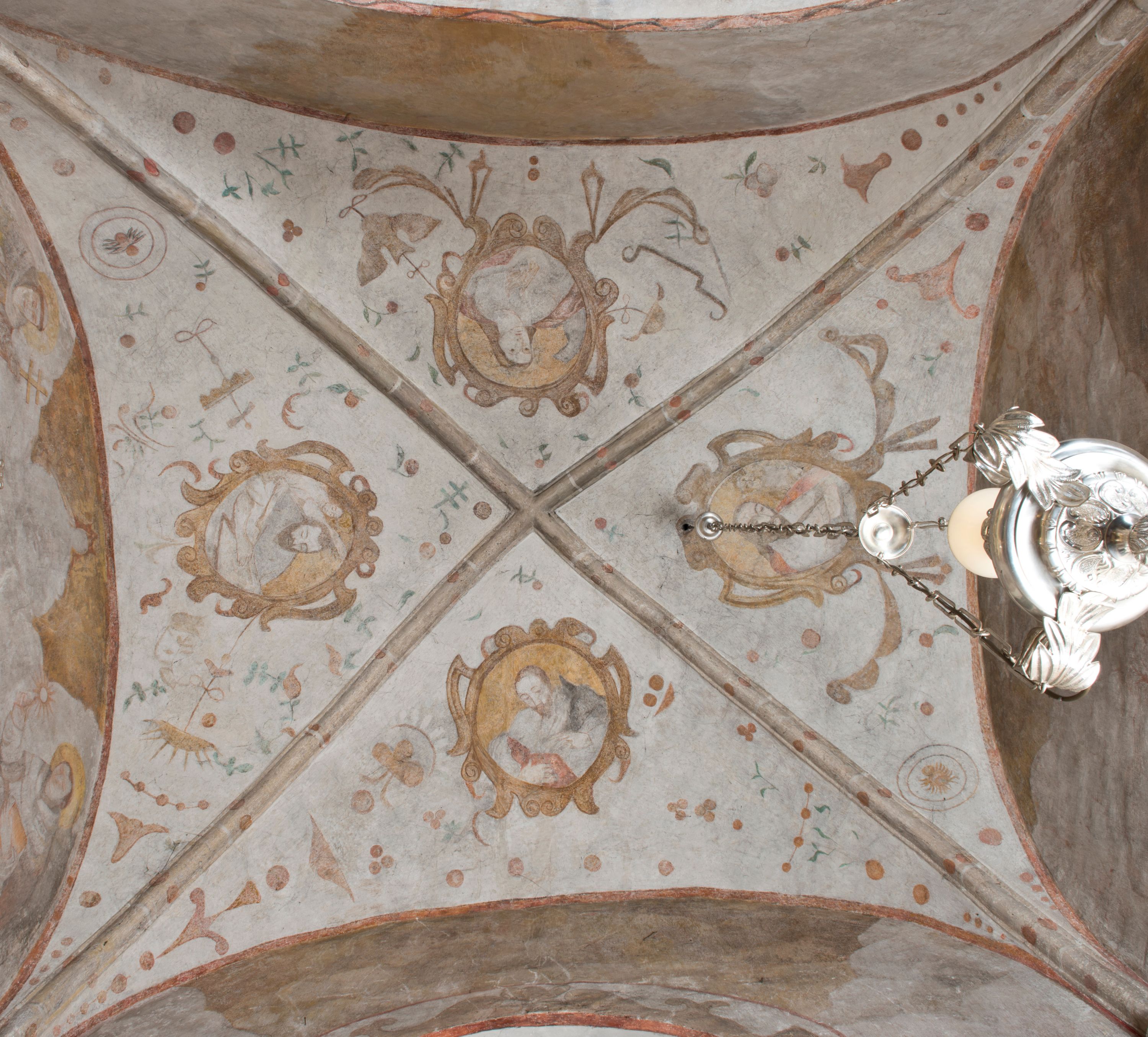 Sklepienie: pola pomiędzy żebrami (wysklepki) ozdobione są czterema medalionami w kartuszowych obramieniach o okuciowych motywach, w których umieszczone są popiersia ewangelistów. Od wschodu: św. Łukasz, od południa: św. Marek, od zachodu: św. Jan, od północy: św. Mateusz. Przestrzeń pomiędzy wizerunkami wypełniają pojedyncze motywy rozsiane po całej powierzchni sklepienia: pojedyncze owoce, pajączki, nietoperz i inne.