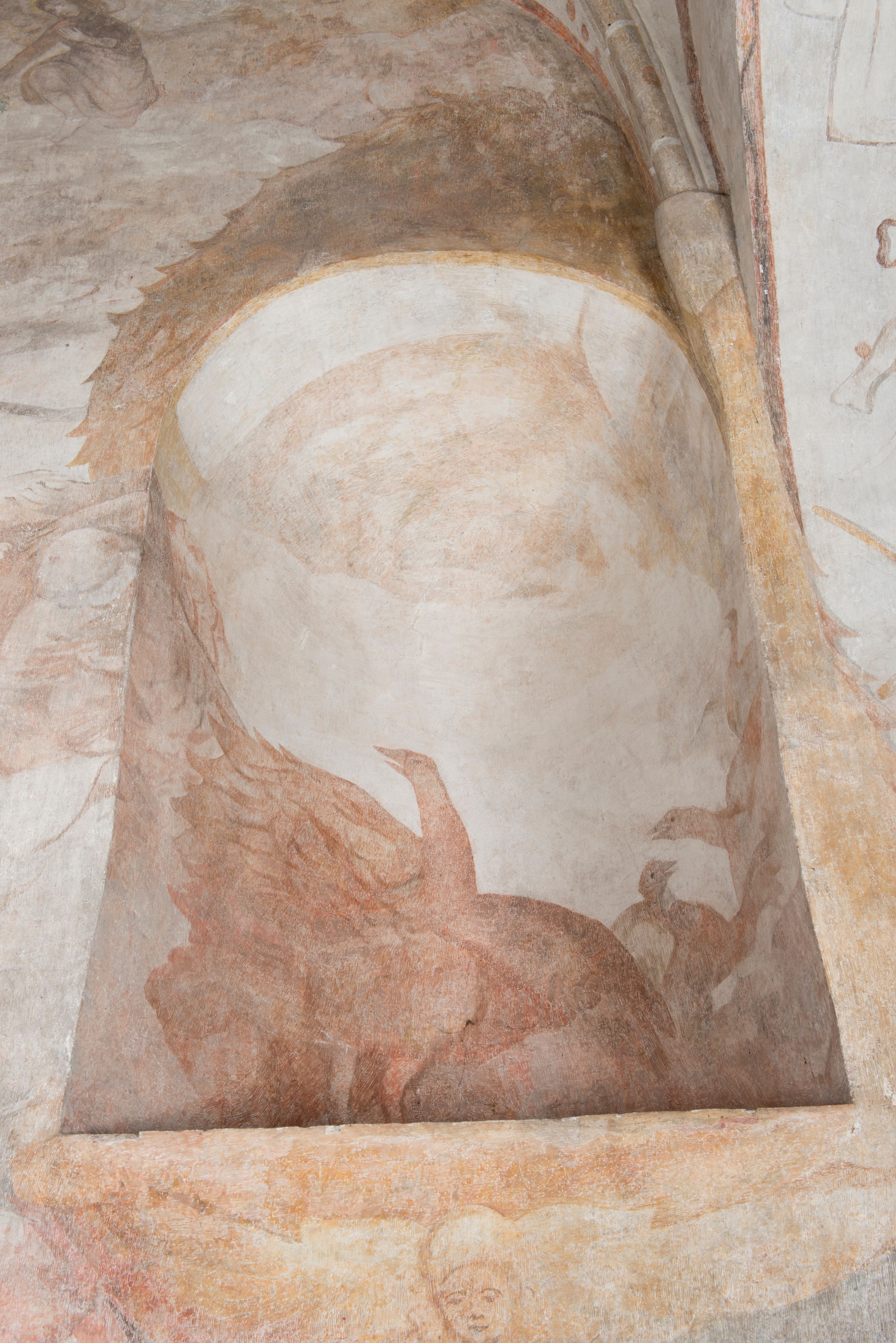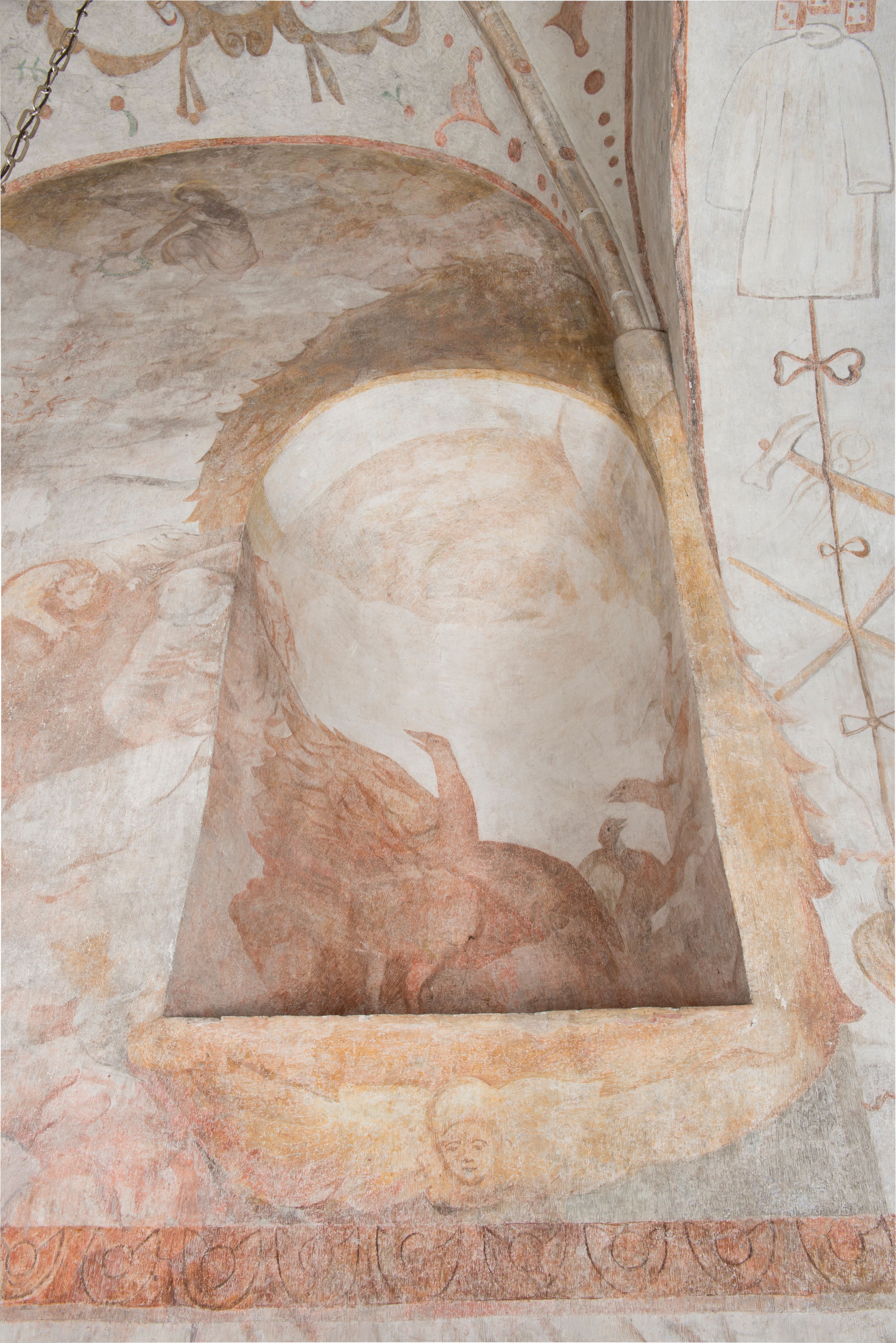 Ściana zachodnia została podzielona na dwie strefy. W dolnej umieszony jest zacheuszek na czerwonym tle, flankowany białą kotarą, podwieszoną w narożach. W górnej strefie, po lewej stronie widoczny jest nagi mężczyzna z rękami wzniesionymi do góry w błagalnym geście, otoczony przez dzikie zwierzęta. Po prawej stronie w półkolistej wnęce w kształcie stojącego prostokąta namalowany został pelikan z młodymi, a pod wnęką uskrzydlona główka aniołka. W zwieńczeniu anioł trzymający wieniec chwały w rękach.