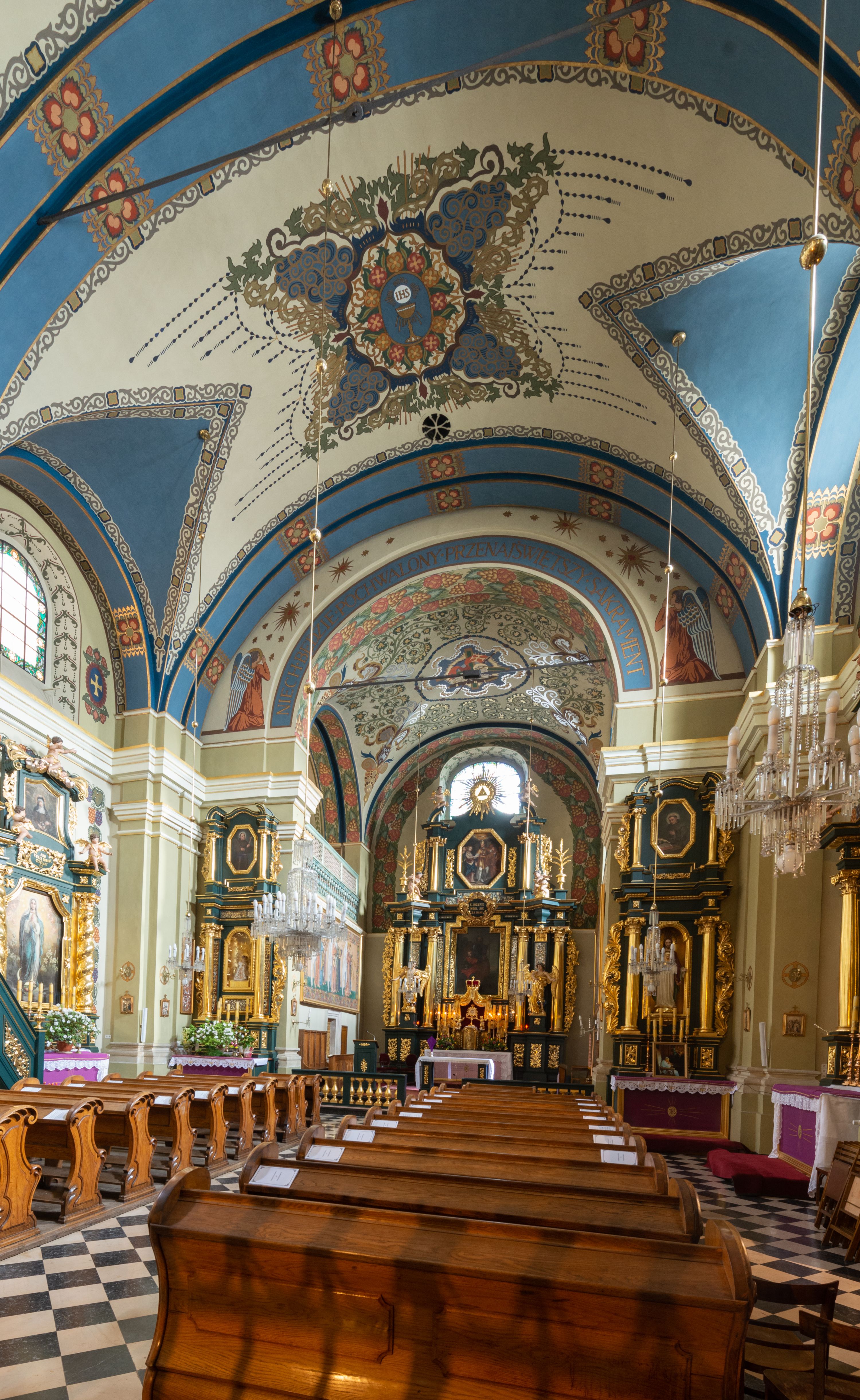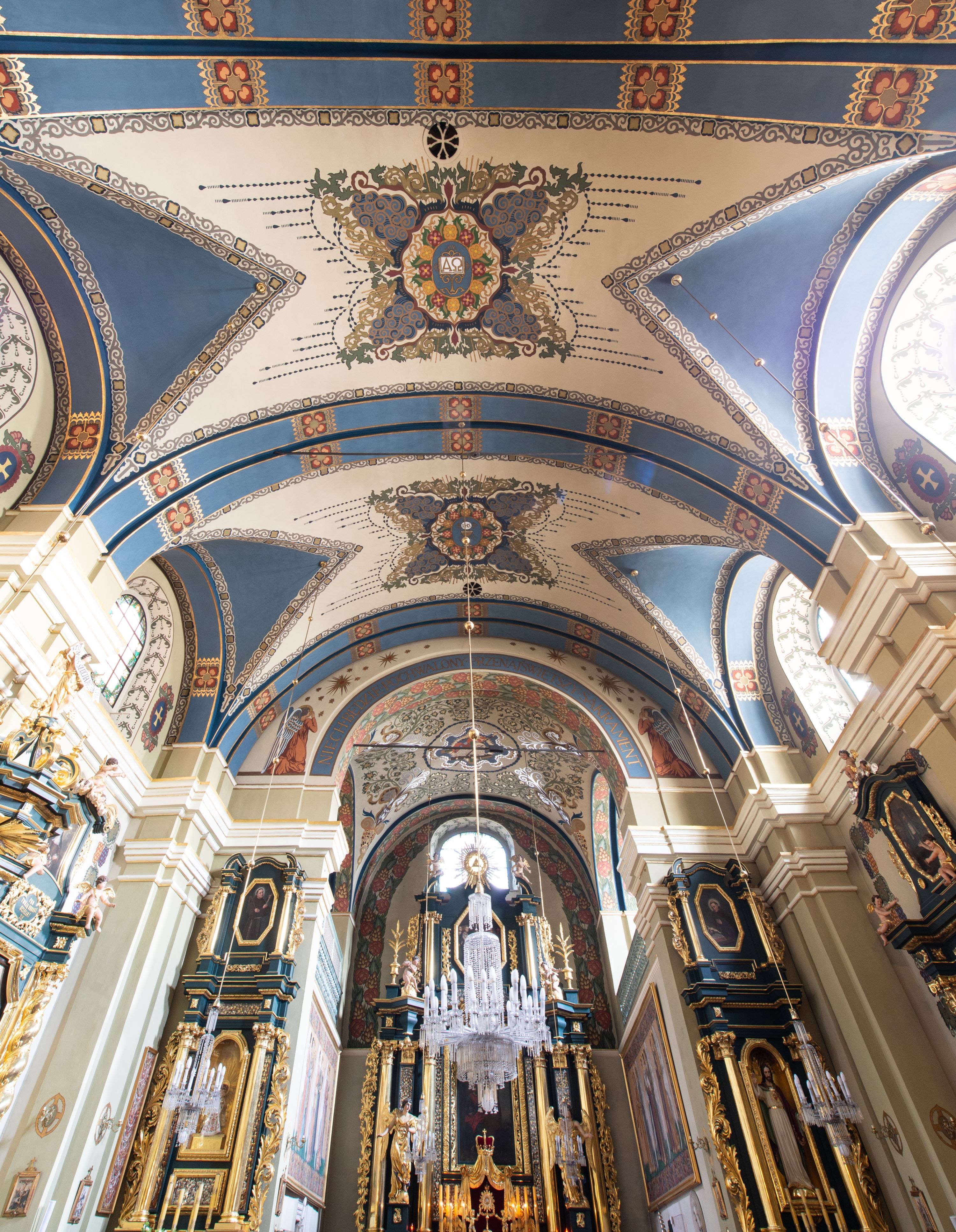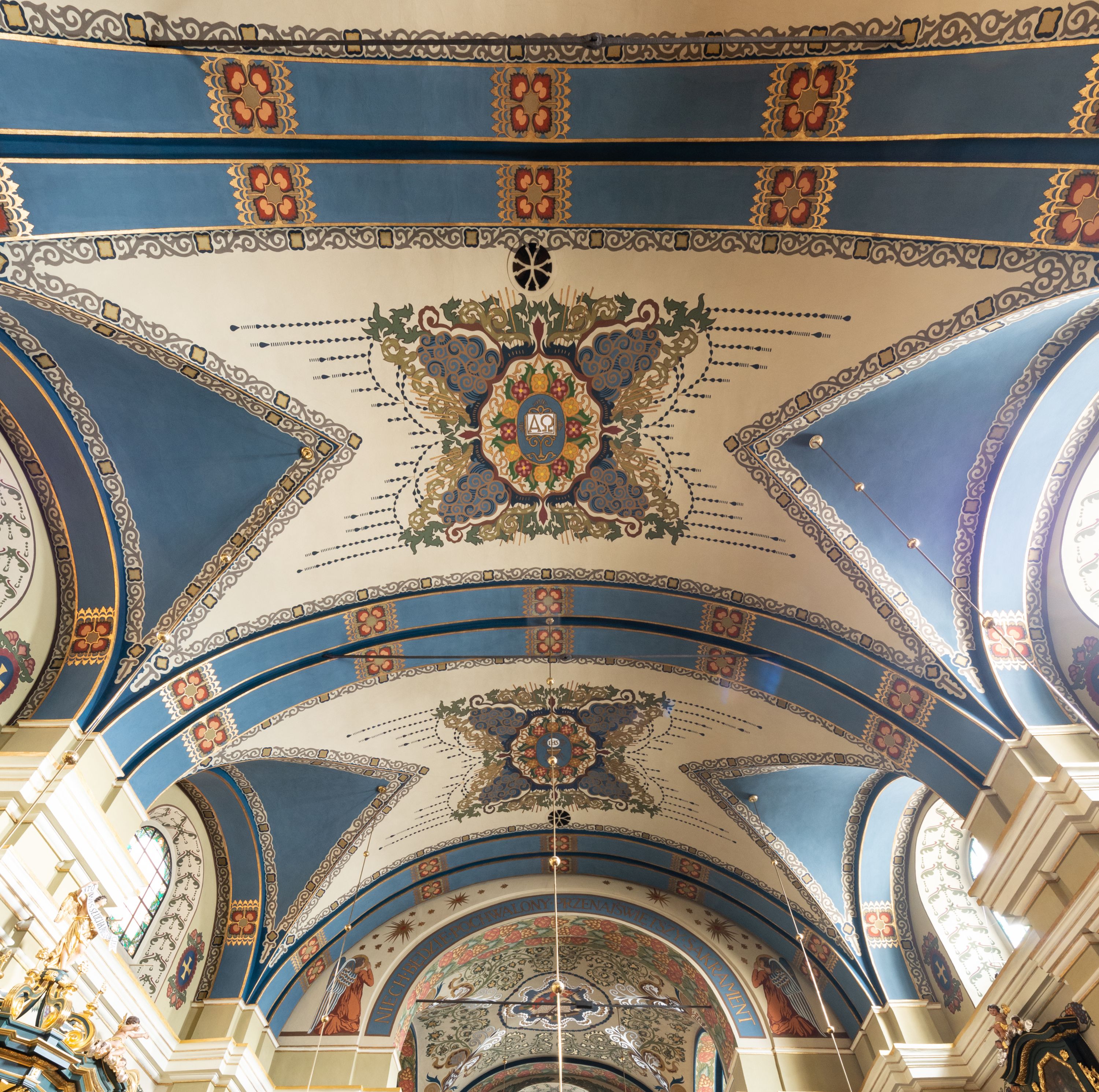 Dekoracja sklepienia nawy składa się z prostych symboli: kielicha z hostią, otwartej księgi z literami „A” i „Ω”, imienia MARIA i kotwicy. Zostały one wkomponowane w owalne medaliony w barwnej oprawie utworzonej z wieńców z żółtych i czerwonych kwiatów, złotych i zielonych wici akantów, ułożonych krzyżowo spiralnych, niebieskich ślimacznic i otaczających je stylizowanych zielonych liści akantu, między którymi przebijają się złote promienie. Owe fantazyjne kompozycje w nawie ukazane są na jasnym, kremowym tle wysklepek i niebieskich lunet i gurtów. Elementy konstrukcyjne szwów sklepiennych są podkreślone pasami z wici roślinnej. Sklepienie prezbiterium odróżnia się jaśniejszą kolorystyką. Elementy konstrukcyjne łuków podkreślają bujne czerwono-zielone kwiaty, wśród których rozpoznano piwonie. Taka sama bordiura zdobi ścianę za ołtarzem. Pośrodku umieszczono Baranka na zamkniętej księdze z chorągwią zmartwychwstania, na tle krzyża greckiego w glorii promienistej. Szwy sklepienne zaakcentowano kwiatami w układzie kandelabrowym, a wysklepki zielono-złotymi symetrycznie układającymi się wiciami roślinnymi. Na parapecie chóru muzycznego malarz przedstawił dwie sceny: „Stygmatyzacja św. Franciszka” i „Anioł grający na skrzypcach płaczącemu św. Franciszkowi”.