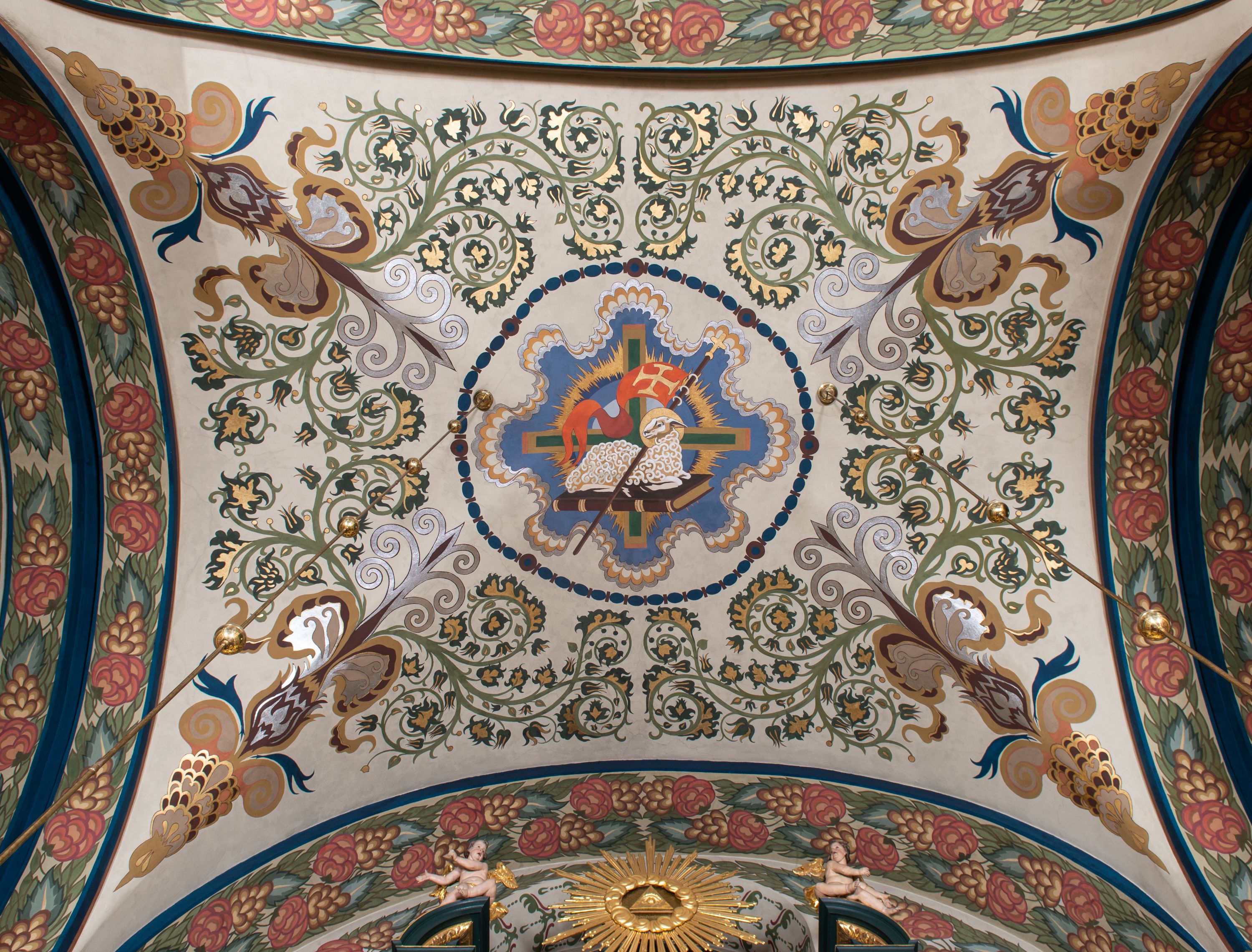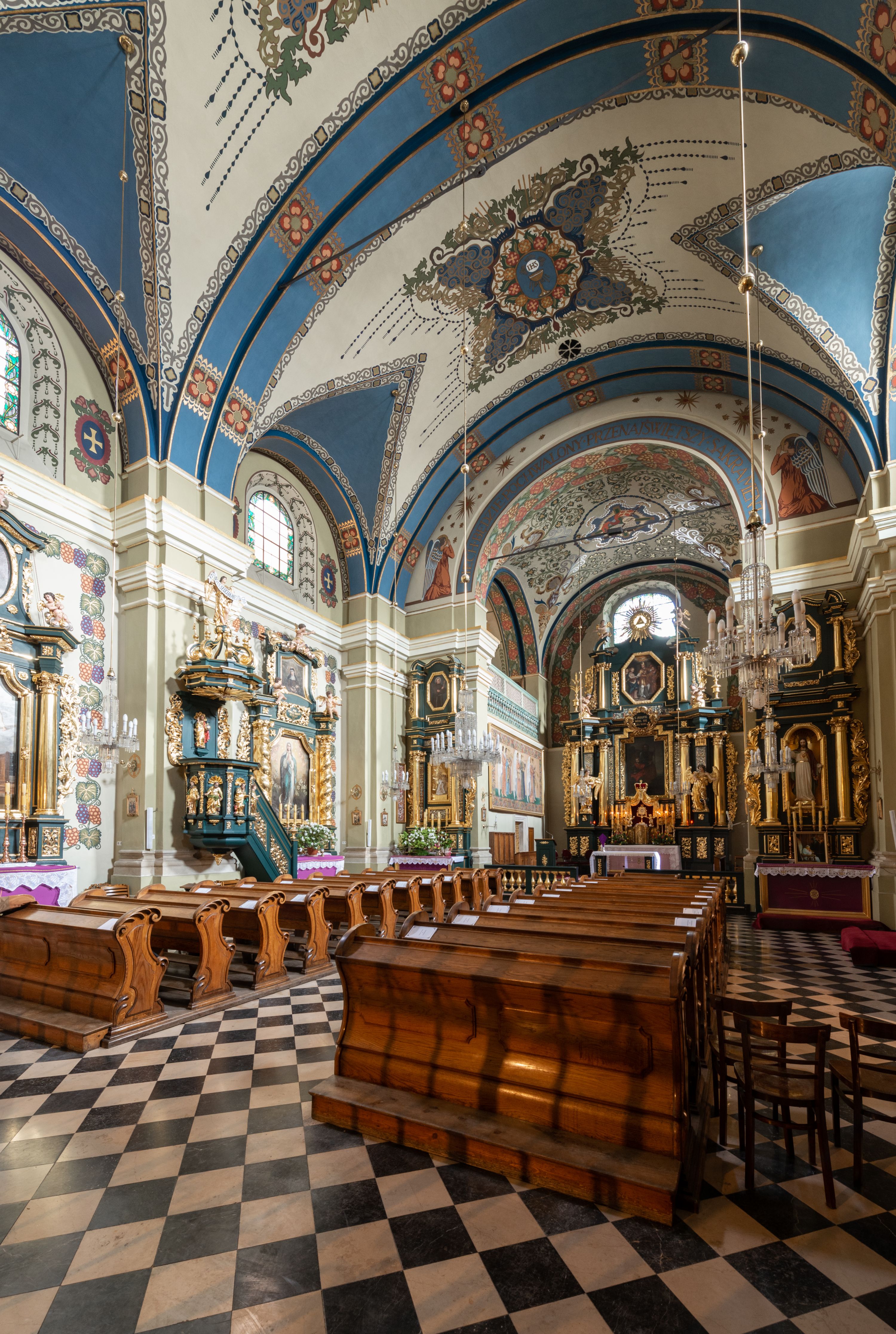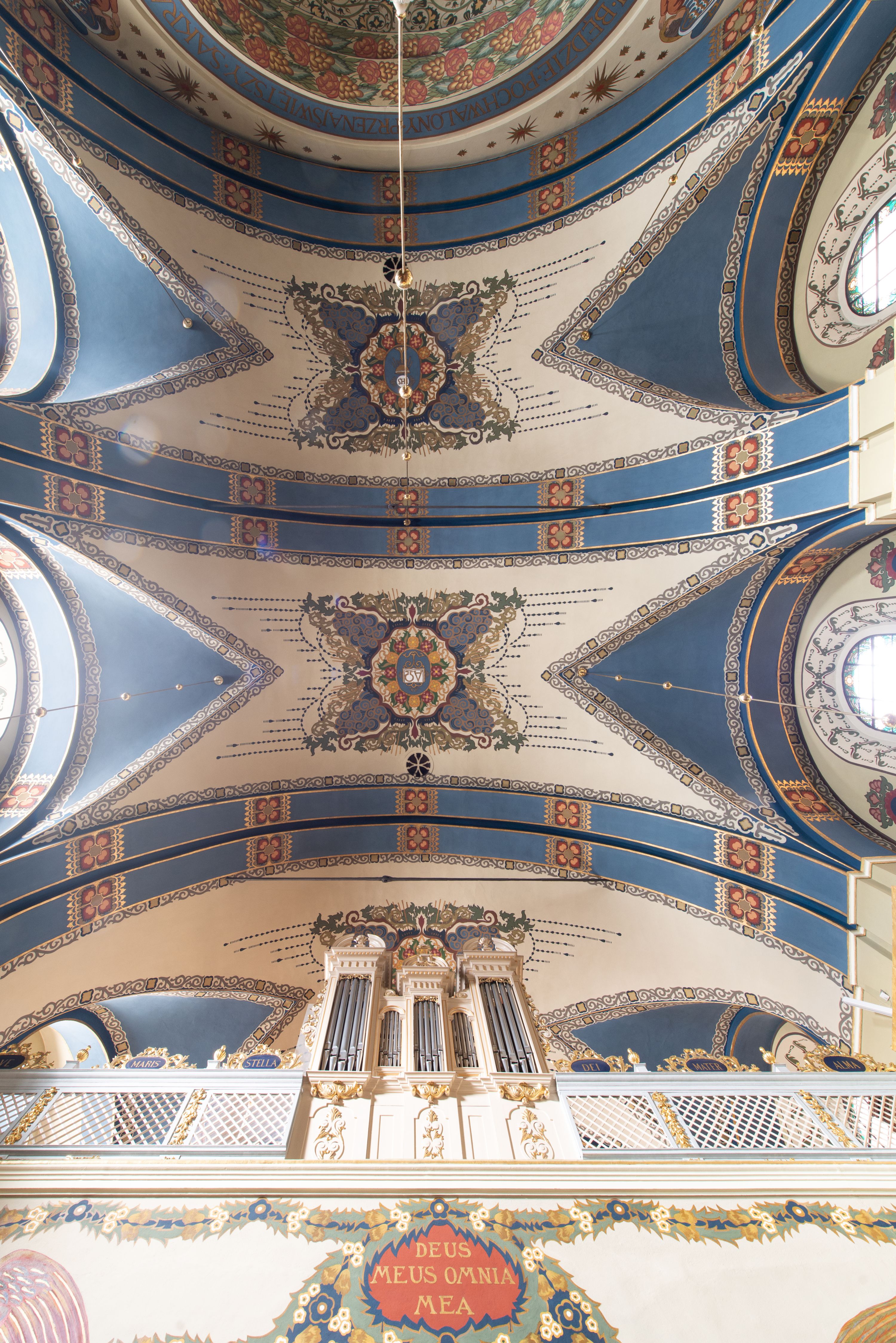 Dekoracja sklepienia nawy składa się z prostych symboli: kielicha z hostią, otwartej księgi z literami „A” i „Ω”, imienia MARIA i kotwicy. Zostały one wkomponowane w owalne medaliony w barwnej oprawie utworzonej z wieńców z żółtych i czerwonych kwiatów, złotych i zielonych wici akantów, ułożonych krzyżowo spiralnych, niebieskich ślimacznic i otaczających je stylizowanych zielonych liści akantu, między którymi przebijają się złote promienie. Owe fantazyjne kompozycje w nawie ukazane są na jasnym, kremowym tle wysklepek i niebieskich lunet i gurtów. Elementy konstrukcyjne szwów sklepiennych są podkreślone pasami z wici roślinnej. Sklepienie prezbiterium odróżnia się jaśniejszą kolorystyką. Elementy konstrukcyjne łuków podkreślają bujne czerwono-zielone kwiaty, wśród których rozpoznano piwonie. Taka sama bordiura zdobi ścianę za ołtarzem. Pośrodku umieszczono Baranka na zamkniętej księdze z chorągwią zmartwychwstania, na tle krzyża greckiego w glorii promienistej. Szwy sklepienne zaakcentowano kwiatami w układzie kandelabrowym, a wysklepki zielono-złotymi symetrycznie układającymi się wiciami roślinnymi. Na parapecie chóru muzycznego malarz przedstawił dwie sceny: „Stygmatyzacja św. Franciszka” i „Anioł grający na skrzypcach płaczącemu św. Franciszkowi”.