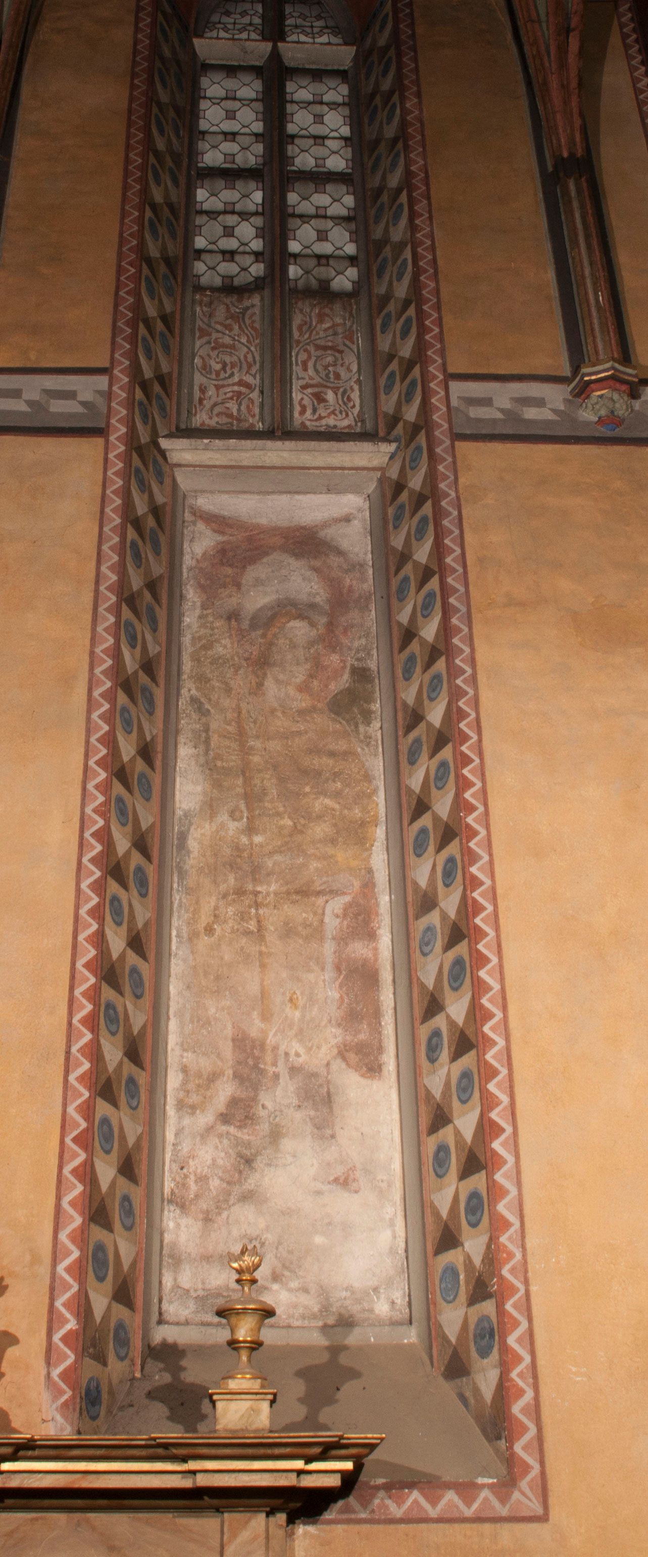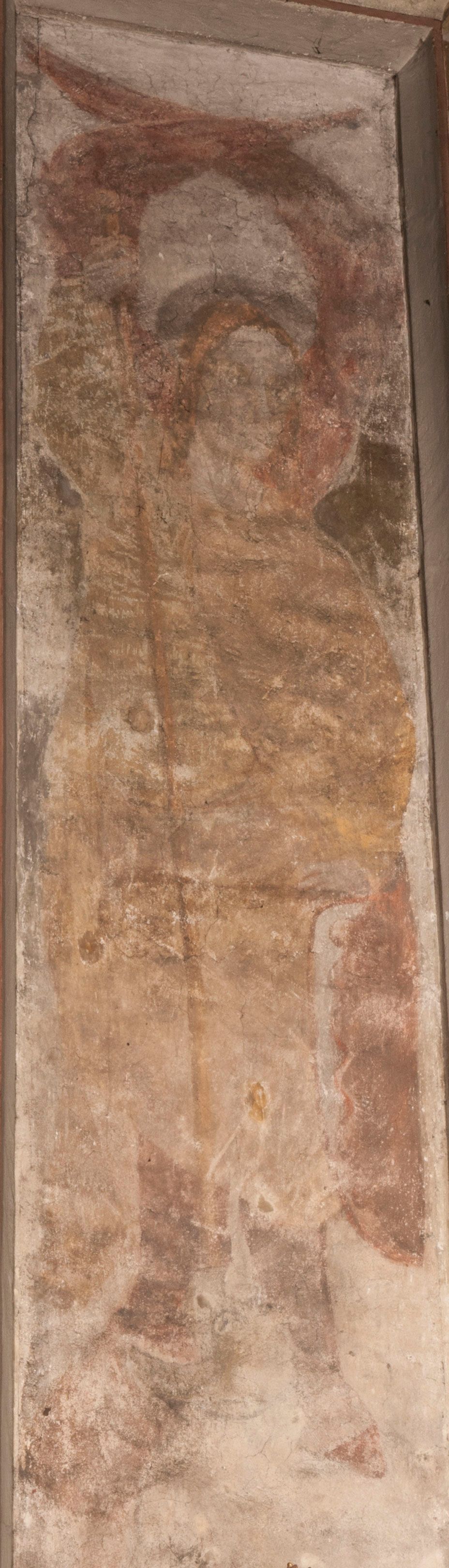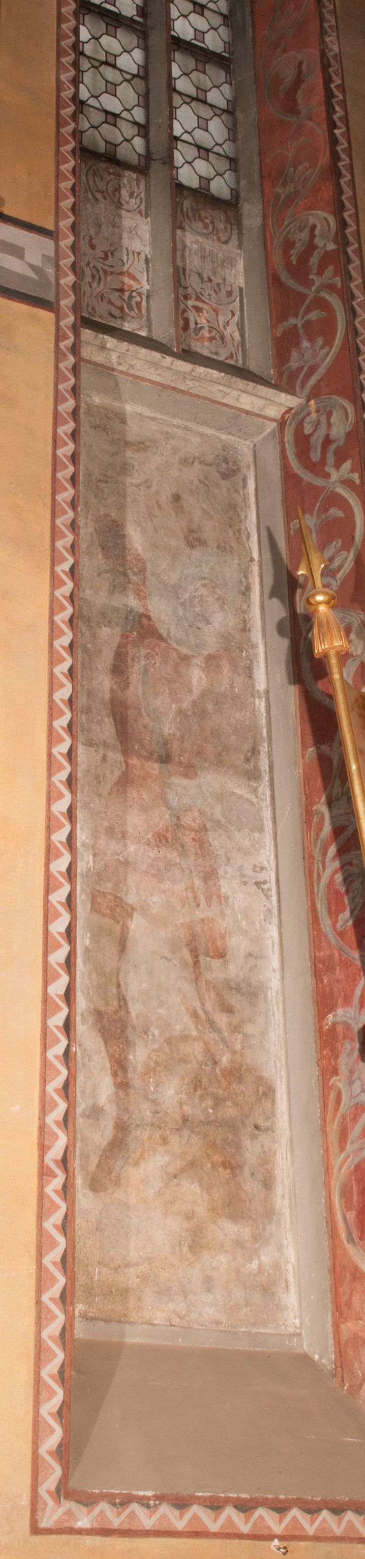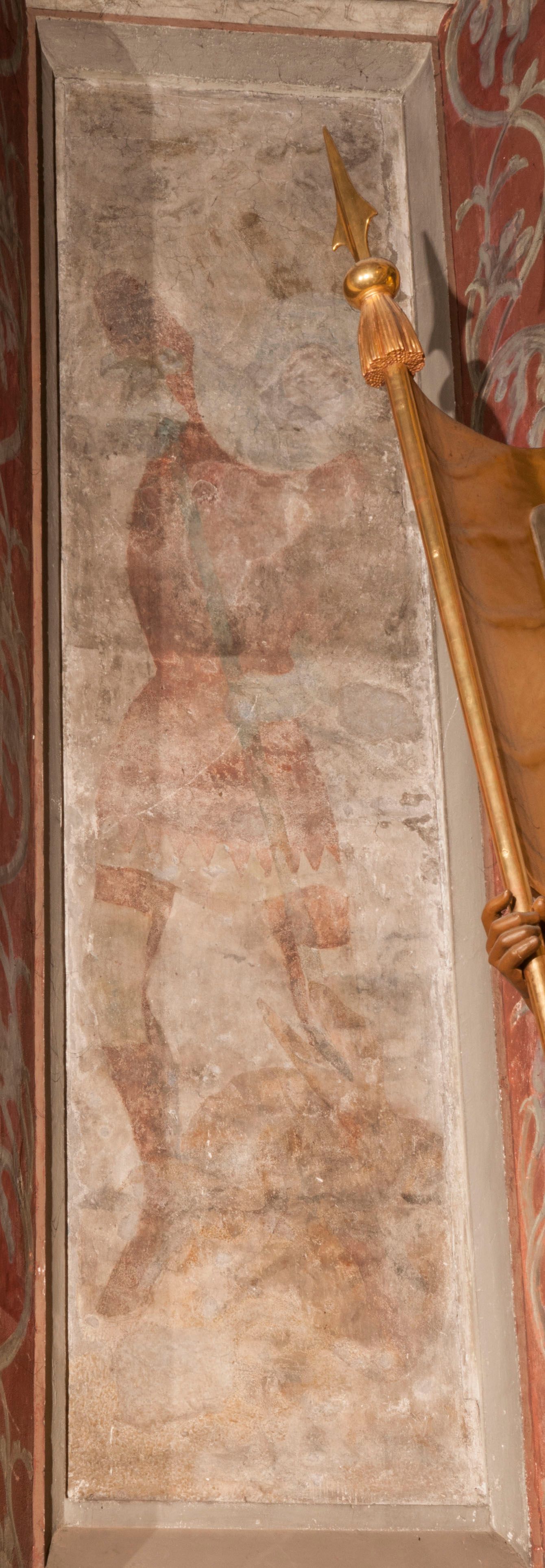 Malowidła z przedstawieniem św. Michała Archanioła pokonującego szatana i św. Jerzego walczącego ze smokiem zostały wykonane na ścianie północnej w dwóch wnękach podokiennych. Obie kompozycje powstały w polach o kształcie wydłużonego prostokąta. Święty Michał Archanioł został przedstawiony frontalnie w całej postaci z głową w ujęciu trzech czwartych w lewo. W uniesionej ponad głowę prawej ręce trzyma włócznię, wbitą w deptanego pod nogami szatana, którą jednocześnie podtrzymuje lewą ręką. Z tyłu widać jego rozpostarte skrzydła, skrzyżowane nad głową. Archanioł ma owalną twarz o wydatnym nosie oraz jasne włosy spływające na ramiona. Ubrany jest w przepasaną tunikę sięgającą goleni i w narzucony na ramiona płaszcz. Postać diabła pod jego stopami obutymi w buty jest prawie niewidoczna. W podobny sposób przedstawiono św. Jerzego. Święty został ukazany frontalnie na rozstawionych nogach w całej postaci ujętej w kontrapoście z głową w trzech czwartych skierowaną w lewo. Prawą rękę ma uniesioną ponad głową i zgiętą w łokciu. Trzyma w niej lancę podtrzymywaną lewą ręką. Pod jego stopami widoczny jest zarys zwiniętego smoka o zarysie bazyliszka. Św. Jerzy ubrany jest w strój rycerski. Na głowie ma spiczasto zakończony hełm z kolczugą. Ciało okrywa mocno taliowana w pasie tunika zdobiona u dołu ornamentem z motywem trójkąta równoramiennego. Na nogach ma założone wysokie buty. W obu przedstawieniach widoczne są ciemne ugry, ciemna czerwień, żółcień, błękit i brąz. Tła są szare.