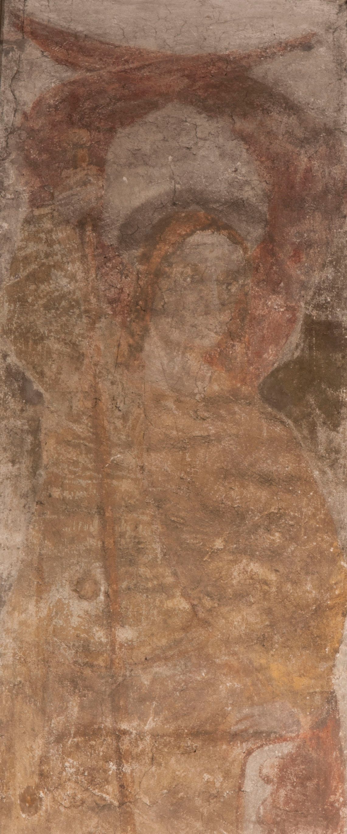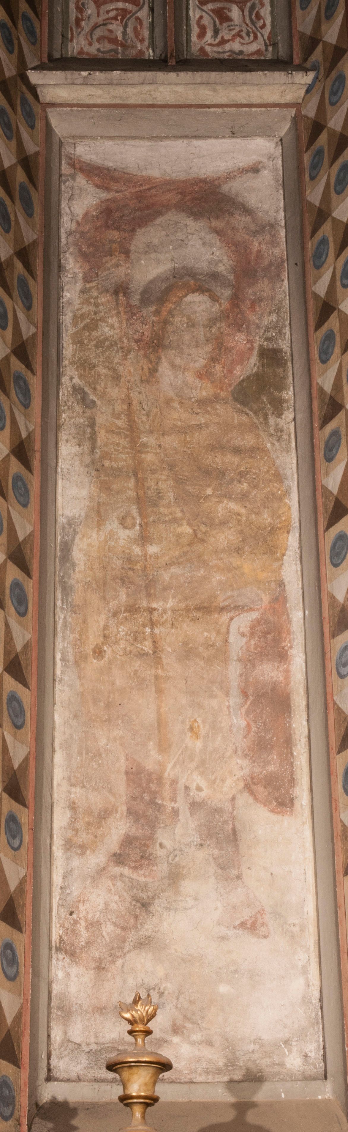 Polichromia została wykonana w dwóch wnękach podokiennych w prezbiterium kościoła. Widoczne są nikłe pozostałości pierwotnej warstwy malarskiej. Uchwytny jest zarys postaci, ślady rysunku twarzy i szczegółów kostiumologicznych. Zachowały się minimalne ślady modelunku na twarzach. Obie kompozycje zostały przemalowane w XVII wieku. Malowidła poddano kilkakrotnie konserwacji w XX wieku.