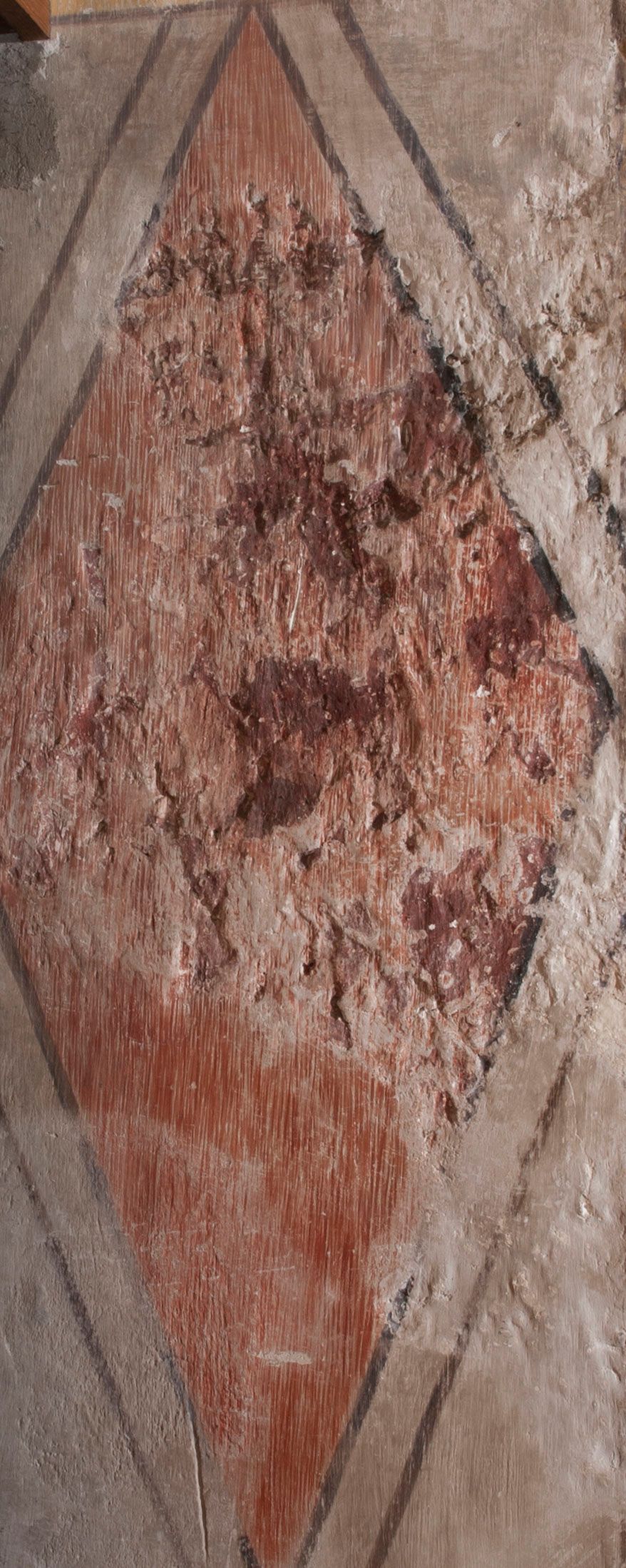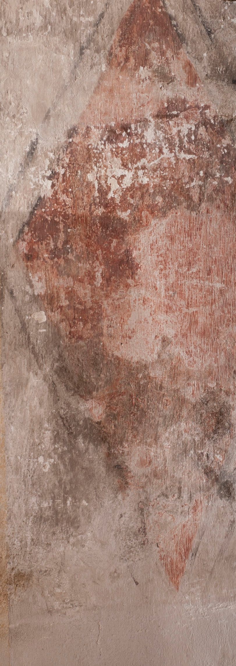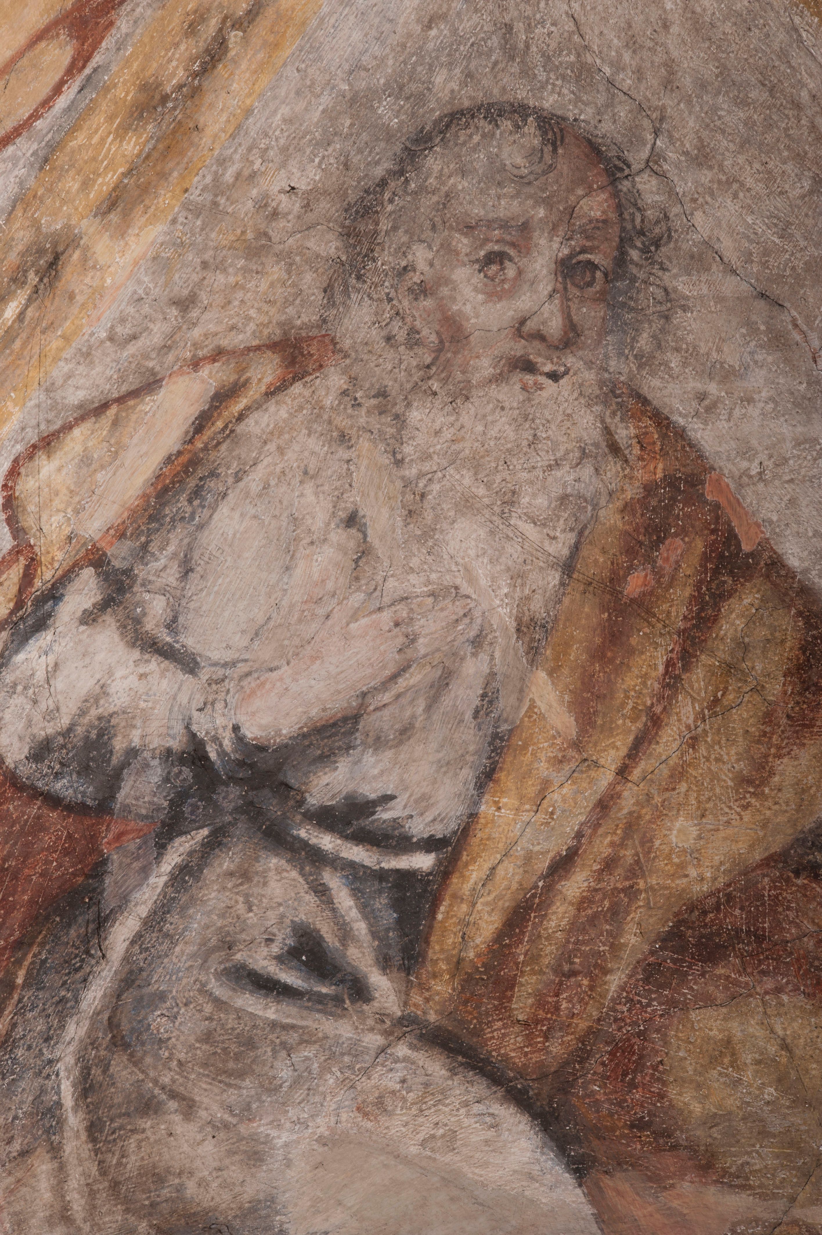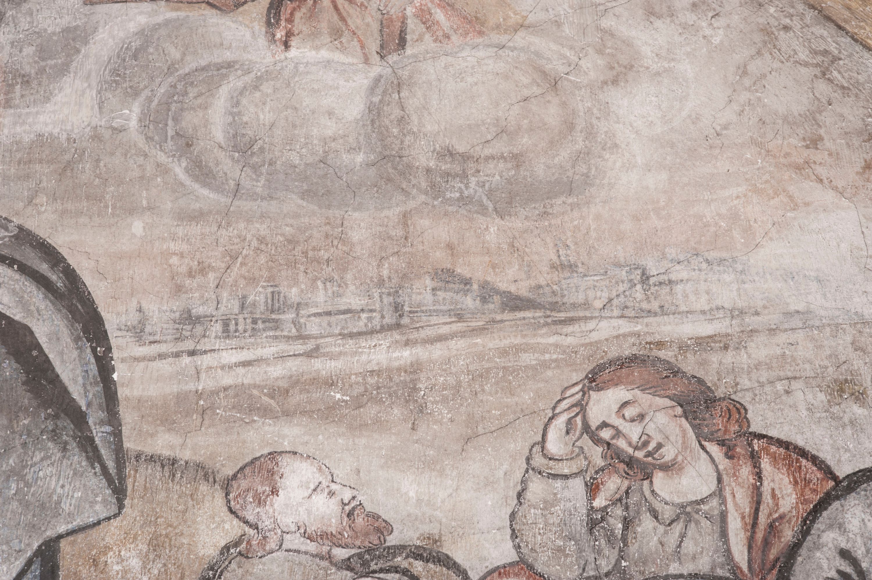 Zły. Widoczne są przybrudzenia, zatarcia oraz liczne uszkodzenia mechaniczne tynku oraz samej polichromii.