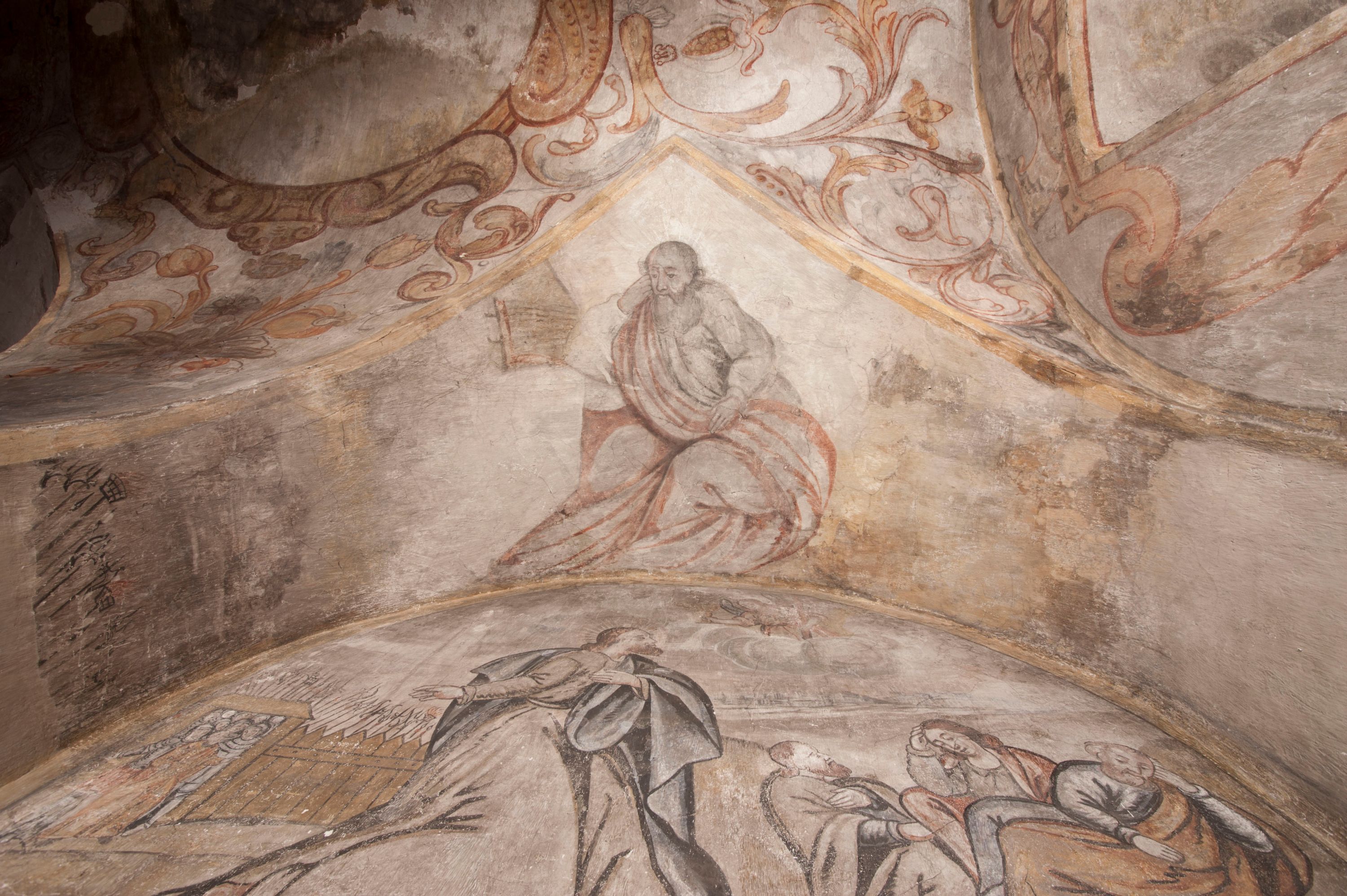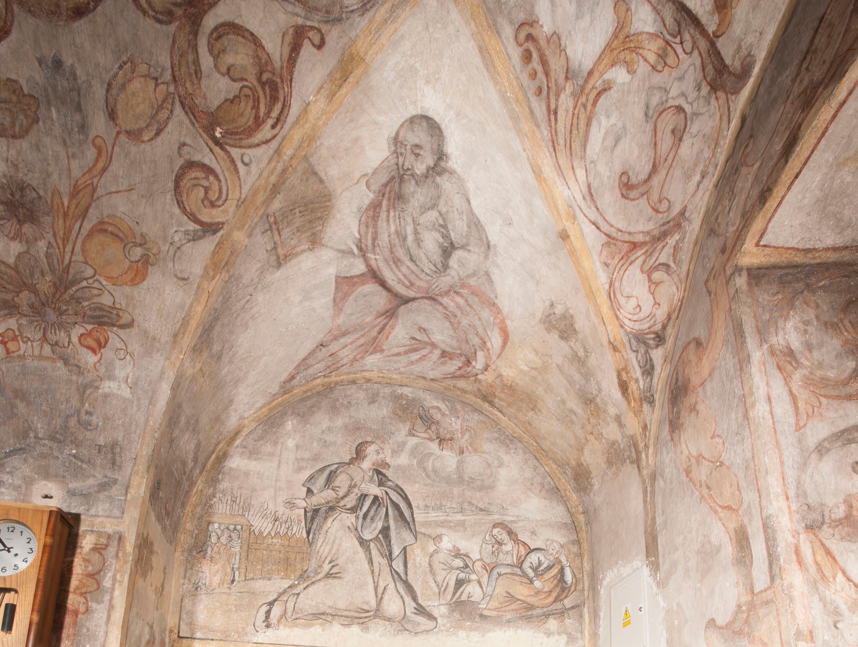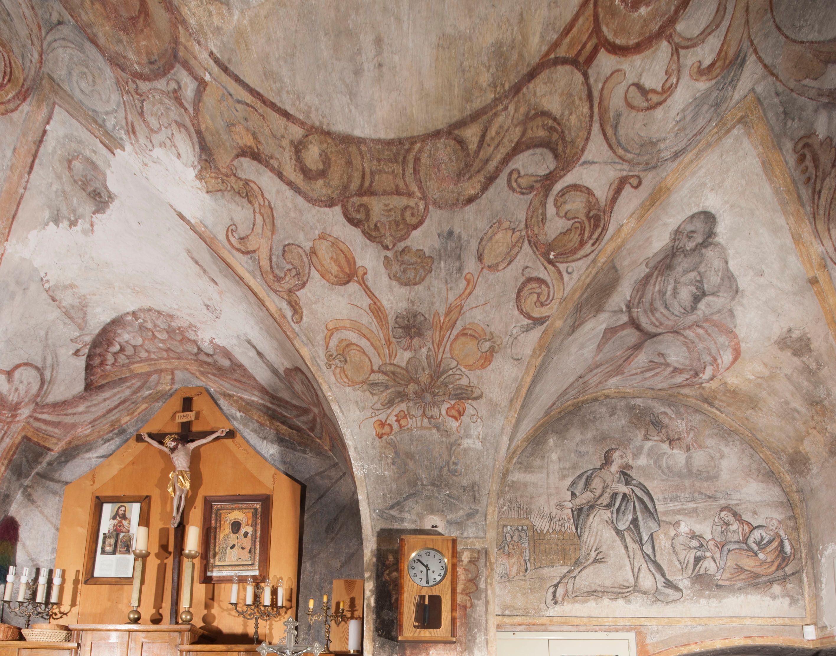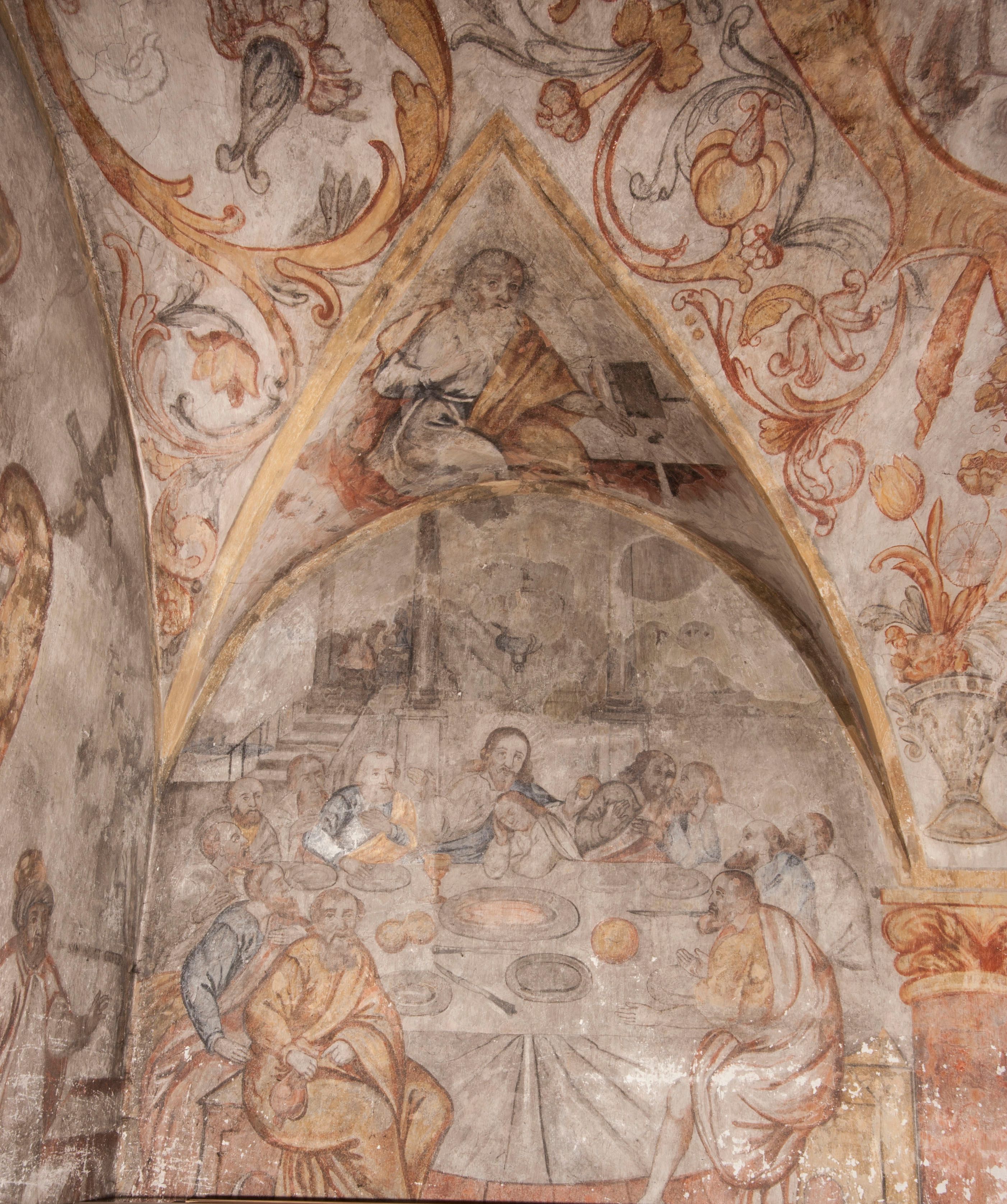 południowej dekoracje tworzy stylizowana wić akantowo-kwiatowa w glifie okiennym oraz otaczające okno obramienie utworzone z motywów rollwerkowych. Nie zachowała się polichromia w lunecie powyżej okna. Na zachodniej ścianie w glifie dawnego otworu wejściowego obramionego żółtą listwą, wykonano dekorację malarską składającą się z malowanych romboidalnych płycin pokrytych czerwonawą marmoryzacją. Ponad glifem na ścianie znajduje się czerwony krzyż równoramienny rozdzielający datę 16 / 46. Na ścianie z prawej strony otworu wyobrażono Ukrzyżowanie Chrystusa na polu pokrytym licznymi, stojącymi krzyżami. Postać Zbawiciela zachowała się fragmentarycznie w partii tułowia i nóg. Powyżej pole w lunecie ozdobiono stylizowaną wicią akantowo-kwiatową. Ścianę północną w pierwszym przęśle wypełnionym szafą zakrystyjną udekorowano rozpostartym, czerwonym paludamentum z baldachimem. Powyżej w lunecie zachowało się bardzo zniszczone przedstawienie św. Jana Ewangelisty, którego można rozpoznać po młodzieńczej, pociągłej twarz o wydatnych rysach. Z postaci zachowały się jeszcze fragmenty stóp widoczne nad baldachimem. W drugim prześle w dolnej strefie przepruto drzwi z otworem zamkniętym łukiem odcinkowym, obramienionym złocistą taśmą. W nadprożu znalazła się stylizowana wić akantowo-kwiatowa. Powyżej, w górnej strefie namalowano modlitwę Chrystusa w Ogrójcu. Na pierwszym planie kompozycji widoczny jest klęczący na ziemi Zbawiciel ujęty w trzech czwartych w prawo. Lewą rękę ma przyłożoną do piersi, drugą zaś odsuniętą od tułowia. Jego uniesioną głowę ku górze otacza ciemna broda i długie włosy spływające na plecy. Chrystus ma wydatny nos i usta. Ubrany jest w obszerną, jasnooliwkową tunikę przewiązaną w pasie oraz niebieskoszary płaszcz przerzucony przez lewe ramię i rękę. Jezus wpatruje się w zjawiającego mu się powyżej uskrzydlonego anioła ukazanego w dwóch trzecich na obłokach. Anioł w wyciągniętej prawej ręce trzyma złoty kielich, a prawą podtrzymuje opary o ramię krzyż. Ubrany jest w baldoczerwoną tunikę przewiązaną w pasie. Z prawej strony Jezusa widocznych jest trzech śpiących apostołów. Na pierwszym planie ukazano leżącego św. Piotra z głową wspartą na lewej ręce. Jest to starszy mężczyzna z łysym czołem i siwiejącymi włosami i brodą. Ubrany jest w bladoniebieską tunikę i ciemnoochrowy płaszcz. Za nim widać siedzącego św. Jana z głową wspartą na ręce, którą podpiera o prawe kolano. Jest to młodzieniec o długich włosach, ubrany w blado oliwkową tunikę i baldoczerwony płaszcz. O niewielki wzgórek z lewej strony Jana oparty jest św. Jakub. Jest to starszy mężczyzna z brązową brodą i włosami ubrany w bladooliwkowy płaszcz. Za Zbawicielem z lewej strony kompozycji widać drewniany płot z bramką, przez którą do ogrodu wchodzi Judasz w jasno-chórowej szacie, prowadzący zbrojny oddział sług świątynnych. W głębi kompozycji ukazano panoramę Jerozolimy. Powyżej na sklepieniu lunety wyobrażono siedzącego ewangelistę, który ukazany został jako starzec z długą siwą brodą i łysiejącym czołem. Mężczyzna wspierając prawą rękę o stół podpiera nią głowę. Lewą ma położoną na kolanie. Ubrany jest w szarą tunikę oraz bladoczerwony płaszcz przerzucony przez prawe ramię i okrywający kolana.