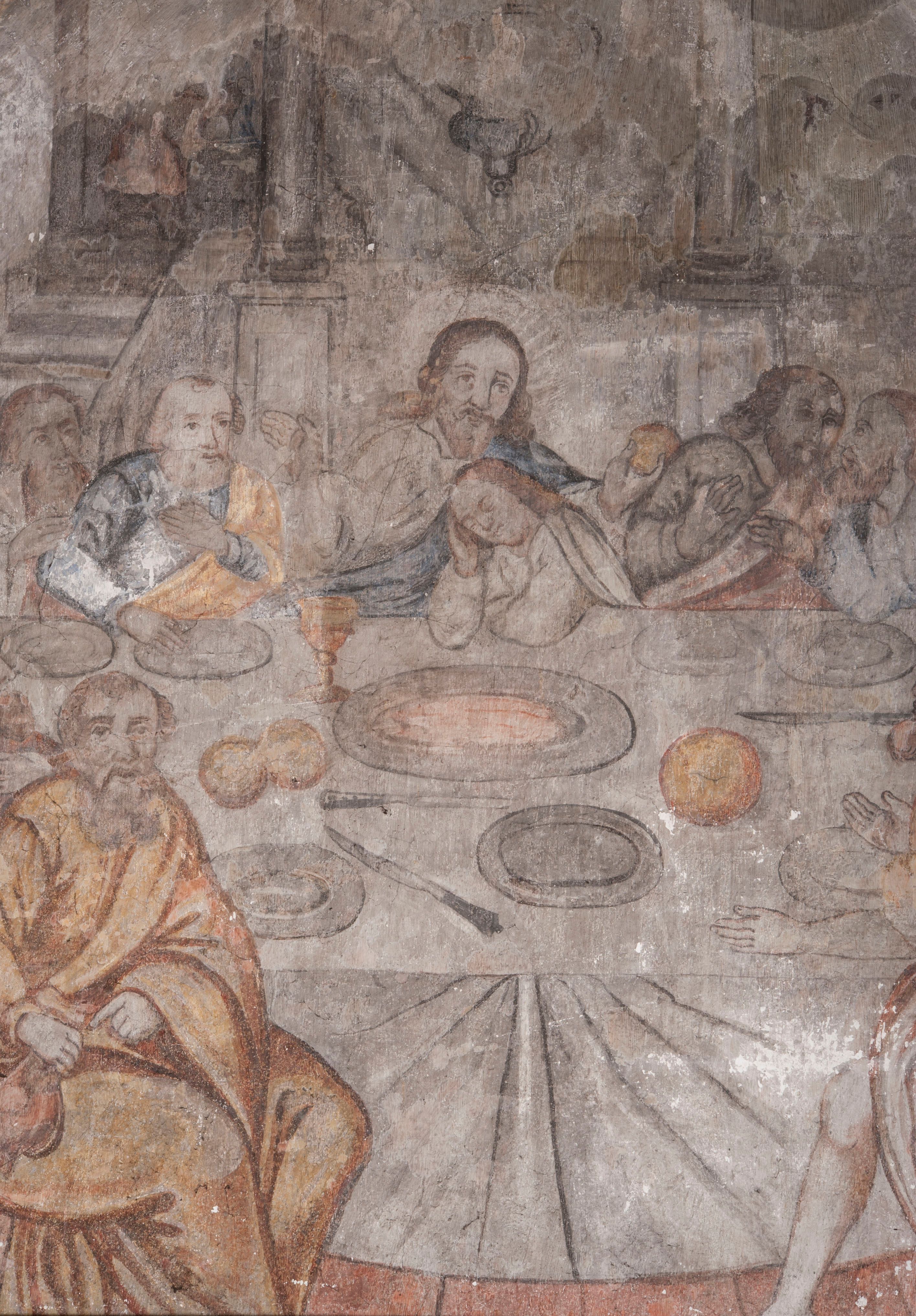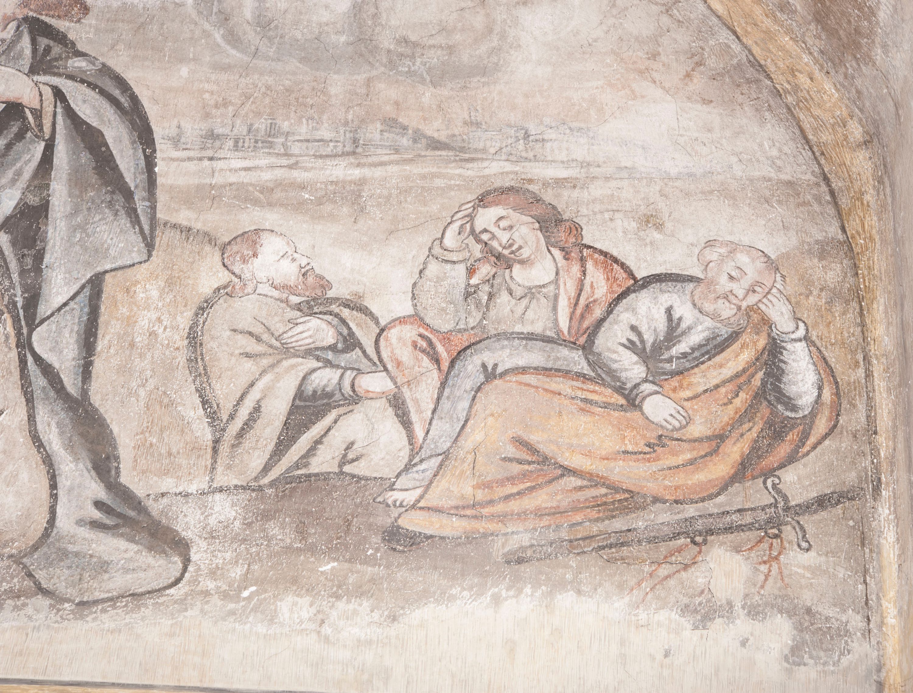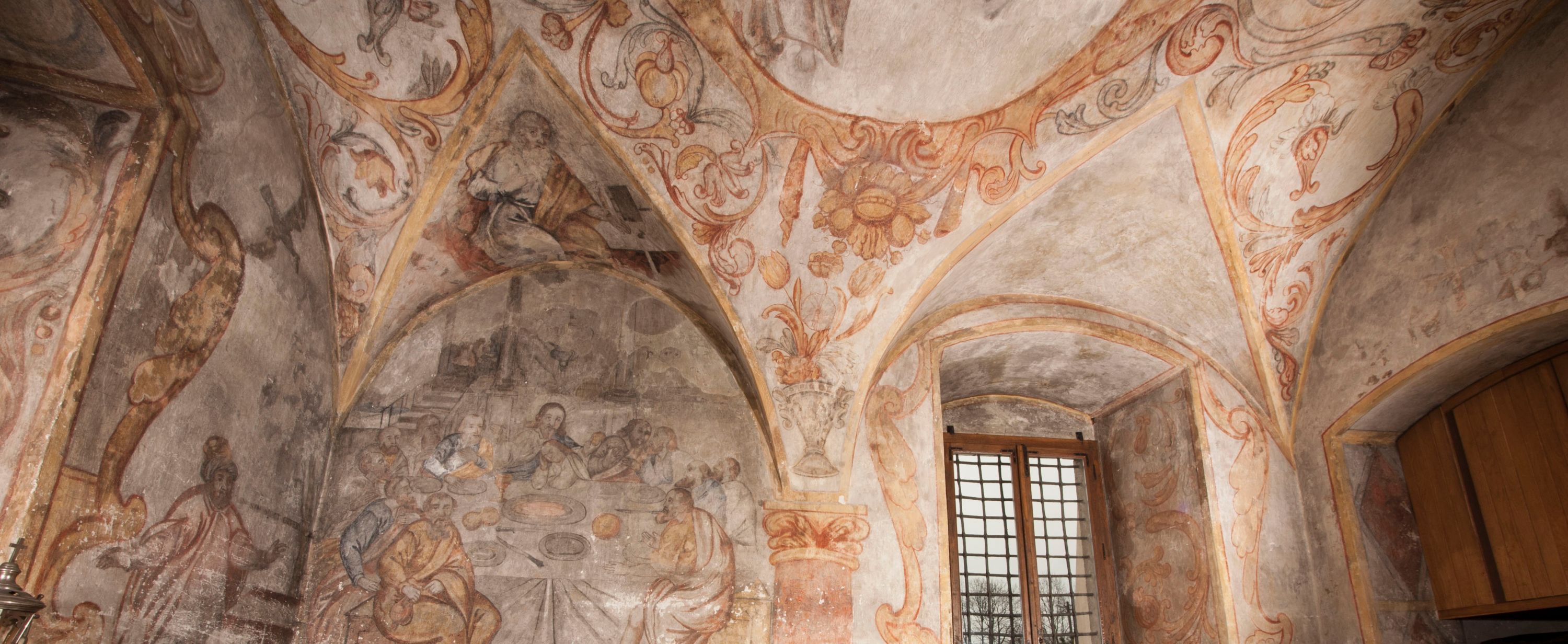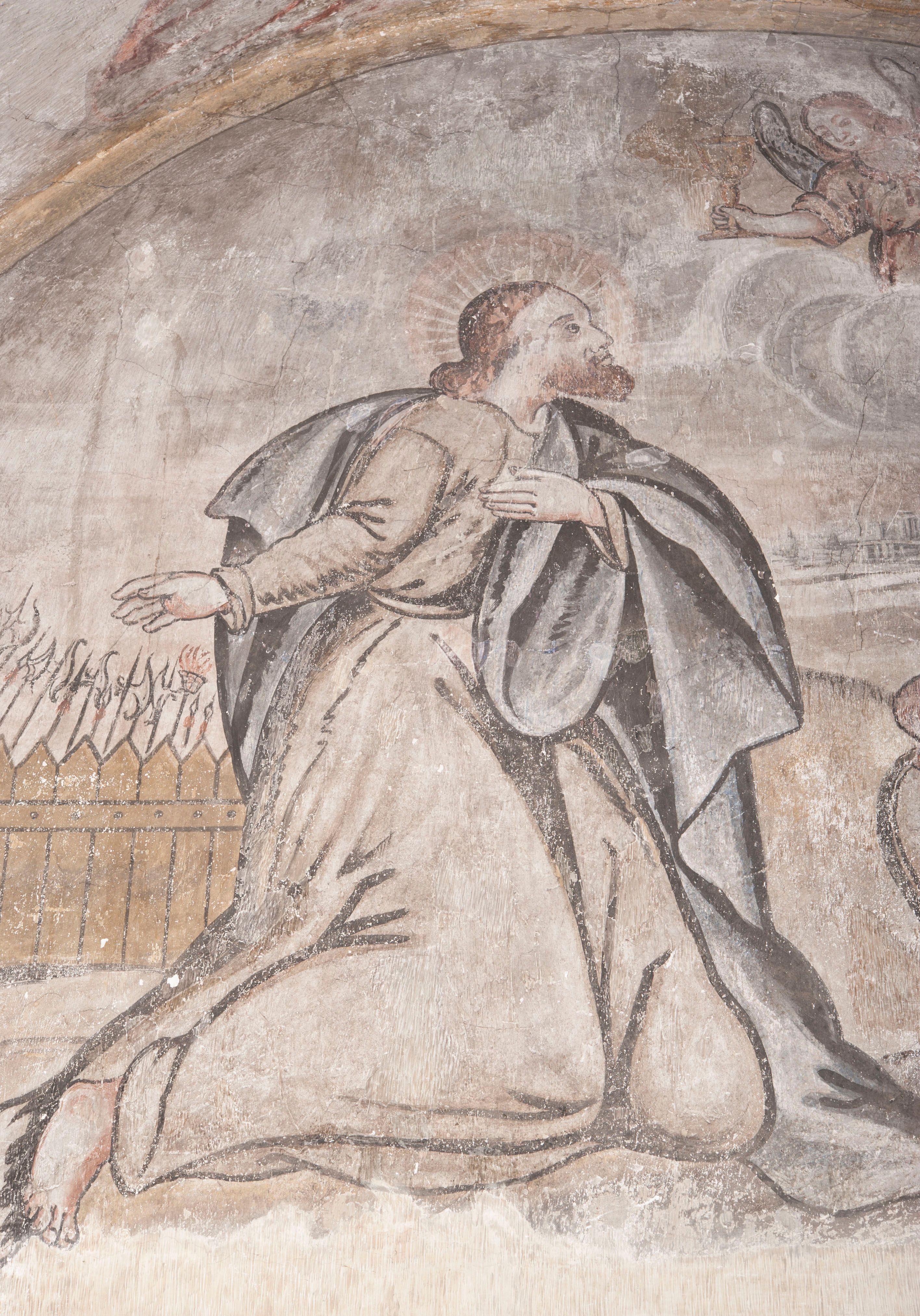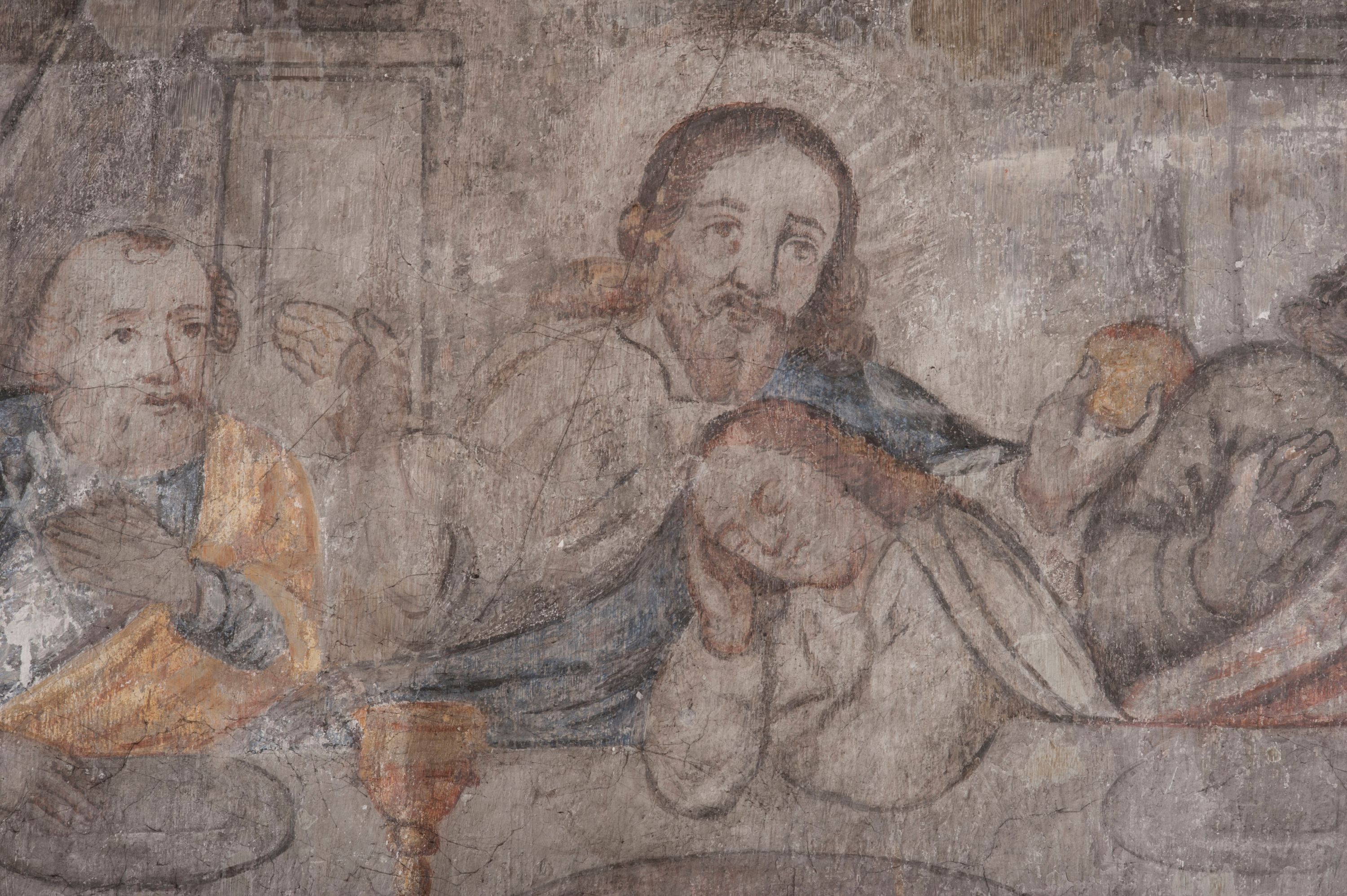południowej dekoracje tworzy stylizowana wić akantowo-kwiatowa w glifie okiennym oraz otaczające okno obramienie utworzone z motywów rollwerkowych. Nie zachowała się polichromia w lunecie powyżej okna. Na zachodniej ścianie w glifie dawnego otworu wejściowego obramionego żółtą listwą, wykonano dekorację malarską składającą się z malowanych romboidalnych płycin pokrytych czerwonawą marmoryzacją. Ponad glifem na ścianie znajduje się czerwony krzyż równoramienny rozdzielający datę 16 / 46. Na ścianie z prawej strony otworu wyobrażono Ukrzyżowanie Chrystusa na polu pokrytym licznymi, stojącymi krzyżami. Postać Zbawiciela zachowała się fragmentarycznie w partii tułowia i nóg. Powyżej pole w lunecie ozdobiono stylizowaną wicią akantowo-kwiatową. Ścianę północną w pierwszym przęśle wypełnionym szafą zakrystyjną udekorowano rozpostartym, czerwonym paludamentum z baldachimem. Powyżej w lunecie zachowało się bardzo zniszczone przedstawienie św. Jana Ewangelisty, którego można rozpoznać po młodzieńczej, pociągłej twarz o wydatnych rysach. Z postaci zachowały się jeszcze fragmenty stóp widoczne nad baldachimem. W drugim prześle w dolnej strefie przepruto drzwi z otworem zamkniętym łukiem odcinkowym, obramienionym złocistą taśmą. W nadprożu znalazła się stylizowana wić akantowo-kwiatowa. Powyżej, w górnej strefie namalowano modlitwę Chrystusa w Ogrójcu. Na pierwszym planie kompozycji widoczny jest klęczący na ziemi Zbawiciel ujęty w trzech czwartych w prawo. Lewą rękę ma przyłożoną do piersi, drugą zaś odsuniętą od tułowia. Jego uniesioną głowę ku górze otacza ciemna broda i długie włosy spływające na plecy. Chrystus ma wydatny nos i usta. Ubrany jest w obszerną, jasnooliwkową tunikę przewiązaną w pasie oraz niebieskoszary płaszcz przerzucony przez lewe ramię i rękę. Jezus wpatruje się w zjawiającego mu się powyżej uskrzydlonego anioła ukazanego w dwóch trzecich na obłokach. Anioł w wyciągniętej prawej ręce trzyma złoty kielich, a prawą podtrzymuje opary o ramię krzyż. Ubrany jest w baldoczerwoną tunikę przewiązaną w pasie. Z prawej strony Jezusa widocznych jest trzech śpiących apostołów. Na pierwszym planie ukazano leżącego św. Piotra z głową wspartą na lewej ręce. Jest to starszy mężczyzna z łysym czołem i siwiejącymi włosami i brodą. Ubrany jest w bladoniebieską tunikę i ciemnoochrowy płaszcz. Za nim widać siedzącego św. Jana z głową wspartą na ręce, którą podpiera o prawe kolano. Jest to młodzieniec o długich włosach, ubrany w blado oliwkową tunikę i baldoczerwony płaszcz. O niewielki wzgórek z lewej strony Jana oparty jest św. Jakub. Jest to starszy mężczyzna z brązową brodą i włosami ubrany w bladooliwkowy płaszcz. Za Zbawicielem z lewej strony kompozycji widać drewniany płot z bramką, przez którą do ogrodu wchodzi Judasz w jasno-chórowej szacie, prowadzący zbrojny oddział sług świątynnych. W głębi kompozycji ukazano panoramę Jerozolimy. Powyżej na sklepieniu lunety wyobrażono siedzącego ewangelistę, który ukazany został jako starzec z długą siwą brodą i łysiejącym czołem. Mężczyzna wspierając prawą rękę o stół podpiera nią głowę. Lewą ma położoną na kolanie. Ubrany jest w szarą tunikę oraz bladoczerwony płaszcz przerzucony przez prawe ramię i okrywający kolana.