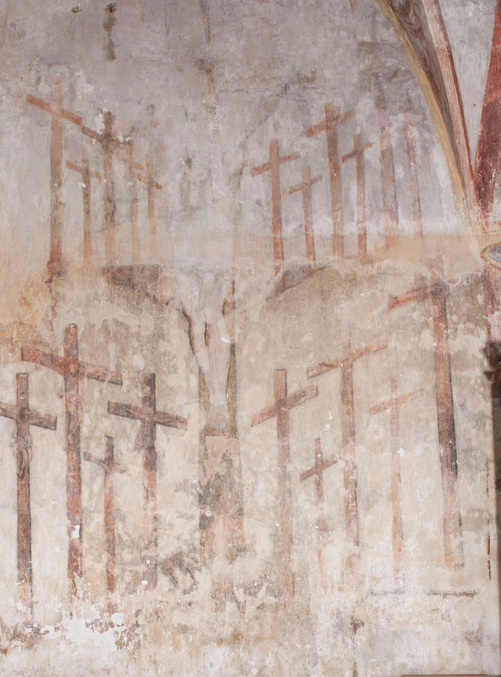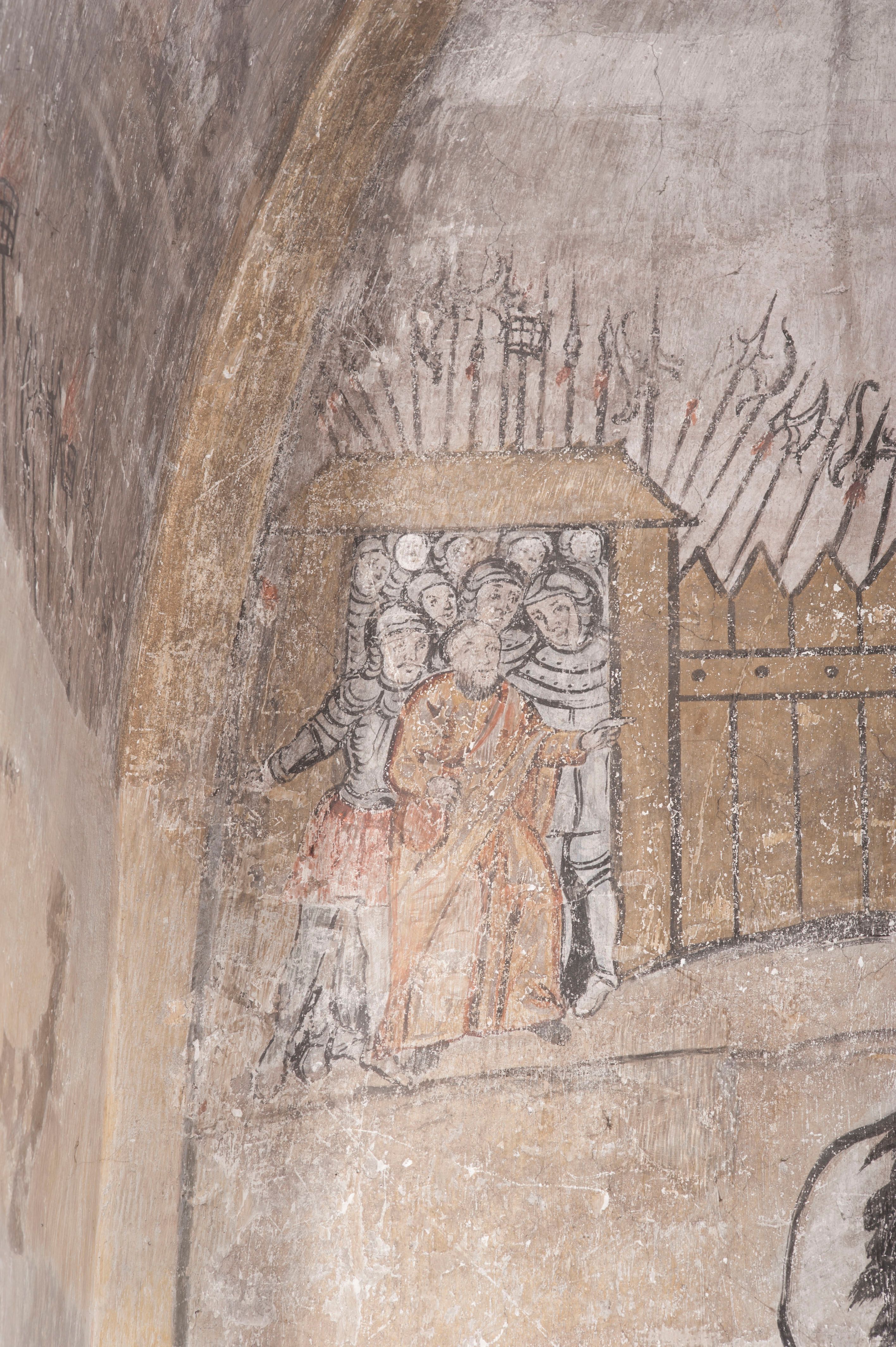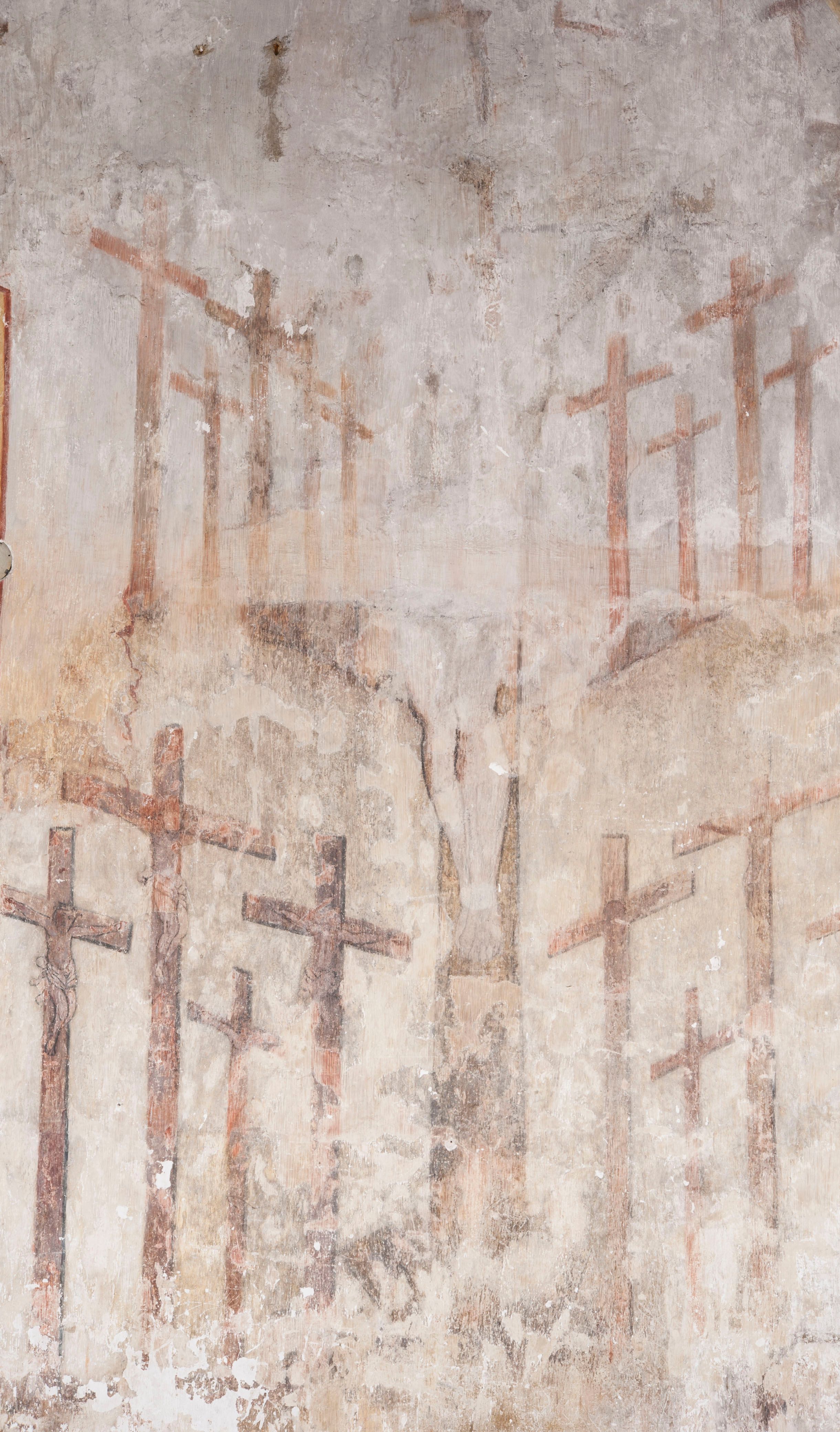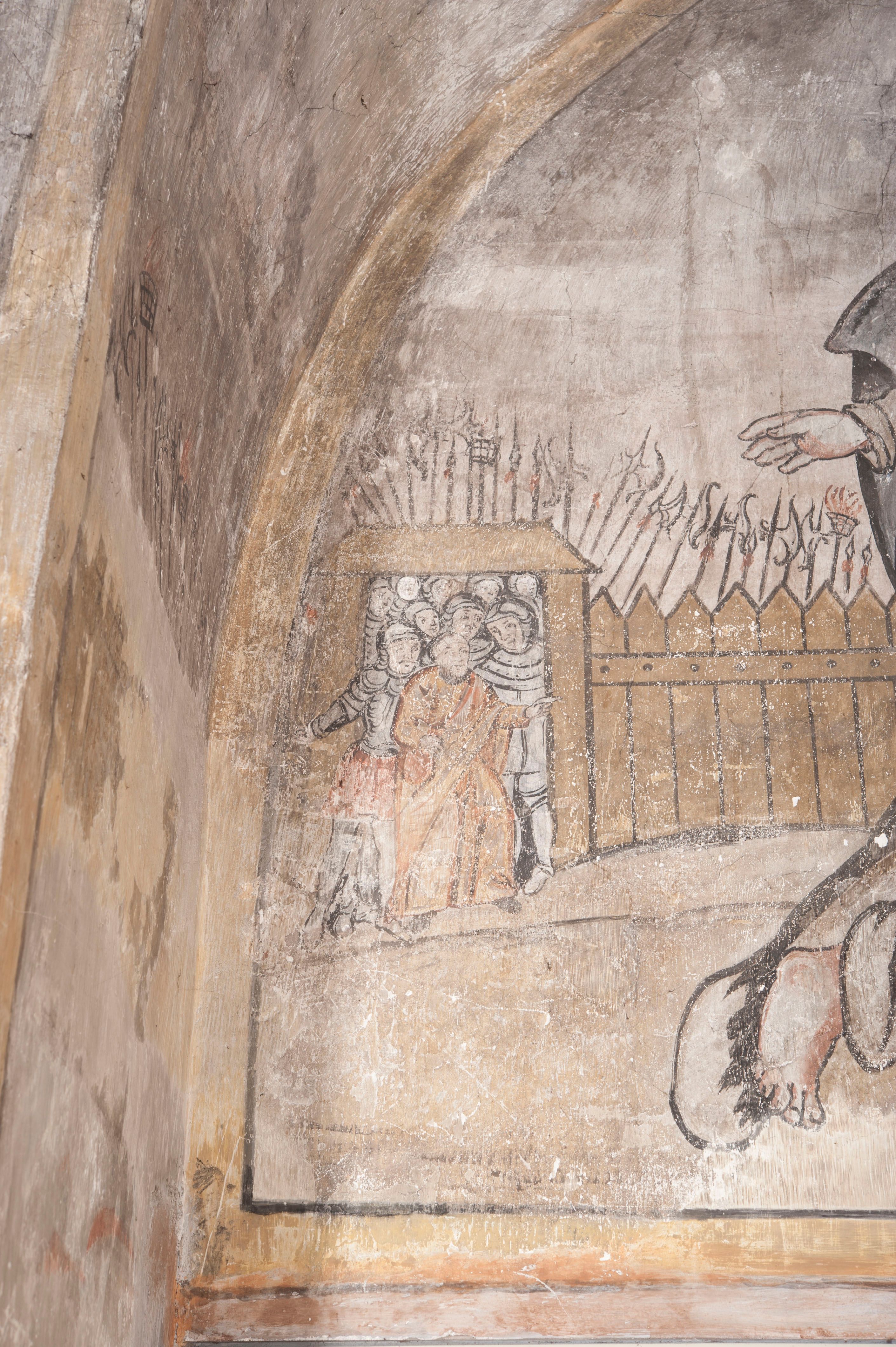 południowej dekoracje tworzy stylizowana wić akantowo-kwiatowa w glifie okiennym oraz otaczające okno obramienie utworzone z motywów rollwerkowych. Nie zachowała się polichromia w lunecie powyżej okna. Na zachodniej ścianie w glifie dawnego otworu wejściowego obramionego żółtą listwą, wykonano dekorację malarską składającą się z malowanych romboidalnych płycin pokrytych czerwonawą marmoryzacją. Ponad glifem na ścianie znajduje się czerwony krzyż równoramienny rozdzielający datę 16 / 46. Na ścianie z prawej strony otworu wyobrażono Ukrzyżowanie Chrystusa na polu pokrytym licznymi, stojącymi krzyżami. Postać Zbawiciela zachowała się fragmentarycznie w partii tułowia i nóg. Powyżej pole w lunecie ozdobiono stylizowaną wicią akantowo-kwiatową. Ścianę północną w pierwszym przęśle wypełnionym szafą zakrystyjną udekorowano rozpostartym, czerwonym paludamentum z baldachimem. Powyżej w lunecie zachowało się bardzo zniszczone przedstawienie św. Jana Ewangelisty, którego można rozpoznać po młodzieńczej, pociągłej twarz o wydatnych rysach. Z postaci zachowały się jeszcze fragmenty stóp widoczne nad baldachimem. W drugim prześle w dolnej strefie przepruto drzwi z otworem zamkniętym łukiem odcinkowym, obramienionym złocistą taśmą. W nadprożu znalazła się stylizowana wić akantowo-kwiatowa. Powyżej, w górnej strefie namalowano modlitwę Chrystusa w Ogrójcu. Na pierwszym planie kompozycji widoczny jest klęczący na ziemi Zbawiciel ujęty w trzech czwartych w prawo. Lewą rękę ma przyłożoną do piersi, drugą zaś odsuniętą od tułowia. Jego uniesioną głowę ku górze otacza ciemna broda i długie włosy spływające na plecy. Chrystus ma wydatny nos i usta. Ubrany jest w obszerną, jasnooliwkową tunikę przewiązaną w pasie oraz niebieskoszary płaszcz przerzucony przez lewe ramię i rękę. Jezus wpatruje się w zjawiającego mu się powyżej uskrzydlonego anioła ukazanego w dwóch trzecich na obłokach. Anioł w wyciągniętej prawej ręce trzyma złoty kielich, a prawą podtrzymuje opary o ramię krzyż. Ubrany jest w baldoczerwoną tunikę przewiązaną w pasie. Z prawej strony Jezusa widocznych jest trzech śpiących apostołów. Na pierwszym planie ukazano leżącego św. Piotra z głową wspartą na lewej ręce. Jest to starszy mężczyzna z łysym czołem i siwiejącymi włosami i brodą. Ubrany jest w bladoniebieską tunikę i ciemnoochrowy płaszcz. Za nim widać siedzącego św. Jana z głową wspartą na ręce, którą podpiera o prawe kolano. Jest to młodzieniec o długich włosach, ubrany w blado oliwkową tunikę i baldoczerwony płaszcz. O niewielki wzgórek z lewej strony Jana oparty jest św. Jakub. Jest to starszy mężczyzna z brązową brodą i włosami ubrany w bladooliwkowy płaszcz. Za Zbawicielem z lewej strony kompozycji widać drewniany płot z bramką, przez którą do ogrodu wchodzi Judasz w jasno-chórowej szacie, prowadzący zbrojny oddział sług świątynnych. W głębi kompozycji ukazano panoramę Jerozolimy. Powyżej na sklepieniu lunety wyobrażono siedzącego ewangelistę, który ukazany został jako starzec z długą siwą brodą i łysiejącym czołem. Mężczyzna wspierając prawą rękę o stół podpiera nią głowę. Lewą ma położoną na kolanie. Ubrany jest w szarą tunikę oraz bladoczerwony płaszcz przerzucony przez prawe ramię i okrywający kolana.
