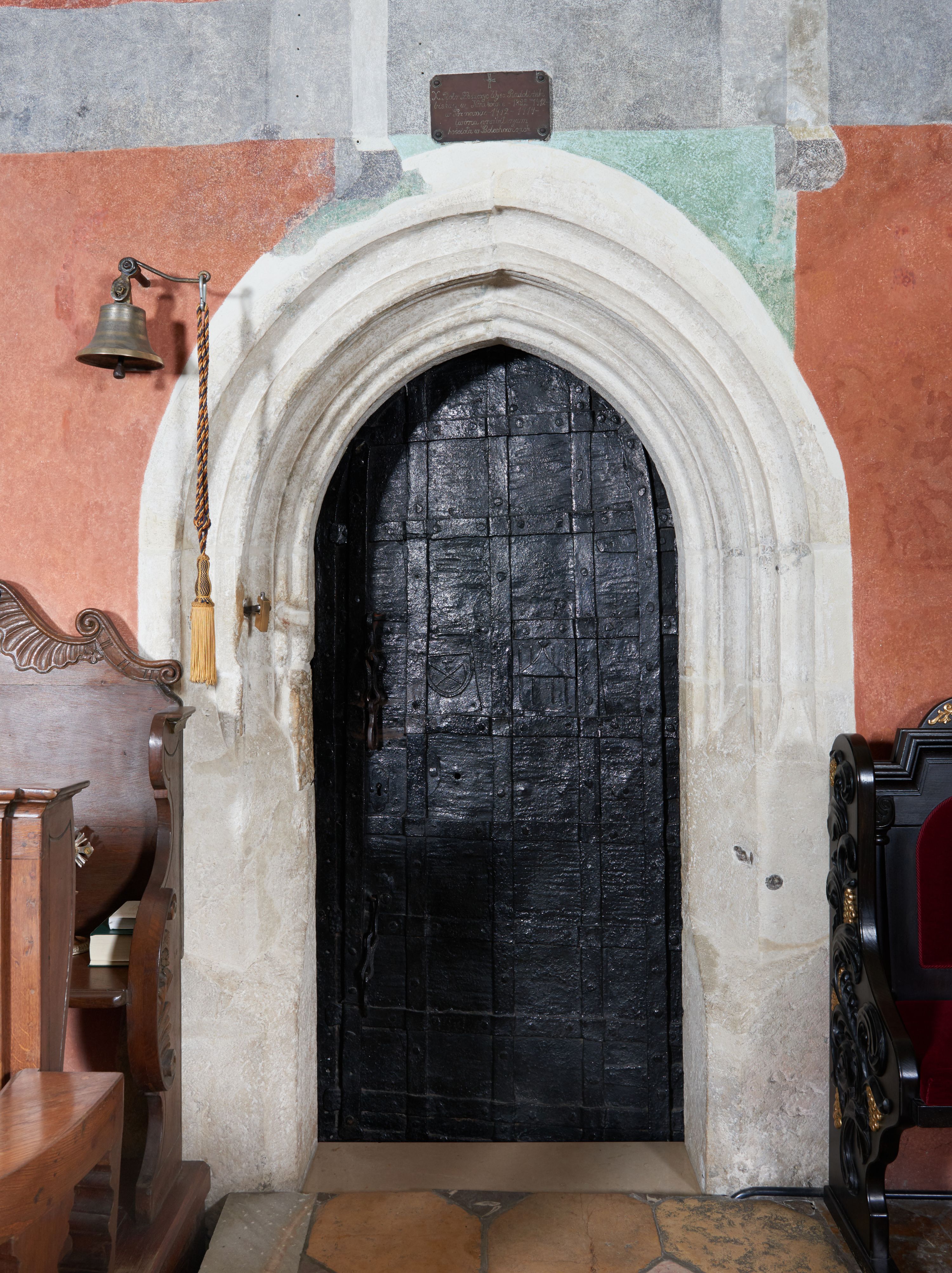 Ostrołukowy portal do zakrystii z węgarami do wysokości 35 cm sfazowanymi, wyżej ściętymi, a w górnej połowie bogato profilowany. Wypełniają go drzwi płytowe, prostokątne, zamknięte łukiem ostrym. Drewniane, okute blachą i kratą z metalowych listew, z zamkiem nakładanym od strony zakrystii i parą wrzeciądzów. W środkowych płytach dwa herby: Leszczyc (Bróg) i Niesobia (?).