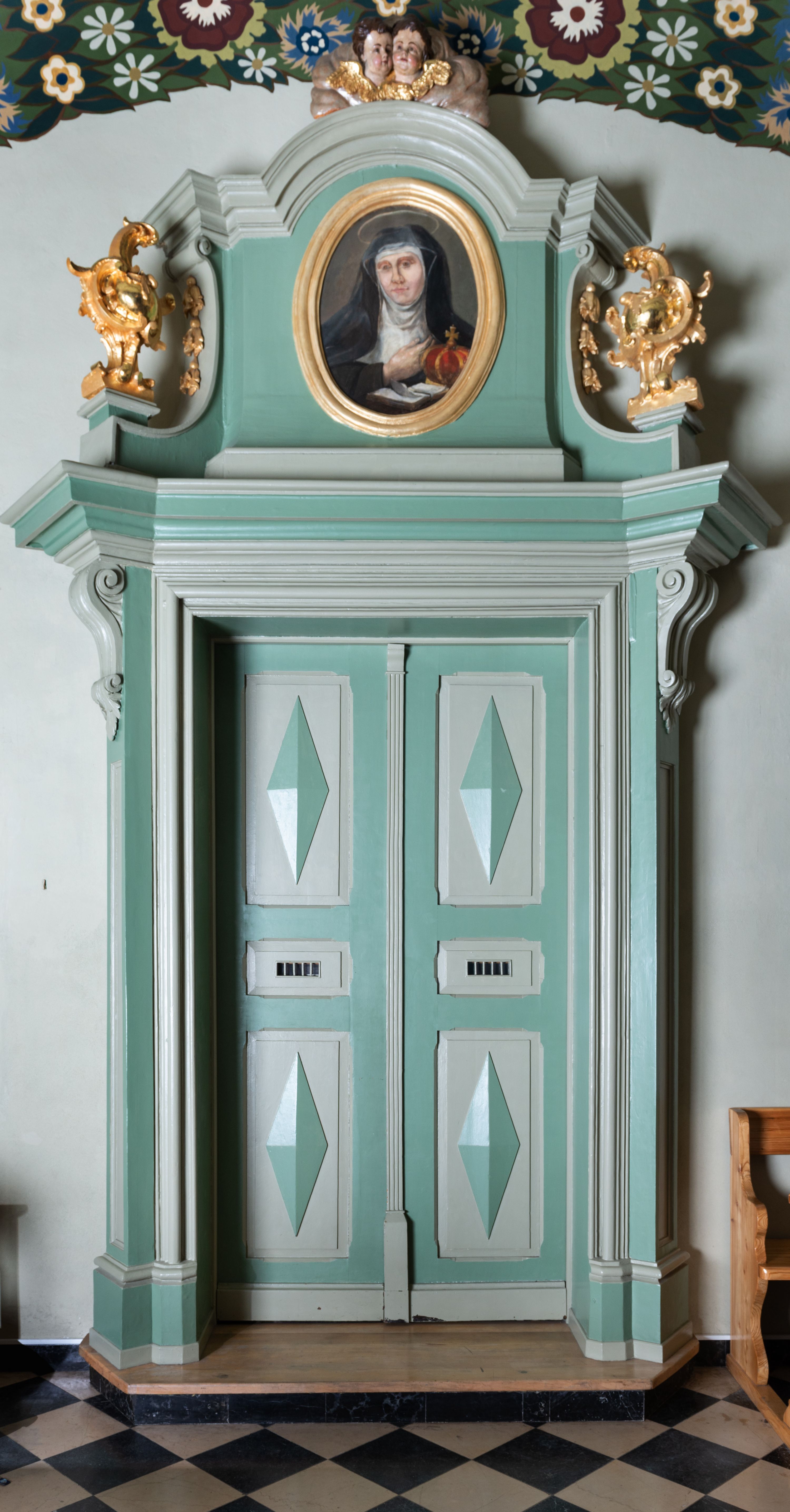 Portal drzwi prostokątnych, prowadzących do kaplicy zakonnej, dwuskrzydłowych, czteropolowych, z romboidalnymi występami został ujęty ukośnie dostawionymi pilastrami z konsolami w miejscu głowic, podtrzymującymi profilowany, mocno wysunięty gzyms. Górna część jest flankowana spływami wolutowymi z kampanulami, zakończonymi rokokowymi wazonami i jest zwieńczona profilowanym gzymsem w kształcie łuku nadwieszonego. W zwieńczeniu owalny obraz w profilowanej, złoconej ramie z wizerunkiem św. Kingi.
