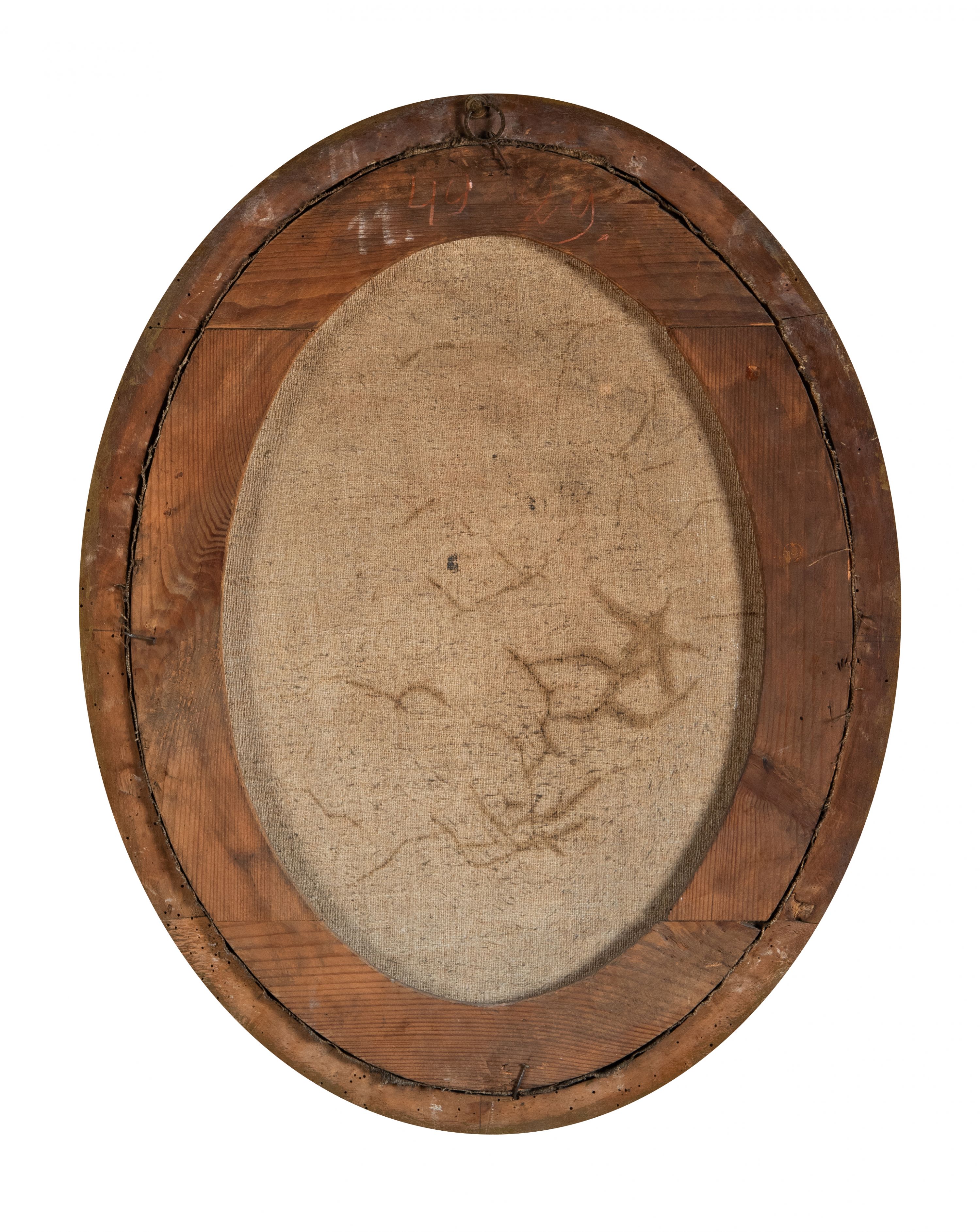 zabrudzenia powierzchni malarskiej, widoczne krakelury, peknięcia i przetarcia złocenia na ramie
