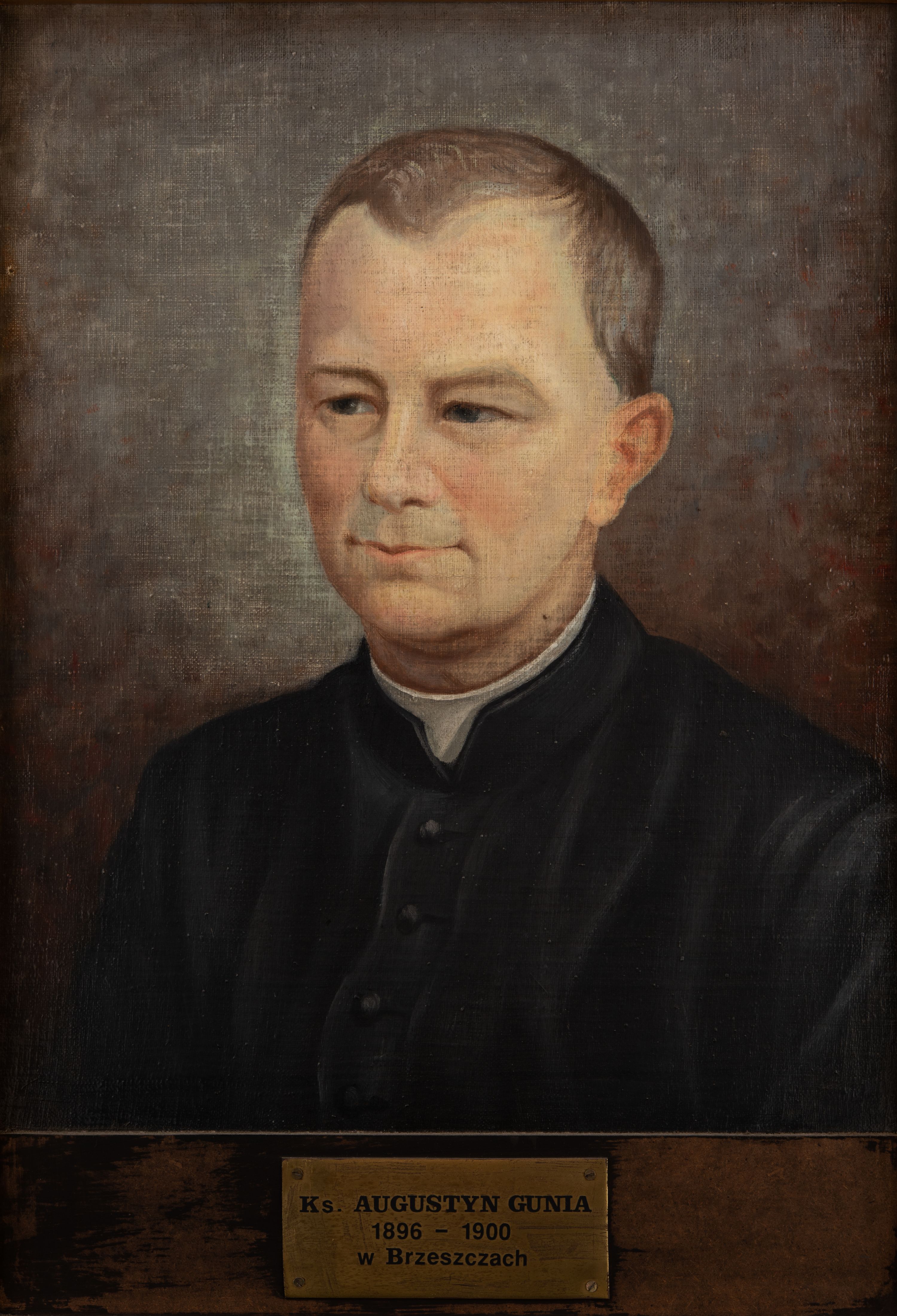Portret księdza Augustyna Guni, proboszcza w Brzeszczach w latach 1896-1900 wykonano najprawdopodobniej wraz z częścią portretów zawieszonych w zakrystii w latach sześćdziesiątych XX wieku.