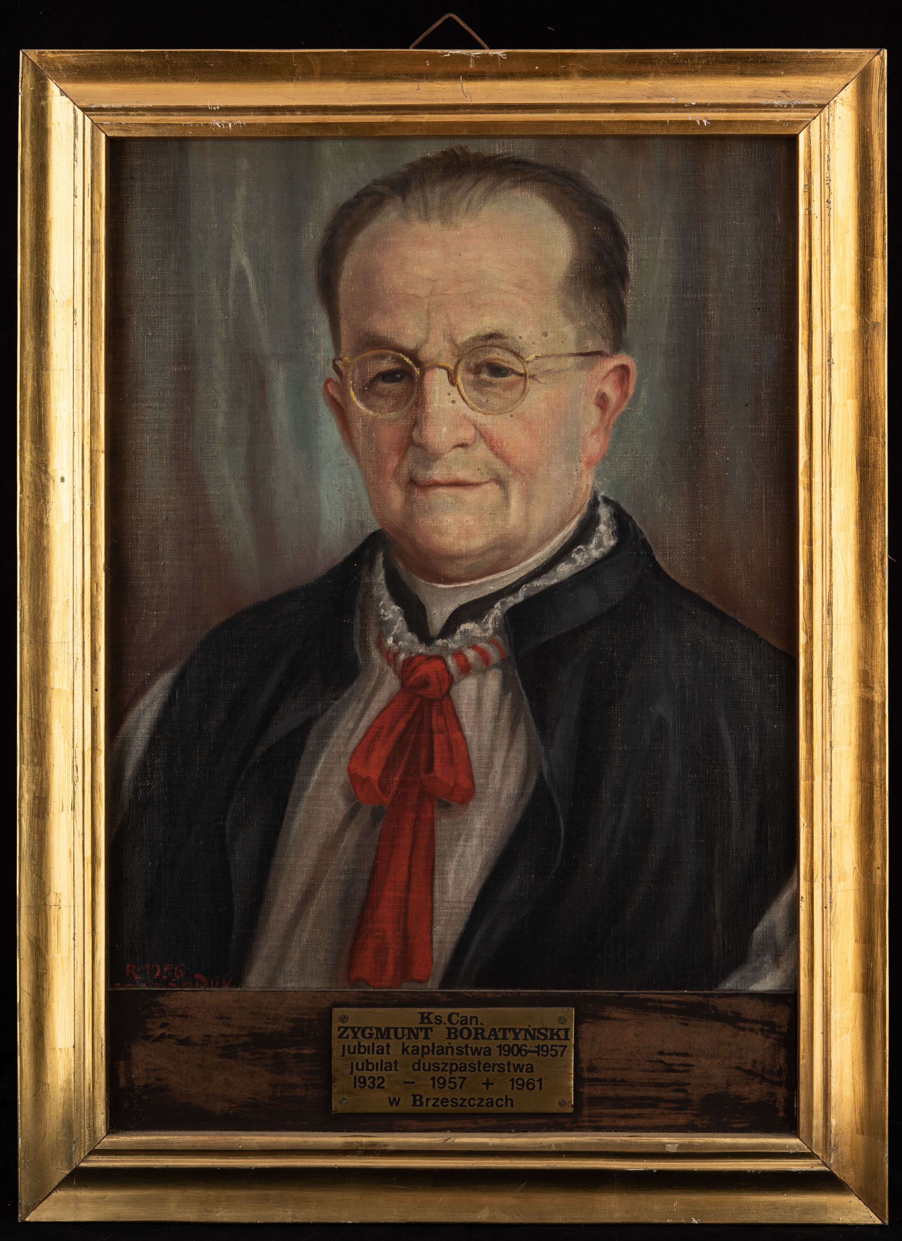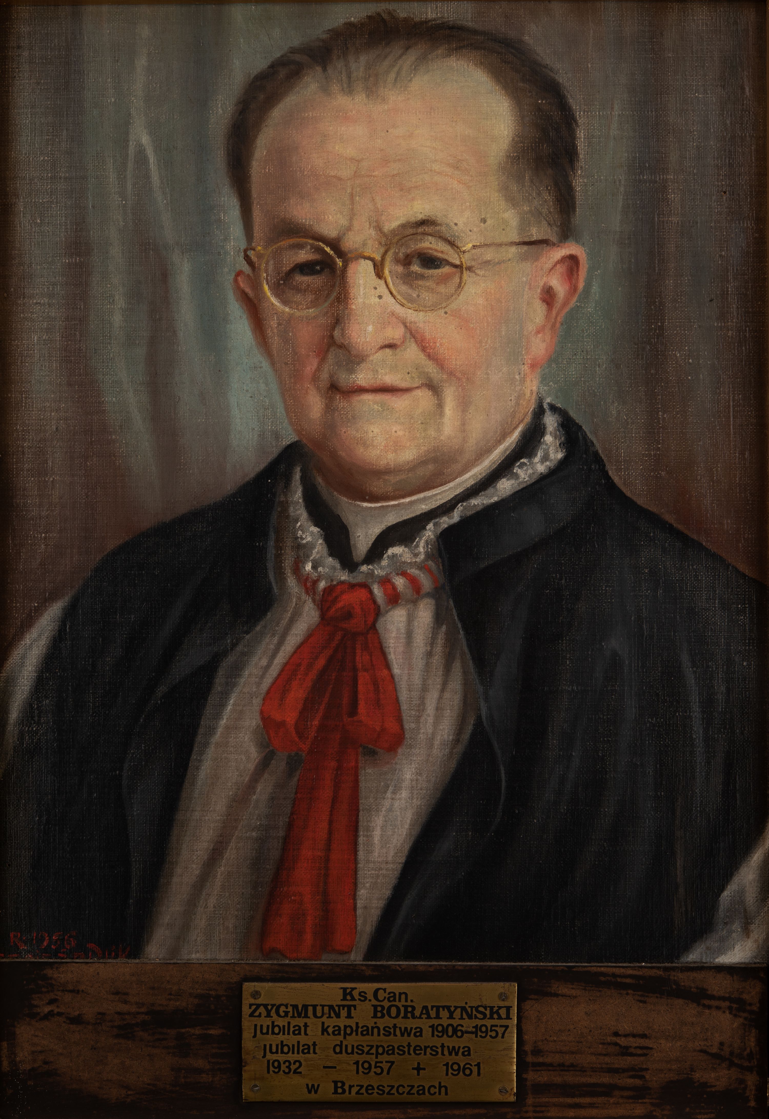 Portret księdza Zygmunta Boratyńskiego, proboszcza w Brzeszczach w latach 1932-1957 wykonano najprawdopodobniej w latach sześćdziesiątych XX wieku, jako uzupełnienie galerii portretów proboszczów w zakrystii.