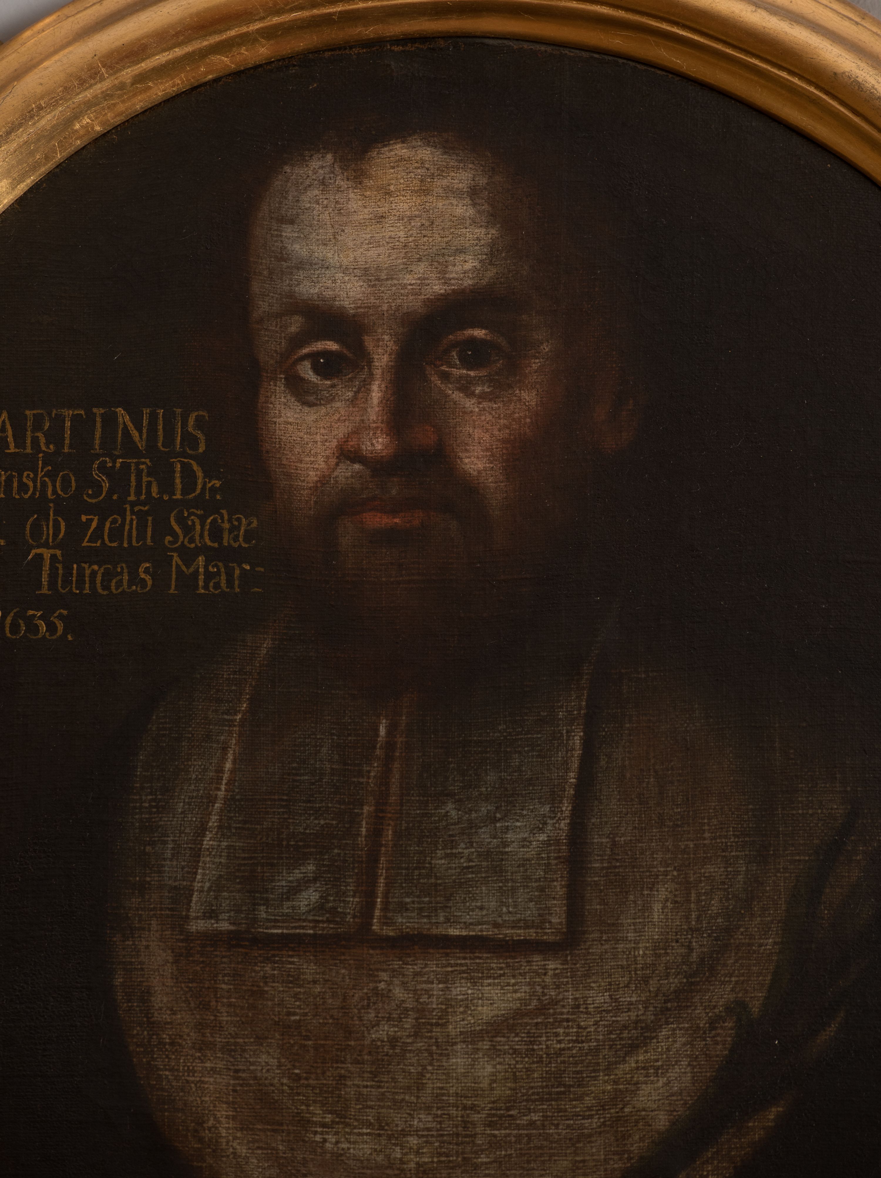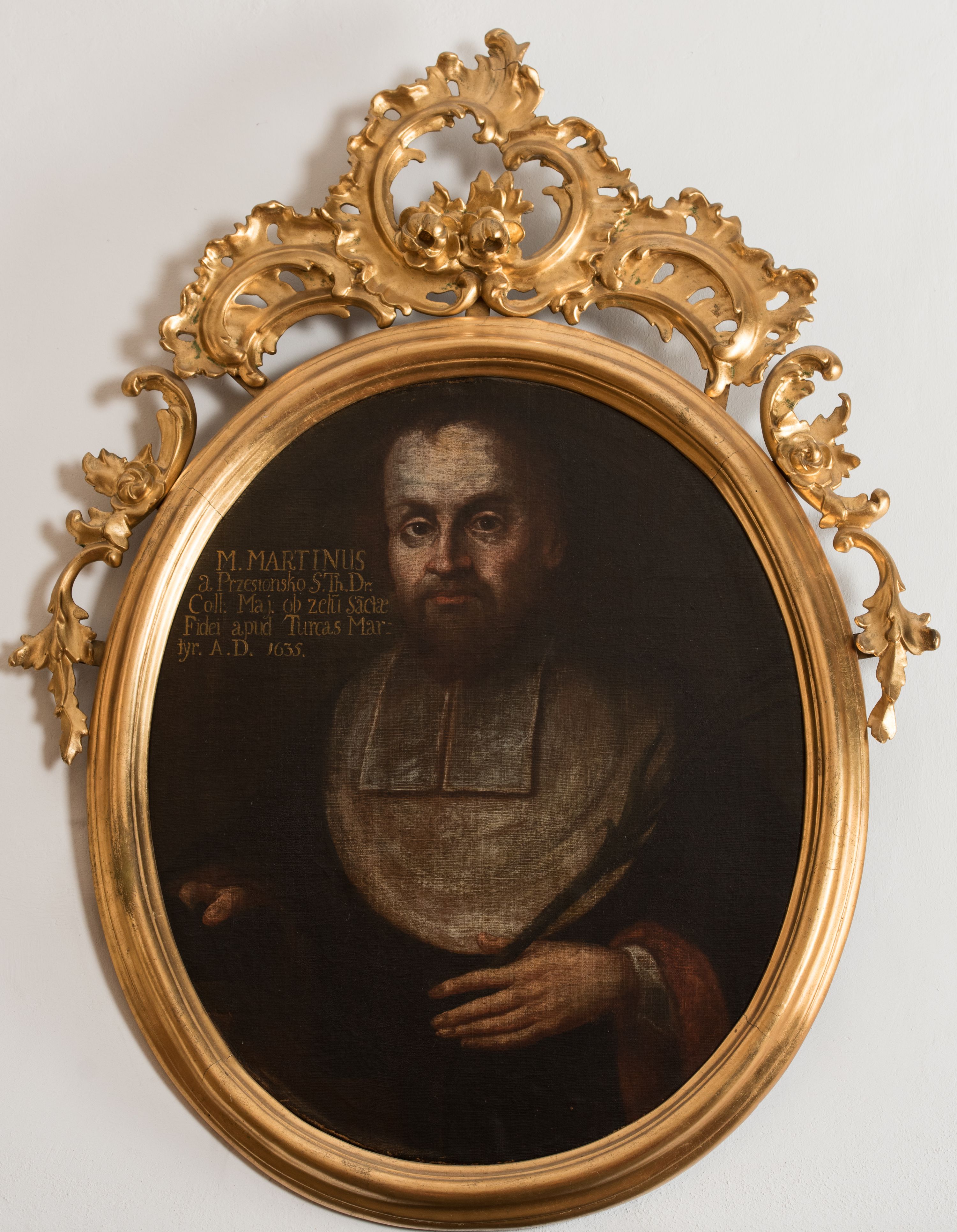 Obraz w kształcie stojącego owalu, w drewnianej, profilowanej, złoconej ramie zdobionej motywem rocaille’ów. Mężczyzna ukazany do pasa, niemal frontalnie, ubrany w togę, z białymi befkami i białą, owalną załogą (pelerynką), z księgą w prawej i palmą męczeńską w lewej dłoni. Twarz starszego mężczyzny, o szerokim nosie, z szeroko otwartymi oczami, wysokim czołem i krótką brodą. W lewym górnym rogu napis „M(agister) MARTINUS / a Przesionsko S(anctae) Th(eologiae) D(octo)r / Coll(egii) Maj(oris) ob zelu(m) Sa(nc)tae / Fidei apud Turcas Mar/tyr. A(nno) D(omini) 1635.”