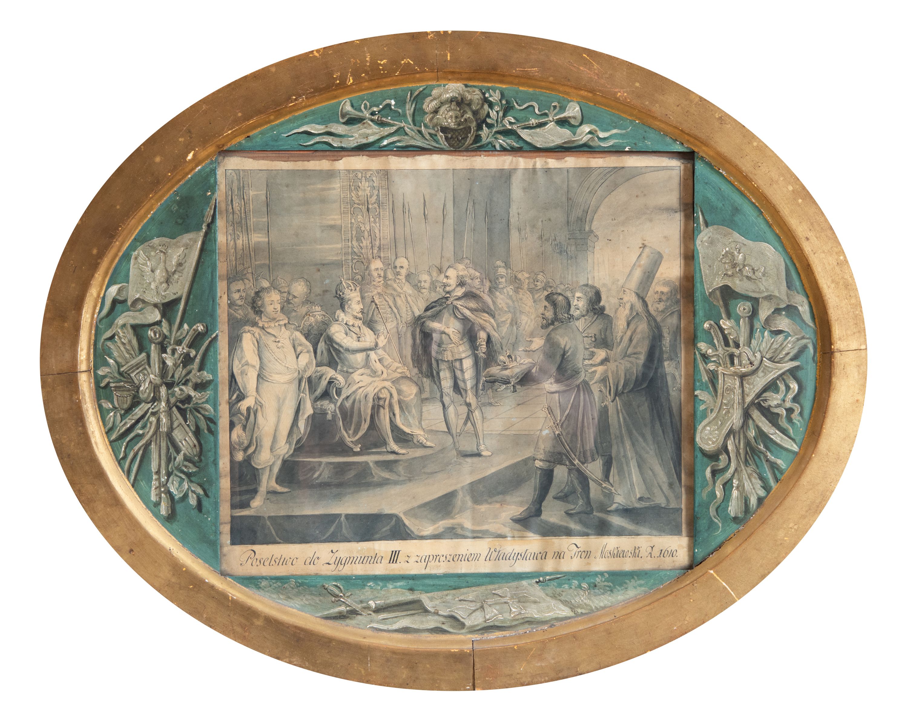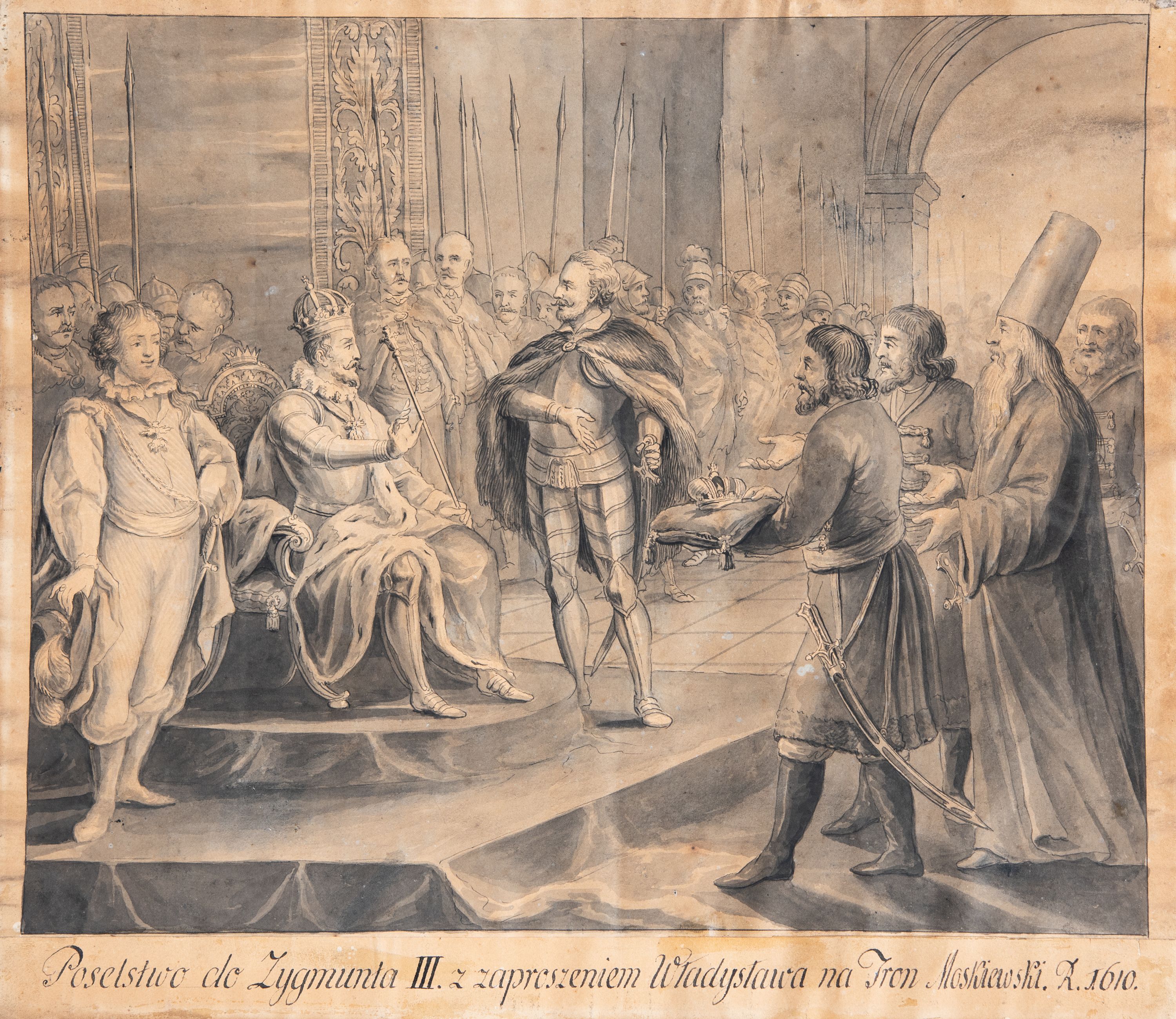 U dołu rysunku napis: "Poselstwo do Zygmunta III. z zaproszeniem Władysława na tron moskiewski. R. 1610."