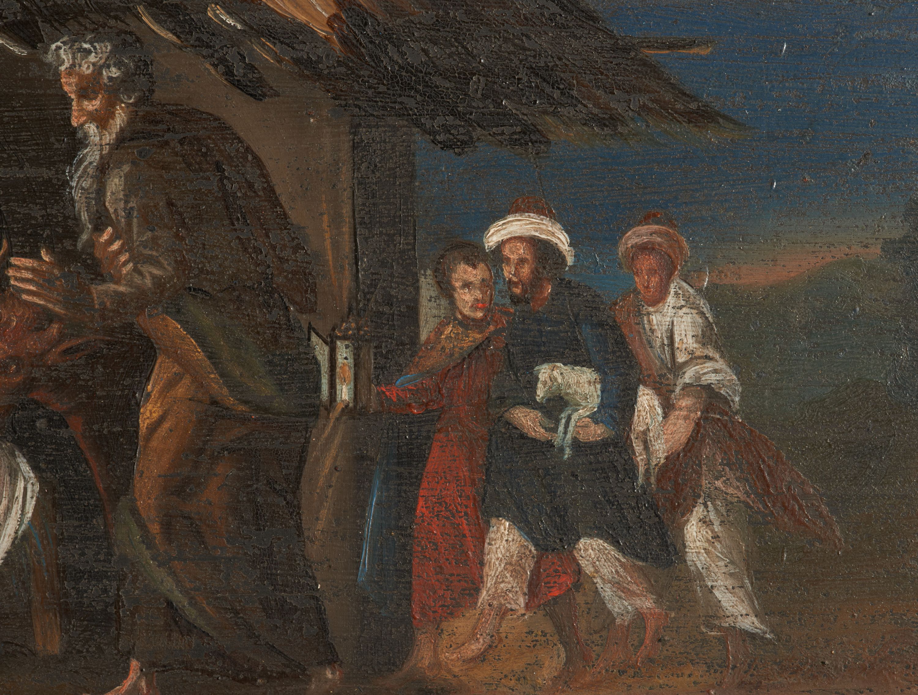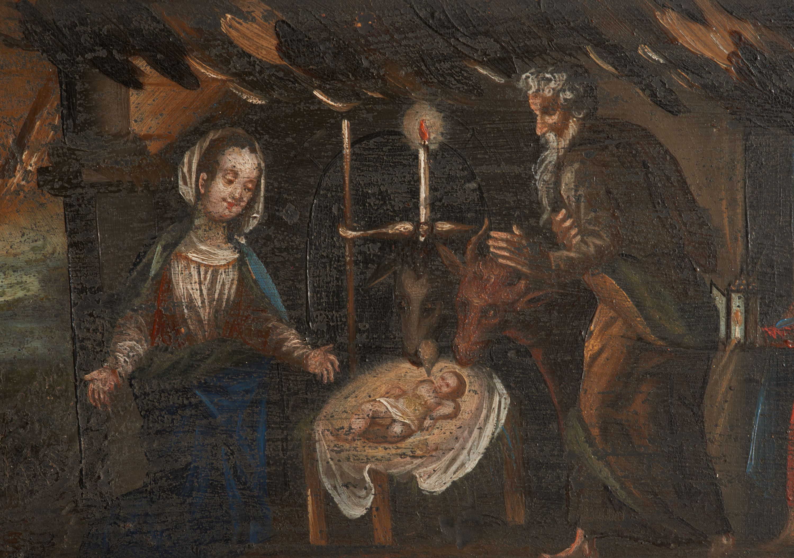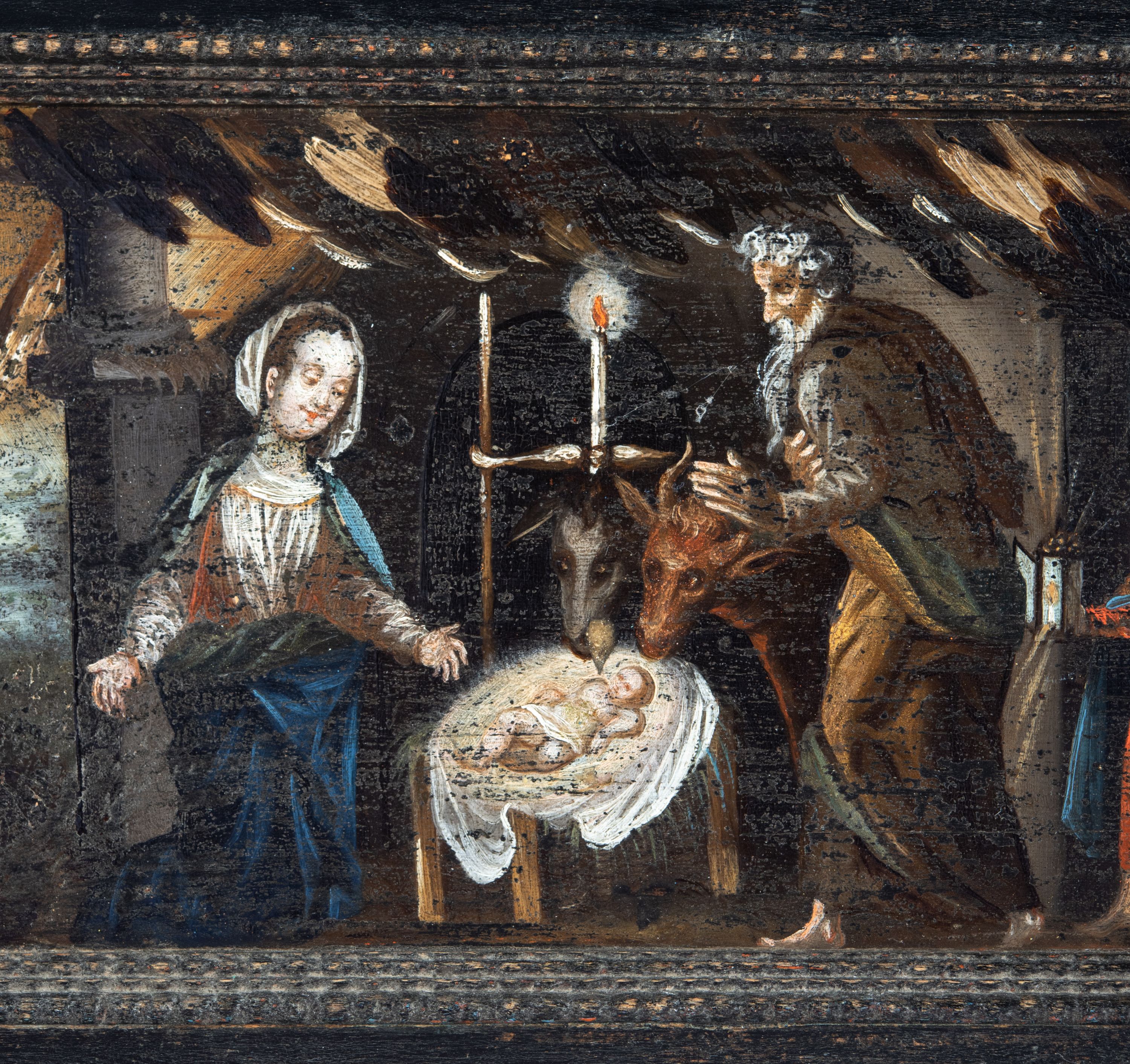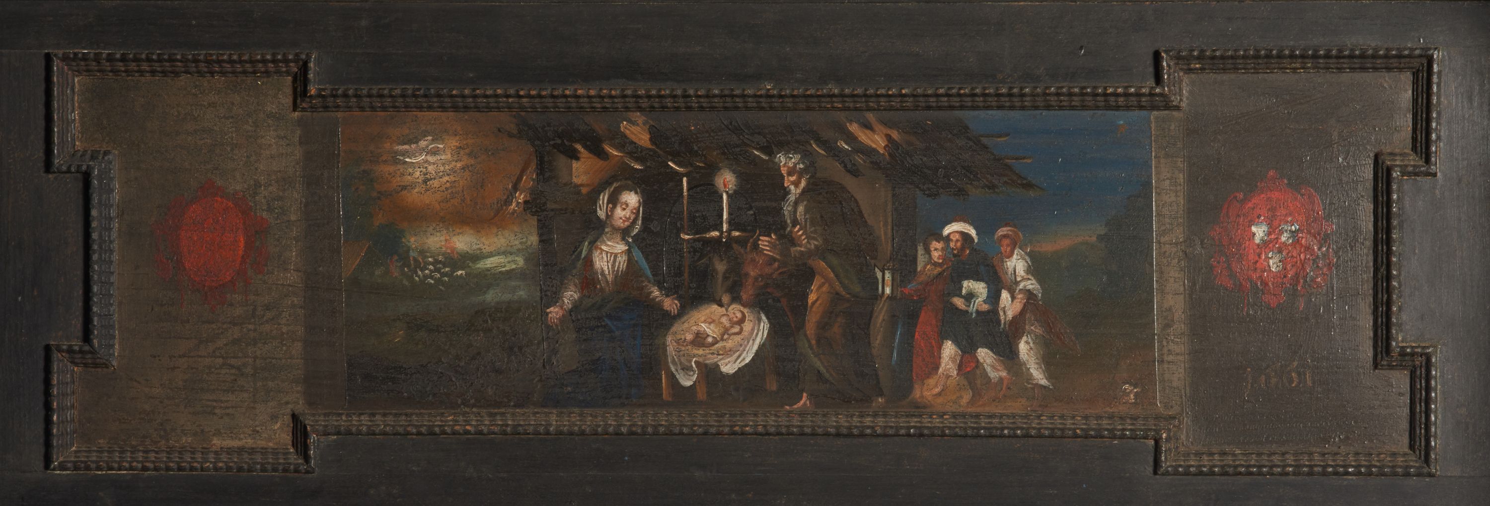 Obraz w kształcie leżącego prostokąta, umieszczony w predelli ołtarza bocznego, z przedstawieniem Bożego Narodzenia na tle głębokiego pejzażu i postaciami pasterzy.