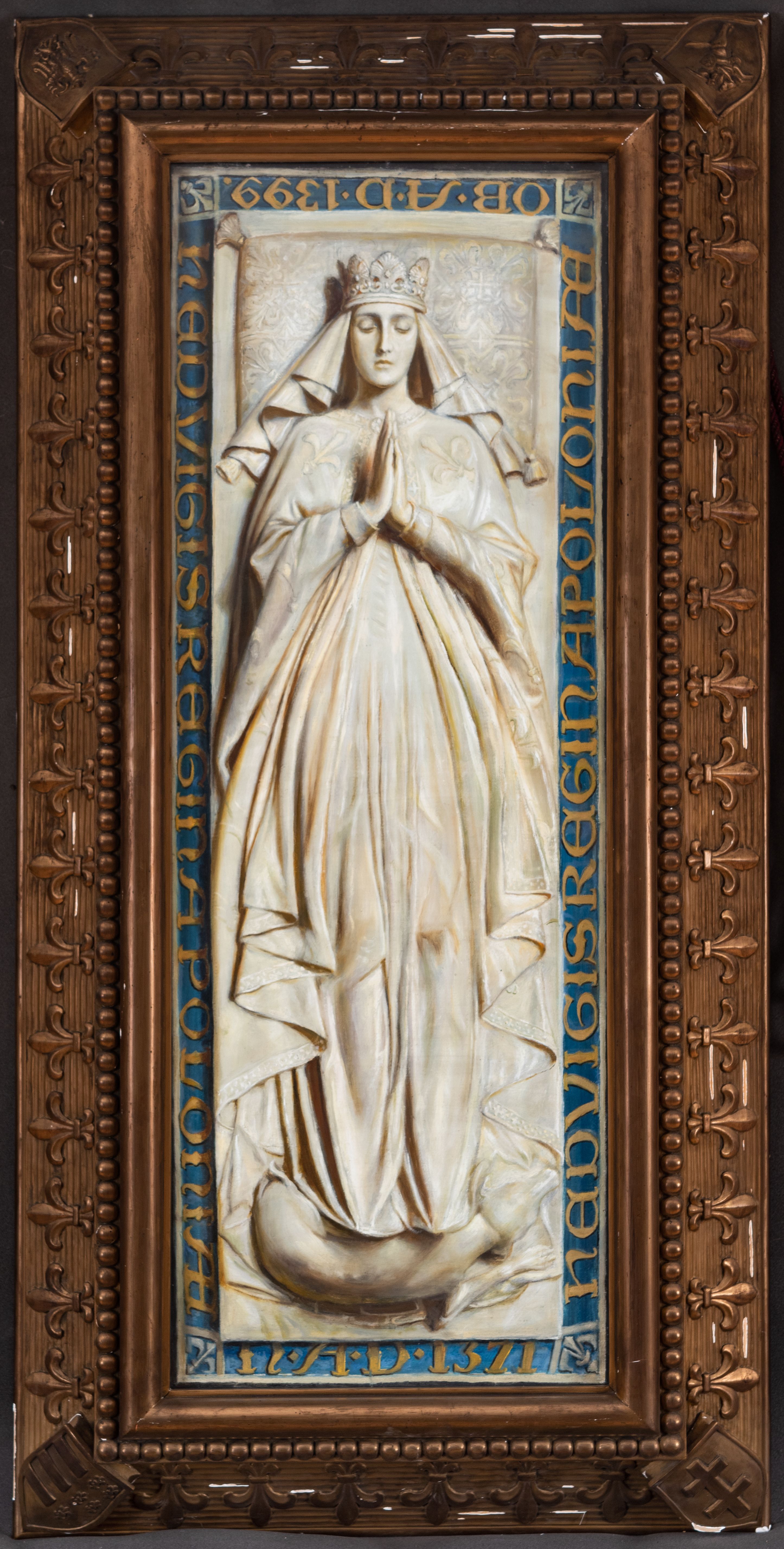 Obraz w formie wydłużonego, stojącego prostokąta. W centrum namalowana wierzchnia płyta sarkofagu z figurą leżącej Jadwigi, z głową spoczywającą na wzorzystej poduszce z czterema chwostami, z dłońmi złożonymi w geście modlitwy i nogami opartymi o leżącego psa. Twarz ma owalną, o zamkniętych oczach, długim nosie i małych ustach. Na głowie ma welon, o fałdach układających się kaskadowo po bokach oraz koronę otwartą. Ubrana jest w długą suknię, zasłaniającą stopy oraz płaszcz o dekoracyjnej lamówce i wzorze o motywie lilii heraldycznych, zapięty pod szyją broszą, układający się kaskadowo po bokach postaci. Całość malowana monochromatycznie. Malowana płyta obwiedziona niebieskim pasem z liliami heraldycznymi w narożach oraz żółtym napisem, na dwóch dłuższych bokach: „HEDVIGIS REGINA POLONIAE”, na krótszym boku u stóp: „N(ATUS) A(NNO) D(OMINI) 1371”, na krótszym boku u wezgłowia: „OB(ITUS) A(NNO) D(OMINI) 1399”. Obraz ujęty szeroką ramą dekorowaną profilowaniem, perełkowaniem, pasem z motywem lilii heraldycznych oraz czterema tarczami herbowymi w narożach: Orła, Pogoni, Andegawenów węgierskich, Podwójnego krzyża.
