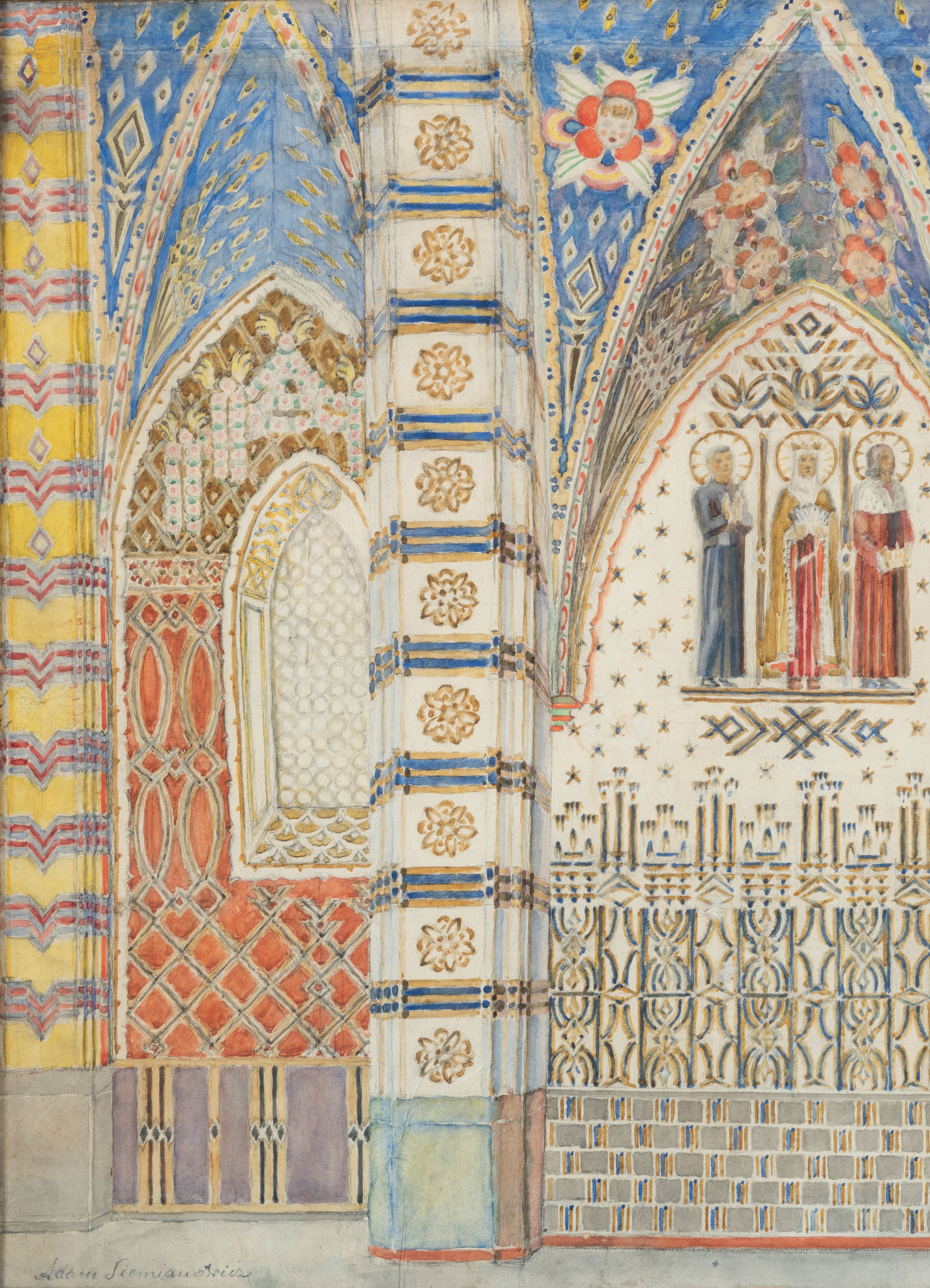 Projekt w formie leżącego prostokąta. Przedstawia północną ścianę prezbiterium oraz pierwsze przęsło nawy razem z wysklepkami połowy krzyżowo-żebrowych sklepień oraz fragmentem łuku tęczowego. Dwie trzecie projektu od prawej strony ukazują polichromię prezbiterium o geometrycznej dekoracji w dolnej połowie ściany oraz przedstawieniach figuralnych w górnej na beżowym tle, z podkreślonymi otworami okiennymi i drzwiowymi. Sklepienie pomalowane na niebiesko z przedstawieniami uskrzydlonych główek anielskich na poszczególnych wysklepkach. Gurty oraz łuk tęczowy pokryty dekoracją geometryczną. W jednej trzeciej rysunku od lewej strony ukazany projekt polichromii pierwszego przęsła nawy kościoła. Ściana podzielona na trzy części o odmiennych wzorach dekoracji geometrycznej, na fioletowym, czerwonym i brązowym tle. Sklepienie pomalowane na niebiesko z geometryczną dekoracją wysklepek i gurtów. W lewym dolnym rogu projektu sygnatura „Adam Siemianowicz”.
