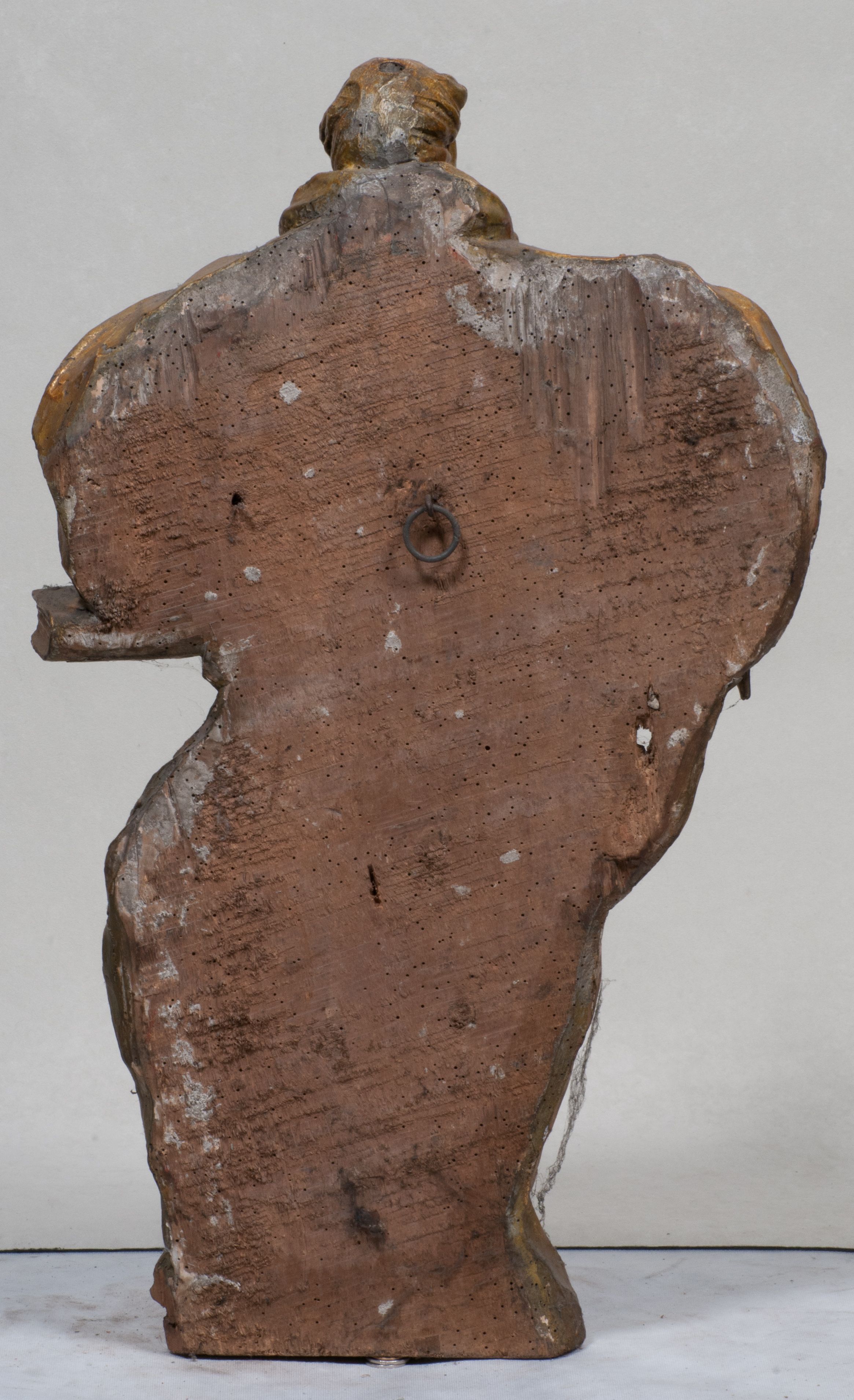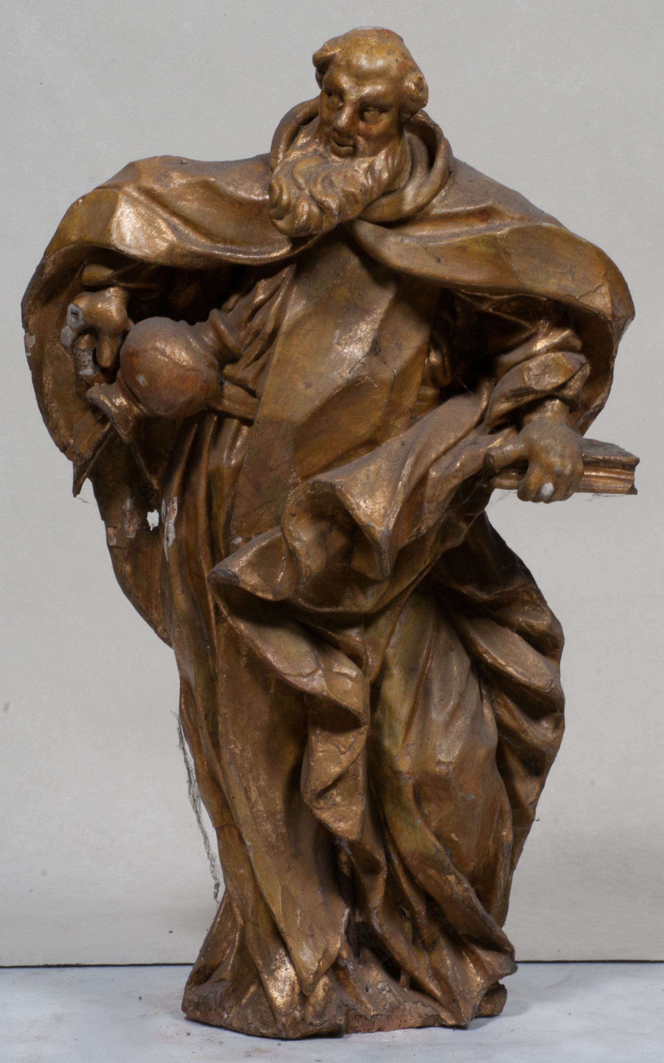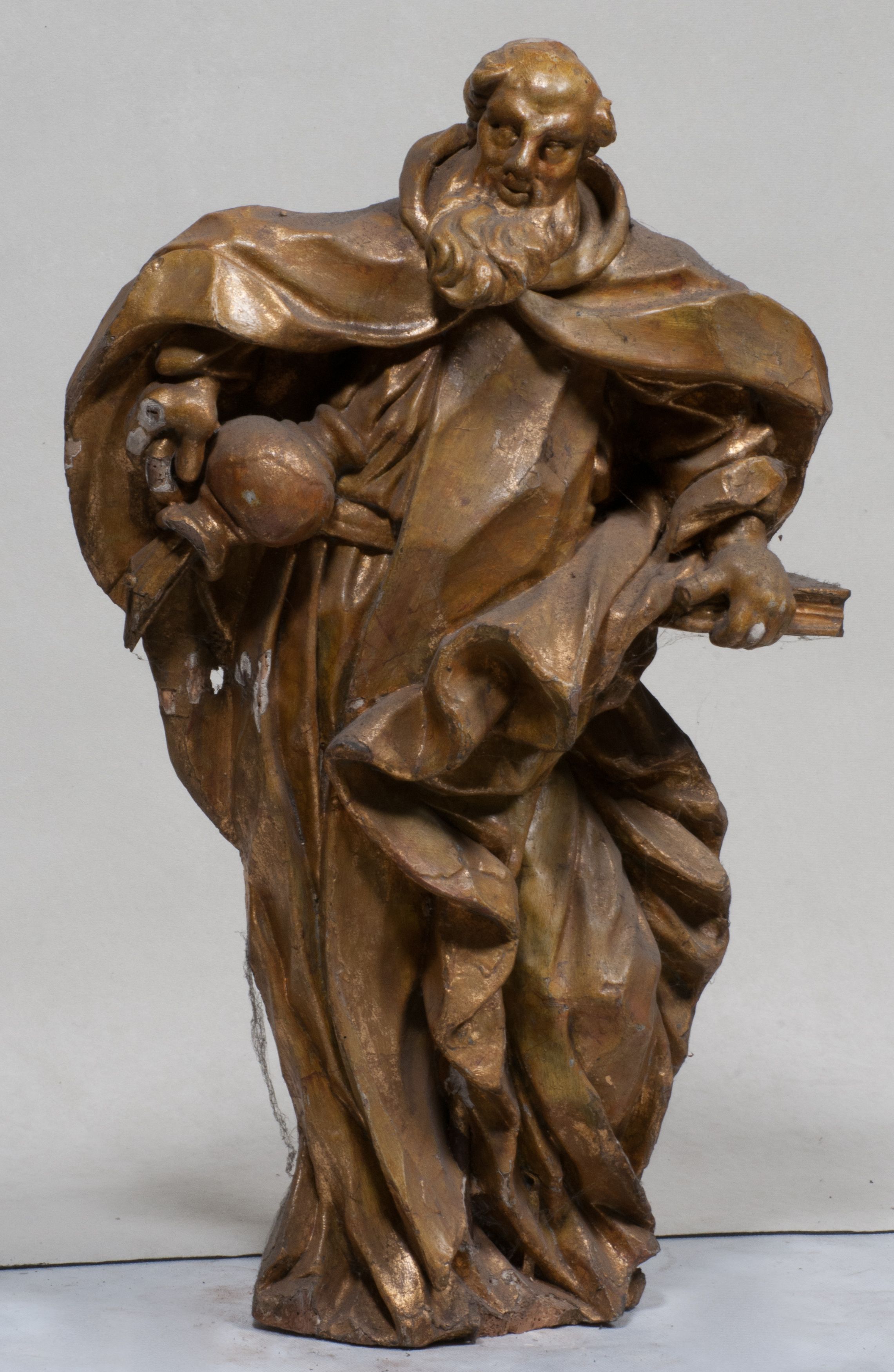 Silne zabrudzenia całej figury, przetarcia i ubytki warstwy złoceń i zaprawy. Niewielkie ubytki mechaniczne dolnej partii figury.