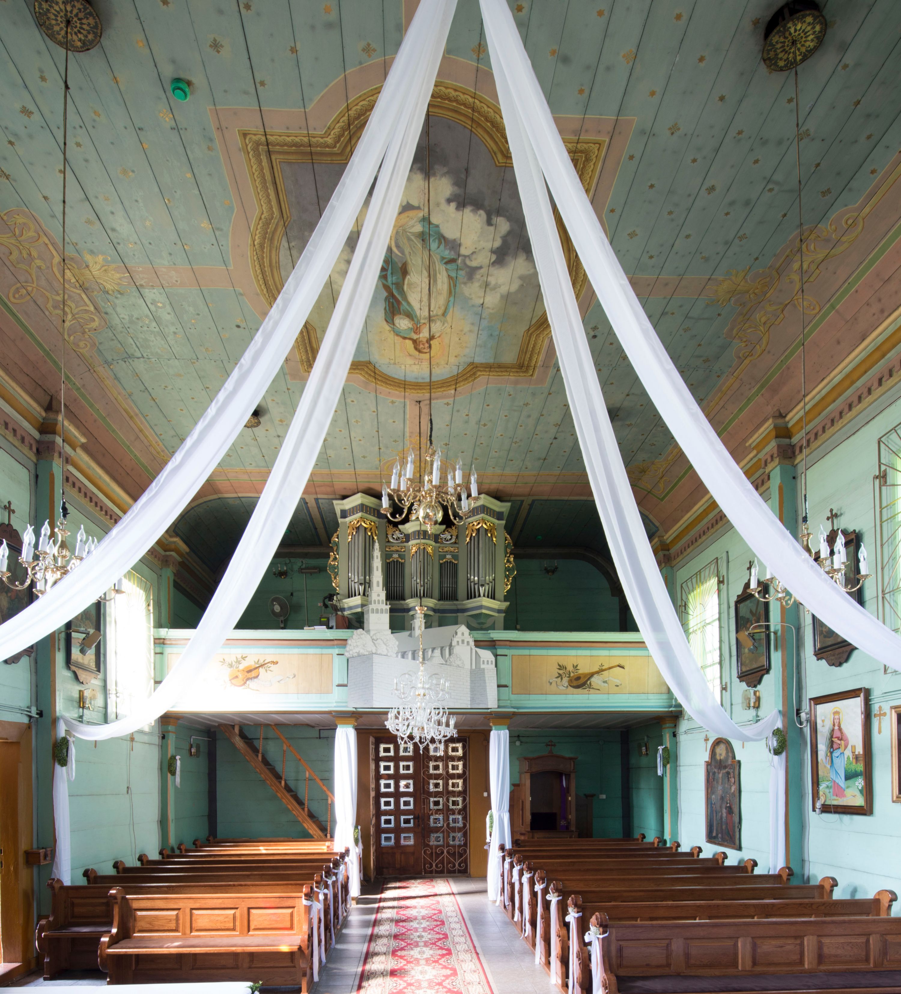 Prospekt organowy o formach architektonicznych, pięcioosiowy, jednokondygnacyjny ze zwieńczeniem. Osie nieparzyste wypukłe; osie skrajne na rzucie trójkąta; oś środkowa niższa na rzucie półkola ujęta w górnej części odwróconymi rogami obfitości. W osiach parzystych niższe płyciny mieszczące mniejsze piszczałki ujęte od góry parą stykających się wolut akantowych. W górnej partii części piszczałkowej osi nieparzystych płaskorzeźbiona dekoracja akantowa. Zwieńczenie utworzone z przełamującego się belkowania. W osi środkowej szczyt w postaci krzyża ujętego parą wolut akantowych. Struktura malowana w odcieniach popielu i jasnej zieleni, ornamenty złocone i srebrzone. Parapet chóru muzycznego w formie pełnej balustrady artykułowanej 4 pilastrami wspierającymi wyłamujący się ponad nimi gzyms wieńczący, wspartej na 4 drewnianych słupach. W polu po lewej stronie polichromowana kompozycja ze skrzypiec zestawionych z gałązką laurową i zwojem papieru nutowego. W płycinie po prawej stronie analogiczna kompozycja z lutnią zamiast skrzypiec. Struktura parapetu polichromowana w pastelowych odcieniach zieleni, błękitu, niebieskiego, brązu i bieli.