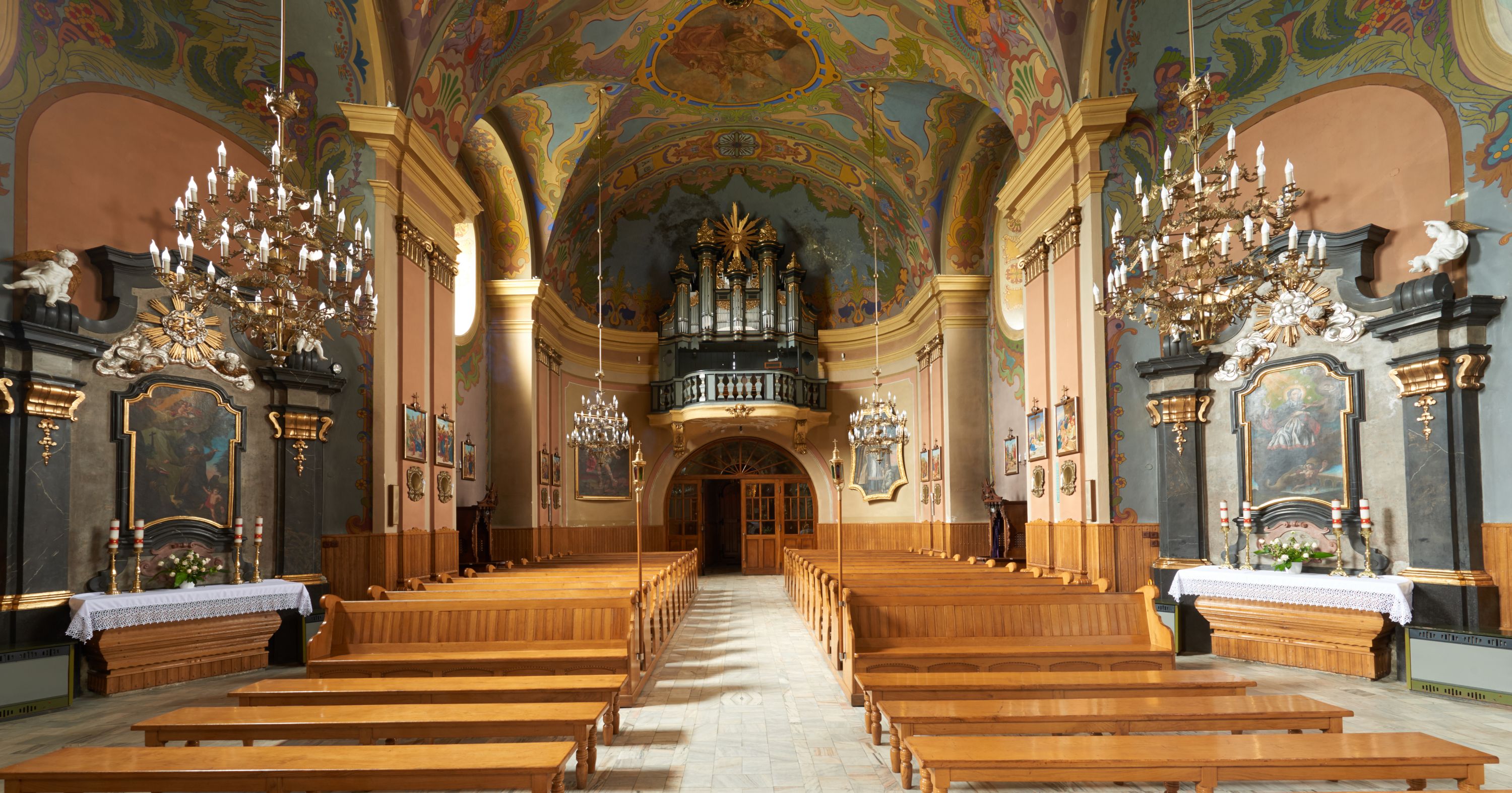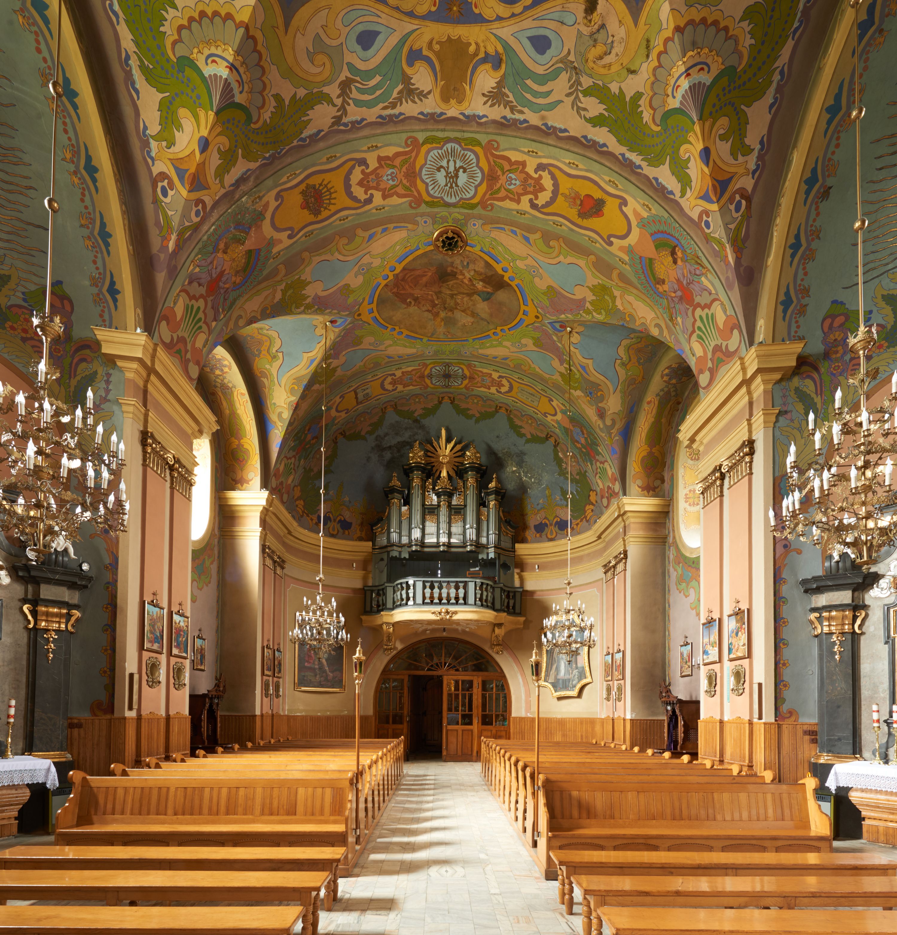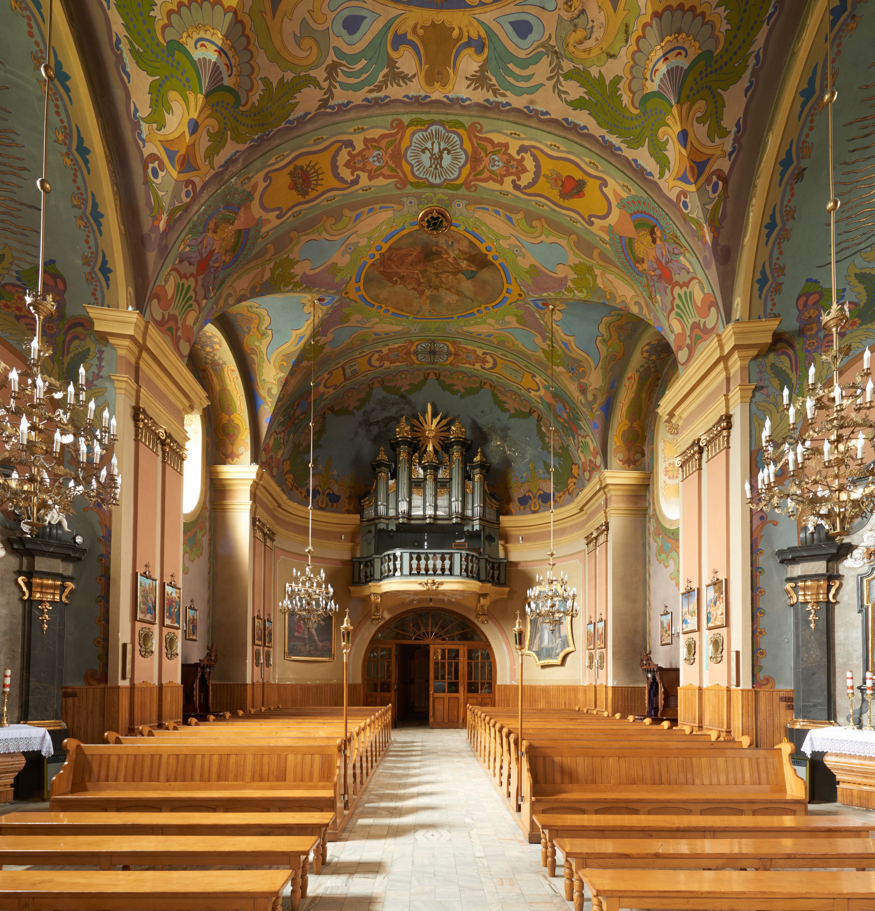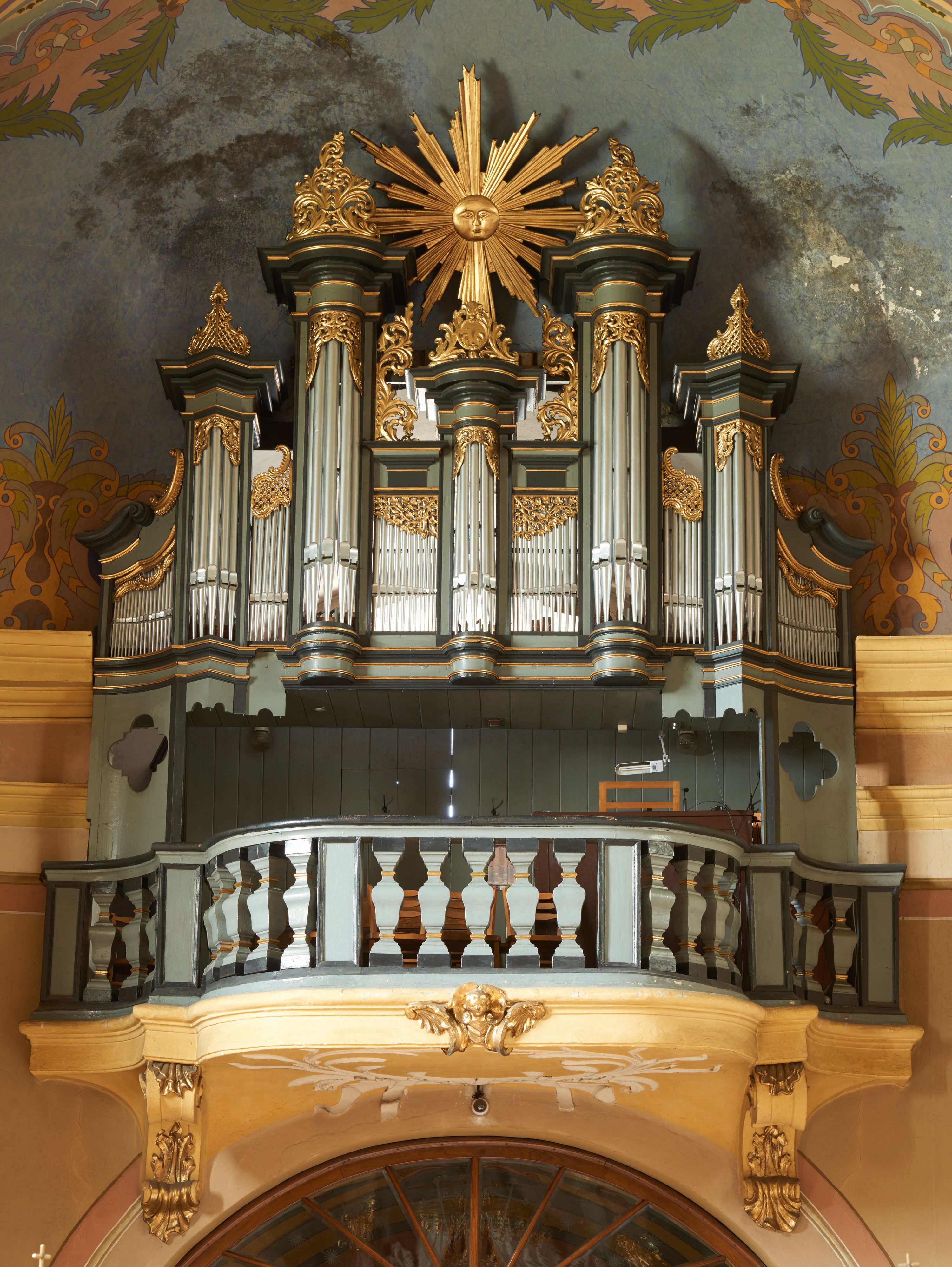 Podstawa chóru malowana na odcień ciemnej żółci, parapet z tralkami w odcieniach ciemnej szarości, podobnie jak prospekt. Detale złocone.