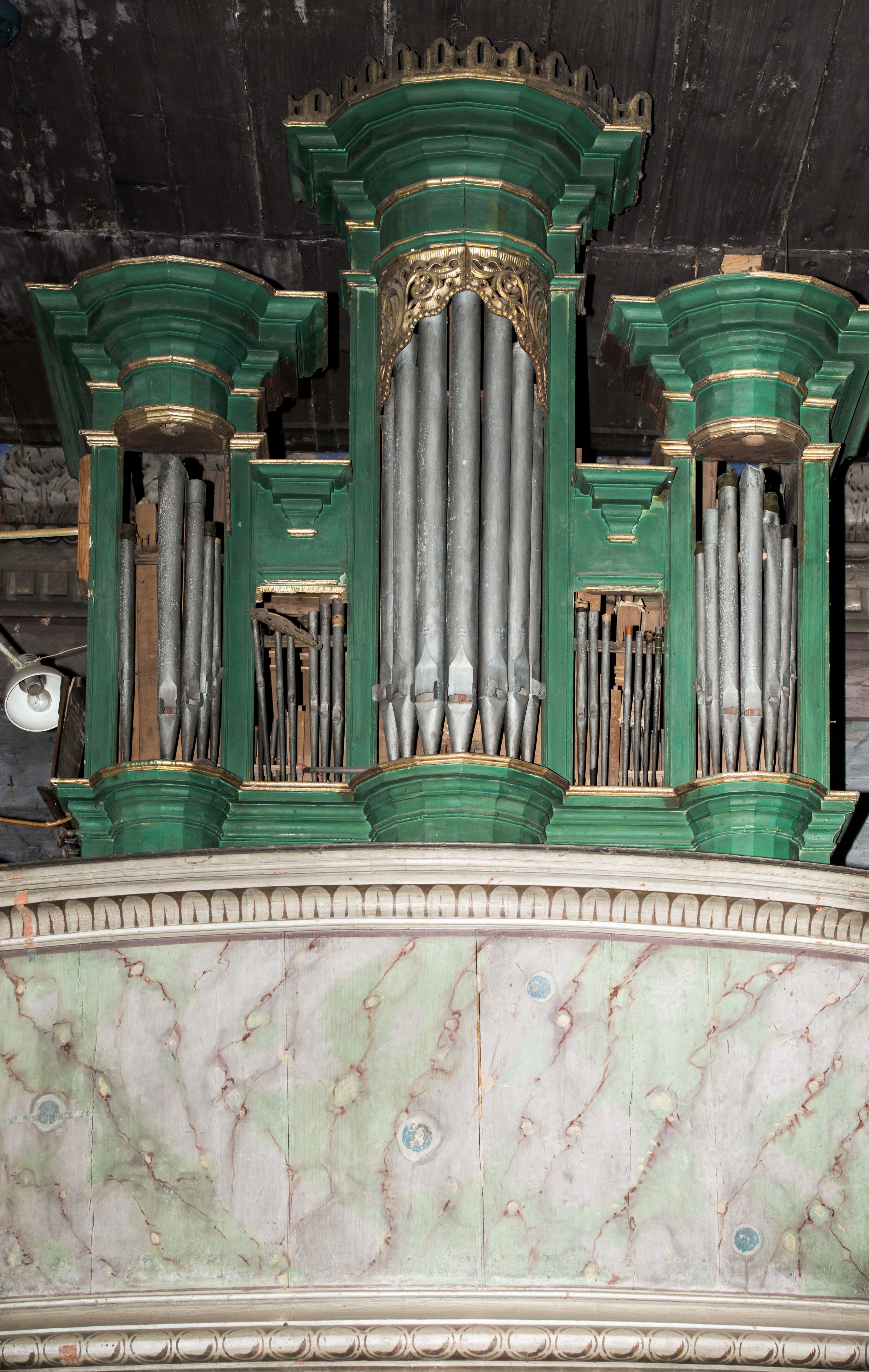 Architektoniczny prospekt organowy uzyskał pięcioosiowe założenie jednokondygnacyjne ustawione na wysokim cokole. Osie pierwsza, trzecia i piąta z większymi piszczałkami są wypukłe. Pierwsza i piąta są niższe od trzeciej. Wszystkie zwieńczone zostały pełnym belkowaniem z wydatnym, profilowanym gzymsem. W osi środkowej dodatkowo znalazł się ażurowy, złocony lambrekin oraz ornament ze złoconej wici roślinnej. Osie parzyste są niższe z płaskimi, prostokątnymi niszami mieszczącymi mniejsze piszczałki. Wieńczą je profilowano-fazowane konsole. Struktura prospektu została polichromowana w odcieniach morskiej zieleni, zaś ornamentyka i załamania profili architektonicznych wyzłocono.