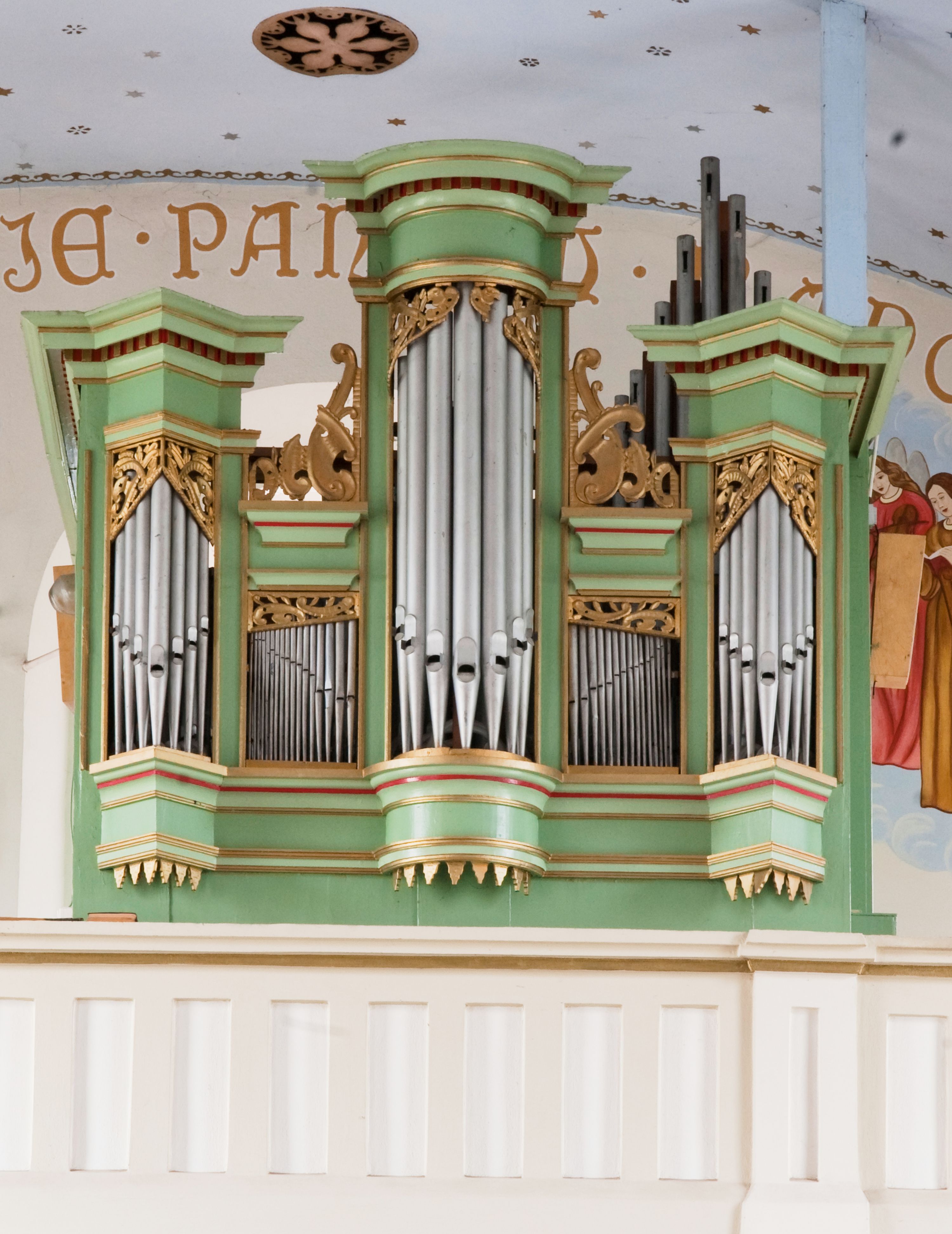 Osie nieparzyste (pierwsza, trzecia i piąta) z większymi piszczałkami wypukłe, a pierwsza i piąta, na rzucie trójkąta niższe od środkowej. Wszystkie zwieńczone pełnym belkowaniem z wydatnym, profilowanym gzymsem dekorowanym kostkowaniem. W górnej części złocony, ażurowy lambrekin utworzony z ornamentu małżowinowo-chrząstkowego. Osie parzyste są niższe z płaskimi, prostokątnymi niszami mieszczącymi mniejsze piszczałki. Wieńczą je profilowano-fazowane konsole oraz ażurowe struktury z ornamentu małżowinowo-chrząstkowego. Prospekt polichromowany w odcieniach seledynowej zieleni z czerwonymi detalami, zaś ornamentyka i załamania profili architektonicznych złocone.
