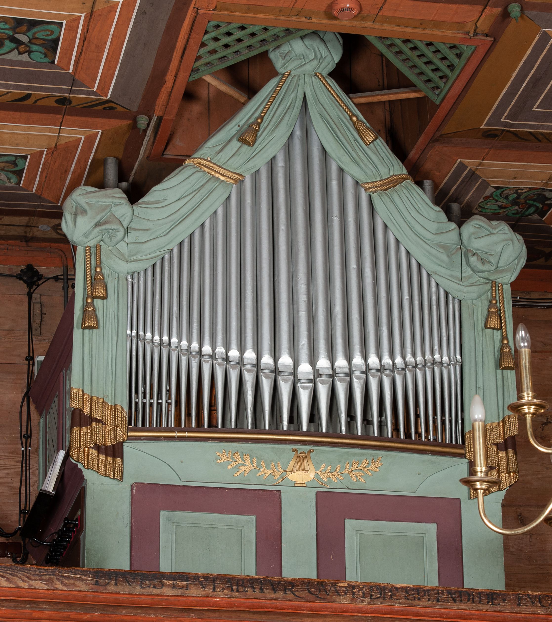 Skromny jednoosiowy prospekt organowy, z dekoracją ograniczoną do prostokątnych płycin w części dolnej oraz ozdobnego obramienia piszczałek podwiązaną złoconym sznurem kotarą, o charakterze klasycystycznym.