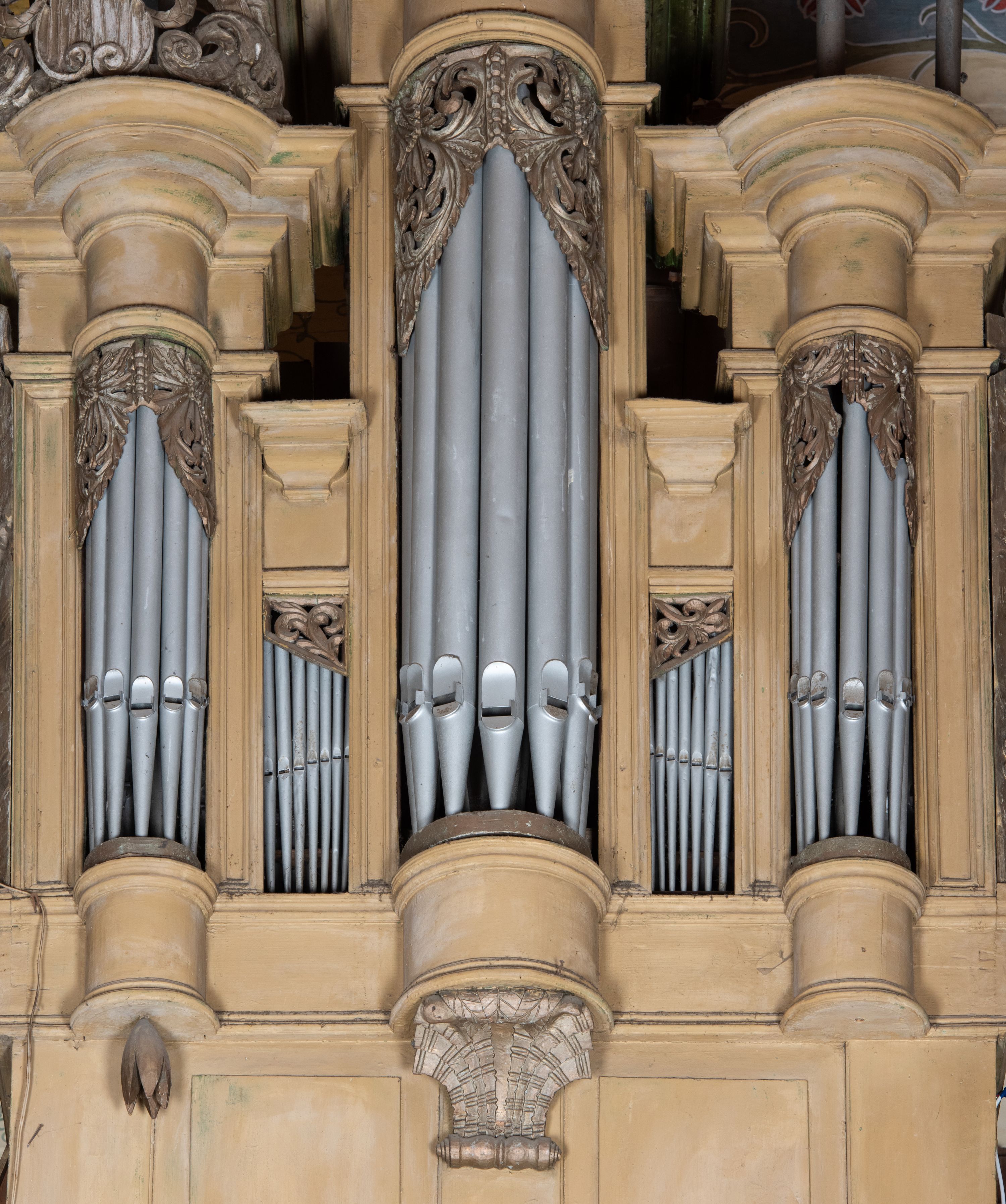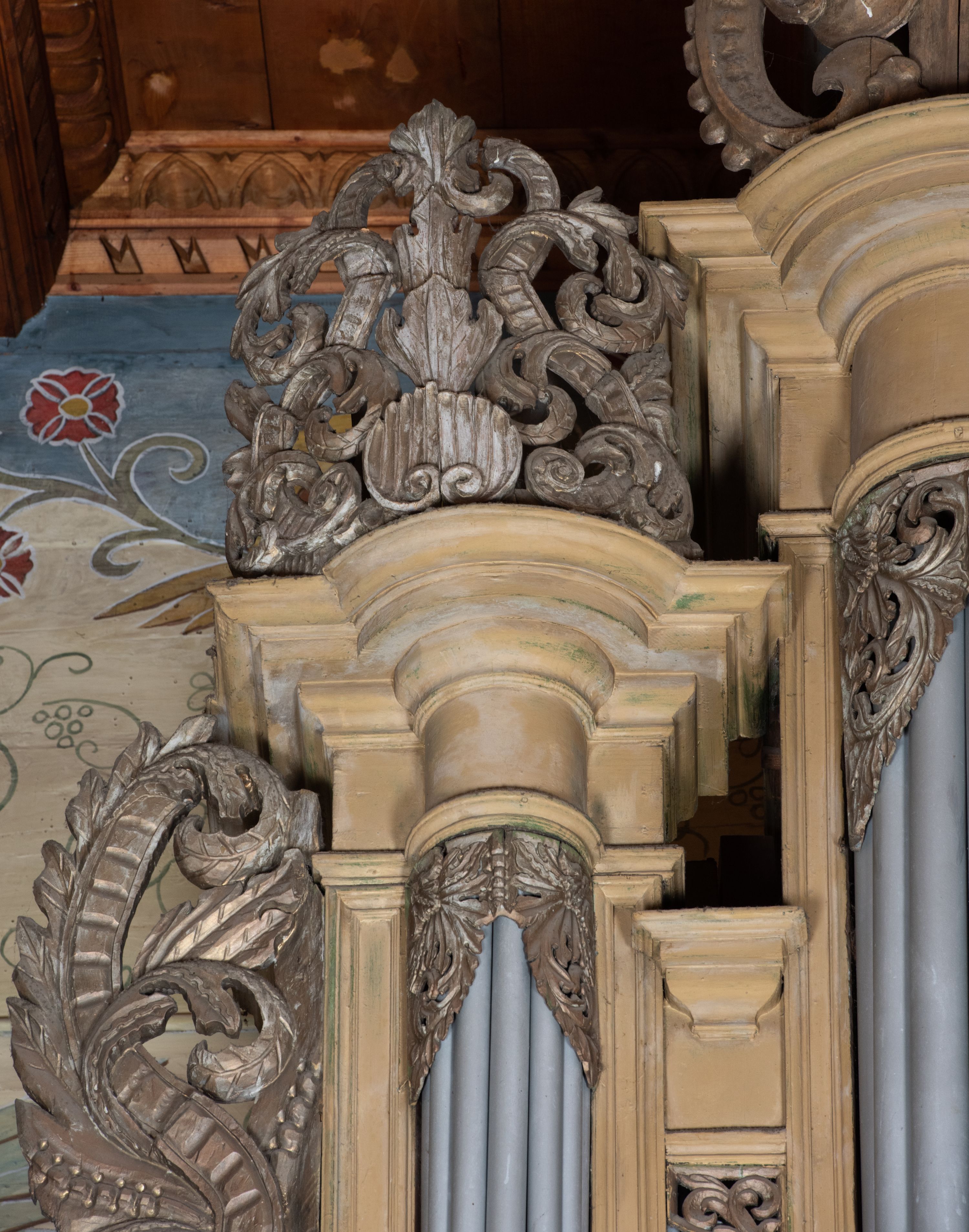 Organy architektoniczne, pięcioosiowe na wysokiej podstawie i niewielkim cokole, trójwieżyczkowe. Wieżyczki boczne niższe od środkowej, wszystkie z półokrągłymi ryzalitami, z prostokątnymi i wypukłymi prześwitami na piszczałki, dekorowanymi w górnych narożach akantem, zakończone fryzem i gzymsem oraz ornamentalnymi szczytami utworzonymi z akantu, karbowanej wstęgi, kampanul i muszli; ryzality u spodu z podwieszonymi kampanulami i muszlą. Szczyt środkowej wieżyczki utworzony z ornamentu małżowinowo-chrząstkowego. Pomiędzy wieżyczkami dwie najniższe osie z prześwitami na piszczałki w formie stojącego prostokąta, zakończone fragmentami gzymsu. Organy ujęte uszami utworzonymi z akantu i karbowanej wstęgi. Struktura polichromowana w całości w kolorze ciemnobeżowym, ornamenty złocone.