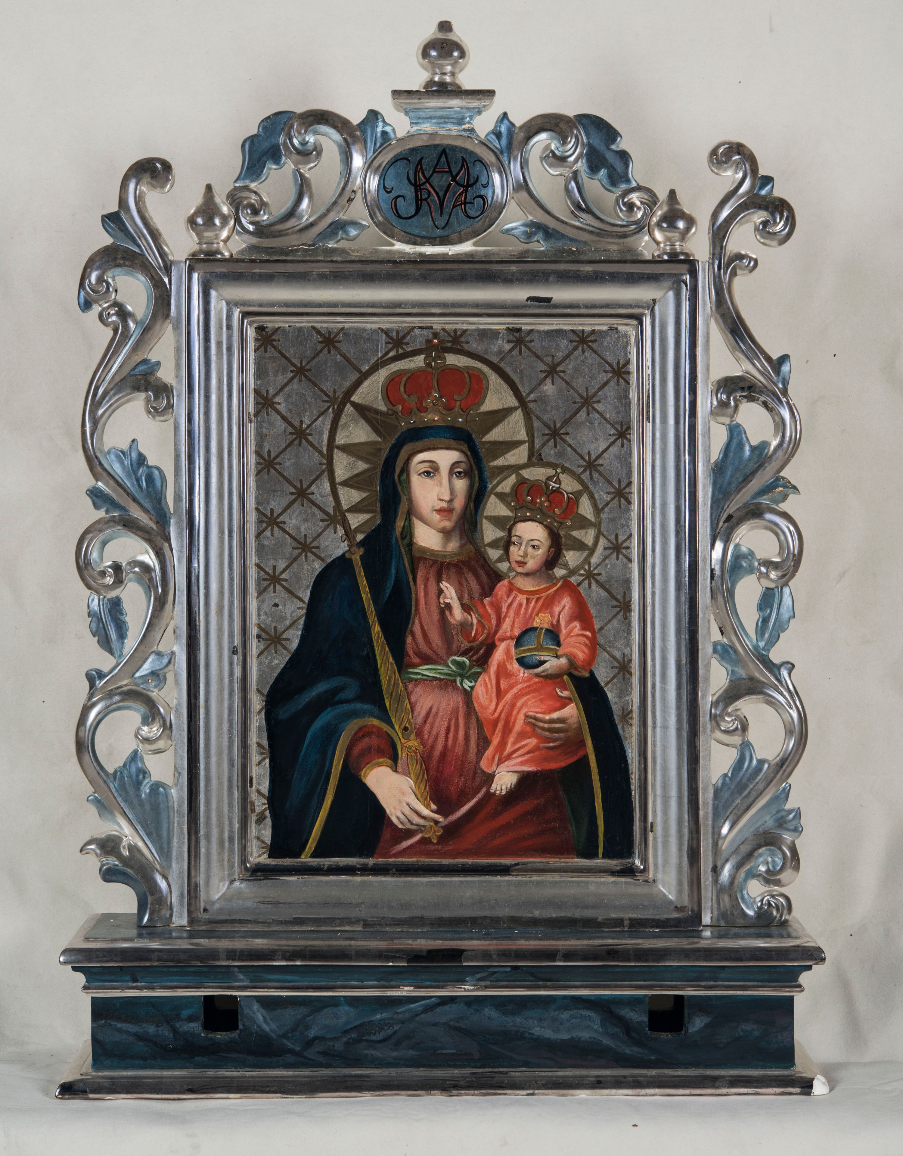 Na rewersie feretronu umieszczono obraz z Matką Boską z Dzieciątkiem. Marię namalowano frontalnie z Dzieciątkiem, trzymanym na lewym przedramieniu. W prawej opuszczonej ręce Madonna trzyma złociste berło. Ma pociągłą twarz o jasnej karnacji z rumianymi policzkami, z długim, mięsistym nosem oraz wydatne usta. Spojrzenie szeroko otwartych oczu skierowane jest przed siebie. Maria ubrana jest w cimnoniebieski maforion lamowany złotą taśmą okrywający bladoszkarłatną suknię przewiązaną w talii bladozieloną wstążką zawiązaną na kokardę. Na jej głowie widoczna jest zamknięta złota korona zwieńczona globem z krzyżykiem z obręczą dekorowaną malowaną kameryzacją. Wnętrze korony wypełniła czerwona podbitka. Dzieciątko ukazano w trzech czwartych w prawo. Jezus prawą rękę unosi w geście błogosławieństwa w lewej natomiast trzyma glob ziemski ze złotym krzyżykiem. Jego twarz o jasnej karnacji ma wysokie czoło, rumiane policzki, krótki nos i wydatne usta. Głowę, na której ma złotą koronę zamkniętą z globem z krzyżykiem i malowaną kameryzacją, otaczają krótkie brązowe włosy. Jezus ubrany jest w bladoczerwoną tunikę przewiązaną w pasie i odsłaniającą u spodu fragment lewej bosej stopy. Głowy obu postaci otaczają złote nimby z wpisanymi w nie zębatymi złotymi promieniami. Srebrzyste tło pokrywa złota romboidalna kratownica dekorowana w miejscach przecięć złotymi krzyżykami.
