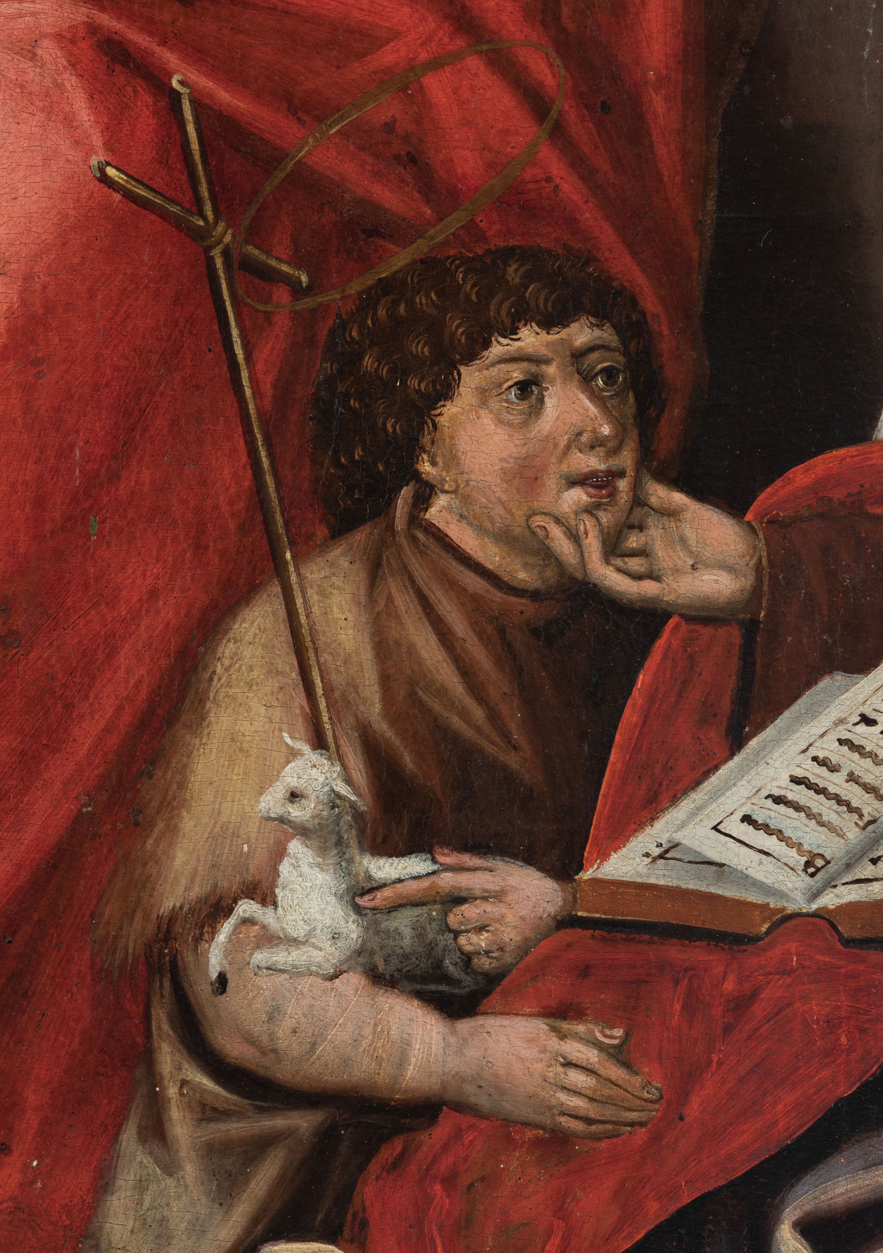 W lewym dolnym narożu obrazu siedzi Maria Salome zwrócona w trzech czwartych w lewo, pochylona, lewą ręką przytrzymuje św. Jana Ewangelistę siedzącego na jej kolanach, w prawej, uniesionej trzyma białą różę. Ubrana jest w czerwoną suknię i jasnofioletowy płaszcz z zieloną podszewką, wokół głowy ma białą podwikę, na niej czepiec. Święty Jan ukazany jako niemowle, w pozycji siedzącej, zwrócony w trzech czwartych w prawo, obiema rękami podtrzymuje kielich, z którego wychodzi wąż. Twarz ma okrągłą, okoloną jasnymi włosami. W partii bioder przepasany jest białą pieluszką. Po prawej stronie obrazu ucięta postać św. Elżbiety, zwrócona w trzech czwartych w prawo, prawą ręką ujmuje twarz stojącego obok św. Jana Chrzciciela. Na jej kolanach leży otwarta księga. Święta ubrana jest w brązową suknię oraz czerwony płaszcz. Na głowie ma biały welon spięty ozdobną opaską z klejnotami. Po jej lewej stronie stoi św. Jan Chrzciciel ukazany jako dziecko, zwrócony w trzech czwartych w lewo, na prawym przedramieniu podtrzymuje baranka i laskę zakończoną krzyżem. Twarz ma trójkątną, o dużych oczach i nosie oraz otwartych ustach, okoloną krótkimi, kręconymi włosami. Ubrany jest w melotę. Na trzecim planie, za przegrodą, od lewej półpostać Zebedeusza, zwróconego w trzech czwartych w lewo, ukazanego jako dojrzały mężczyzna, o dużych oczach i nosie oraz pełnych ustach. Twarz ma okoloną długimi kręconymi brodą i włosami. Ubrany jest w zieloną tunikę, różowy płaszcz, na głowie ma czerwone nakrycie. Po jego lewej stronie półpostać św. Józefa zwróconego w trzech czwartych w lewo, który lewą rękę kładzie na ramieniu św. Joachima. Ukazany jest jako dojrzały mężczyzna, o dużych oczach i nosie oraz pełnych ustach. Twarz ma okoloną kręconą brodą i włosami sięgającymi ramion. Ubrany jest w czarną tunikę z kołnierzykiem, na ramiona ma narzucony brązowy płaszcz. Po jego lewej stronie półpostać św. Joachima zwróconego w trzech czwartych w prawo, z ugiętymi rękami, który tłumaczy coś św. Józefowi. Ukazany jest jako starzec, o dużych oczach i garbatym nosie oraz wąskich ustach. Twarz ma okoloną długą, jasną brodą. Ubrany jest w czerwoną tunikę, zielony płaszcz z żółtą podszewką o rozciętych rękawach oraz nakrycie głowy dekorowane wstęgą z kamieniem.
